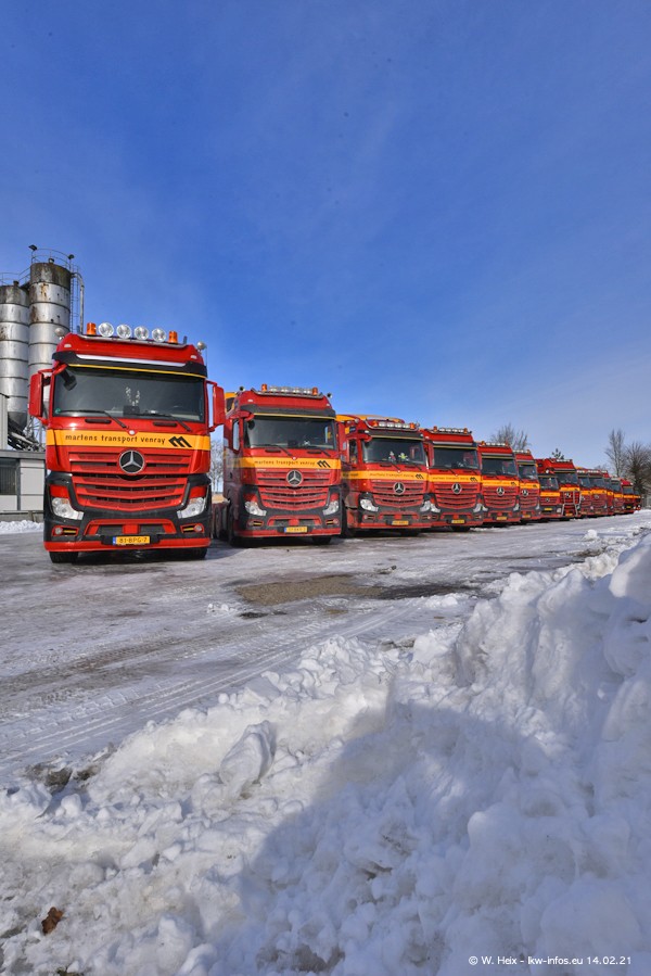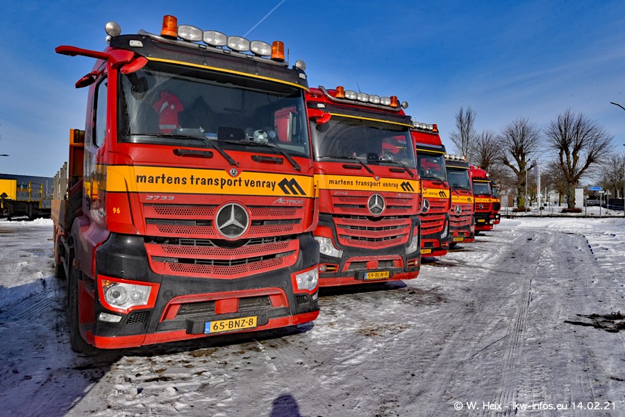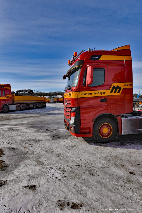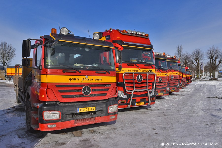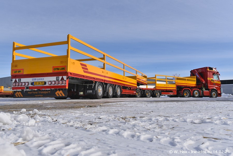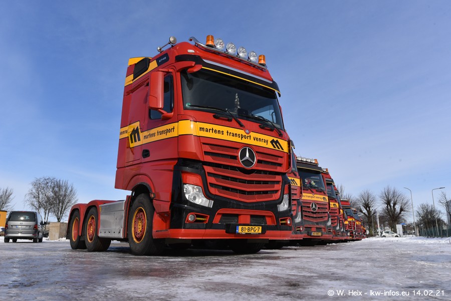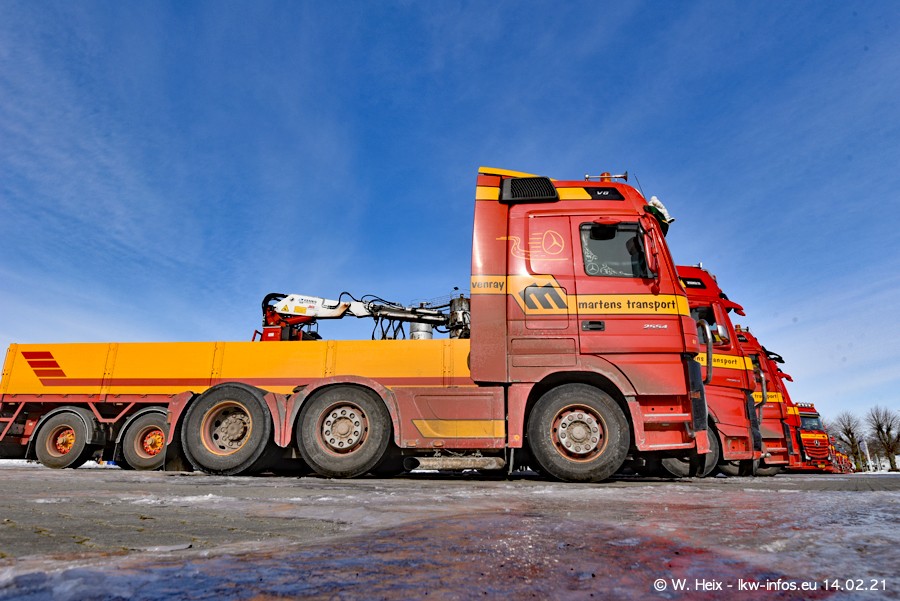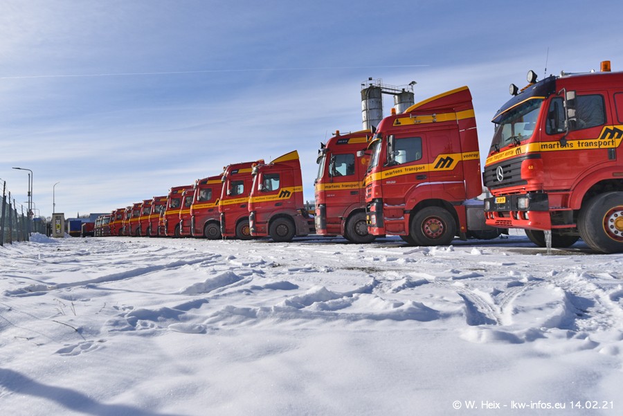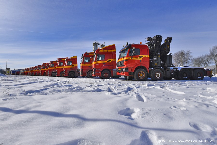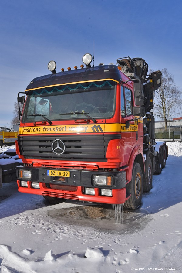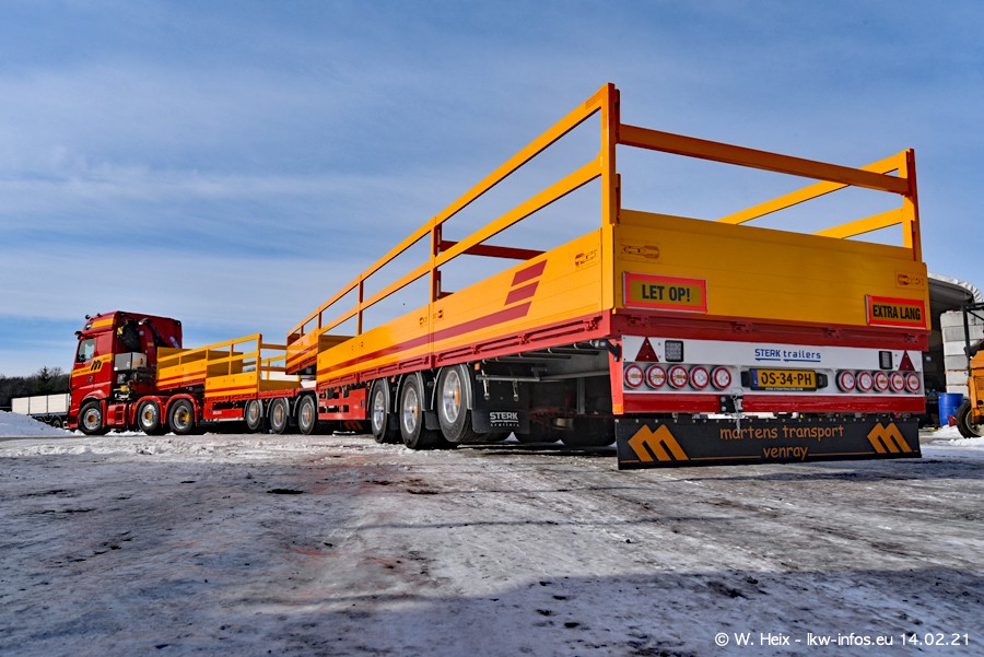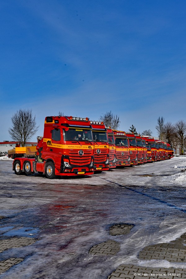 Wie schon in Teil 12 angekündigt, hat Martens Transport in dieser Woche die beiden neuen Auflieger für den Mercedes-Benz New Actros 2851 bekommen. Damit wird die Kombination zu einem LZV (Gigaliner). Die beiden Auflieger wurden von der niederländischen Firma Sterk Trailers gebaut. Der erste Auflieger ist kürzer als der zweite und die Besondeheit ist die auf dem Trailer montierte Sattelkupplung für den zweiten Auflieger, der ein Standardmaß hat. Die Sattelkupplung kann demontiert werden und dann kann der Auflieger "ganz normal" genutzt werden. Diese Art LZV ist in den Niederlanden bisher einzigartig und wird für den Transport von großen Bäumen und Pflanzen in den Niederlanden und Belgien eingesetzt. Ab der kommenden Woche. Und noch etwas hat sich verändert: die beiden bisher blauen Actros 4 Zugmaschinen wurden in den letzten Wochen rot lackiert und entsprechend beschriftet und passen jetzt zum restlichen Fuhrpark. Das das sind die beiden Zugmaschinen mit den silbergrauen Seitenverkleidungen und Kennzeichen "BPG ...". Die Fotos habe ich bei schönstem Winterwetter gemacht. Eis und Schnee sind in den Niederlanden inzwischen genauso selten, wie bei mir zuhause am Niederrhein. Entsprechend schmutig waren die LKW. Das gehört aber bei diesem Wetter irgendwie dazu. Alle LKW waren an diesem Sonntag Vormittag zuhause.