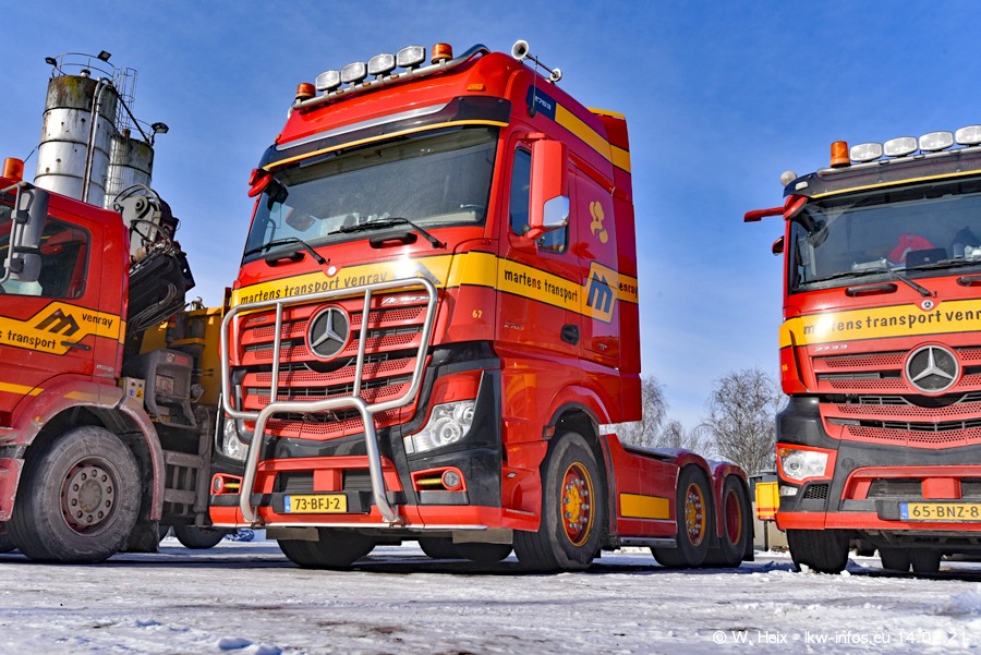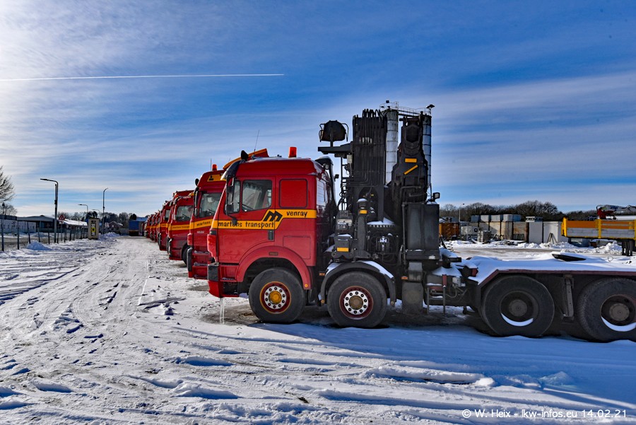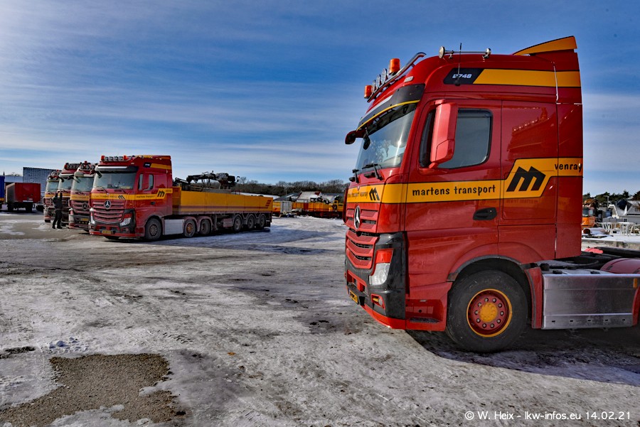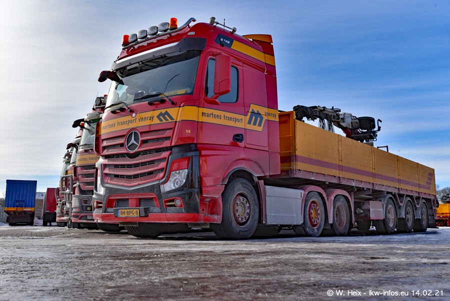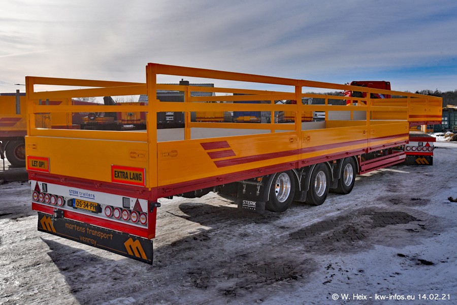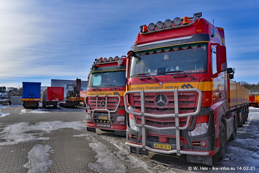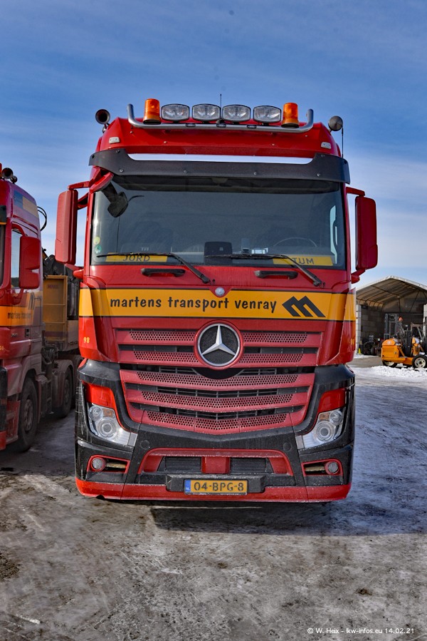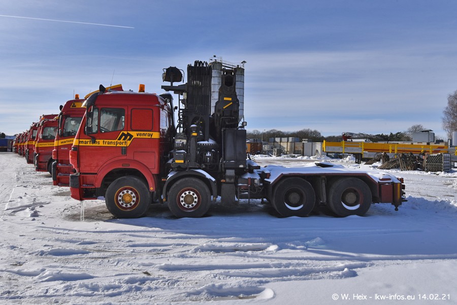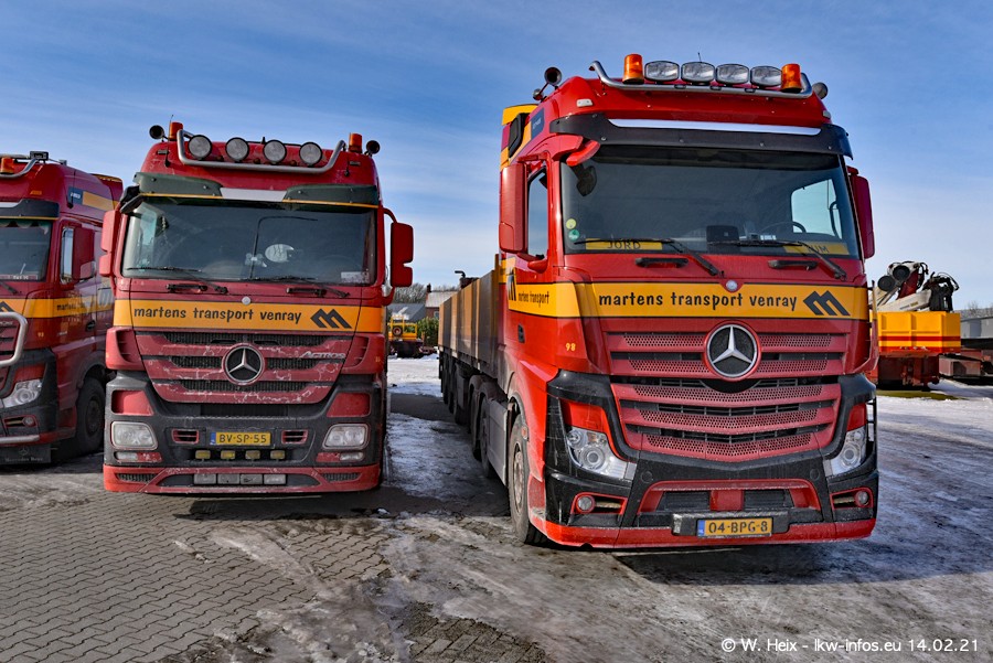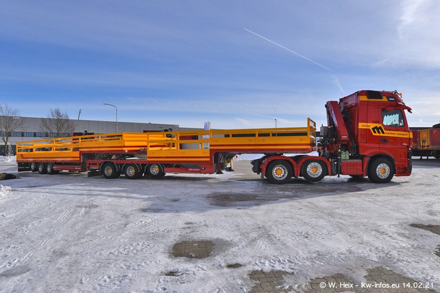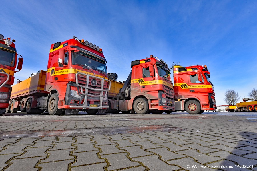 Wie schon in Teil 12 angekündigt, hat Martens Transport in dieser Woche die beiden neuen Auflieger für den Mercedes-Benz New Actros 2851 bekommen. Damit wird die Kombination zu einem LZV (Gigaliner). Die beiden Auflieger wurden von der niederländischen Firma Sterk Trailers gebaut. Der erste Auflieger ist kürzer als der zweite und die Besondeheit ist die auf dem Trailer montierte Sattelkupplung für den zweiten Auflieger, der ein Standardmaß hat. Die Sattelkupplung kann demontiert werden und dann kann der Auflieger "ganz normal" genutzt werden. Diese Art LZV ist in den Niederlanden bisher einzigartig und wird für den Transport von großen Bäumen und Pflanzen in den Niederlanden und Belgien eingesetzt. Ab der kommenden Woche. Und noch etwas hat sich verändert: die beiden bisher blauen Actros 4 Zugmaschinen wurden in den letzten Wochen rot lackiert und entsprechend beschriftet und passen jetzt zum restlichen Fuhrpark. Das das sind die beiden Zugmaschinen mit den silbergrauen Seitenverkleidungen und Kennzeichen "BPG ...". Die Fotos habe ich bei schönstem Winterwetter gemacht. Eis und Schnee sind in den Niederlanden inzwischen genauso selten, wie bei mir zuhause am Niederrhein. Entsprechend schmutig waren die LKW. Das gehört aber bei diesem Wetter irgendwie dazu. Alle LKW waren an diesem Sonntag Vormittag zuhause.