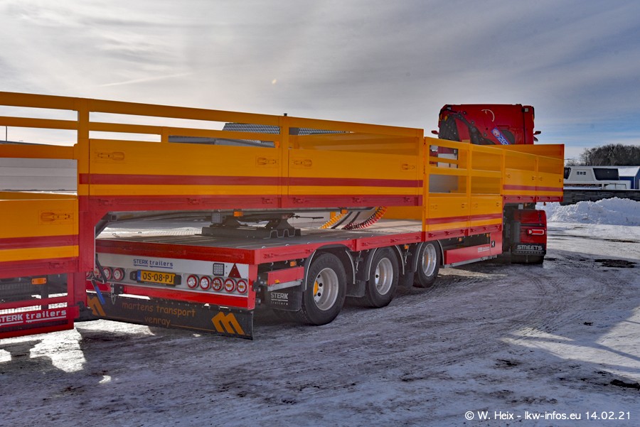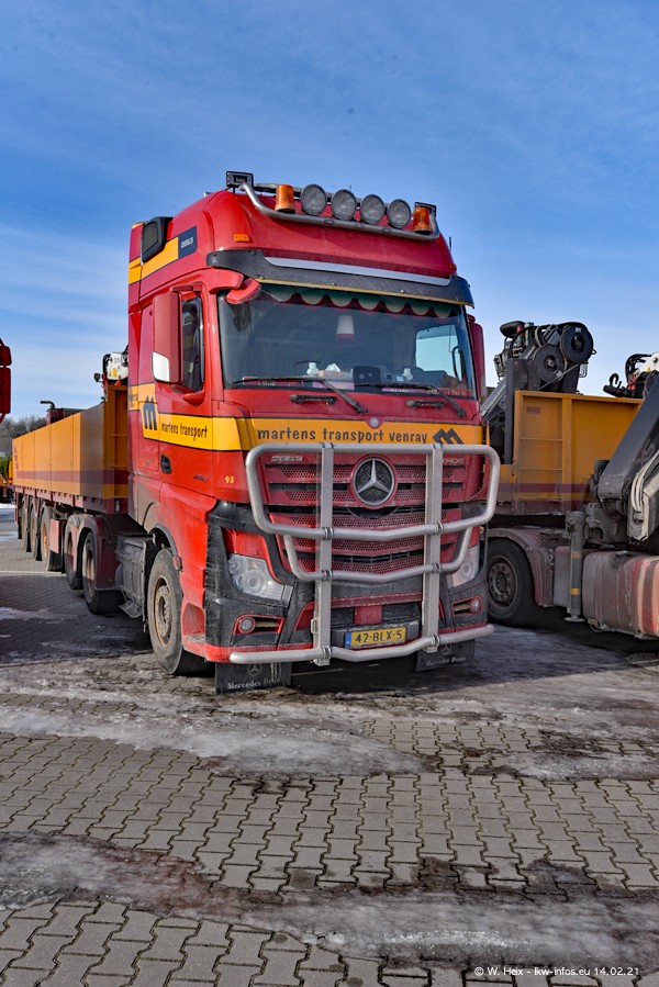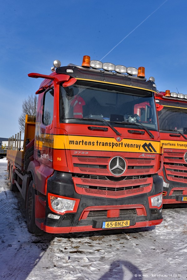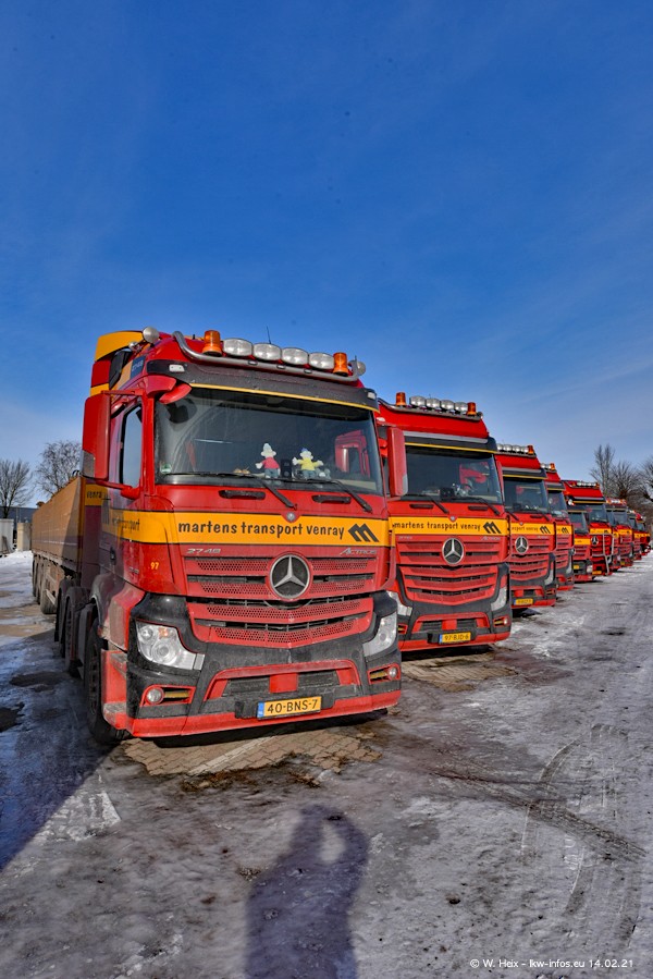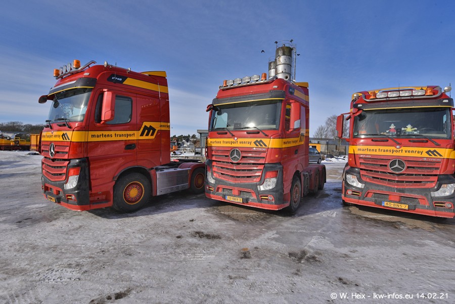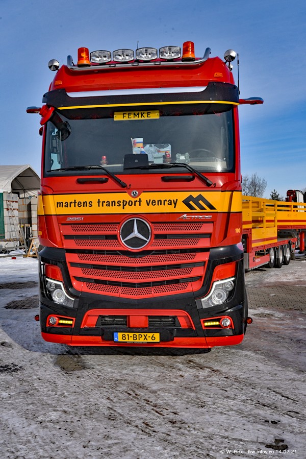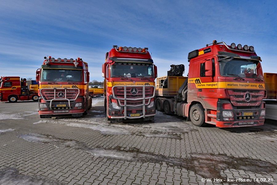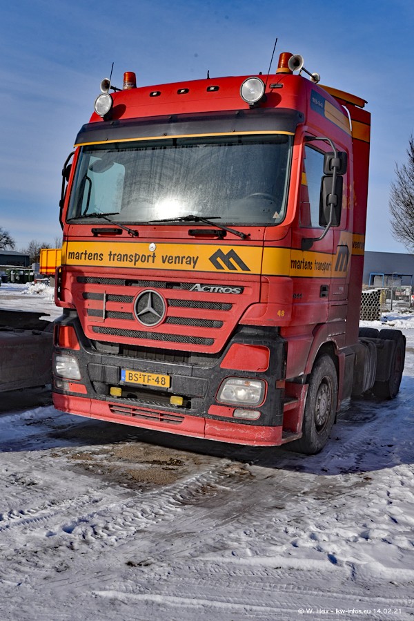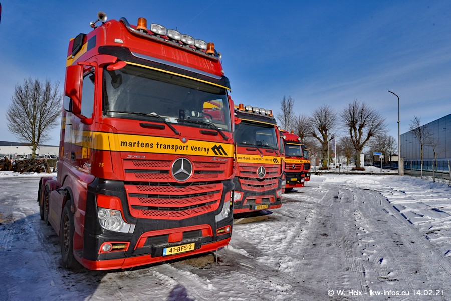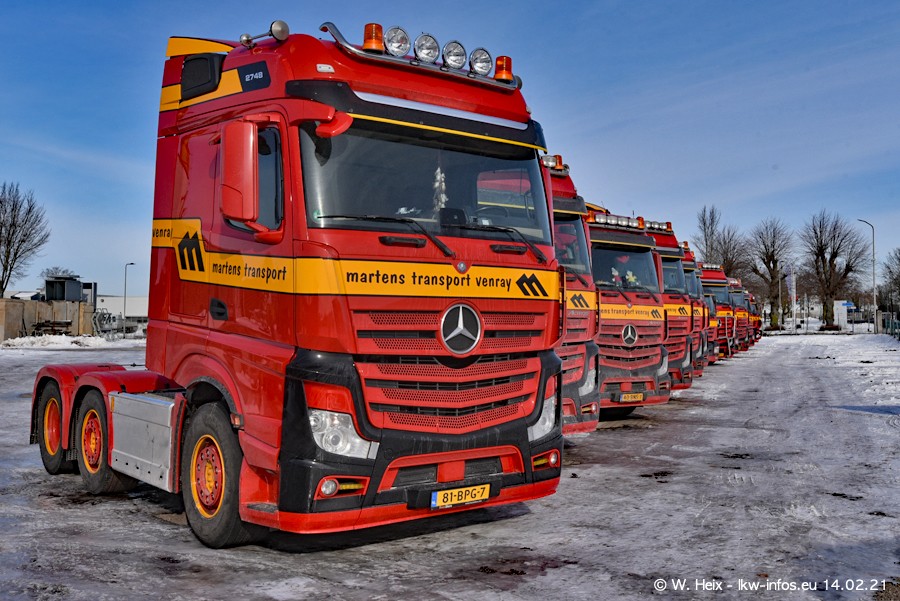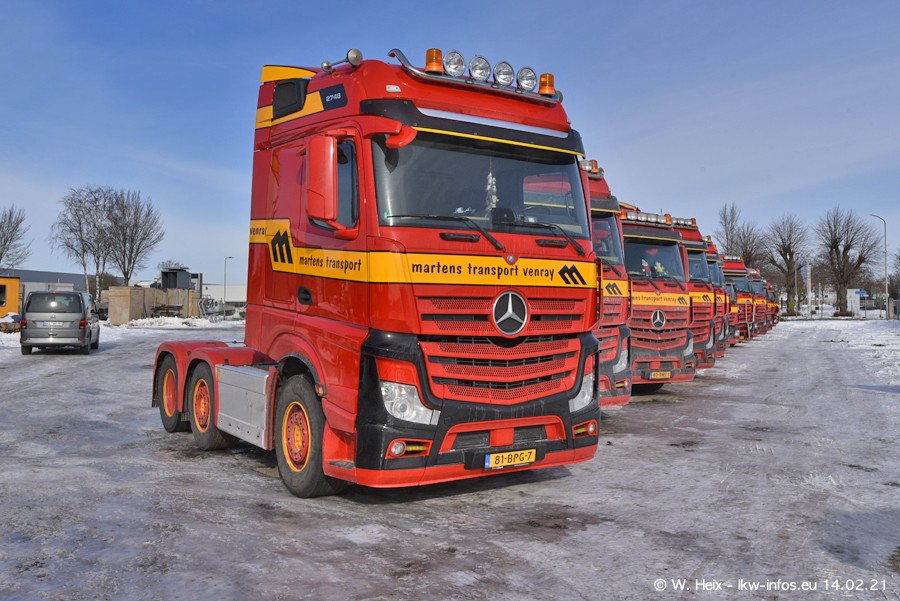 Wie schon in Teil 12 angekündigt, hat Martens Transport in dieser Woche die beiden neuen Auflieger für den Mercedes-Benz New Actros 2851 bekommen. Damit wird die Kombination zu einem LZV (Gigaliner). Die beiden Auflieger wurden von der niederländischen Firma Sterk Trailers gebaut. Der erste Auflieger ist kürzer als der zweite und die Besondeheit ist die auf dem Trailer montierte Sattelkupplung für den zweiten Auflieger, der ein Standardmaß hat. Die Sattelkupplung kann demontiert werden und dann kann der Auflieger "ganz normal" genutzt werden. Diese Art LZV ist in den Niederlanden bisher einzigartig und wird für den Transport von großen Bäumen und Pflanzen in den Niederlanden und Belgien eingesetzt. Ab der kommenden Woche. Und noch etwas hat sich verändert: die beiden bisher blauen Actros 4 Zugmaschinen wurden in den letzten Wochen rot lackiert und entsprechend beschriftet und passen jetzt zum restlichen Fuhrpark. Das das sind die beiden Zugmaschinen mit den silbergrauen Seitenverkleidungen und Kennzeichen "BPG ...". Die Fotos habe ich bei schönstem Winterwetter gemacht. Eis und Schnee sind in den Niederlanden inzwischen genauso selten, wie bei mir zuhause am Niederrhein. Entsprechend schmutig waren die LKW. Das gehört aber bei diesem Wetter irgendwie dazu. Alle LKW waren an diesem Sonntag Vormittag zuhause.