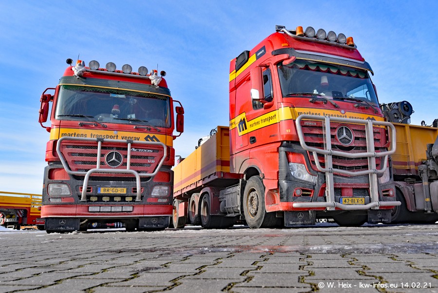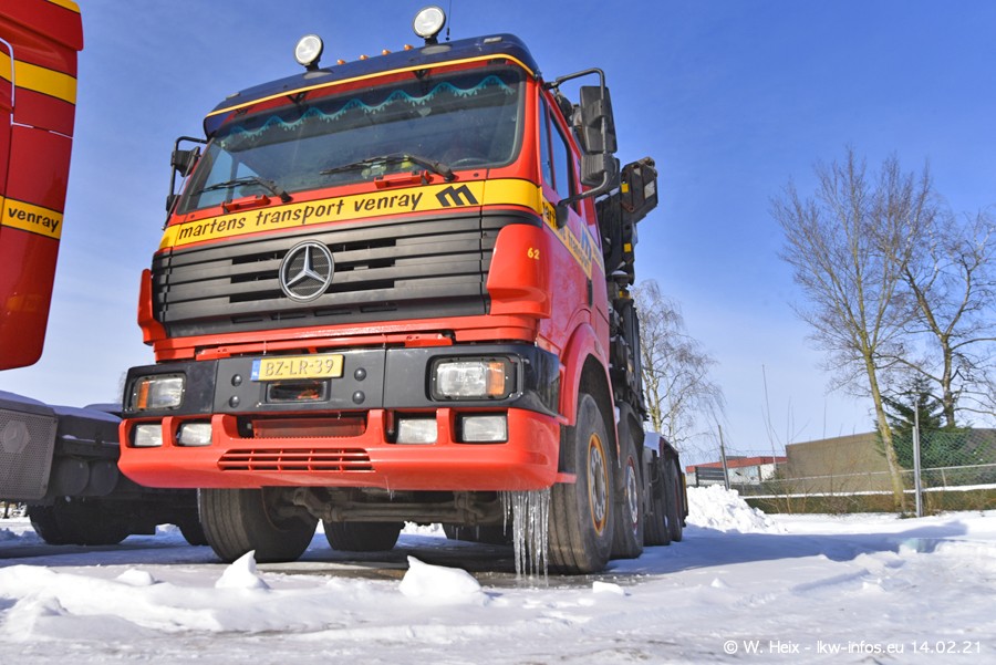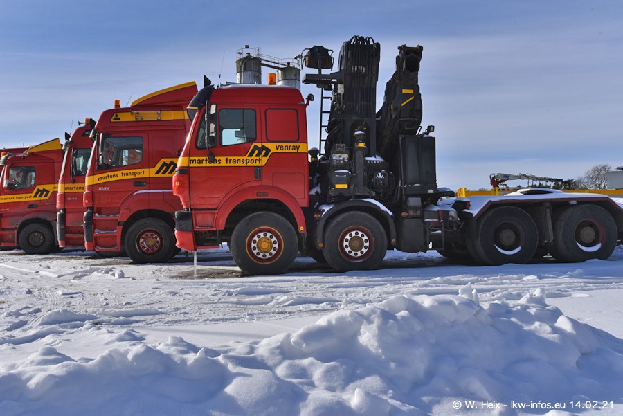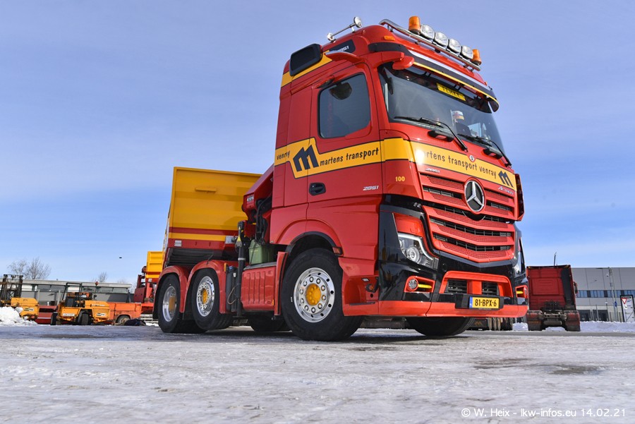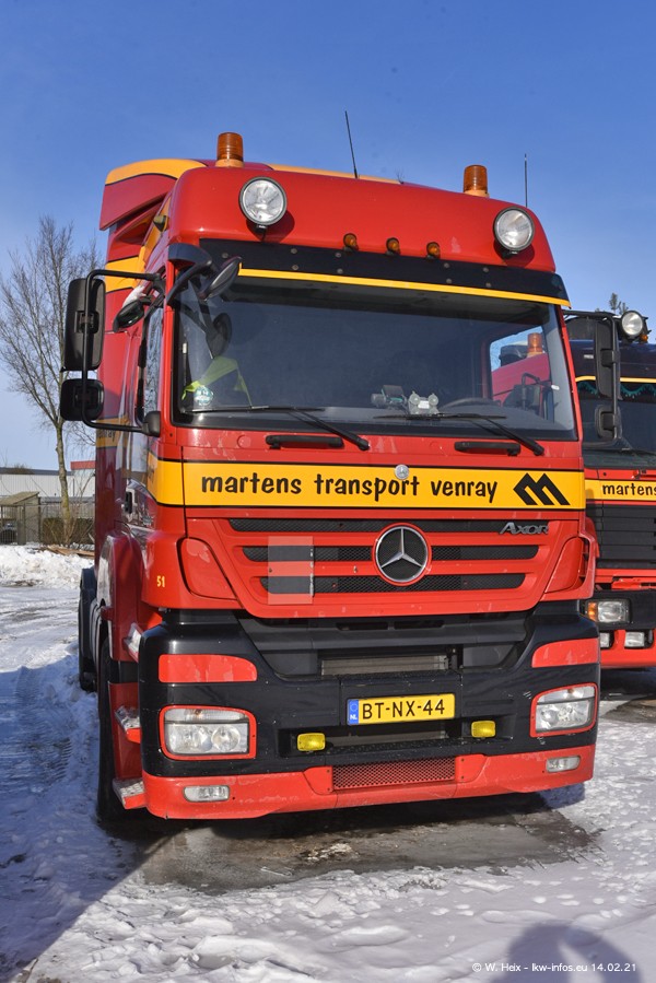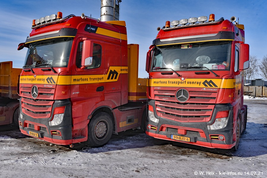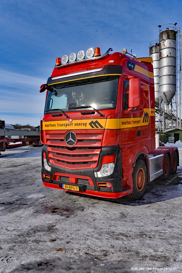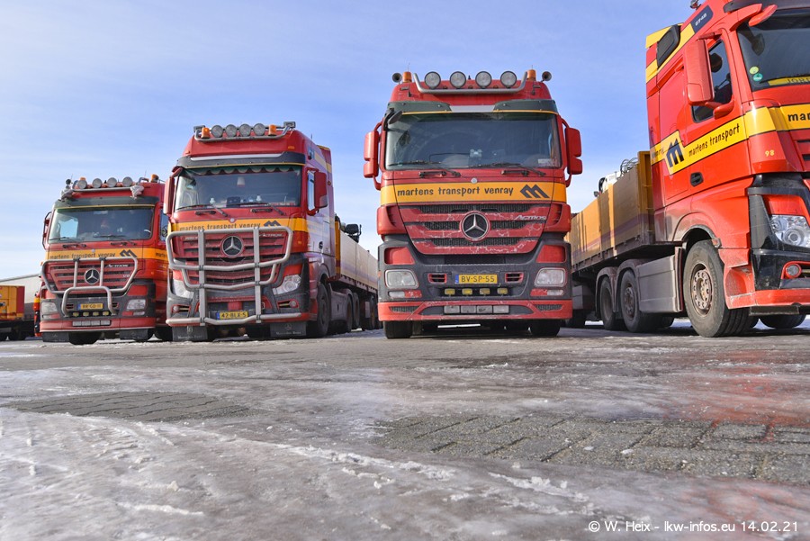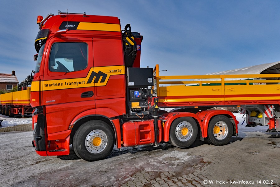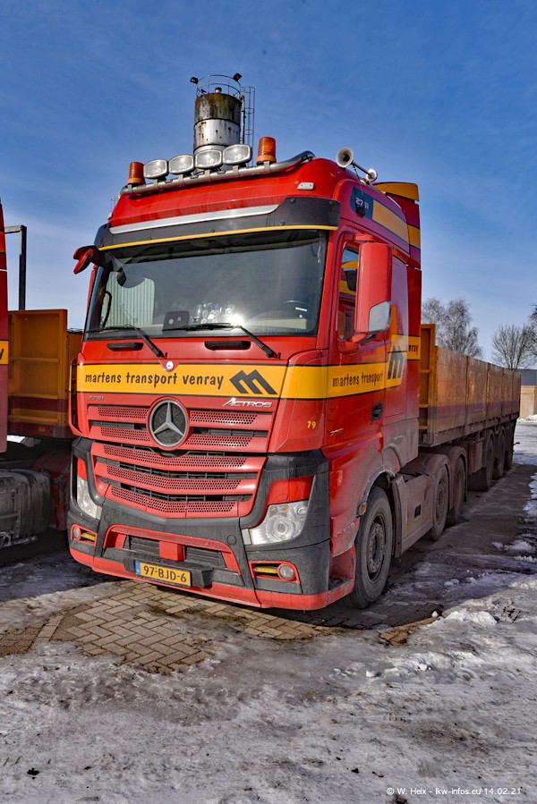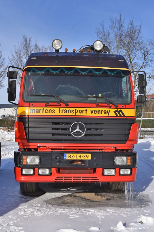 Wie schon in Teil 12 angekündigt, hat Martens Transport in dieser Woche die beiden neuen Auflieger für den Mercedes-Benz New Actros 2851 bekommen. Damit wird die Kombination zu einem LZV (Gigaliner). Die beiden Auflieger wurden von der niederländischen Firma Sterk Trailers gebaut. Der erste Auflieger ist kürzer als der zweite und die Besondeheit ist die auf dem Trailer montierte Sattelkupplung für den zweiten Auflieger, der ein Standardmaß hat. Die Sattelkupplung kann demontiert werden und dann kann der Auflieger "ganz normal" genutzt werden. Diese Art LZV ist in den Niederlanden bisher einzigartig und wird für den Transport von großen Bäumen und Pflanzen in den Niederlanden und Belgien eingesetzt. Ab der kommenden Woche. Und noch etwas hat sich verändert: die beiden bisher blauen Actros 4 Zugmaschinen wurden in den letzten Wochen rot lackiert und entsprechend beschriftet und passen jetzt zum restlichen Fuhrpark. Das das sind die beiden Zugmaschinen mit den silbergrauen Seitenverkleidungen und Kennzeichen "BPG ...". Die Fotos habe ich bei schönstem Winterwetter gemacht. Eis und Schnee sind in den Niederlanden inzwischen genauso selten, wie bei mir zuhause am Niederrhein. Entsprechend schmutig waren die LKW. Das gehört aber bei diesem Wetter irgendwie dazu. Alle LKW waren an diesem Sonntag Vormittag zuhause.