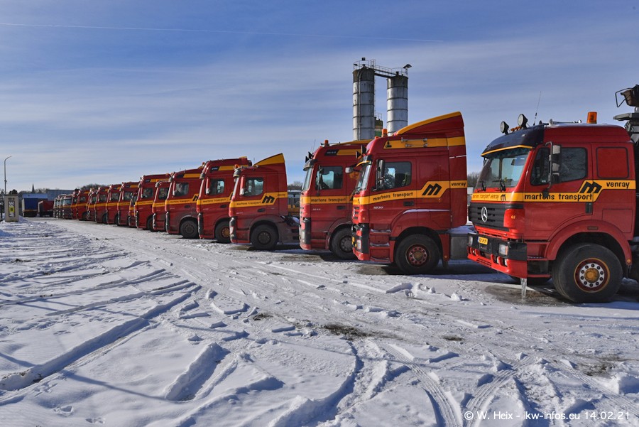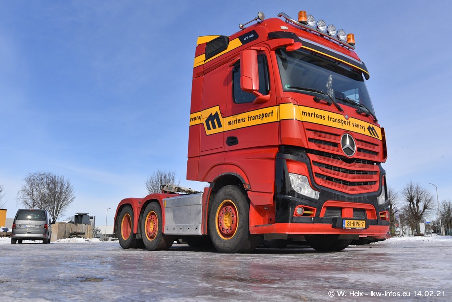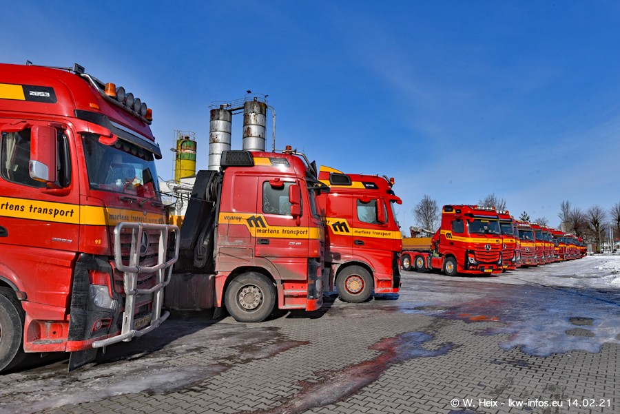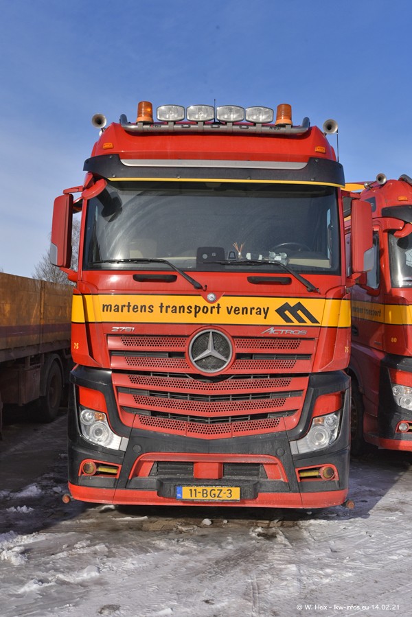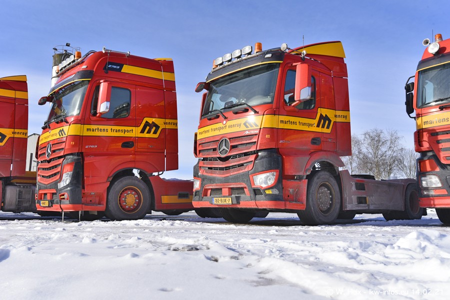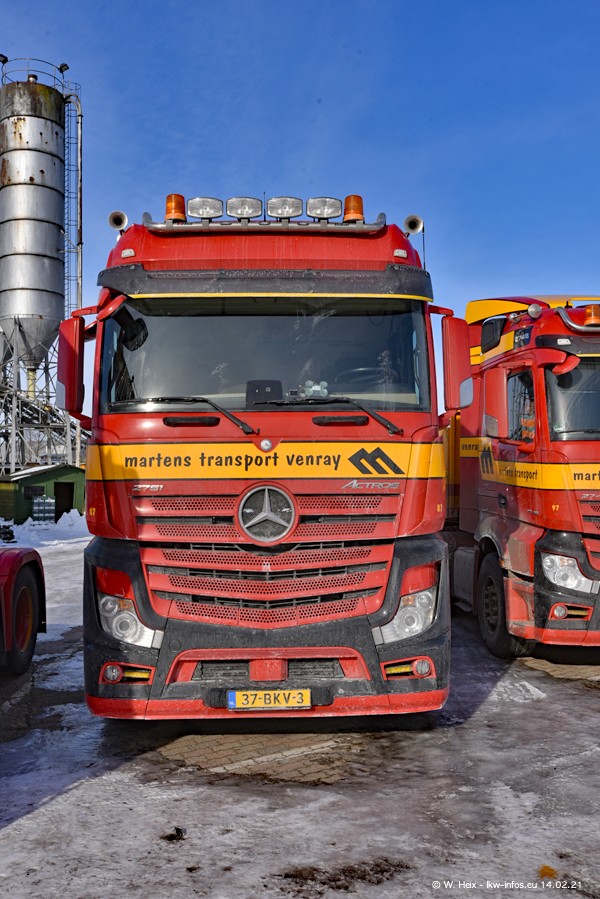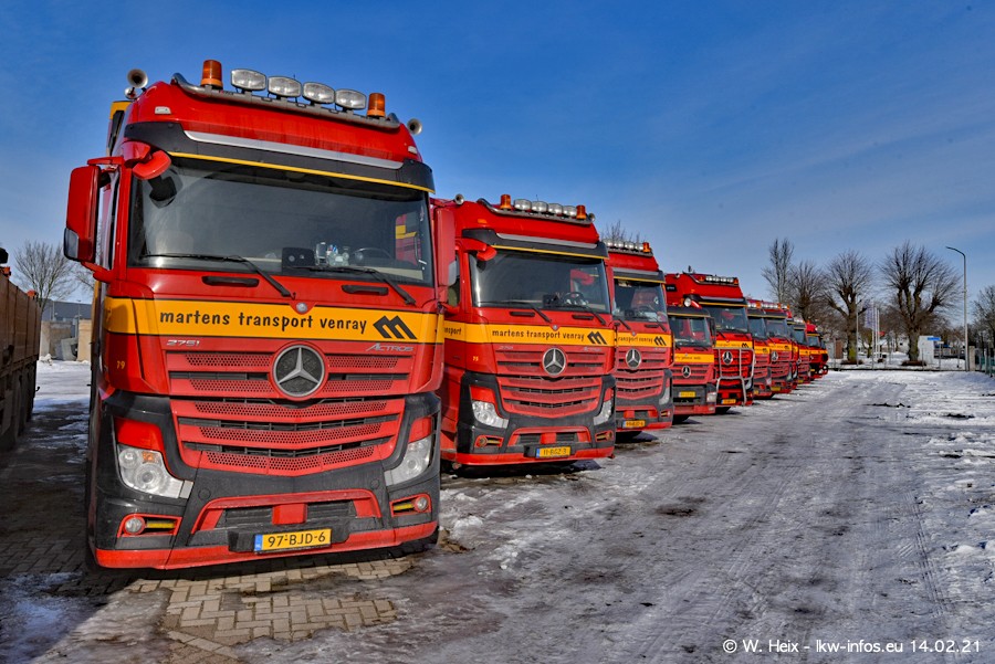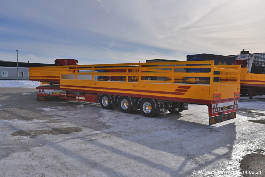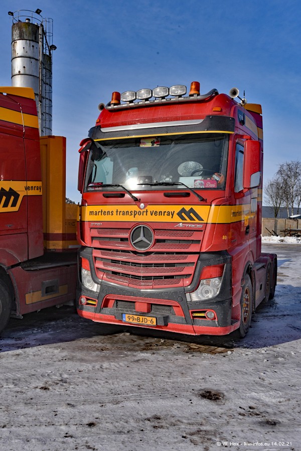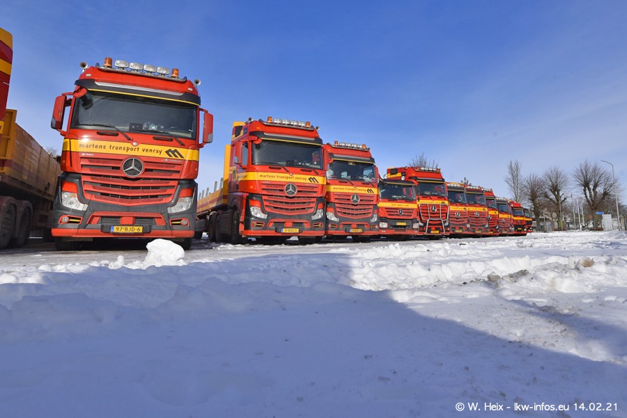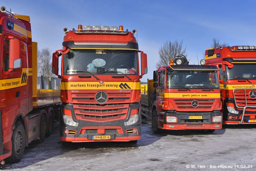 Wie schon in Teil 12 angekündigt, hat Martens Transport in dieser Woche die beiden neuen Auflieger für den Mercedes-Benz New Actros 2851 bekommen. Damit wird die Kombination zu einem LZV (Gigaliner). Die beiden Auflieger wurden von der niederländischen Firma Sterk Trailers gebaut. Der erste Auflieger ist kürzer als der zweite und die Besondeheit ist die auf dem Trailer montierte Sattelkupplung für den zweiten Auflieger, der ein Standardmaß hat. Die Sattelkupplung kann demontiert werden und dann kann der Auflieger "ganz normal" genutzt werden. Diese Art LZV ist in den Niederlanden bisher einzigartig und wird für den Transport von großen Bäumen und Pflanzen in den Niederlanden und Belgien eingesetzt. Ab der kommenden Woche. Und noch etwas hat sich verändert: die beiden bisher blauen Actros 4 Zugmaschinen wurden in den letzten Wochen rot lackiert und entsprechend beschriftet und passen jetzt zum restlichen Fuhrpark. Das das sind die beiden Zugmaschinen mit den silbergrauen Seitenverkleidungen und Kennzeichen "BPG ...". Die Fotos habe ich bei schönstem Winterwetter gemacht. Eis und Schnee sind in den Niederlanden inzwischen genauso selten, wie bei mir zuhause am Niederrhein. Entsprechend schmutig waren die LKW. Das gehört aber bei diesem Wetter irgendwie dazu. Alle LKW waren an diesem Sonntag Vormittag zuhause.