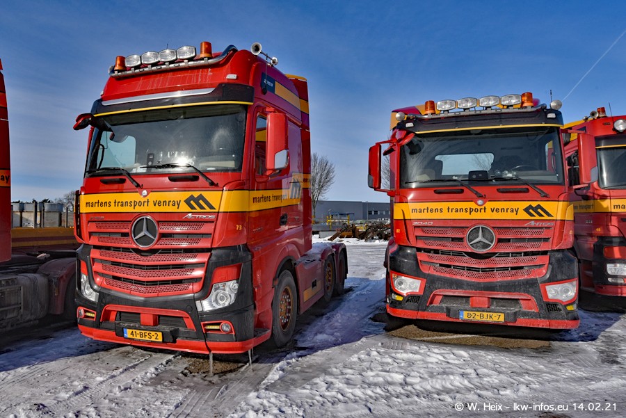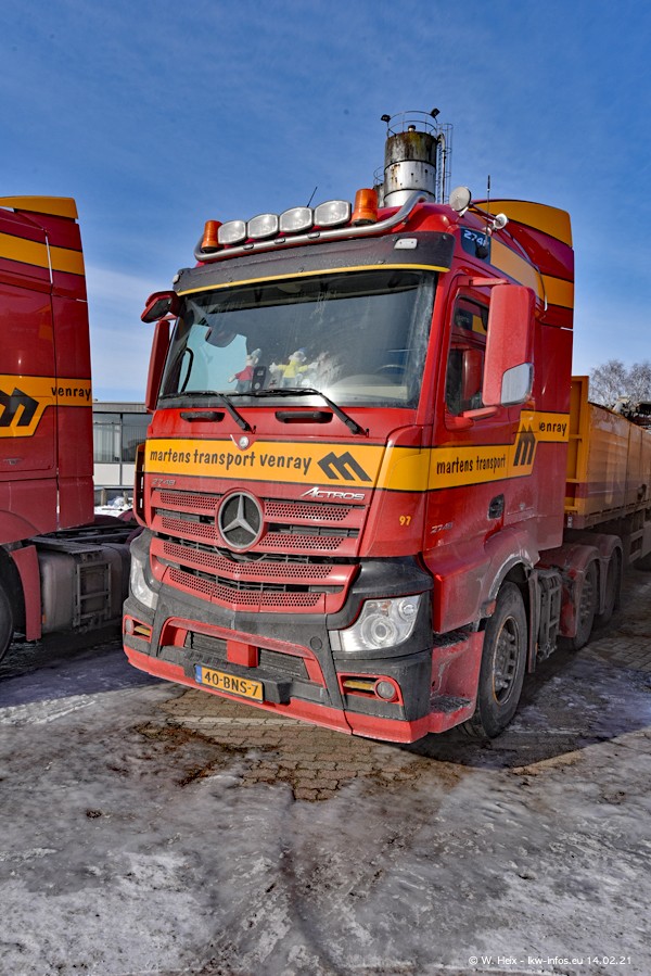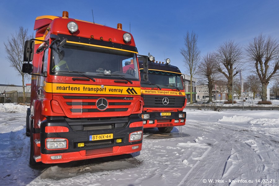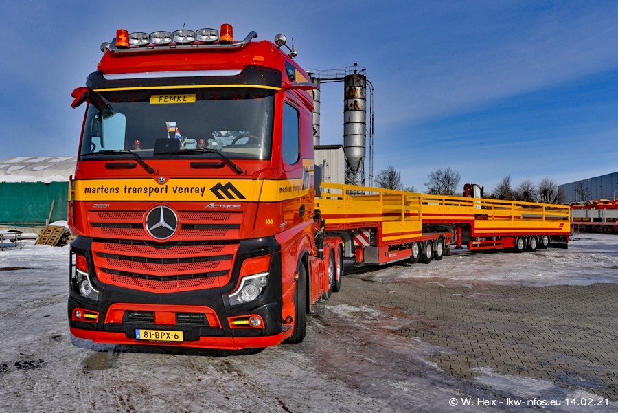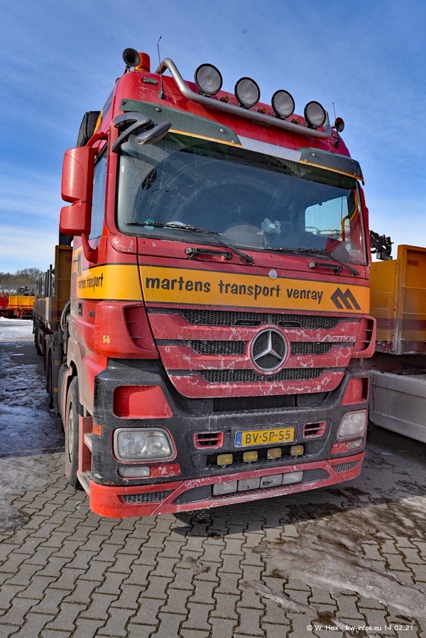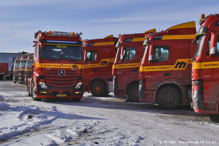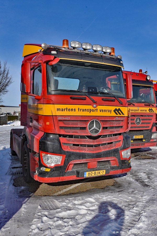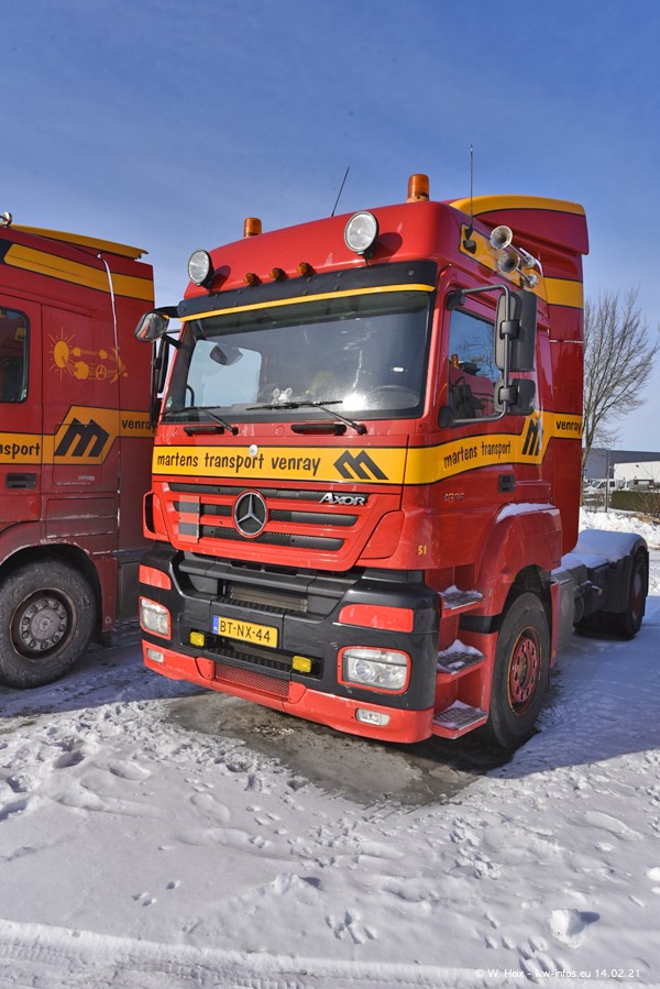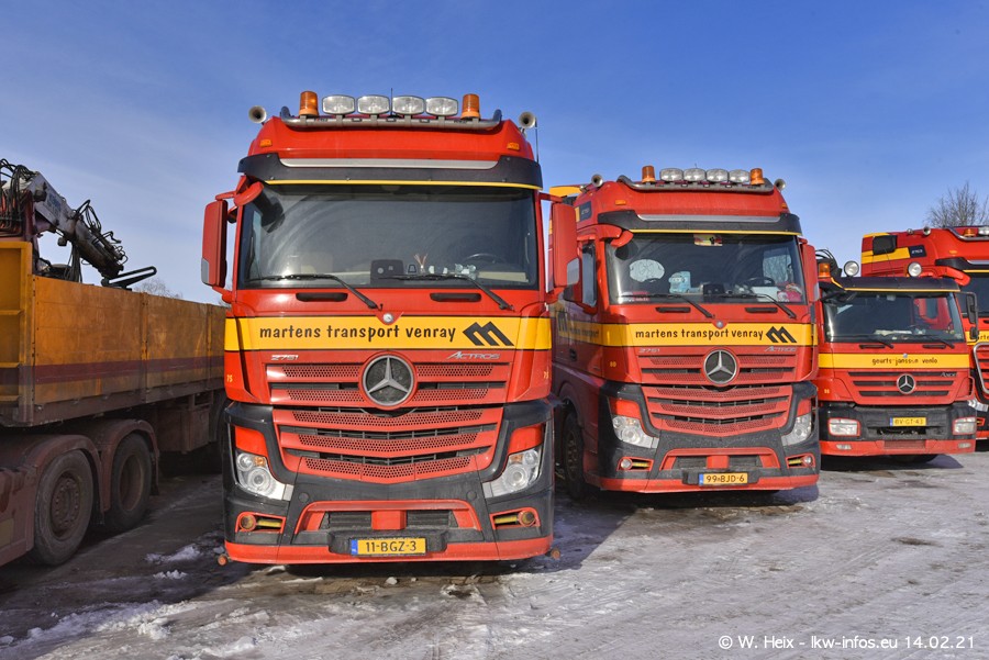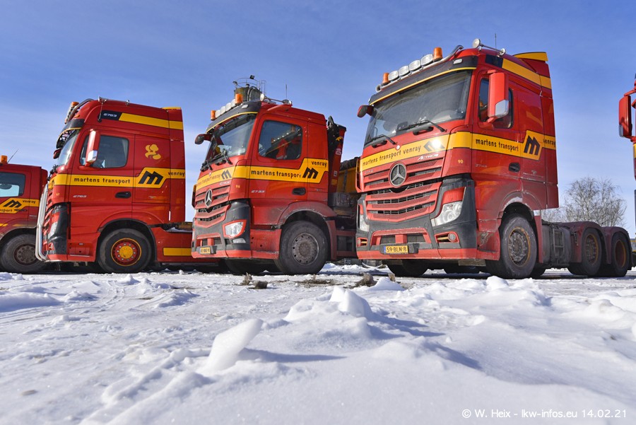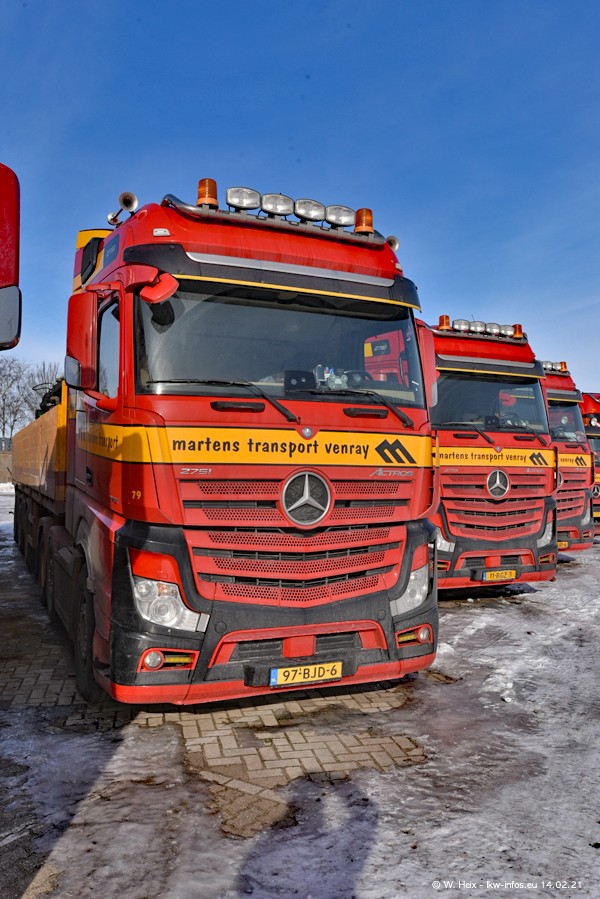 Wie schon in Teil 12 angekündigt, hat Martens Transport in dieser Woche die beiden neuen Auflieger für den Mercedes-Benz New Actros 2851 bekommen. Damit wird die Kombination zu einem LZV (Gigaliner). Die beiden Auflieger wurden von der niederländischen Firma Sterk Trailers gebaut. Der erste Auflieger ist kürzer als der zweite und die Besondeheit ist die auf dem Trailer montierte Sattelkupplung für den zweiten Auflieger, der ein Standardmaß hat. Die Sattelkupplung kann demontiert werden und dann kann der Auflieger "ganz normal" genutzt werden. Diese Art LZV ist in den Niederlanden bisher einzigartig und wird für den Transport von großen Bäumen und Pflanzen in den Niederlanden und Belgien eingesetzt. Ab der kommenden Woche. Und noch etwas hat sich verändert: die beiden bisher blauen Actros 4 Zugmaschinen wurden in den letzten Wochen rot lackiert und entsprechend beschriftet und passen jetzt zum restlichen Fuhrpark. Das das sind die beiden Zugmaschinen mit den silbergrauen Seitenverkleidungen und Kennzeichen "BPG ...". Die Fotos habe ich bei schönstem Winterwetter gemacht. Eis und Schnee sind in den Niederlanden inzwischen genauso selten, wie bei mir zuhause am Niederrhein. Entsprechend schmutig waren die LKW. Das gehört aber bei diesem Wetter irgendwie dazu. Alle LKW waren an diesem Sonntag Vormittag zuhause.