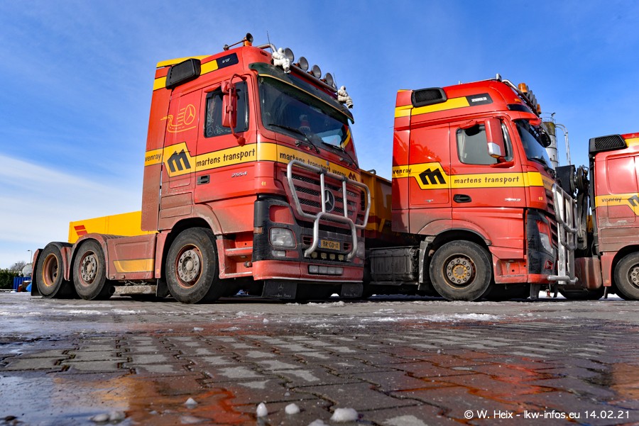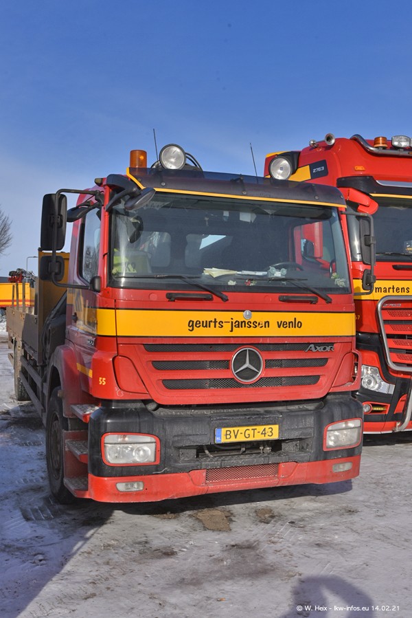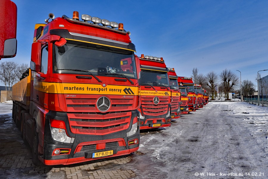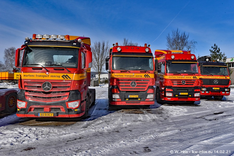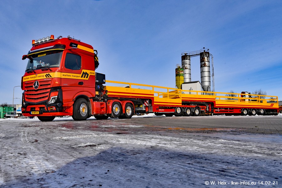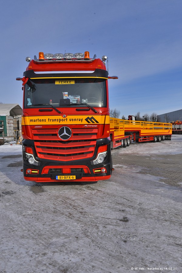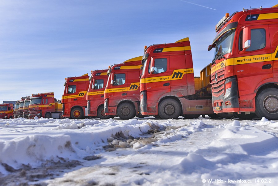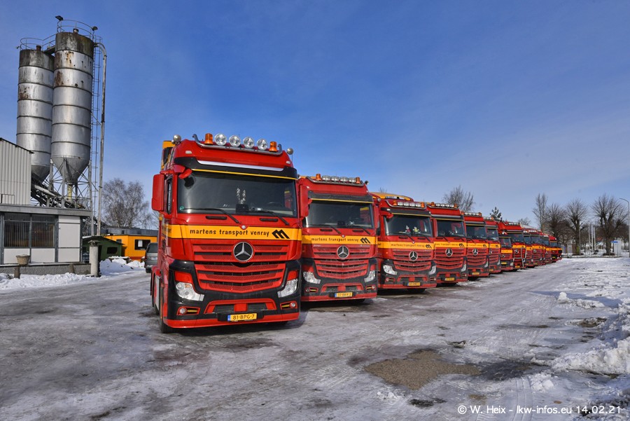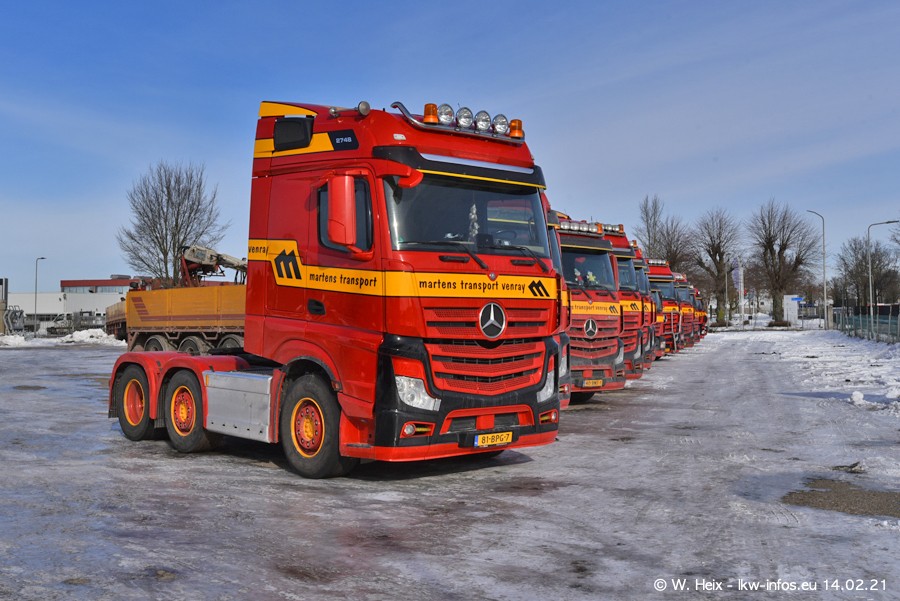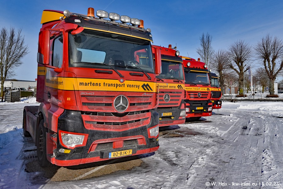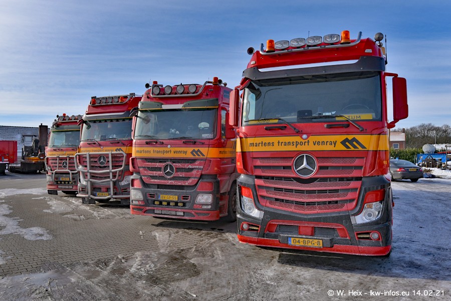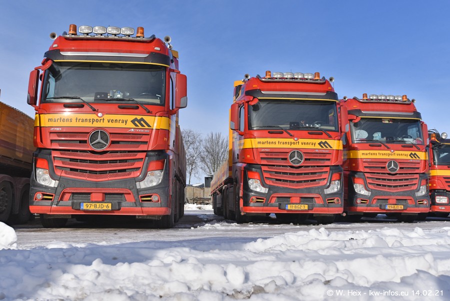 Wie schon in Teil 12 angekündigt, hat Martens Transport in dieser Woche die beiden neuen Auflieger für den Mercedes-Benz New Actros 2851 bekommen. Damit wird die Kombination zu einem LZV (Gigaliner). Die beiden Auflieger wurden von der niederländischen Firma Sterk Trailers gebaut. Der erste Auflieger ist kürzer als der zweite und die Besondeheit ist die auf dem Trailer montierte Sattelkupplung für den zweiten Auflieger, der ein Standardmaß hat. Die Sattelkupplung kann demontiert werden und dann kann der Auflieger "ganz normal" genutzt werden. Diese Art LZV ist in den Niederlanden bisher einzigartig und wird für den Transport von großen Bäumen und Pflanzen in den Niederlanden und Belgien eingesetzt. Ab der kommenden Woche. Und noch etwas hat sich verändert: die beiden bisher blauen Actros 4 Zugmaschinen wurden in den letzten Wochen rot lackiert und entsprechend beschriftet und passen jetzt zum restlichen Fuhrpark. Das das sind die beiden Zugmaschinen mit den silbergrauen Seitenverkleidungen und Kennzeichen "BPG ...". Die Fotos habe ich bei schönstem Winterwetter gemacht. Eis und Schnee sind in den Niederlanden inzwischen genauso selten, wie bei mir zuhause am Niederrhein. Entsprechend schmutig waren die LKW. Das gehört aber bei diesem Wetter irgendwie dazu. Alle LKW waren an diesem Sonntag Vormittag zuhause.