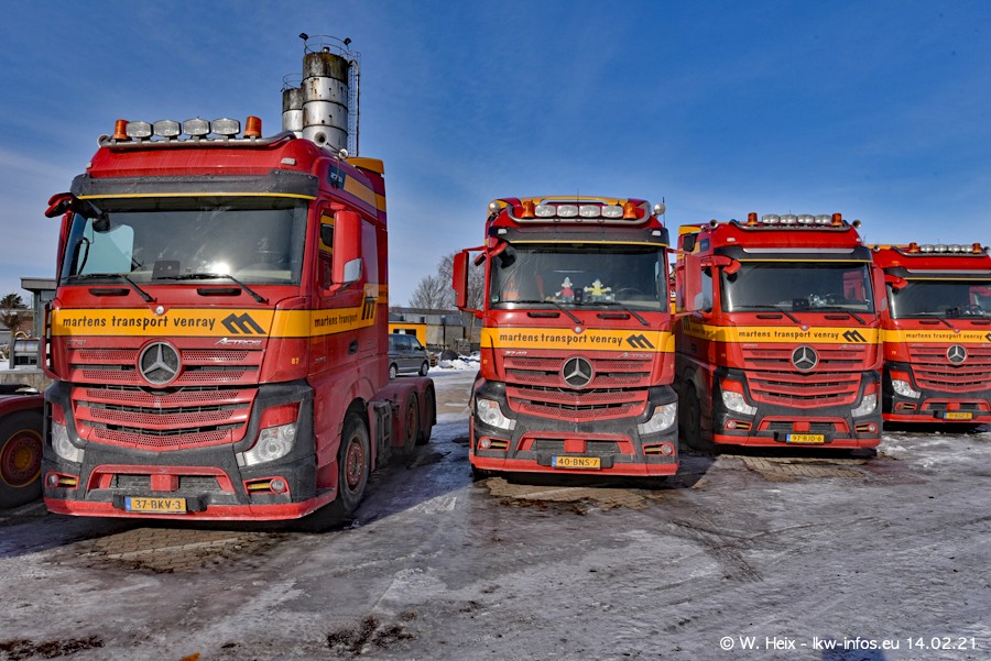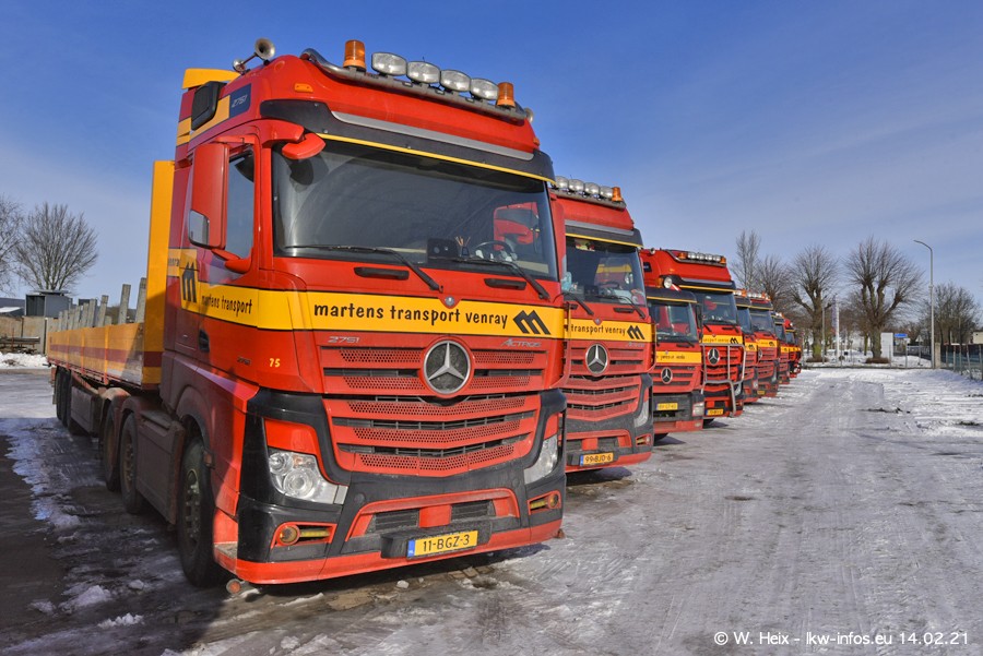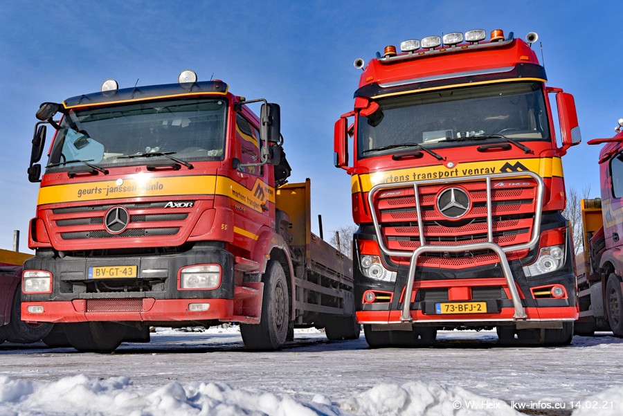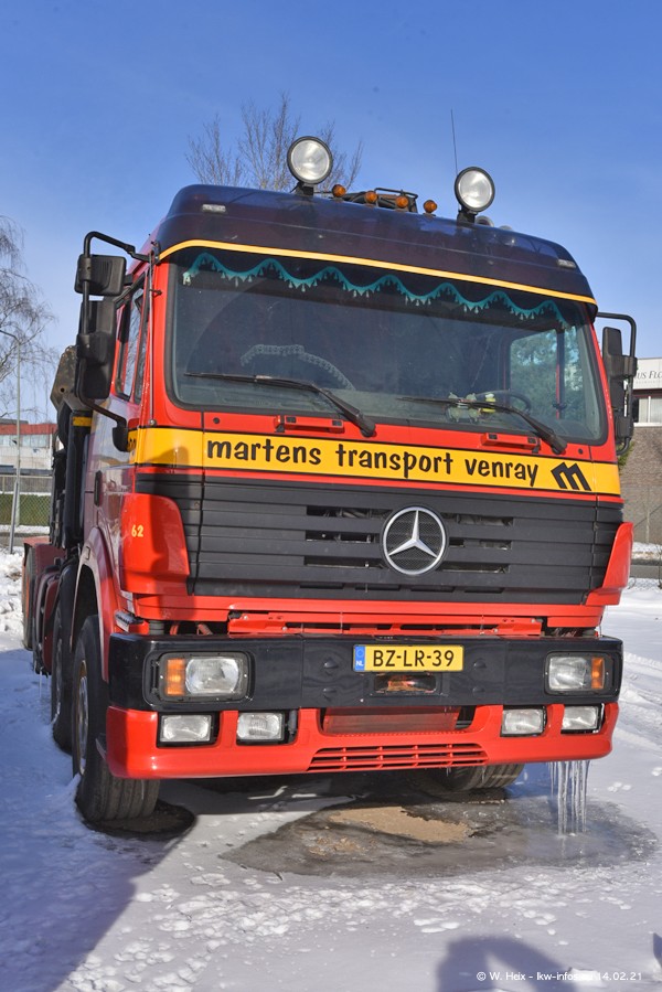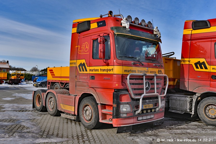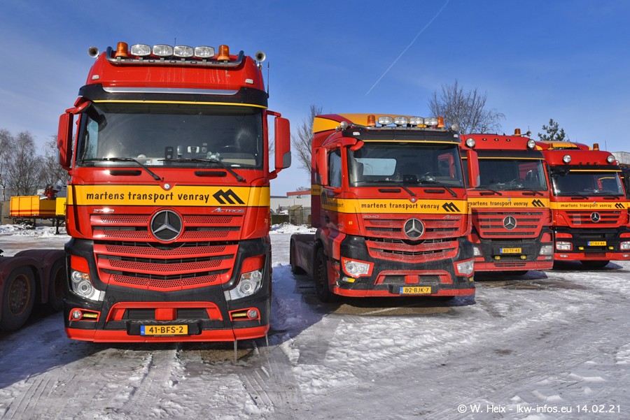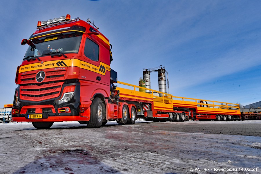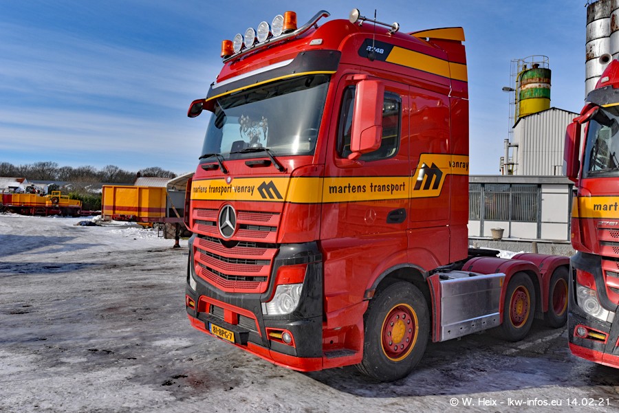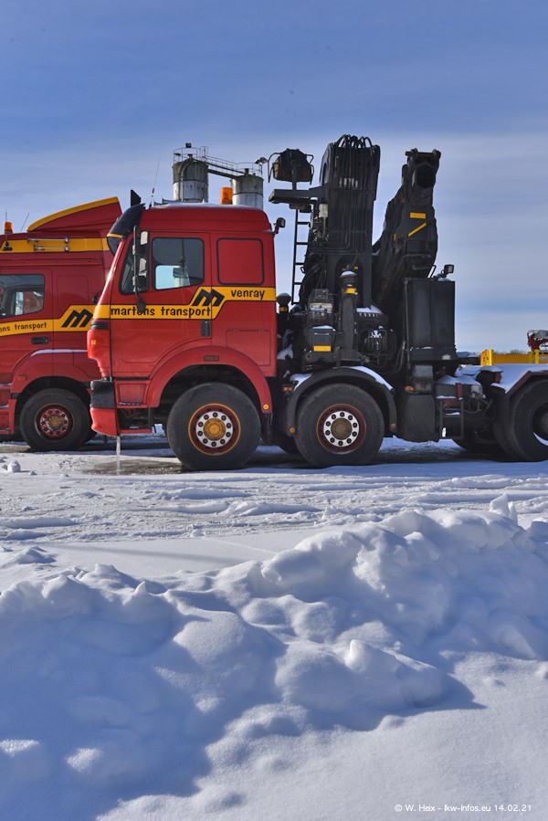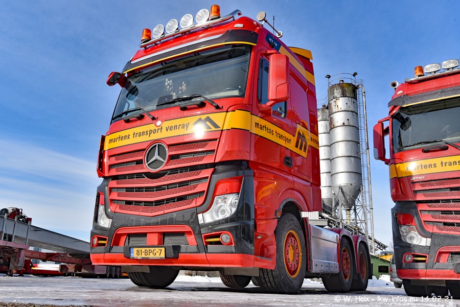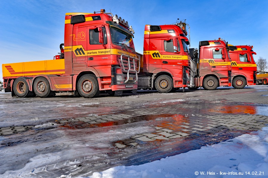 Wie schon in Teil 12 angekündigt, hat Martens Transport in dieser Woche die beiden neuen Auflieger für den Mercedes-Benz New Actros 2851 bekommen. Damit wird die Kombination zu einem LZV (Gigaliner). Die beiden Auflieger wurden von der niederländischen Firma Sterk Trailers gebaut. Der erste Auflieger ist kürzer als der zweite und die Besondeheit ist die auf dem Trailer montierte Sattelkupplung für den zweiten Auflieger, der ein Standardmaß hat. Die Sattelkupplung kann demontiert werden und dann kann der Auflieger "ganz normal" genutzt werden. Diese Art LZV ist in den Niederlanden bisher einzigartig und wird für den Transport von großen Bäumen und Pflanzen in den Niederlanden und Belgien eingesetzt. Ab der kommenden Woche. Und noch etwas hat sich verändert: die beiden bisher blauen Actros 4 Zugmaschinen wurden in den letzten Wochen rot lackiert und entsprechend beschriftet und passen jetzt zum restlichen Fuhrpark. Das das sind die beiden Zugmaschinen mit den silbergrauen Seitenverkleidungen und Kennzeichen "BPG ...". Die Fotos habe ich bei schönstem Winterwetter gemacht. Eis und Schnee sind in den Niederlanden inzwischen genauso selten, wie bei mir zuhause am Niederrhein. Entsprechend schmutig waren die LKW. Das gehört aber bei diesem Wetter irgendwie dazu. Alle LKW waren an diesem Sonntag Vormittag zuhause.