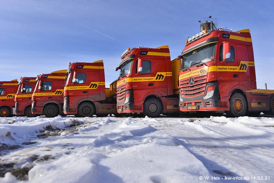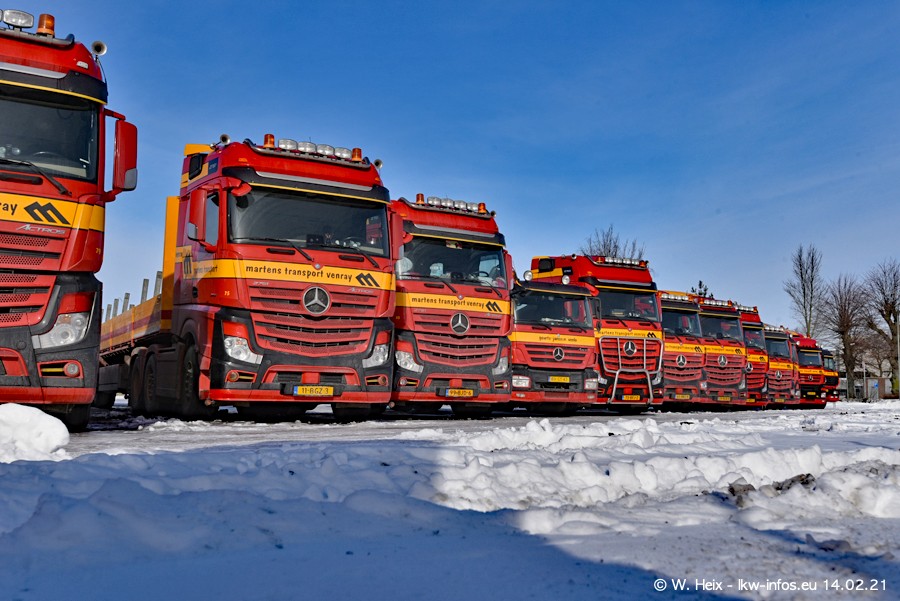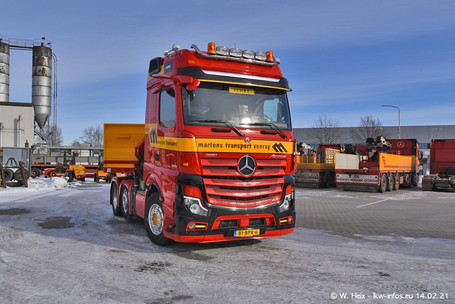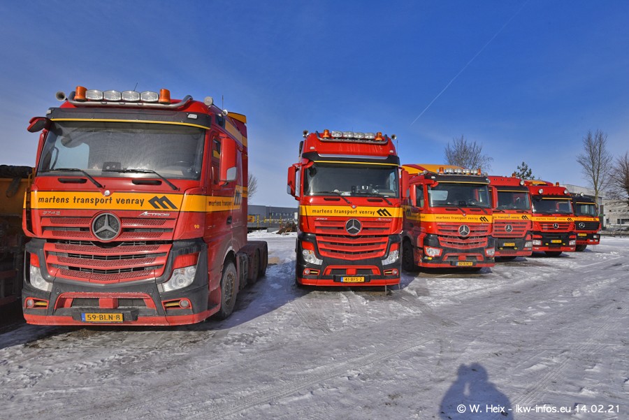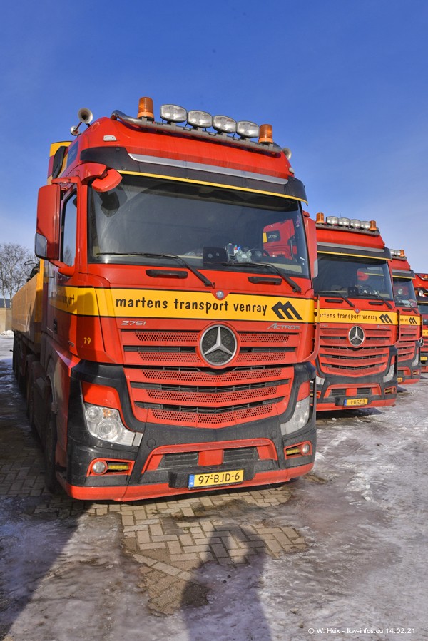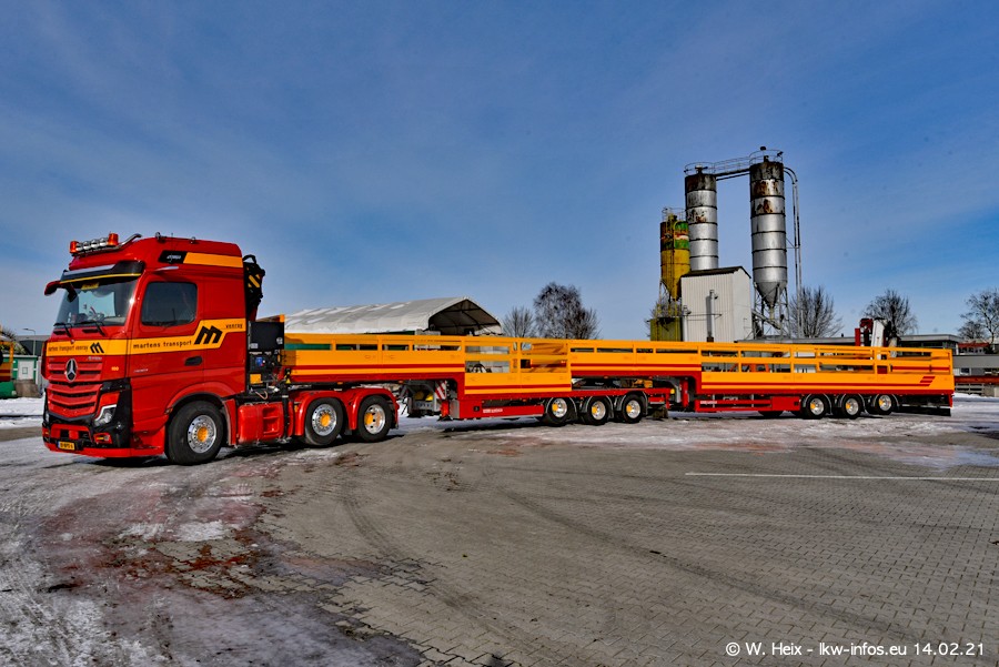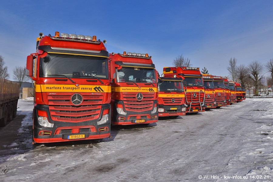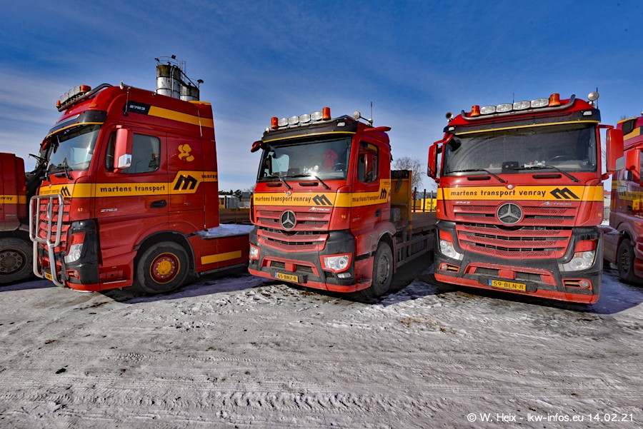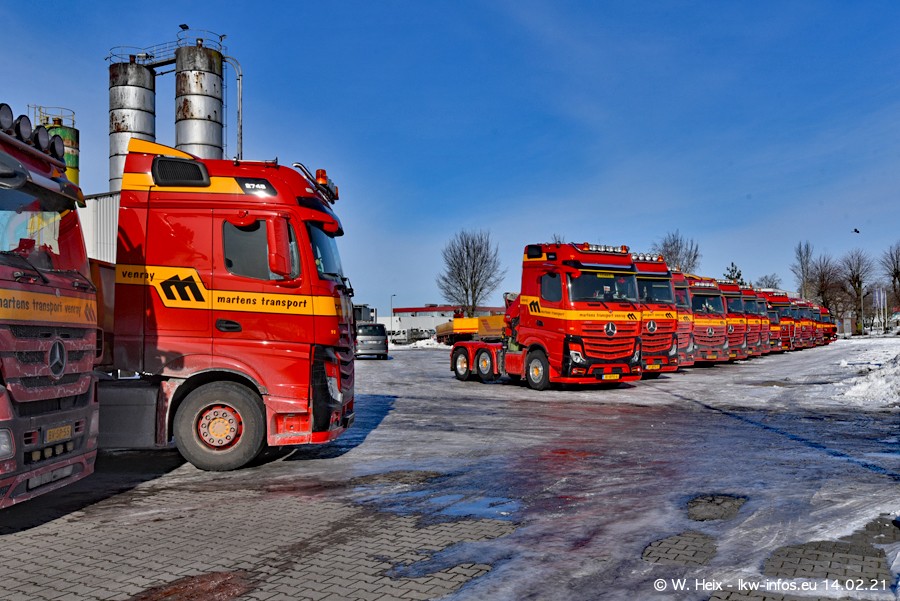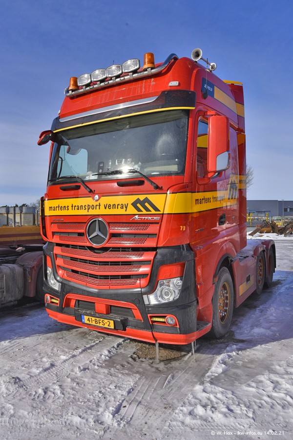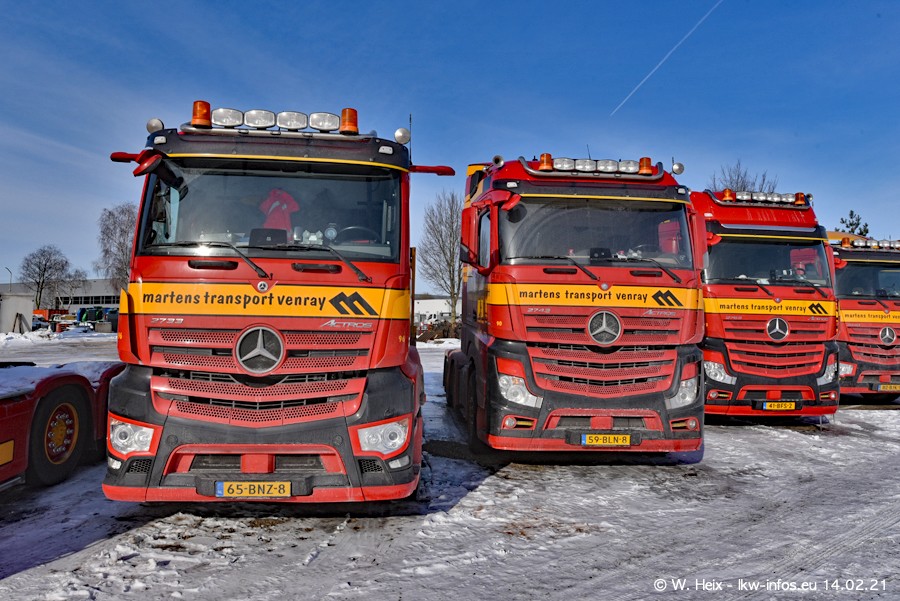 Wie schon in Teil 12 angekündigt, hat Martens Transport in dieser Woche die beiden neuen Auflieger für den Mercedes-Benz New Actros 2851 bekommen. Damit wird die Kombination zu einem LZV (Gigaliner). Die beiden Auflieger wurden von der niederländischen Firma Sterk Trailers gebaut. Der erste Auflieger ist kürzer als der zweite und die Besondeheit ist die auf dem Trailer montierte Sattelkupplung für den zweiten Auflieger, der ein Standardmaß hat. Die Sattelkupplung kann demontiert werden und dann kann der Auflieger "ganz normal" genutzt werden. Diese Art LZV ist in den Niederlanden bisher einzigartig und wird für den Transport von großen Bäumen und Pflanzen in den Niederlanden und Belgien eingesetzt. Ab der kommenden Woche. Und noch etwas hat sich verändert: die beiden bisher blauen Actros 4 Zugmaschinen wurden in den letzten Wochen rot lackiert und entsprechend beschriftet und passen jetzt zum restlichen Fuhrpark. Das das sind die beiden Zugmaschinen mit den silbergrauen Seitenverkleidungen und Kennzeichen "BPG ...". Die Fotos habe ich bei schönstem Winterwetter gemacht. Eis und Schnee sind in den Niederlanden inzwischen genauso selten, wie bei mir zuhause am Niederrhein. Entsprechend schmutig waren die LKW. Das gehört aber bei diesem Wetter irgendwie dazu. Alle LKW waren an diesem Sonntag Vormittag zuhause.