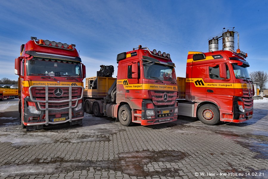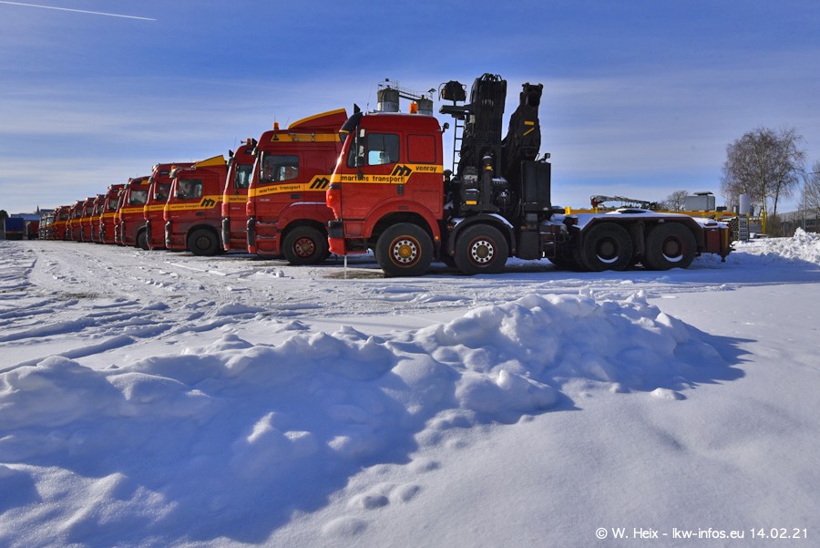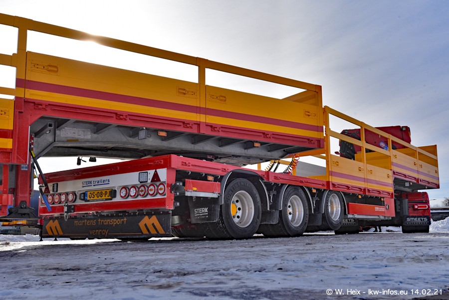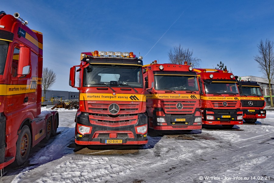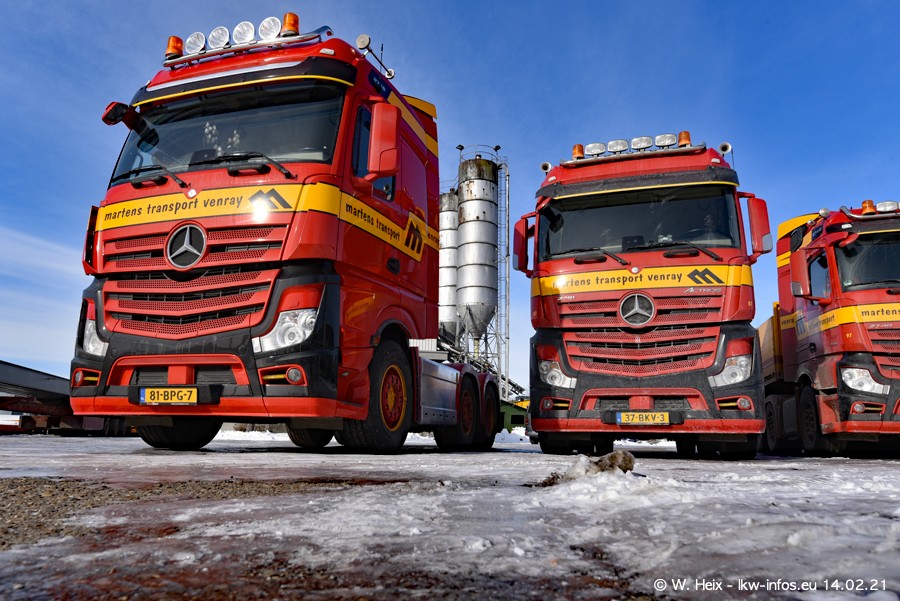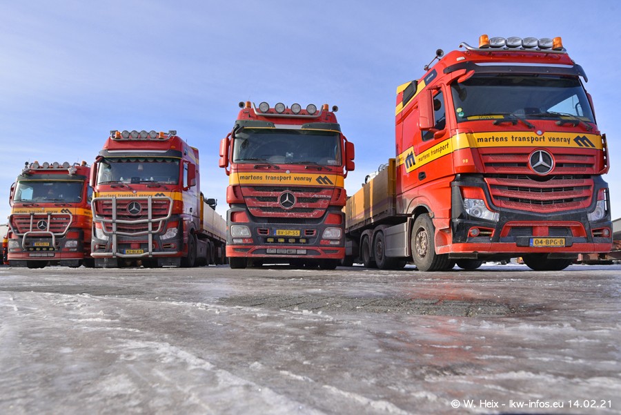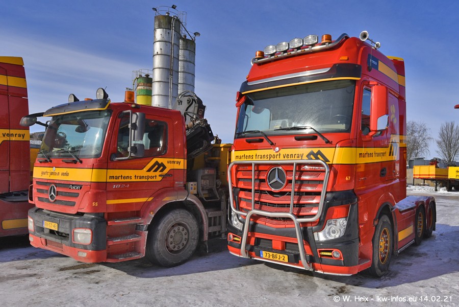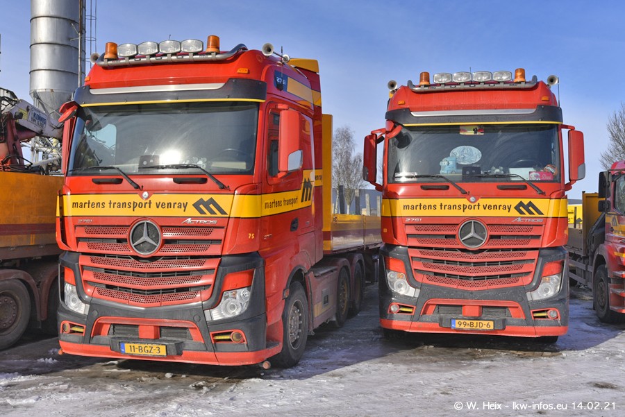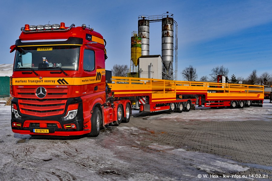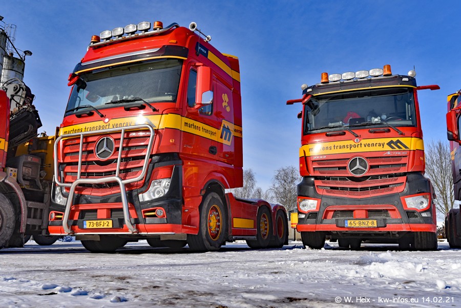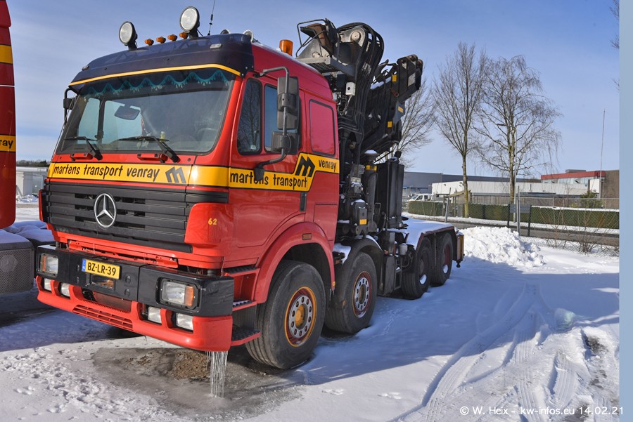 Wie schon in Teil 12 angekündigt, hat Martens Transport in dieser Woche die beiden neuen Auflieger für den Mercedes-Benz New Actros 2851 bekommen. Damit wird die Kombination zu einem LZV (Gigaliner). Die beiden Auflieger wurden von der niederländischen Firma Sterk Trailers gebaut. Der erste Auflieger ist kürzer als der zweite und die Besondeheit ist die auf dem Trailer montierte Sattelkupplung für den zweiten Auflieger, der ein Standardmaß hat. Die Sattelkupplung kann demontiert werden und dann kann der Auflieger "ganz normal" genutzt werden. Diese Art LZV ist in den Niederlanden bisher einzigartig und wird für den Transport von großen Bäumen und Pflanzen in den Niederlanden und Belgien eingesetzt. Ab der kommenden Woche. Und noch etwas hat sich verändert: die beiden bisher blauen Actros 4 Zugmaschinen wurden in den letzten Wochen rot lackiert und entsprechend beschriftet und passen jetzt zum restlichen Fuhrpark. Das das sind die beiden Zugmaschinen mit den silbergrauen Seitenverkleidungen und Kennzeichen "BPG ...". Die Fotos habe ich bei schönstem Winterwetter gemacht. Eis und Schnee sind in den Niederlanden inzwischen genauso selten, wie bei mir zuhause am Niederrhein. Entsprechend schmutig waren die LKW. Das gehört aber bei diesem Wetter irgendwie dazu. Alle LKW waren an diesem Sonntag Vormittag zuhause.