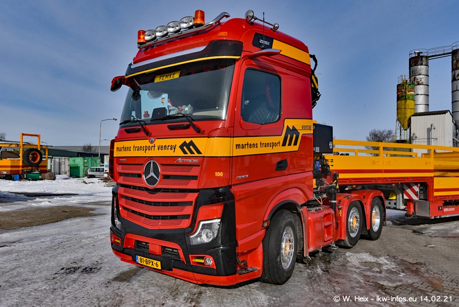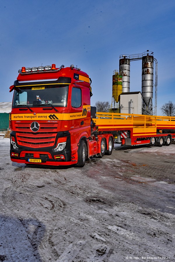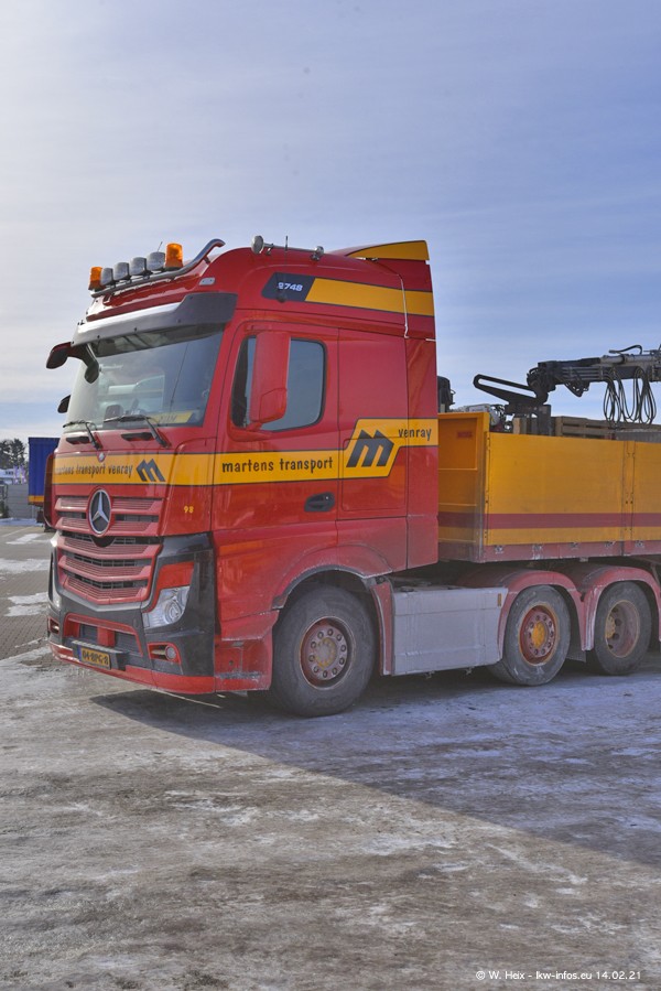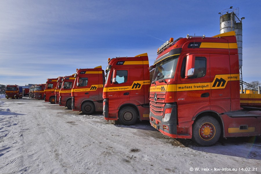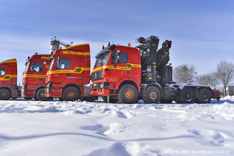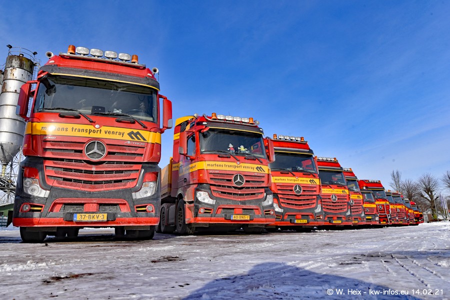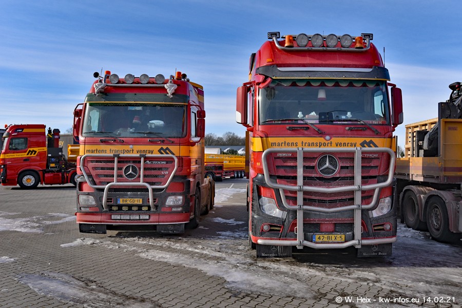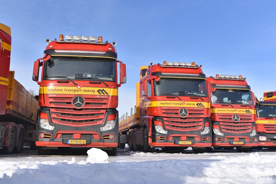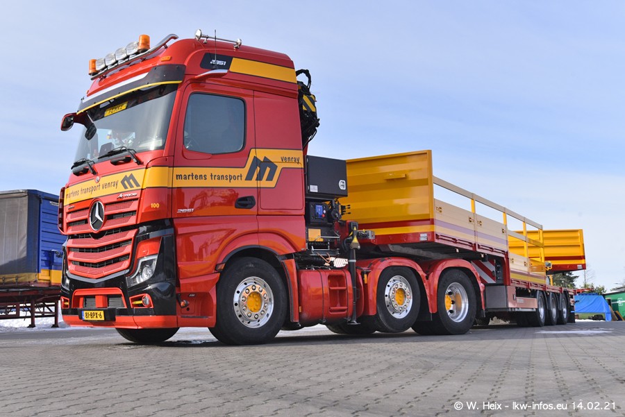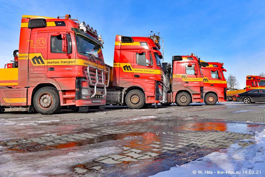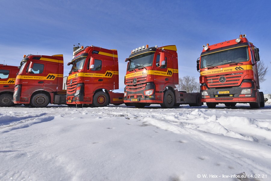 Wie schon in Teil 12 angekündigt, hat Martens Transport in dieser Woche die beiden neuen Auflieger für den Mercedes-Benz New Actros 2851 bekommen. Damit wird die Kombination zu einem LZV (Gigaliner). Die beiden Auflieger wurden von der niederländischen Firma Sterk Trailers gebaut. Der erste Auflieger ist kürzer als der zweite und die Besondeheit ist die auf dem Trailer montierte Sattelkupplung für den zweiten Auflieger, der ein Standardmaß hat. Die Sattelkupplung kann demontiert werden und dann kann der Auflieger "ganz normal" genutzt werden. Diese Art LZV ist in den Niederlanden bisher einzigartig und wird für den Transport von großen Bäumen und Pflanzen in den Niederlanden und Belgien eingesetzt. Ab der kommenden Woche. Und noch etwas hat sich verändert: die beiden bisher blauen Actros 4 Zugmaschinen wurden in den letzten Wochen rot lackiert und entsprechend beschriftet und passen jetzt zum restlichen Fuhrpark. Das das sind die beiden Zugmaschinen mit den silbergrauen Seitenverkleidungen und Kennzeichen "BPG ...". Die Fotos habe ich bei schönstem Winterwetter gemacht. Eis und Schnee sind in den Niederlanden inzwischen genauso selten, wie bei mir zuhause am Niederrhein. Entsprechend schmutig waren die LKW. Das gehört aber bei diesem Wetter irgendwie dazu. Alle LKW waren an diesem Sonntag Vormittag zuhause.