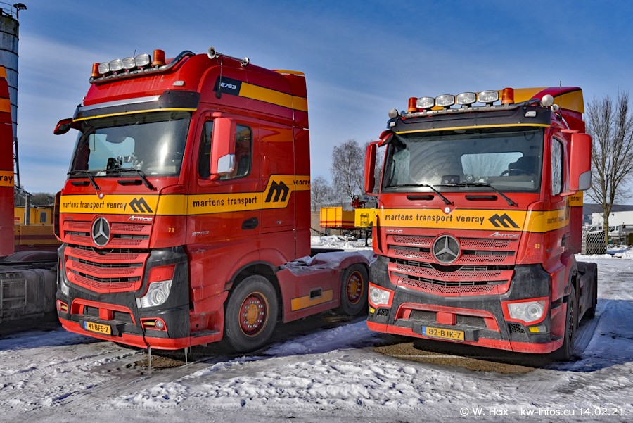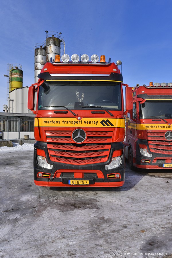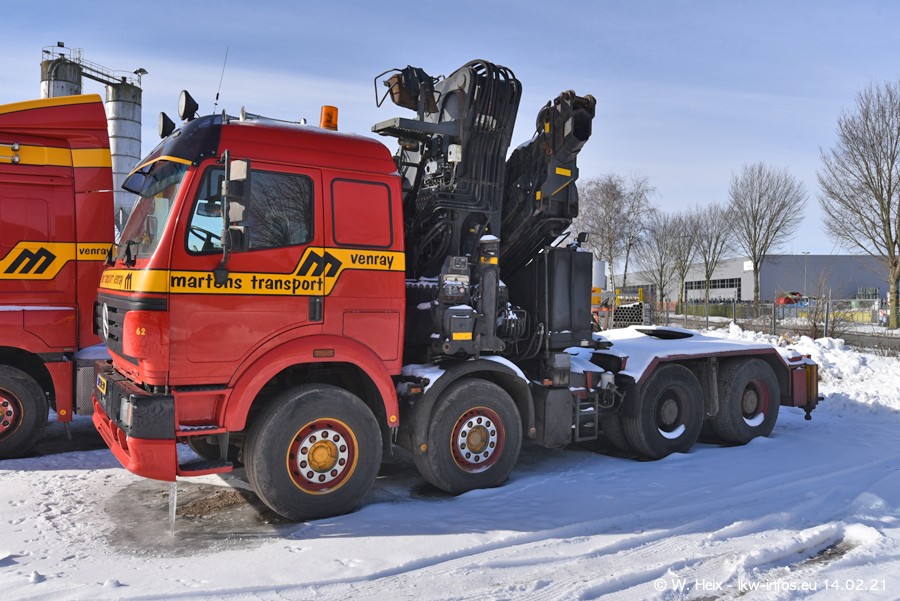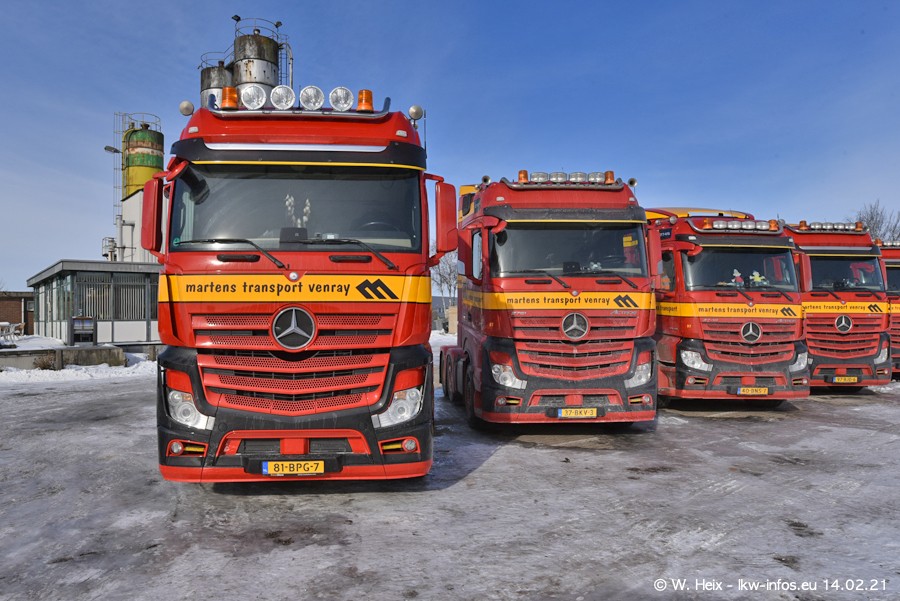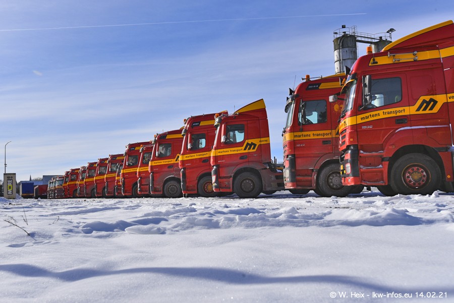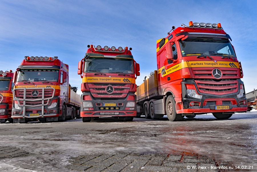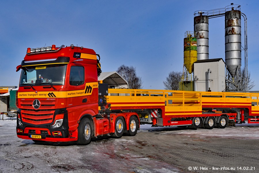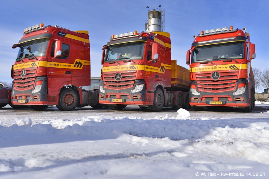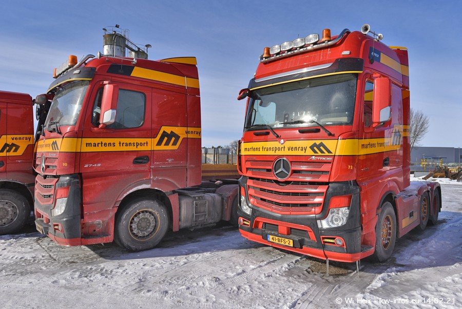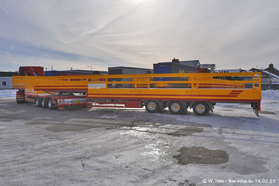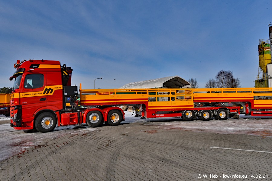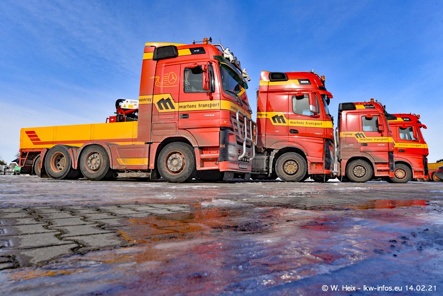 Wie schon in Teil 12 angekündigt, hat Martens Transport in dieser Woche die beiden neuen Auflieger für den Mercedes-Benz New Actros 2851 bekommen. Damit wird die Kombination zu einem LZV (Gigaliner). Die beiden Auflieger wurden von der niederländischen Firma Sterk Trailers gebaut. Der erste Auflieger ist kürzer als der zweite und die Besondeheit ist die auf dem Trailer montierte Sattelkupplung für den zweiten Auflieger, der ein Standardmaß hat. Die Sattelkupplung kann demontiert werden und dann kann der Auflieger "ganz normal" genutzt werden. Diese Art LZV ist in den Niederlanden bisher einzigartig und wird für den Transport von großen Bäumen und Pflanzen in den Niederlanden und Belgien eingesetzt. Ab der kommenden Woche. Und noch etwas hat sich verändert: die beiden bisher blauen Actros 4 Zugmaschinen wurden in den letzten Wochen rot lackiert und entsprechend beschriftet und passen jetzt zum restlichen Fuhrpark. Das das sind die beiden Zugmaschinen mit den silbergrauen Seitenverkleidungen und Kennzeichen "BPG ...". Die Fotos habe ich bei schönstem Winterwetter gemacht. Eis und Schnee sind in den Niederlanden inzwischen genauso selten, wie bei mir zuhause am Niederrhein. Entsprechend schmutig waren die LKW. Das gehört aber bei diesem Wetter irgendwie dazu. Alle LKW waren an diesem Sonntag Vormittag zuhause.