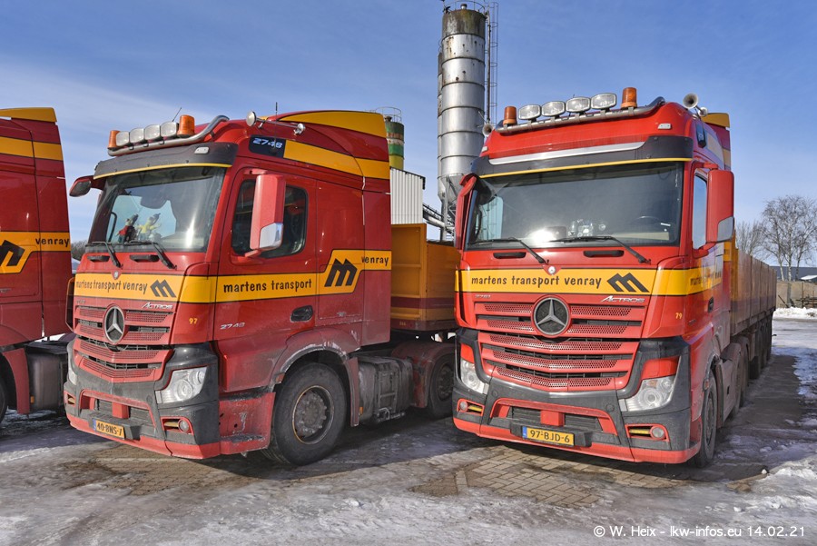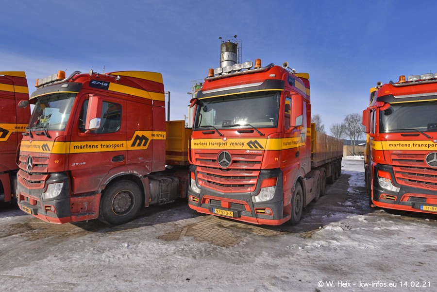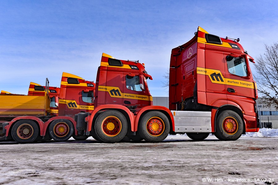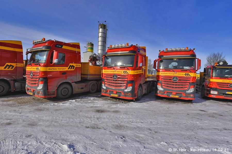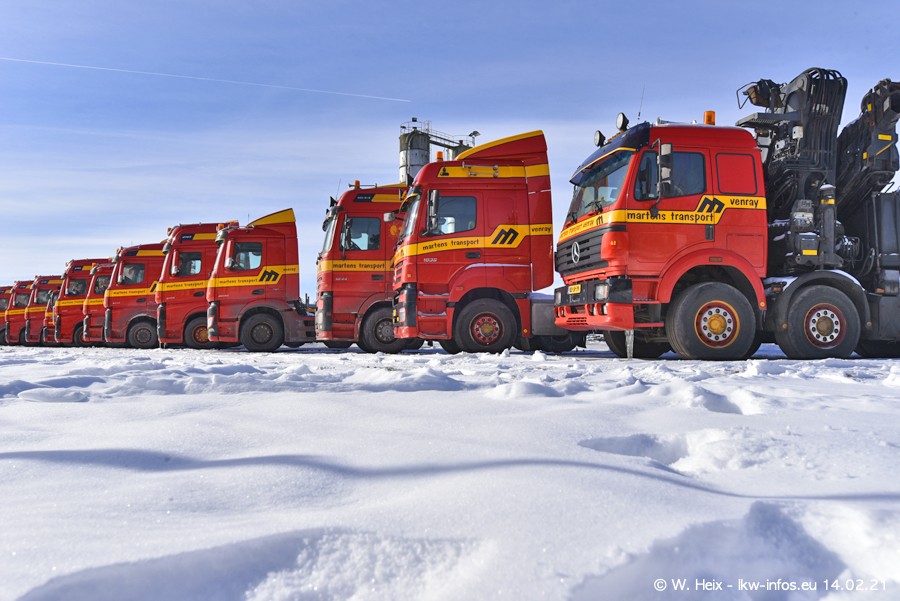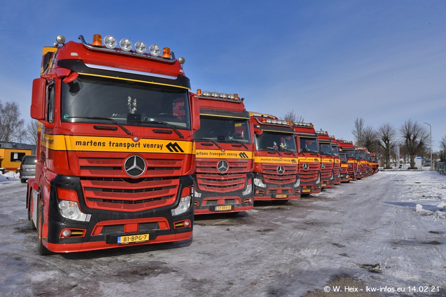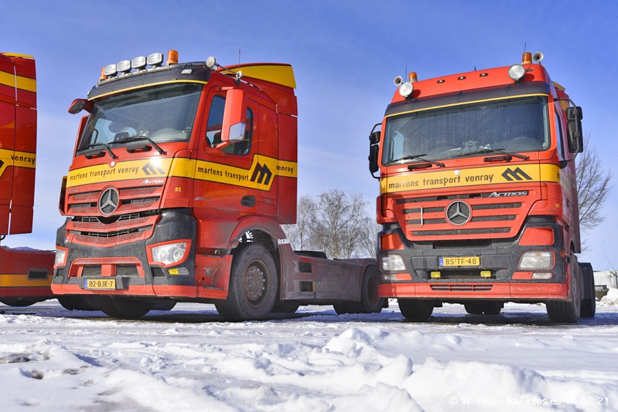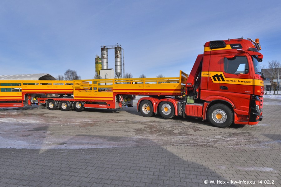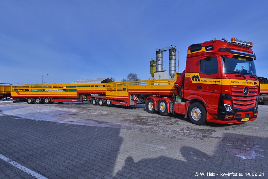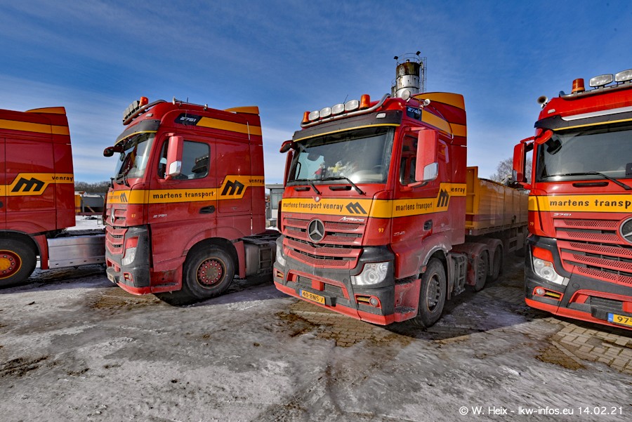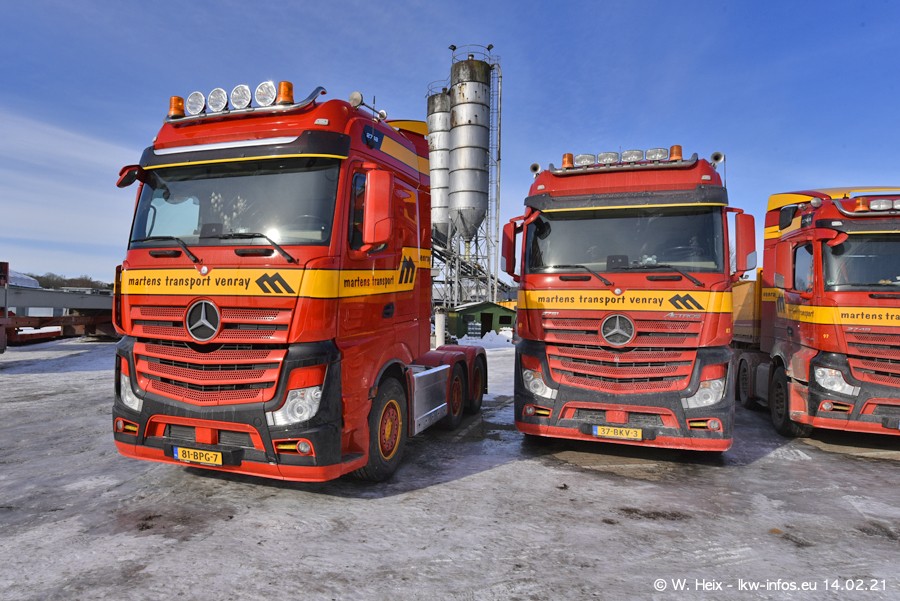 Wie schon in Teil 12 angekündigt, hat Martens Transport in dieser Woche die beiden neuen Auflieger für den Mercedes-Benz New Actros 2851 bekommen. Damit wird die Kombination zu einem LZV (Gigaliner). Die beiden Auflieger wurden von der niederländischen Firma Sterk Trailers gebaut. Der erste Auflieger ist kürzer als der zweite und die Besondeheit ist die auf dem Trailer montierte Sattelkupplung für den zweiten Auflieger, der ein Standardmaß hat. Die Sattelkupplung kann demontiert werden und dann kann der Auflieger "ganz normal" genutzt werden. Diese Art LZV ist in den Niederlanden bisher einzigartig und wird für den Transport von großen Bäumen und Pflanzen in den Niederlanden und Belgien eingesetzt. Ab der kommenden Woche. Und noch etwas hat sich verändert: die beiden bisher blauen Actros 4 Zugmaschinen wurden in den letzten Wochen rot lackiert und entsprechend beschriftet und passen jetzt zum restlichen Fuhrpark. Das das sind die beiden Zugmaschinen mit den silbergrauen Seitenverkleidungen und Kennzeichen "BPG ...". Die Fotos habe ich bei schönstem Winterwetter gemacht. Eis und Schnee sind in den Niederlanden inzwischen genauso selten, wie bei mir zuhause am Niederrhein. Entsprechend schmutig waren die LKW. Das gehört aber bei diesem Wetter irgendwie dazu. Alle LKW waren an diesem Sonntag Vormittag zuhause.