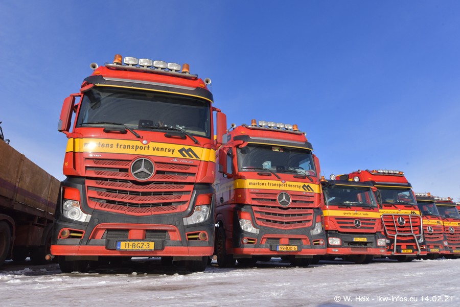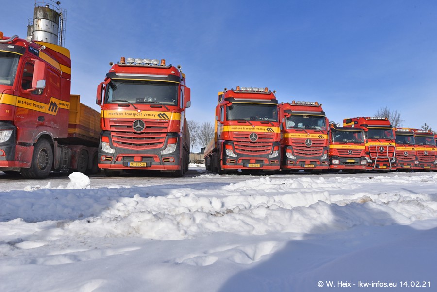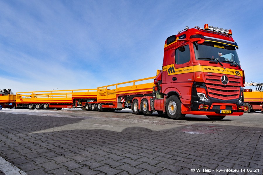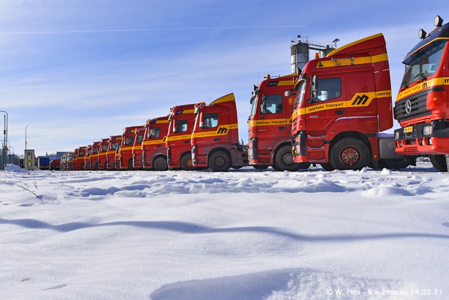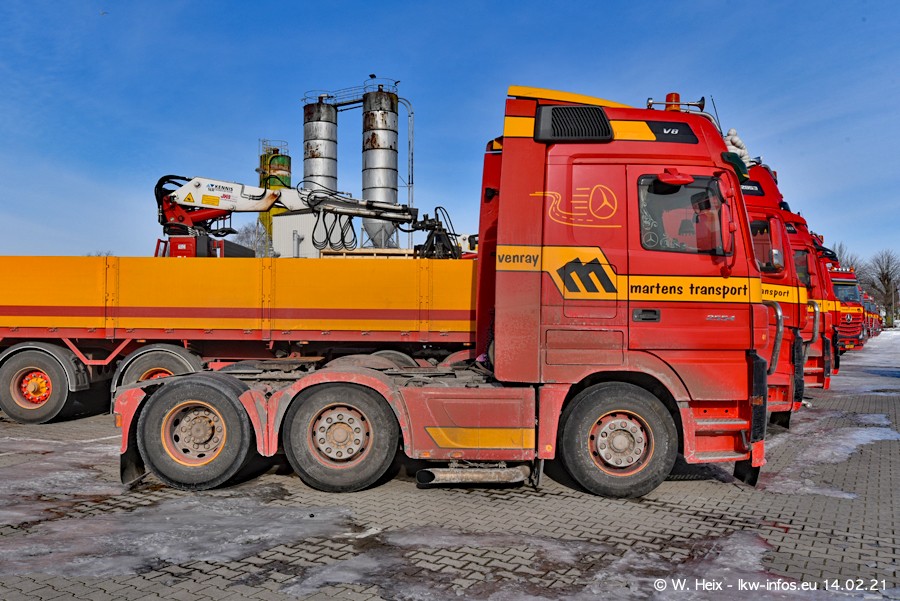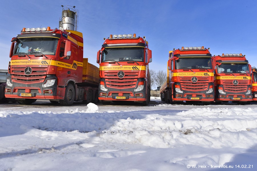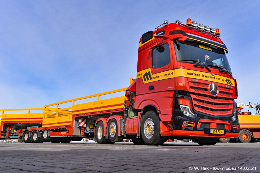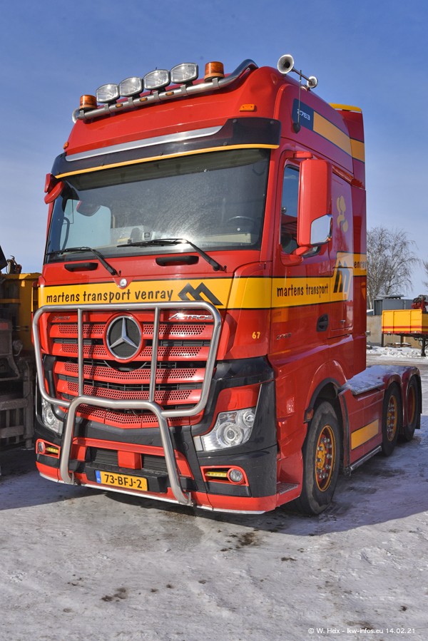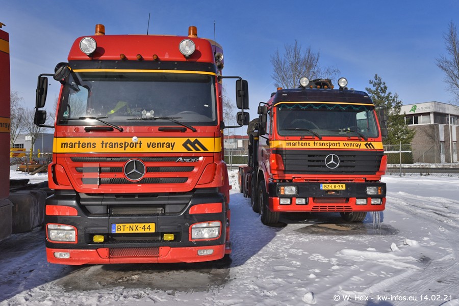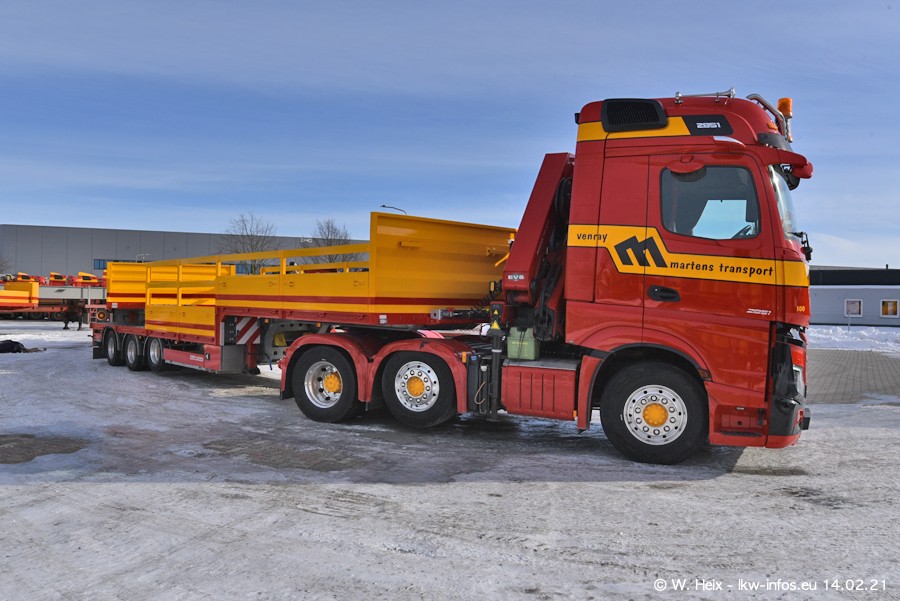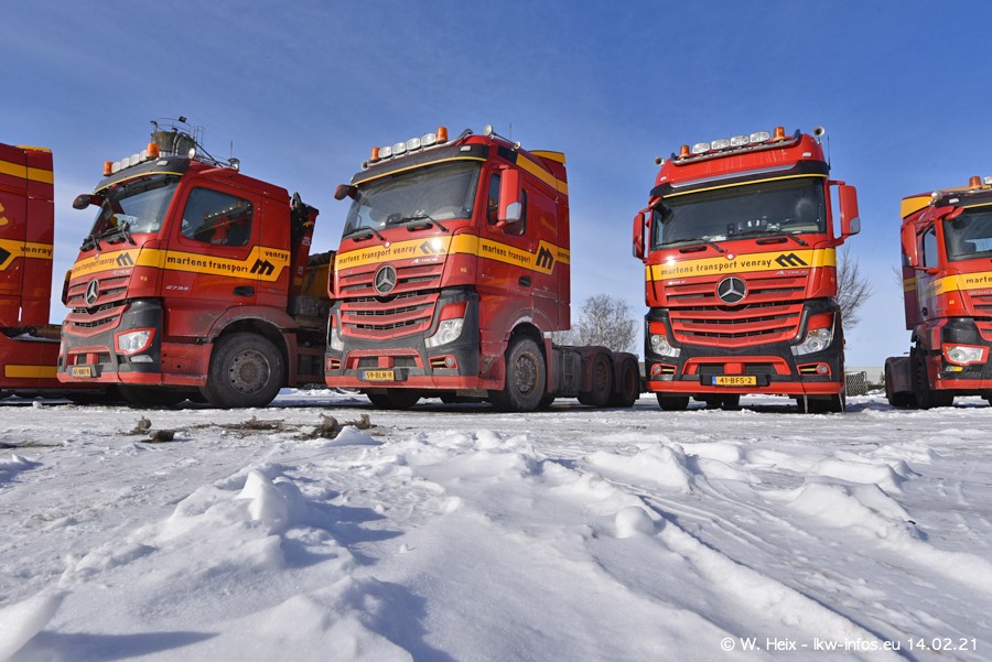 Wie schon in Teil 12 angekündigt, hat Martens Transport in dieser Woche die beiden neuen Auflieger für den Mercedes-Benz New Actros 2851 bekommen. Damit wird die Kombination zu einem LZV (Gigaliner). Die beiden Auflieger wurden von der niederländischen Firma Sterk Trailers gebaut. Der erste Auflieger ist kürzer als der zweite und die Besondeheit ist die auf dem Trailer montierte Sattelkupplung für den zweiten Auflieger, der ein Standardmaß hat. Die Sattelkupplung kann demontiert werden und dann kann der Auflieger "ganz normal" genutzt werden. Diese Art LZV ist in den Niederlanden bisher einzigartig und wird für den Transport von großen Bäumen und Pflanzen in den Niederlanden und Belgien eingesetzt. Ab der kommenden Woche. Und noch etwas hat sich verändert: die beiden bisher blauen Actros 4 Zugmaschinen wurden in den letzten Wochen rot lackiert und entsprechend beschriftet und passen jetzt zum restlichen Fuhrpark. Das das sind die beiden Zugmaschinen mit den silbergrauen Seitenverkleidungen und Kennzeichen "BPG ...". Die Fotos habe ich bei schönstem Winterwetter gemacht. Eis und Schnee sind in den Niederlanden inzwischen genauso selten, wie bei mir zuhause am Niederrhein. Entsprechend schmutig waren die LKW. Das gehört aber bei diesem Wetter irgendwie dazu. Alle LKW waren an diesem Sonntag Vormittag zuhause.