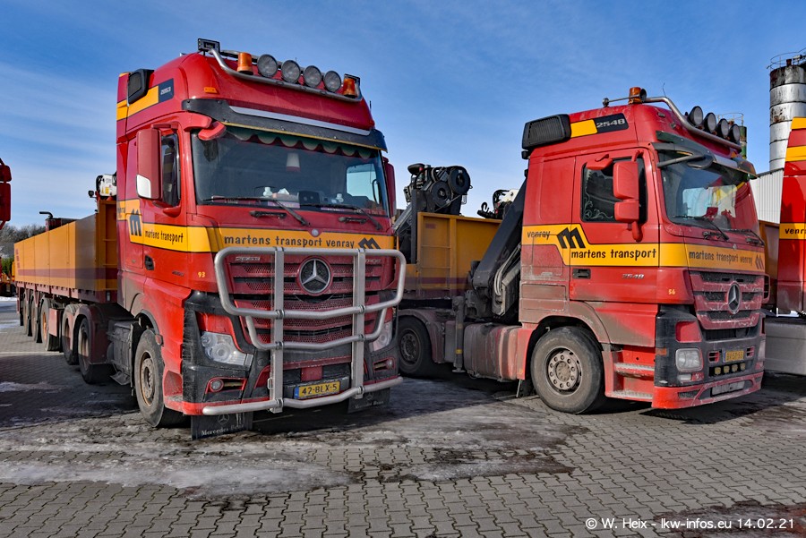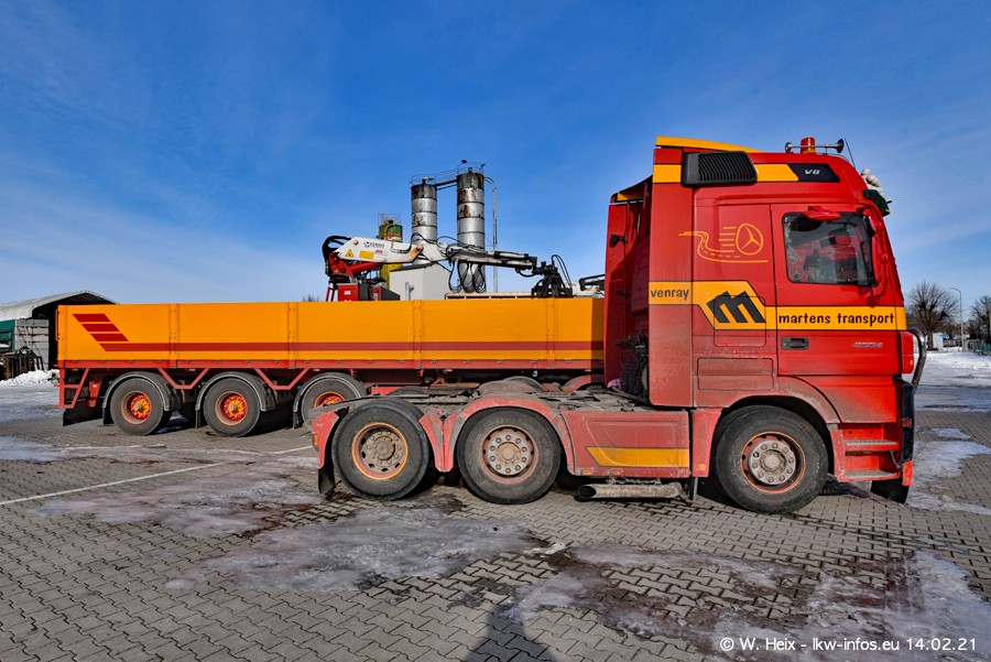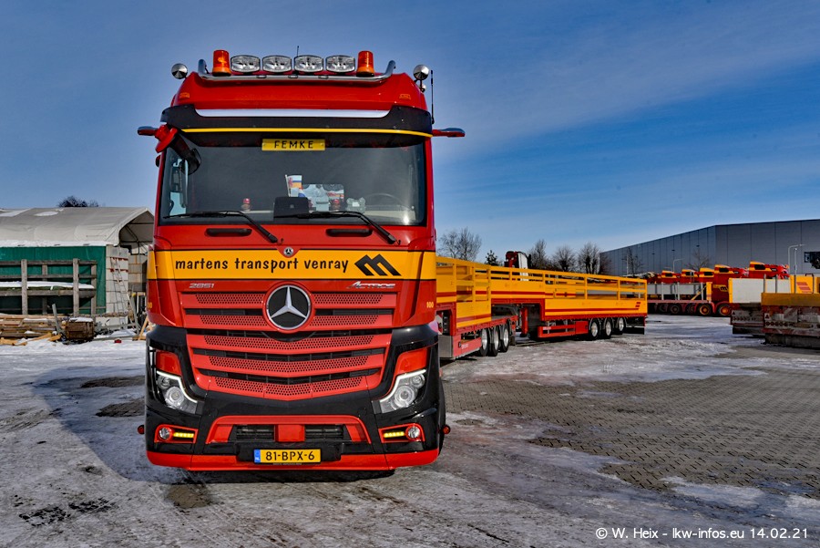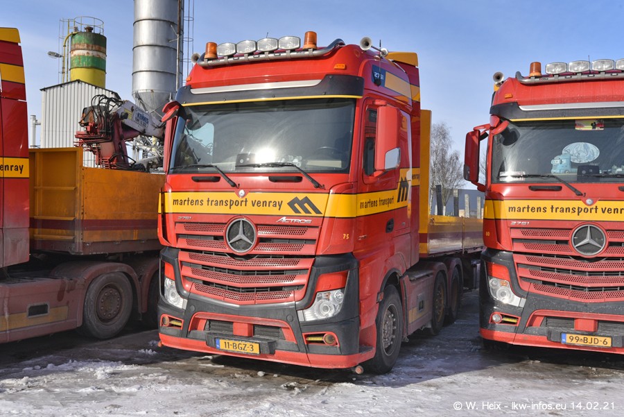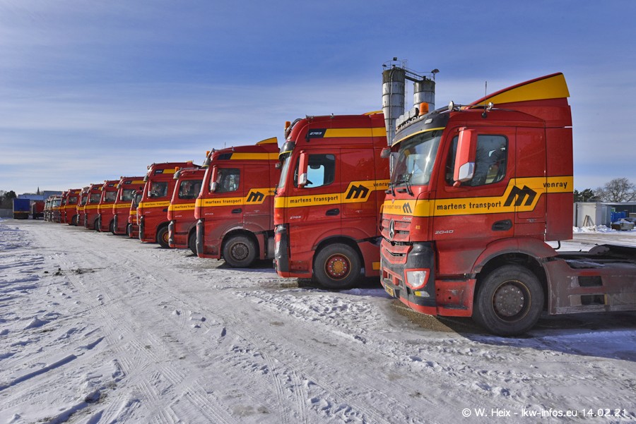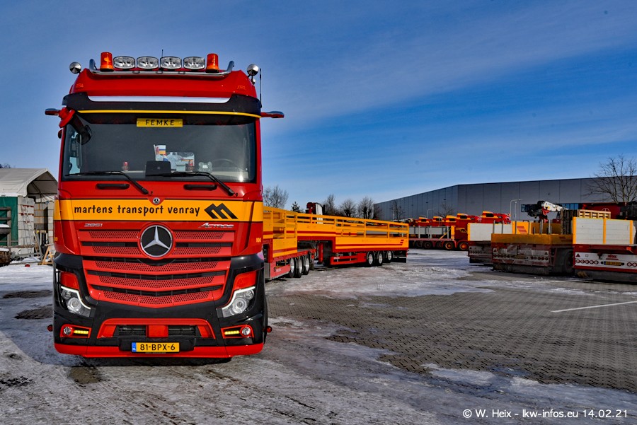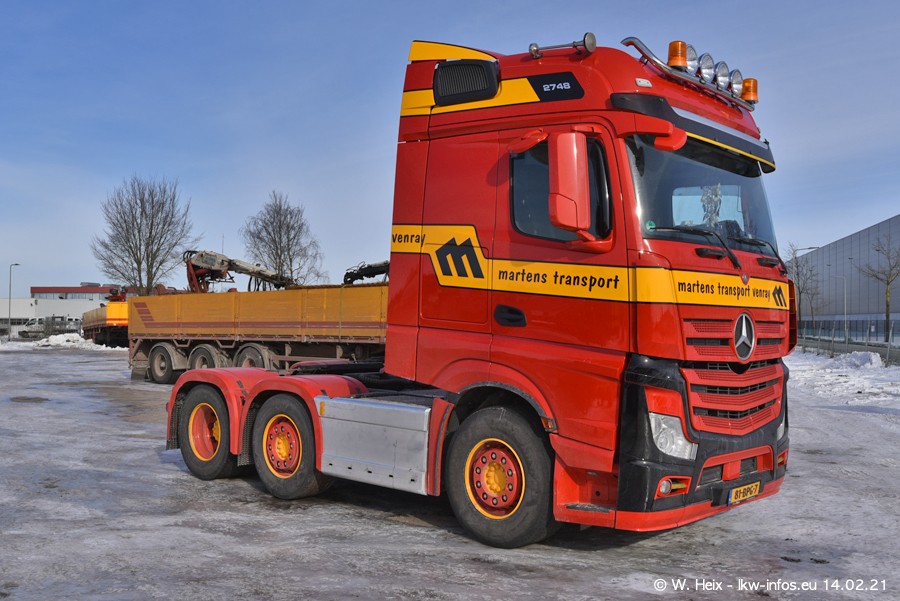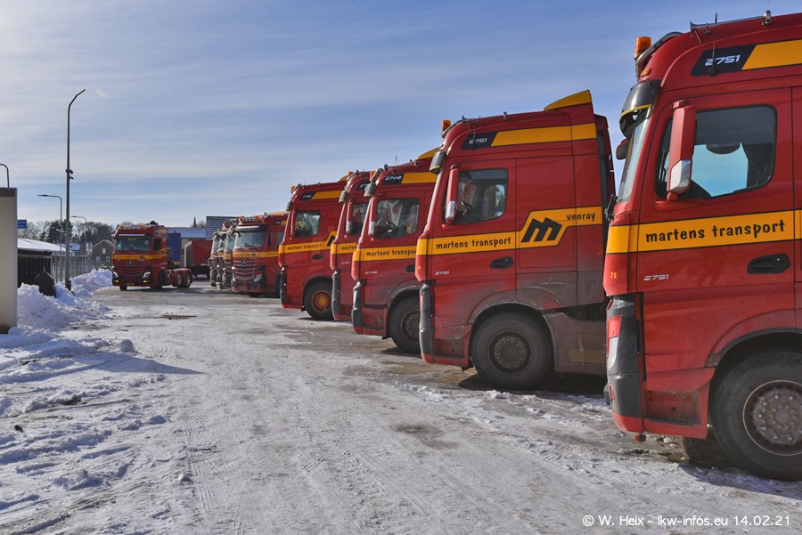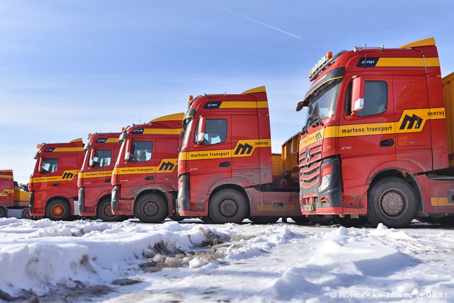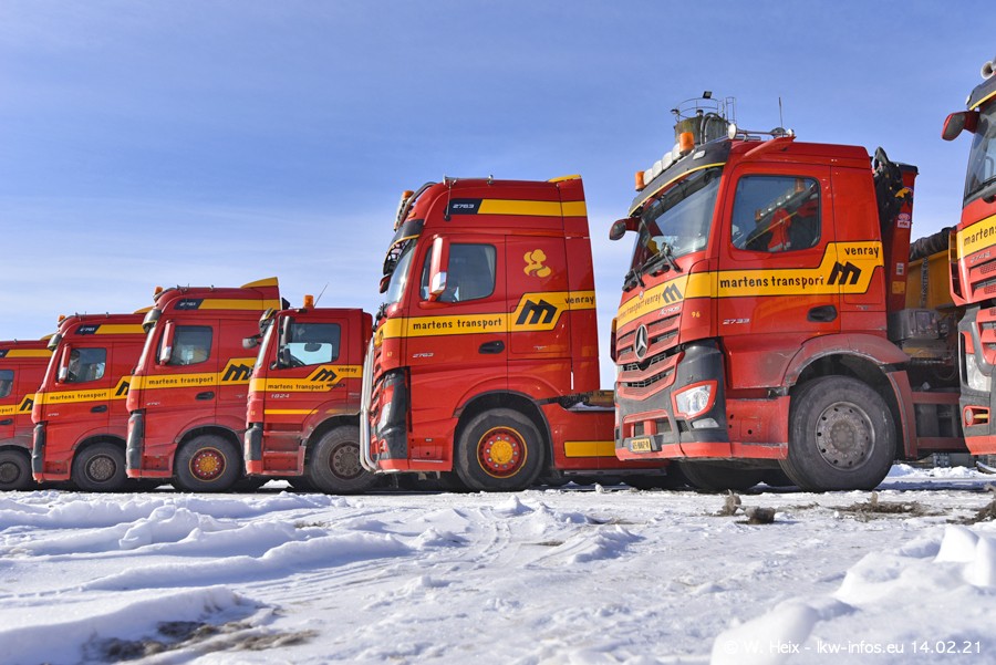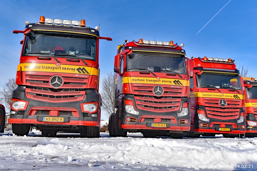 Wie schon in Teil 12 angekündigt, hat Martens Transport in dieser Woche die beiden neuen Auflieger für den Mercedes-Benz New Actros 2851 bekommen. Damit wird die Kombination zu einem LZV (Gigaliner). Die beiden Auflieger wurden von der niederländischen Firma Sterk Trailers gebaut. Der erste Auflieger ist kürzer als der zweite und die Besondeheit ist die auf dem Trailer montierte Sattelkupplung für den zweiten Auflieger, der ein Standardmaß hat. Die Sattelkupplung kann demontiert werden und dann kann der Auflieger "ganz normal" genutzt werden. Diese Art LZV ist in den Niederlanden bisher einzigartig und wird für den Transport von großen Bäumen und Pflanzen in den Niederlanden und Belgien eingesetzt. Ab der kommenden Woche. Und noch etwas hat sich verändert: die beiden bisher blauen Actros 4 Zugmaschinen wurden in den letzten Wochen rot lackiert und entsprechend beschriftet und passen jetzt zum restlichen Fuhrpark. Das das sind die beiden Zugmaschinen mit den silbergrauen Seitenverkleidungen und Kennzeichen "BPG ...". Die Fotos habe ich bei schönstem Winterwetter gemacht. Eis und Schnee sind in den Niederlanden inzwischen genauso selten, wie bei mir zuhause am Niederrhein. Entsprechend schmutig waren die LKW. Das gehört aber bei diesem Wetter irgendwie dazu. Alle LKW waren an diesem Sonntag Vormittag zuhause.