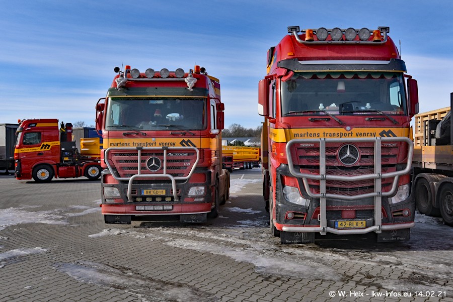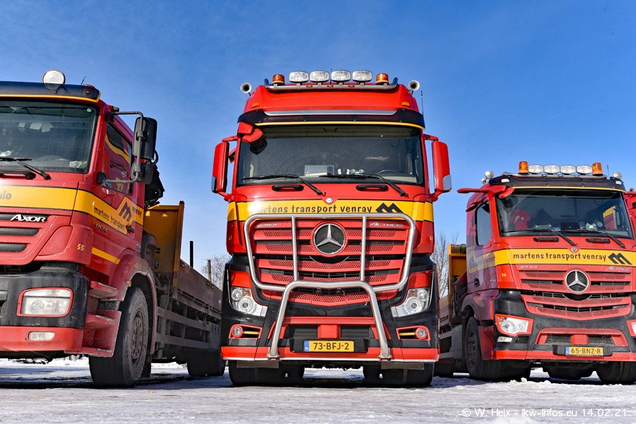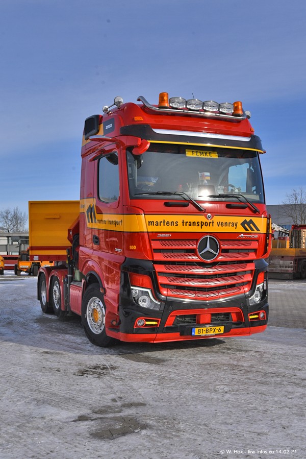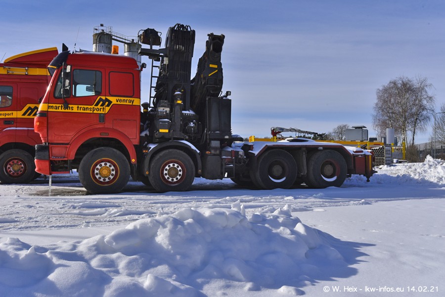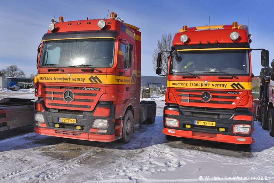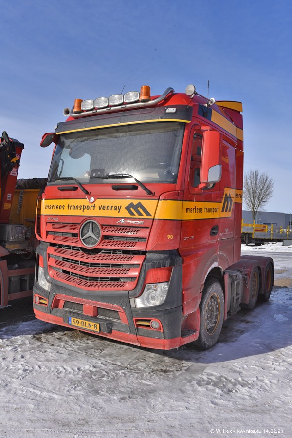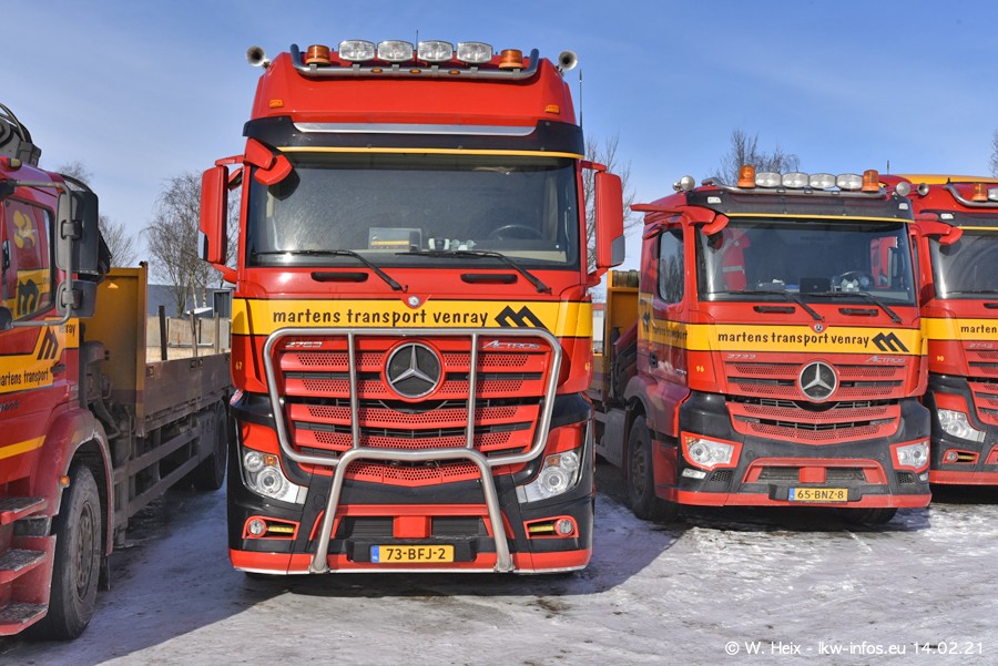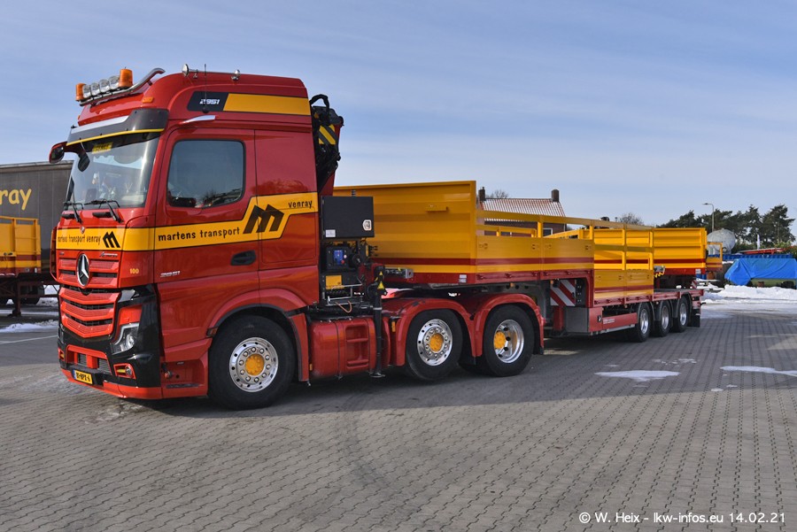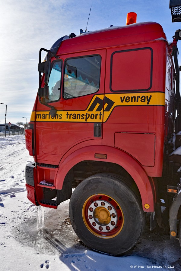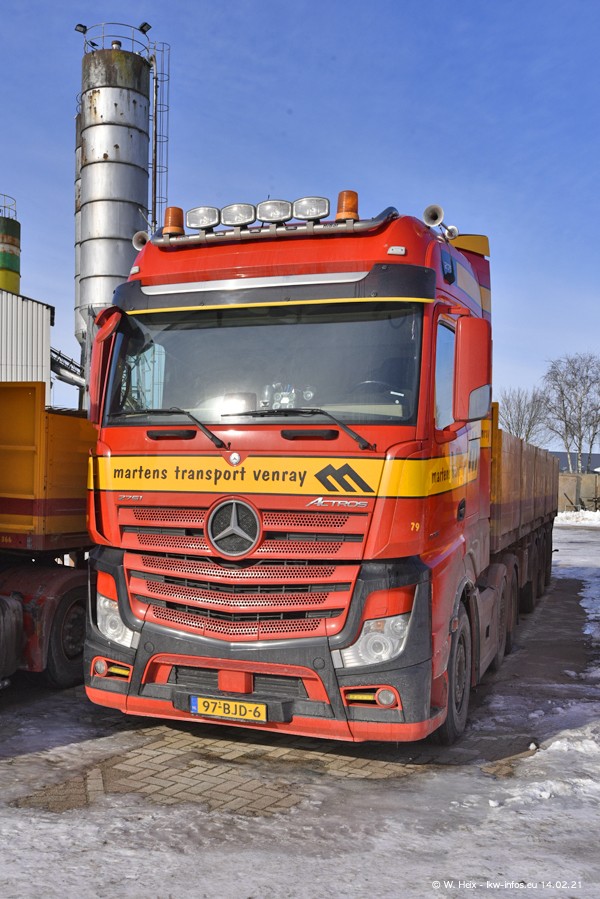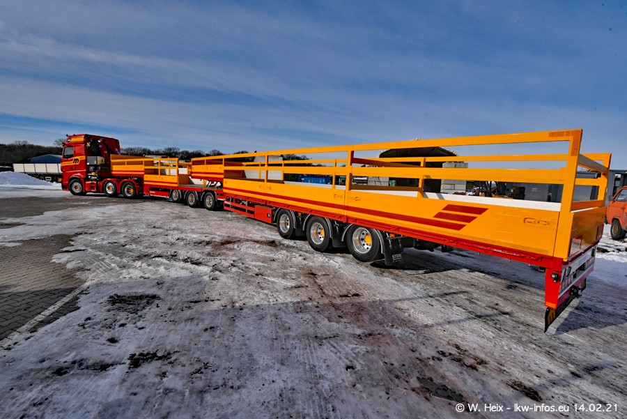 Wie schon in Teil 12 angekündigt, hat Martens Transport in dieser Woche die beiden neuen Auflieger für den Mercedes-Benz New Actros 2851 bekommen. Damit wird die Kombination zu einem LZV (Gigaliner). Die beiden Auflieger wurden von der niederländischen Firma Sterk Trailers gebaut. Der erste Auflieger ist kürzer als der zweite und die Besondeheit ist die auf dem Trailer montierte Sattelkupplung für den zweiten Auflieger, der ein Standardmaß hat. Die Sattelkupplung kann demontiert werden und dann kann der Auflieger "ganz normal" genutzt werden. Diese Art LZV ist in den Niederlanden bisher einzigartig und wird für den Transport von großen Bäumen und Pflanzen in den Niederlanden und Belgien eingesetzt. Ab der kommenden Woche. Und noch etwas hat sich verändert: die beiden bisher blauen Actros 4 Zugmaschinen wurden in den letzten Wochen rot lackiert und entsprechend beschriftet und passen jetzt zum restlichen Fuhrpark. Das das sind die beiden Zugmaschinen mit den silbergrauen Seitenverkleidungen und Kennzeichen "BPG ...". Die Fotos habe ich bei schönstem Winterwetter gemacht. Eis und Schnee sind in den Niederlanden inzwischen genauso selten, wie bei mir zuhause am Niederrhein. Entsprechend schmutig waren die LKW. Das gehört aber bei diesem Wetter irgendwie dazu. Alle LKW waren an diesem Sonntag Vormittag zuhause.