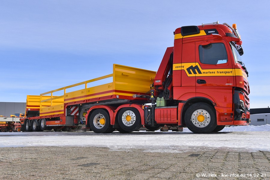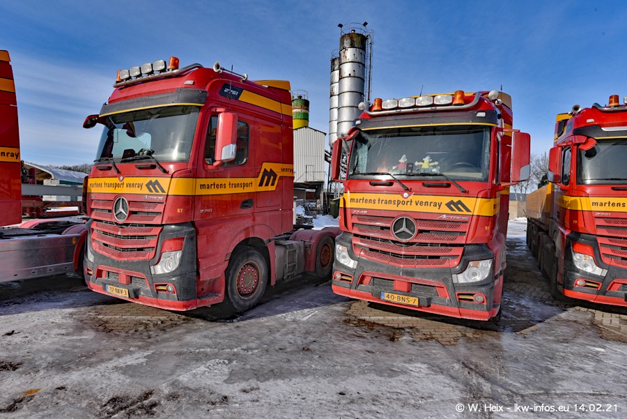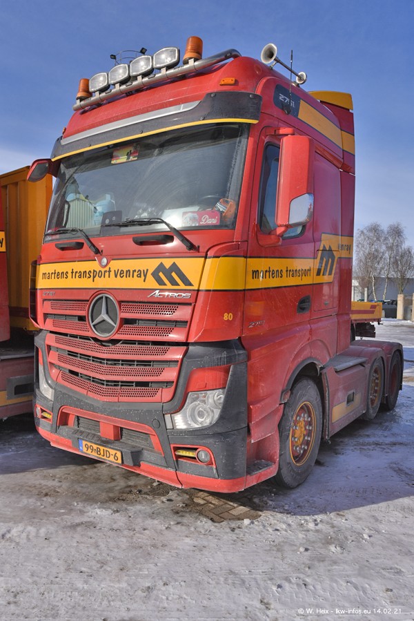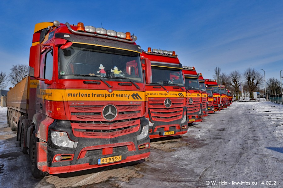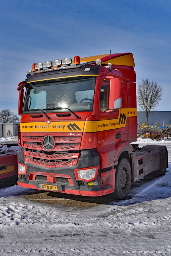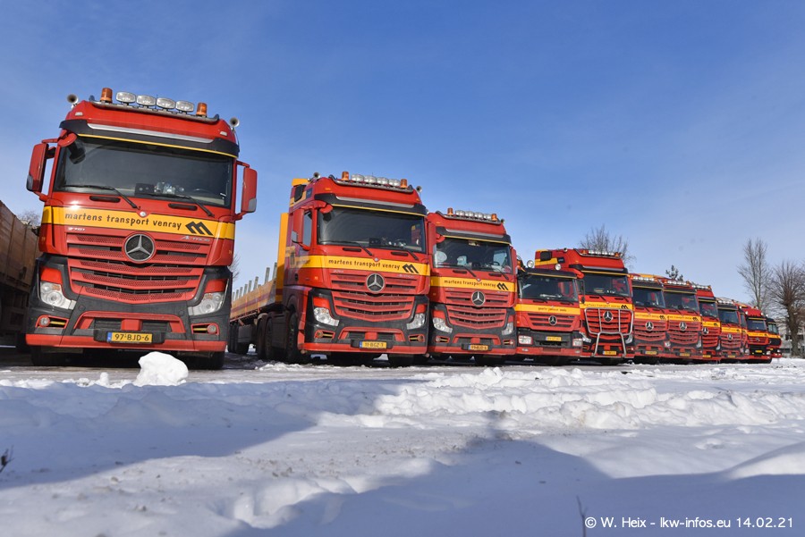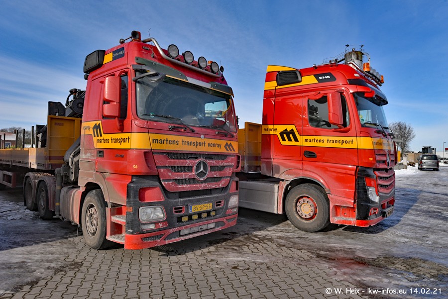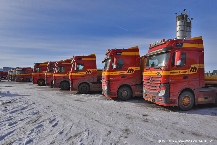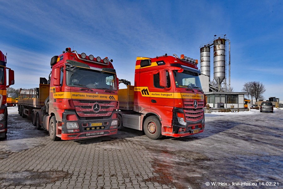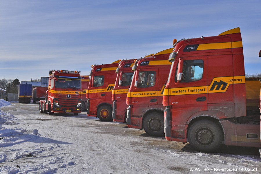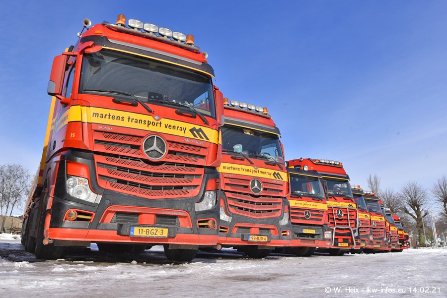 Wie schon in Teil 12 angekündigt, hat Martens Transport in dieser Woche die beiden neuen Auflieger für den Mercedes-Benz New Actros 2851 bekommen. Damit wird die Kombination zu einem LZV (Gigaliner). Die beiden Auflieger wurden von der niederländischen Firma Sterk Trailers gebaut. Der erste Auflieger ist kürzer als der zweite und die Besondeheit ist die auf dem Trailer montierte Sattelkupplung für den zweiten Auflieger, der ein Standardmaß hat. Die Sattelkupplung kann demontiert werden und dann kann der Auflieger "ganz normal" genutzt werden. Diese Art LZV ist in den Niederlanden bisher einzigartig und wird für den Transport von großen Bäumen und Pflanzen in den Niederlanden und Belgien eingesetzt. Ab der kommenden Woche. Und noch etwas hat sich verändert: die beiden bisher blauen Actros 4 Zugmaschinen wurden in den letzten Wochen rot lackiert und entsprechend beschriftet und passen jetzt zum restlichen Fuhrpark. Das das sind die beiden Zugmaschinen mit den silbergrauen Seitenverkleidungen und Kennzeichen "BPG ...". Die Fotos habe ich bei schönstem Winterwetter gemacht. Eis und Schnee sind in den Niederlanden inzwischen genauso selten, wie bei mir zuhause am Niederrhein. Entsprechend schmutig waren die LKW. Das gehört aber bei diesem Wetter irgendwie dazu. Alle LKW waren an diesem Sonntag Vormittag zuhause.