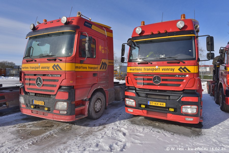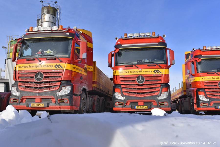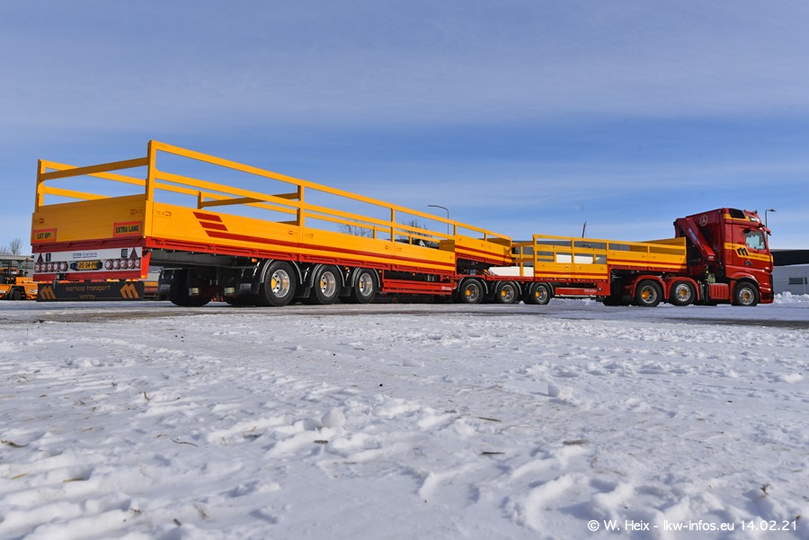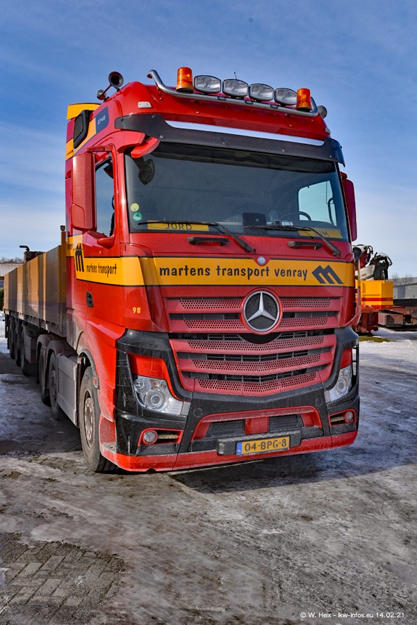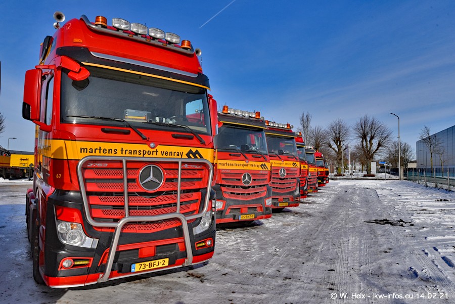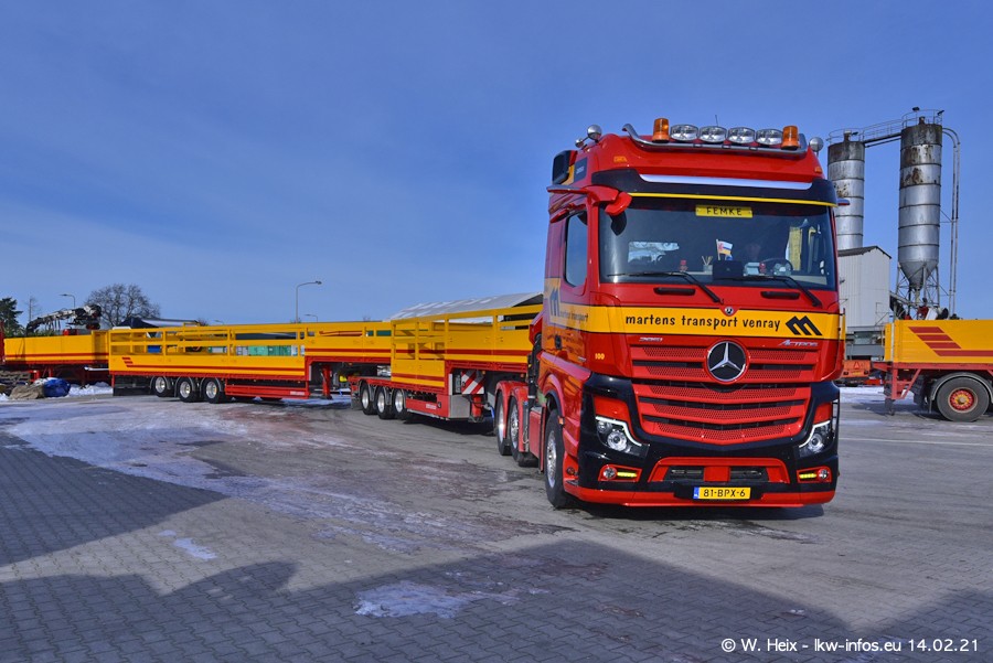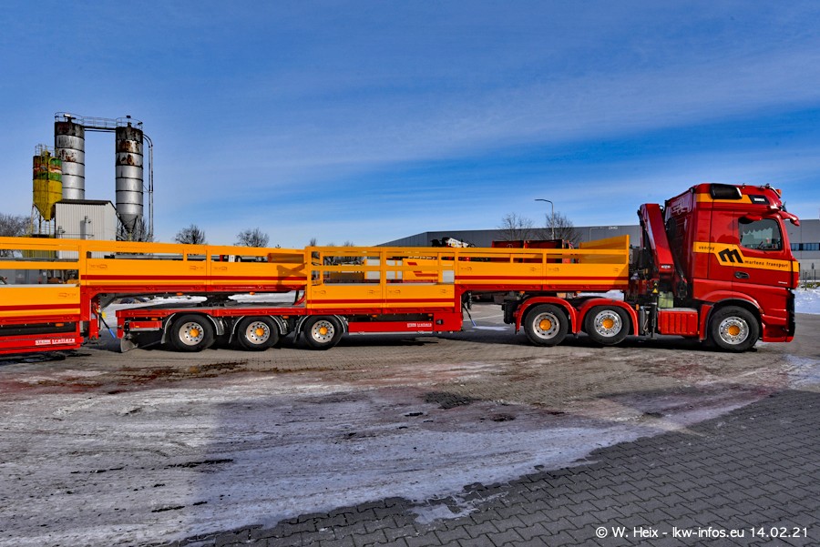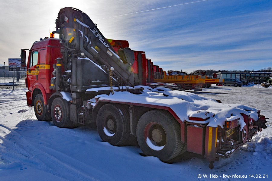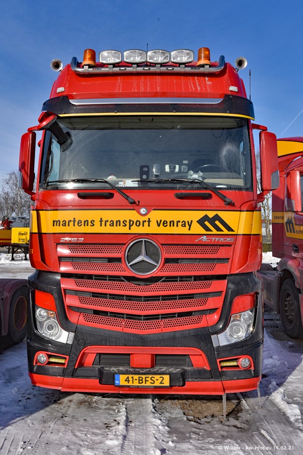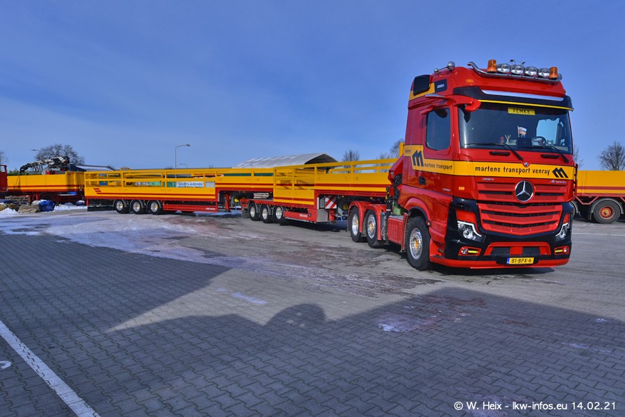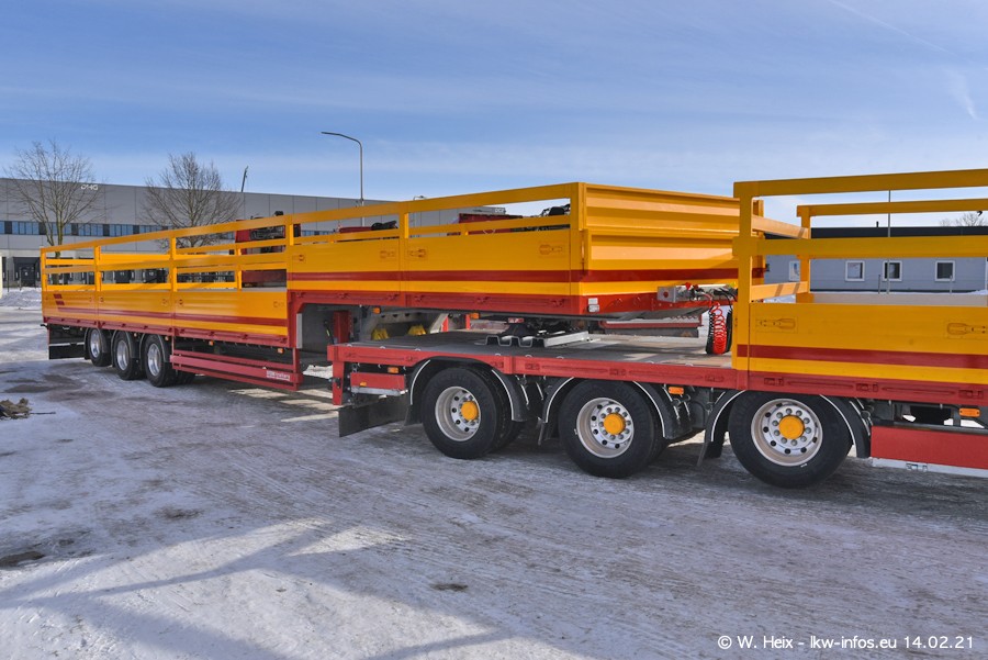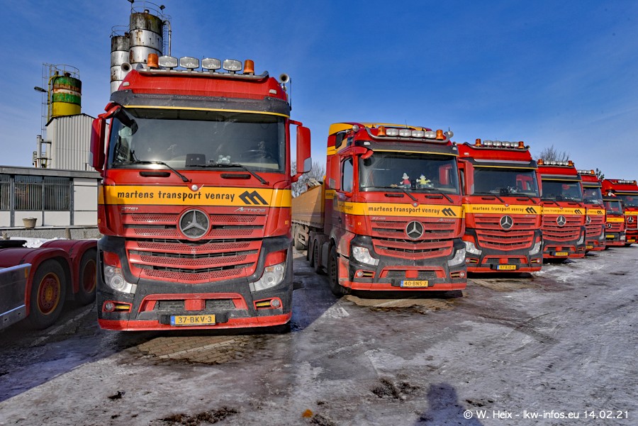 Wie schon in Teil 12 angekündigt, hat Martens Transport in dieser Woche die beiden neuen Auflieger für den Mercedes-Benz New Actros 2851 bekommen. Damit wird die Kombination zu einem LZV (Gigaliner). Die beiden Auflieger wurden von der niederländischen Firma Sterk Trailers gebaut. Der erste Auflieger ist kürzer als der zweite und die Besondeheit ist die auf dem Trailer montierte Sattelkupplung für den zweiten Auflieger, der ein Standardmaß hat. Die Sattelkupplung kann demontiert werden und dann kann der Auflieger "ganz normal" genutzt werden. Diese Art LZV ist in den Niederlanden bisher einzigartig und wird für den Transport von großen Bäumen und Pflanzen in den Niederlanden und Belgien eingesetzt. Ab der kommenden Woche. Und noch etwas hat sich verändert: die beiden bisher blauen Actros 4 Zugmaschinen wurden in den letzten Wochen rot lackiert und entsprechend beschriftet und passen jetzt zum restlichen Fuhrpark. Das das sind die beiden Zugmaschinen mit den silbergrauen Seitenverkleidungen und Kennzeichen "BPG ...". Die Fotos habe ich bei schönstem Winterwetter gemacht. Eis und Schnee sind in den Niederlanden inzwischen genauso selten, wie bei mir zuhause am Niederrhein. Entsprechend schmutig waren die LKW. Das gehört aber bei diesem Wetter irgendwie dazu. Alle LKW waren an diesem Sonntag Vormittag zuhause.