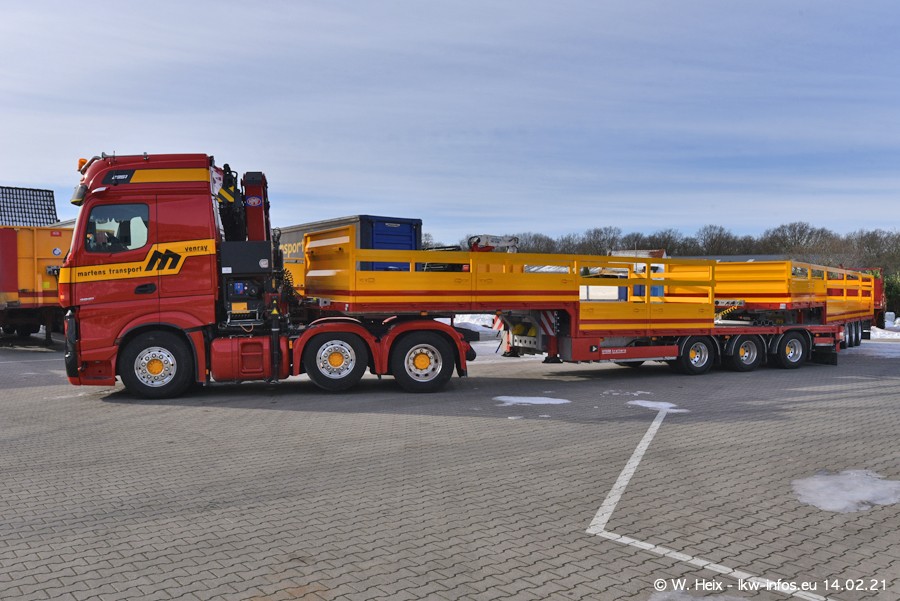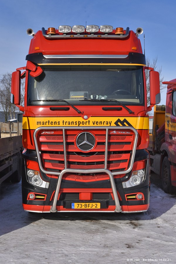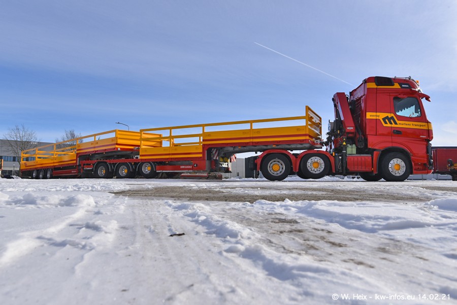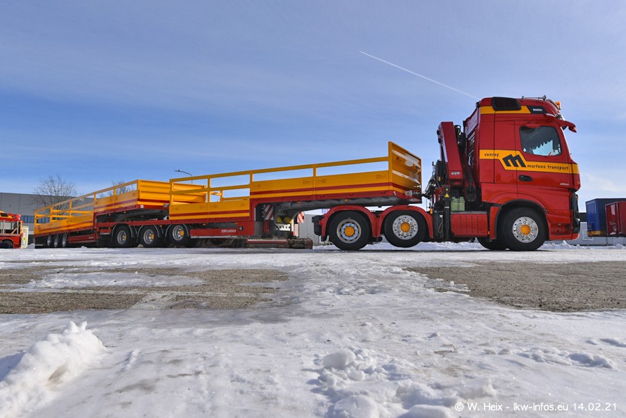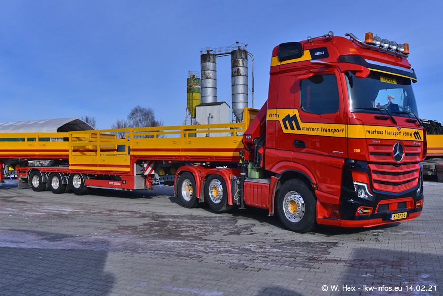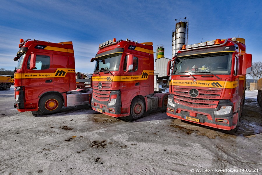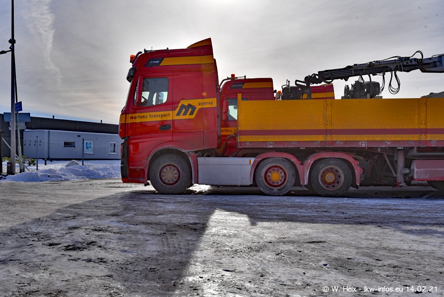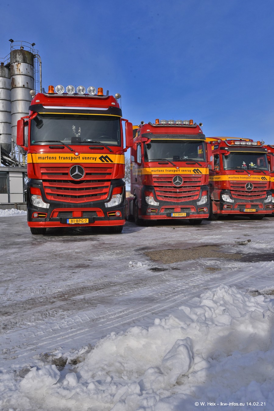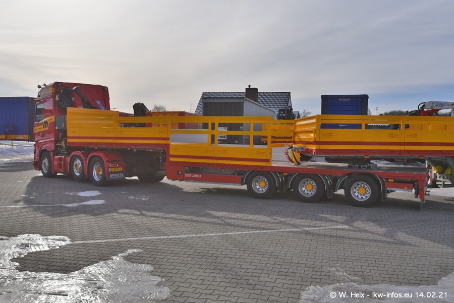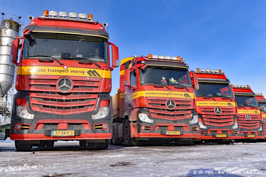 Wie schon in Teil 12 angekündigt, hat Martens Transport in dieser Woche die beiden neuen Auflieger für den Mercedes-Benz New Actros 2851 bekommen. Damit wird die Kombination zu einem LZV (Gigaliner). Die beiden Auflieger wurden von der niederländischen Firma Sterk Trailers gebaut. Der erste Auflieger ist kürzer als der zweite und die Besondeheit ist die auf dem Trailer montierte Sattelkupplung für den zweiten Auflieger, der ein Standardmaß hat. Die Sattelkupplung kann demontiert werden und dann kann der Auflieger "ganz normal" genutzt werden. Diese Art LZV ist in den Niederlanden bisher einzigartig und wird für den Transport von großen Bäumen und Pflanzen in den Niederlanden und Belgien eingesetzt. Ab der kommenden Woche. Und noch etwas hat sich verändert: die beiden bisher blauen Actros 4 Zugmaschinen wurden in den letzten Wochen rot lackiert und entsprechend beschriftet und passen jetzt zum restlichen Fuhrpark. Das das sind die beiden Zugmaschinen mit den silbergrauen Seitenverkleidungen und Kennzeichen "BPG ...". Die Fotos habe ich bei schönstem Winterwetter gemacht. Eis und Schnee sind in den Niederlanden inzwischen genauso selten, wie bei mir zuhause am Niederrhein. Entsprechend schmutig waren die LKW. Das gehört aber bei diesem Wetter irgendwie dazu. Alle LKW waren an diesem Sonntag Vormittag zuhause.