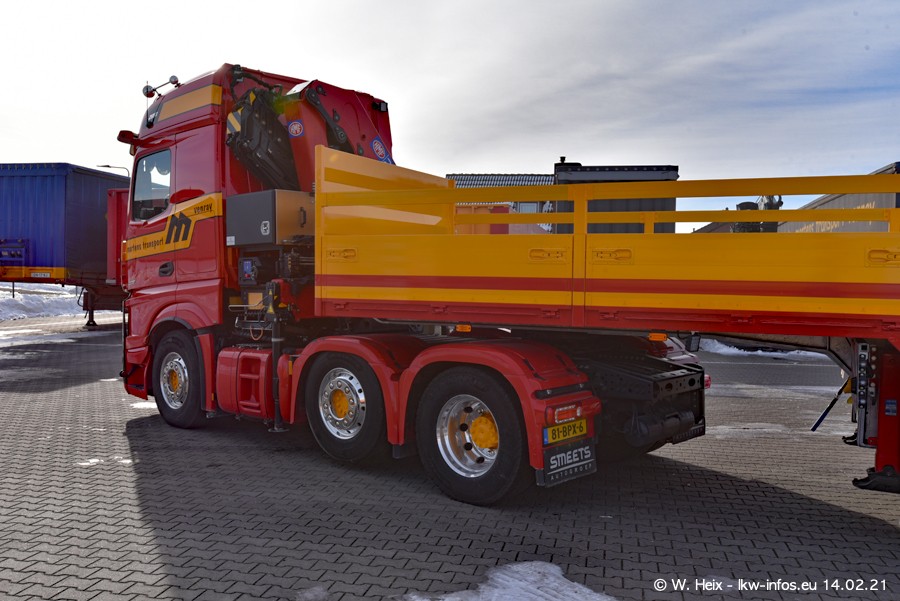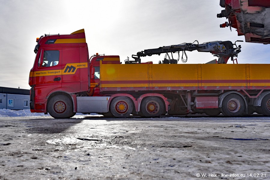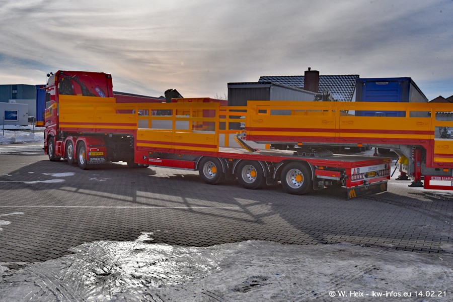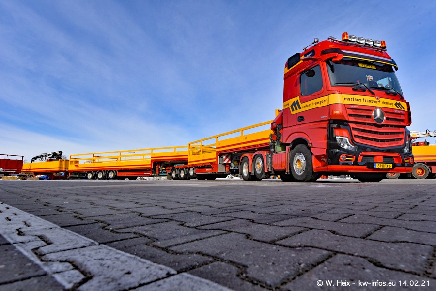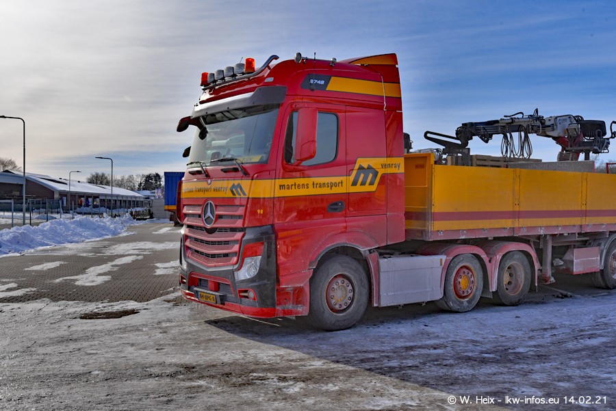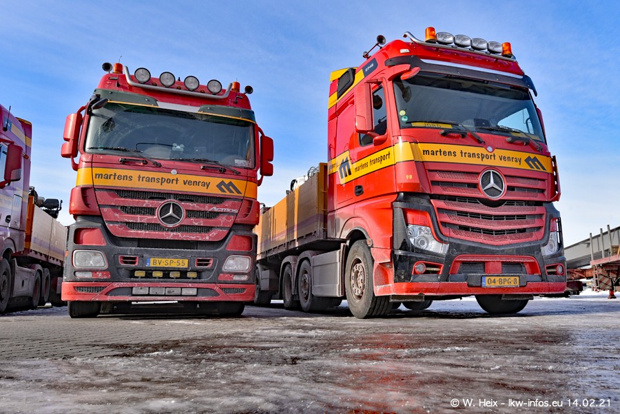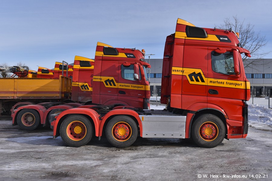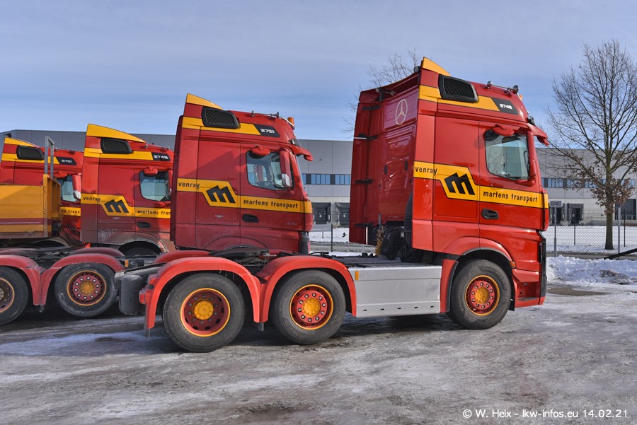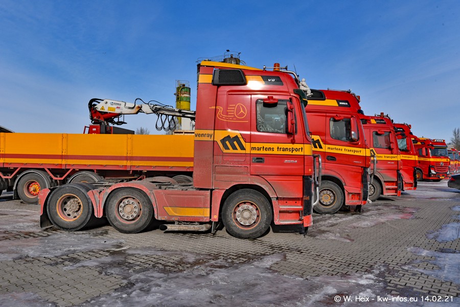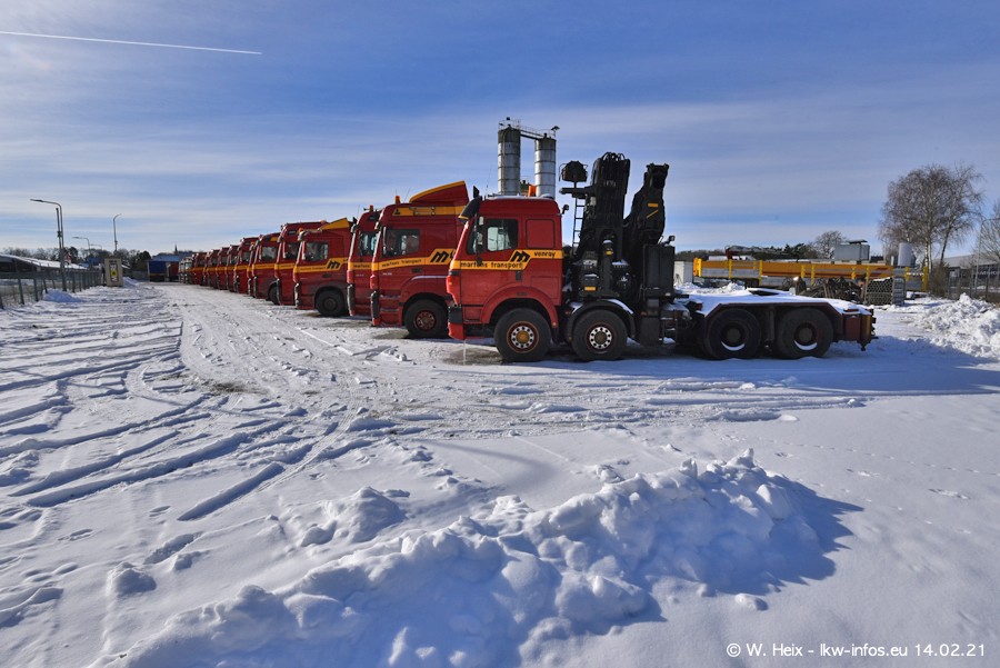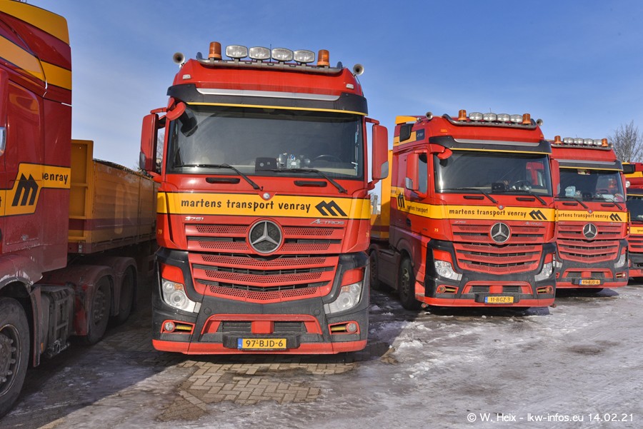 Wie schon in Teil 12 angekündigt, hat Martens Transport in dieser Woche die beiden neuen Auflieger für den Mercedes-Benz New Actros 2851 bekommen. Damit wird die Kombination zu einem LZV (Gigaliner). Die beiden Auflieger wurden von der niederländischen Firma Sterk Trailers gebaut. Der erste Auflieger ist kürzer als der zweite und die Besondeheit ist die auf dem Trailer montierte Sattelkupplung für den zweiten Auflieger, der ein Standardmaß hat. Die Sattelkupplung kann demontiert werden und dann kann der Auflieger "ganz normal" genutzt werden. Diese Art LZV ist in den Niederlanden bisher einzigartig und wird für den Transport von großen Bäumen und Pflanzen in den Niederlanden und Belgien eingesetzt. Ab der kommenden Woche. Und noch etwas hat sich verändert: die beiden bisher blauen Actros 4 Zugmaschinen wurden in den letzten Wochen rot lackiert und entsprechend beschriftet und passen jetzt zum restlichen Fuhrpark. Das das sind die beiden Zugmaschinen mit den silbergrauen Seitenverkleidungen und Kennzeichen "BPG ...". Die Fotos habe ich bei schönstem Winterwetter gemacht. Eis und Schnee sind in den Niederlanden inzwischen genauso selten, wie bei mir zuhause am Niederrhein. Entsprechend schmutig waren die LKW. Das gehört aber bei diesem Wetter irgendwie dazu. Alle LKW waren an diesem Sonntag Vormittag zuhause.