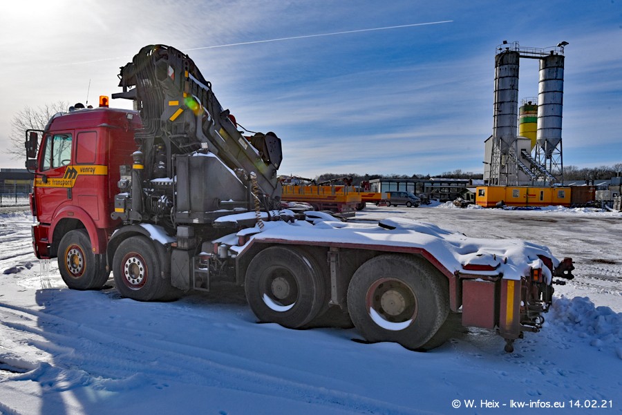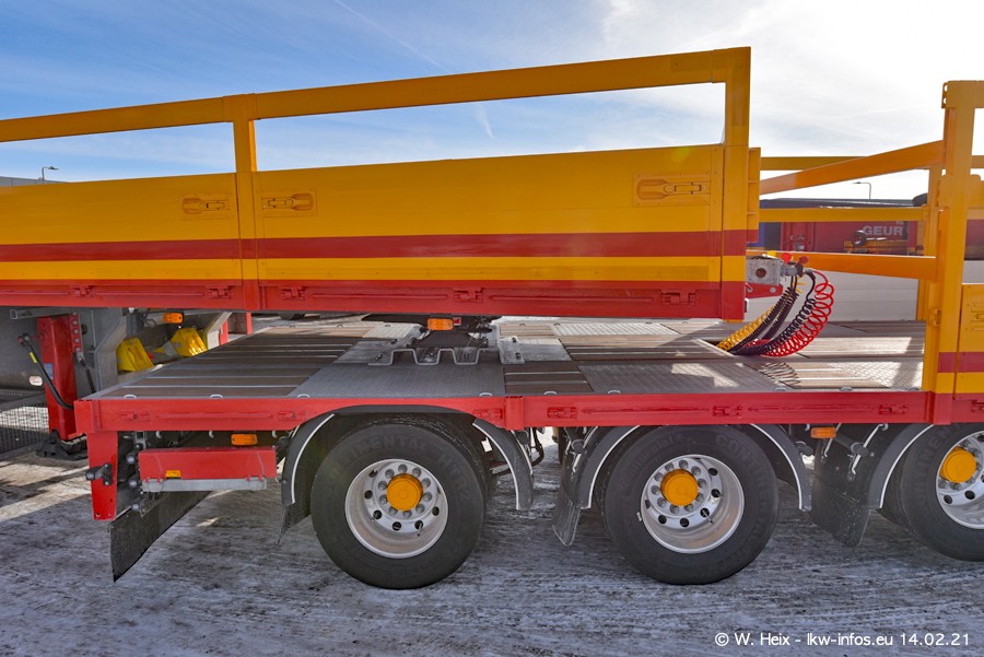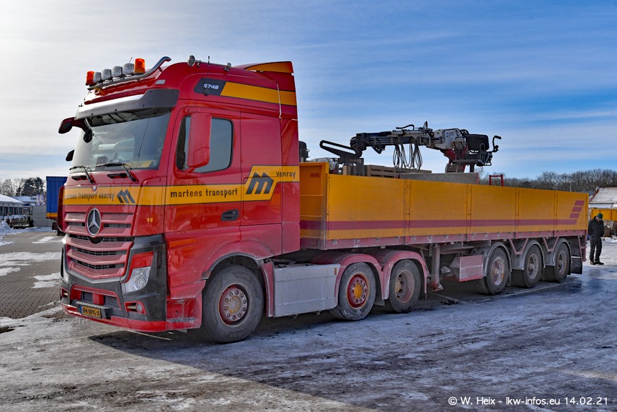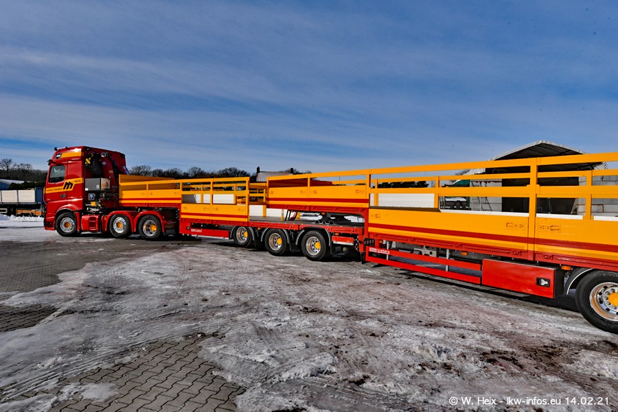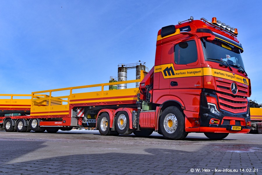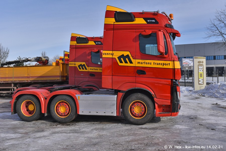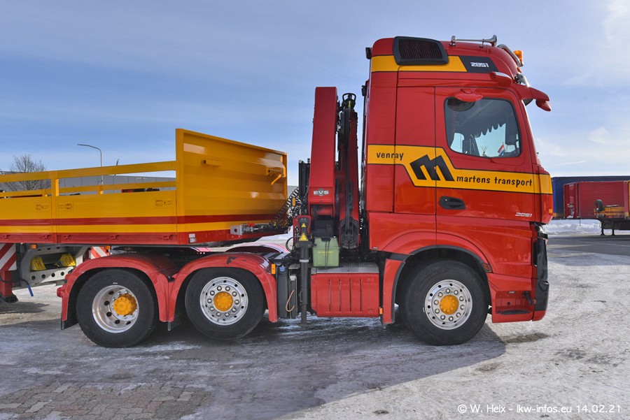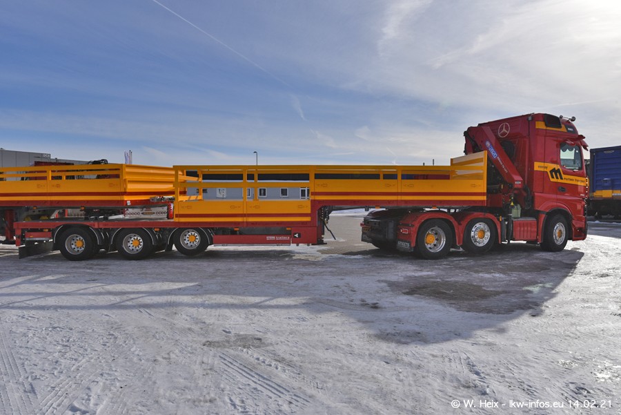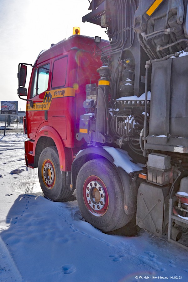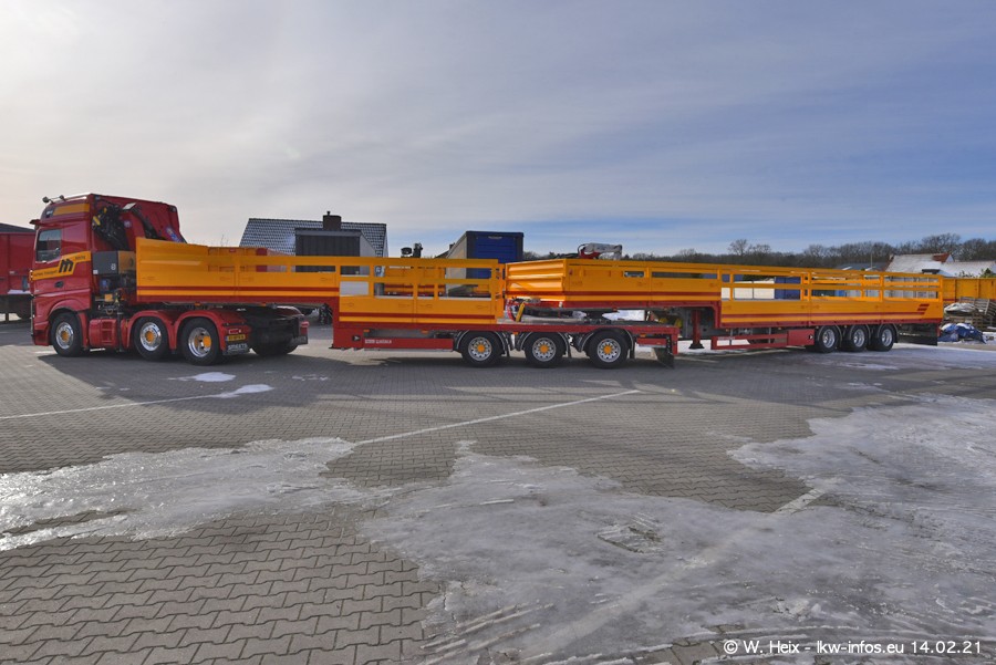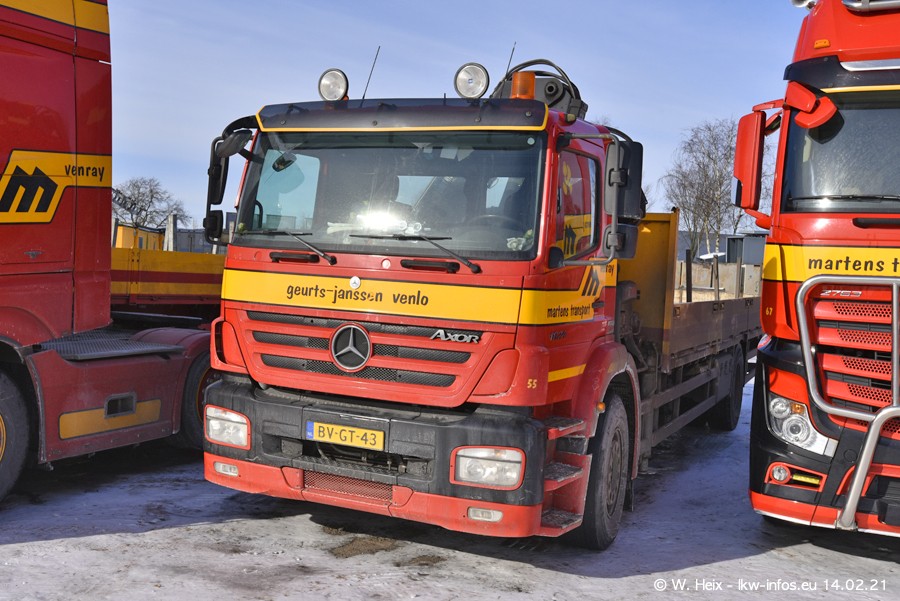 Wie schon in Teil 12 angekündigt, hat Martens Transport in dieser Woche die beiden neuen Auflieger für den Mercedes-Benz New Actros 2851 bekommen. Damit wird die Kombination zu einem LZV (Gigaliner). Die beiden Auflieger wurden von der niederländischen Firma Sterk Trailers gebaut. Der erste Auflieger ist kürzer als der zweite und die Besondeheit ist die auf dem Trailer montierte Sattelkupplung für den zweiten Auflieger, der ein Standardmaß hat. Die Sattelkupplung kann demontiert werden und dann kann der Auflieger "ganz normal" genutzt werden. Diese Art LZV ist in den Niederlanden bisher einzigartig und wird für den Transport von großen Bäumen und Pflanzen in den Niederlanden und Belgien eingesetzt. Ab der kommenden Woche. Und noch etwas hat sich verändert: die beiden bisher blauen Actros 4 Zugmaschinen wurden in den letzten Wochen rot lackiert und entsprechend beschriftet und passen jetzt zum restlichen Fuhrpark. Das das sind die beiden Zugmaschinen mit den silbergrauen Seitenverkleidungen und Kennzeichen "BPG ...". Die Fotos habe ich bei schönstem Winterwetter gemacht. Eis und Schnee sind in den Niederlanden inzwischen genauso selten, wie bei mir zuhause am Niederrhein. Entsprechend schmutig waren die LKW. Das gehört aber bei diesem Wetter irgendwie dazu. Alle LKW waren an diesem Sonntag Vormittag zuhause.