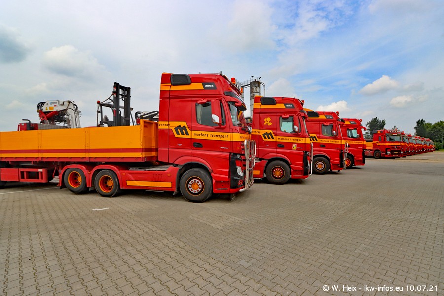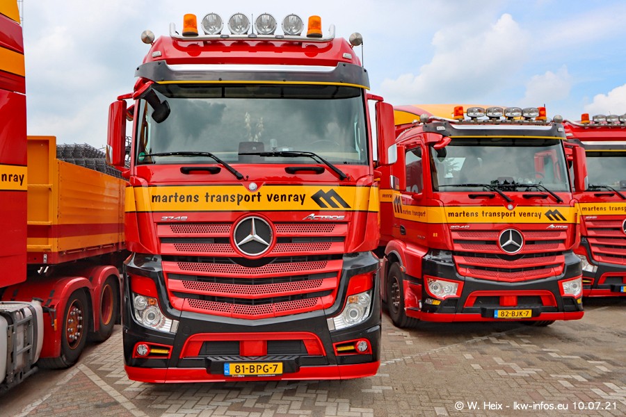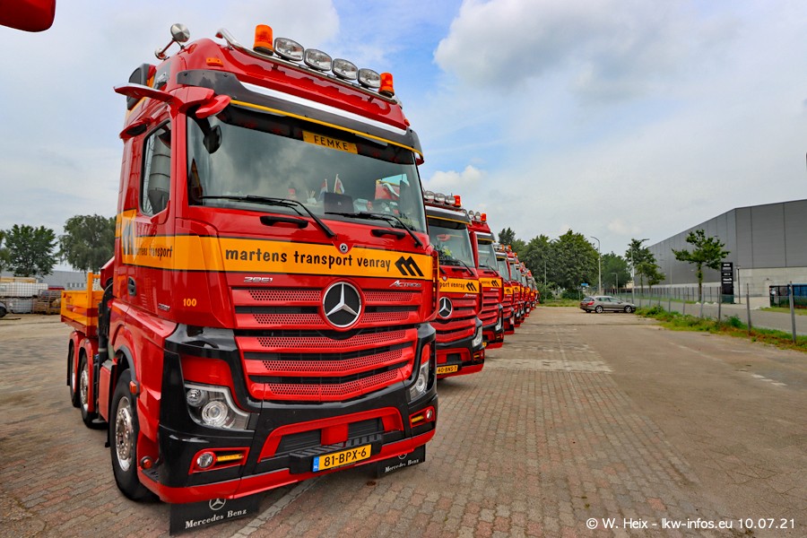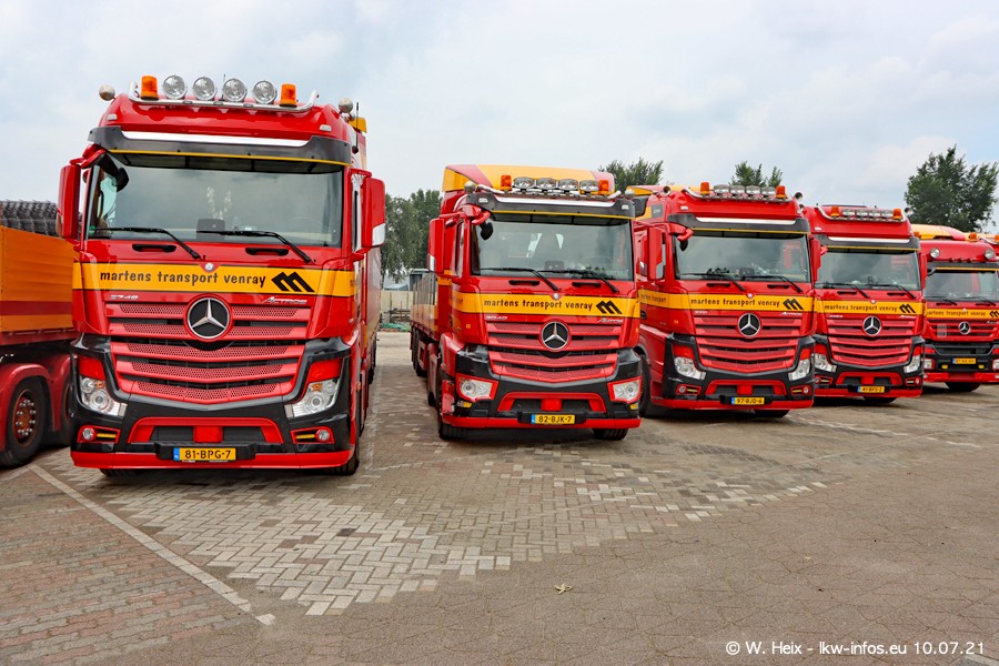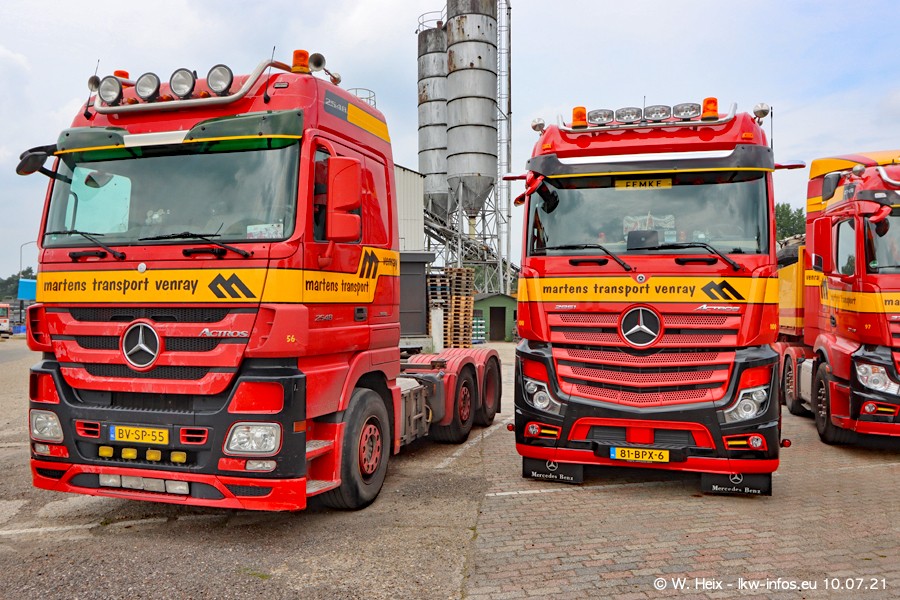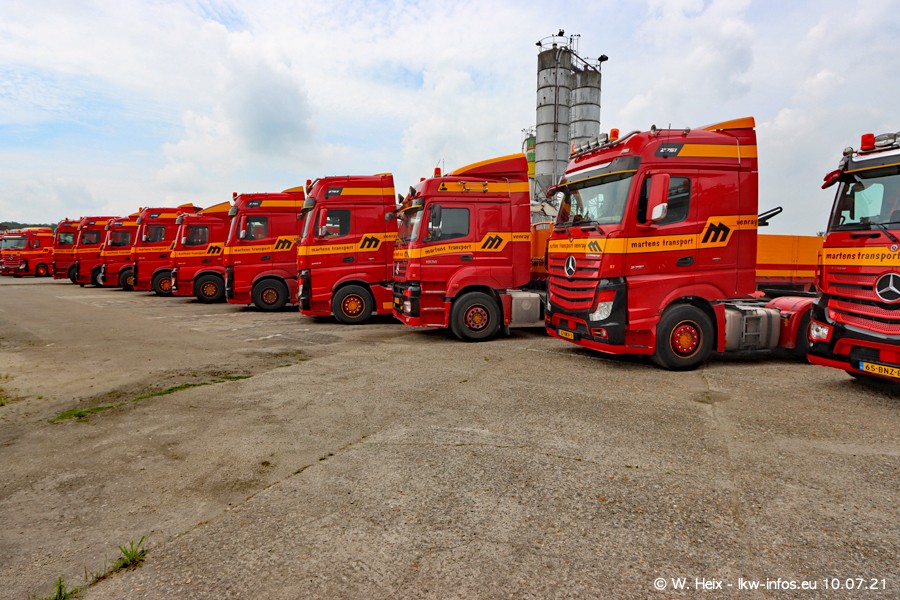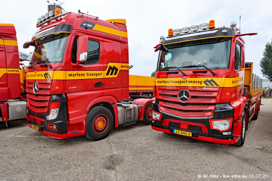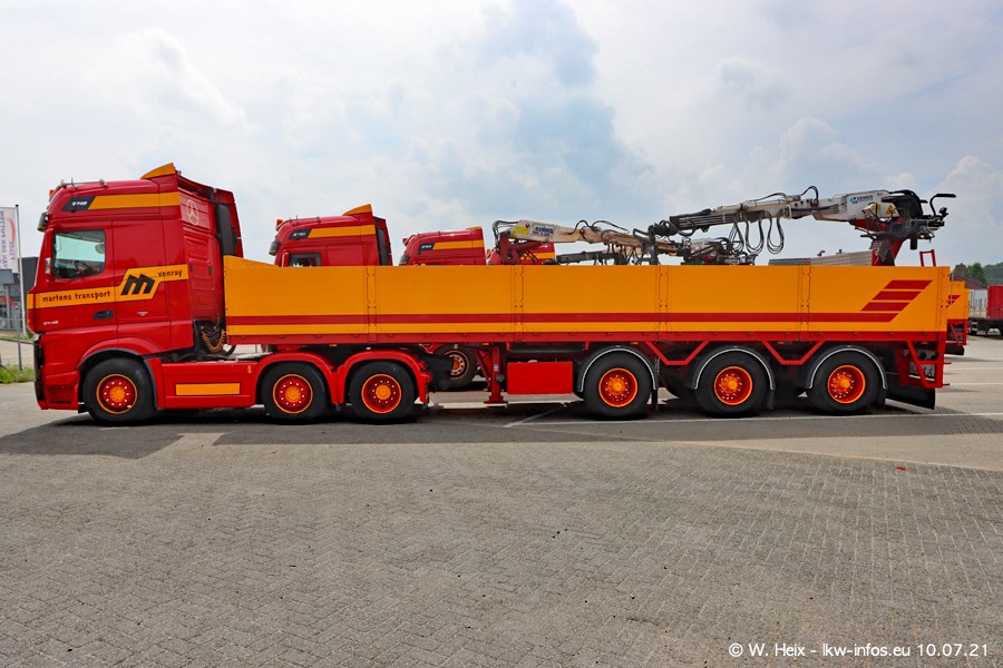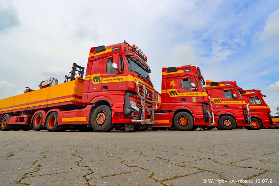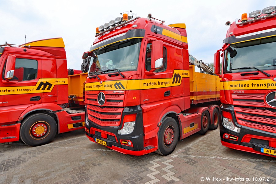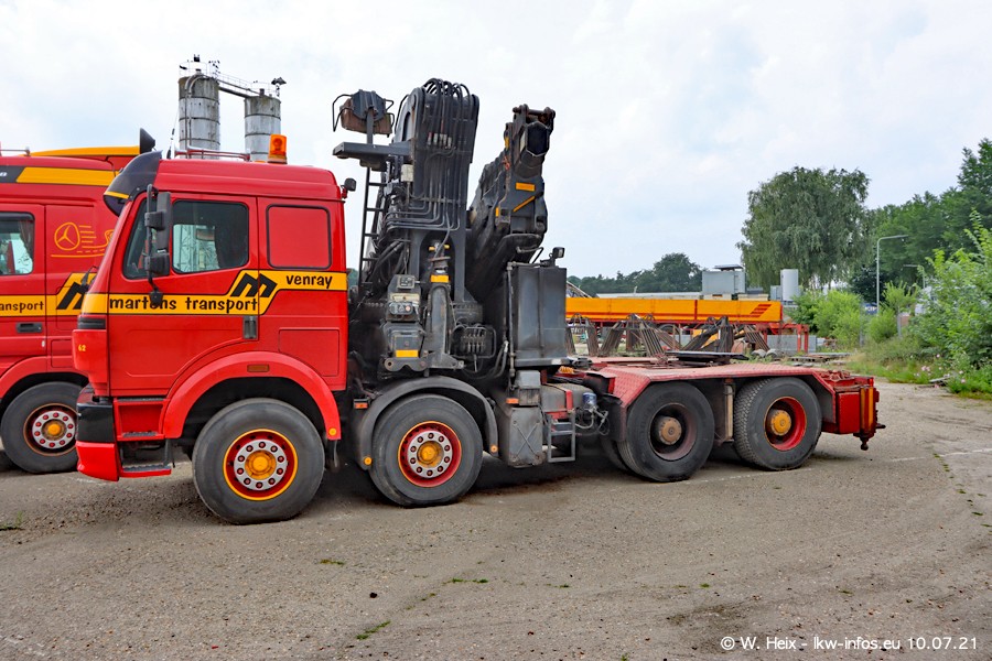 Nach dem winterlichen Besuch im Februar war ich diesmal bei schönem warmen Sommerwetter bei Martens Transport. Bis auf zwei LKW (einer unterwegs, einer in der Werkstatt) war alles zuhause. Neu ist ein weiterer Mercedes-Benz New Actros 4 (MP5) mit dem Kennezichen 49-BPR-7. Dieser kam kurz nach meinem Besuch im Februar. Das Fahrzeug wurde mit 2.000 gefahrenen Kilometern "gebraucht" gekauft und umlackiert. Der Actros, der im Januar neu war (81-BPX-6) hat nun eine kleine Pritsche erhalten und kann statt als LZV auch als Kran-LKW für kleinere Arbeiten eingesetzt werden. Dieser Umbau ist am Tag des Besuchs fertig geworden. Ansonsten ist alles bekannt, neue Fahrzeuge sind schon wieder bestellt .....