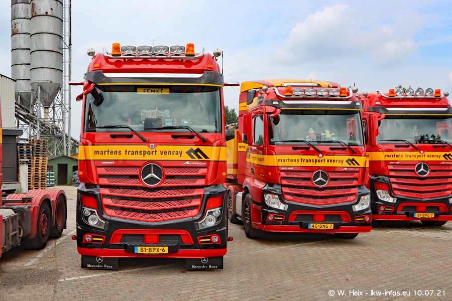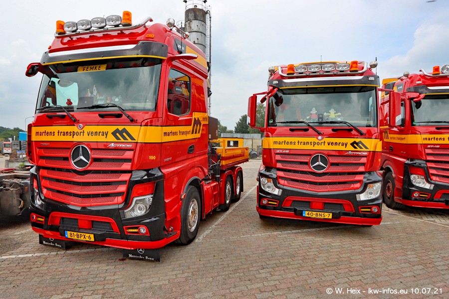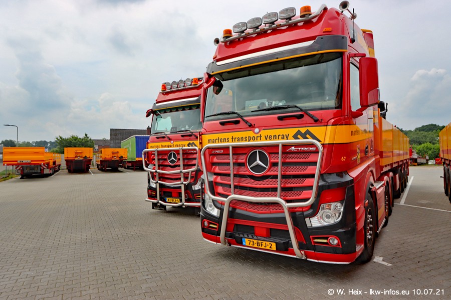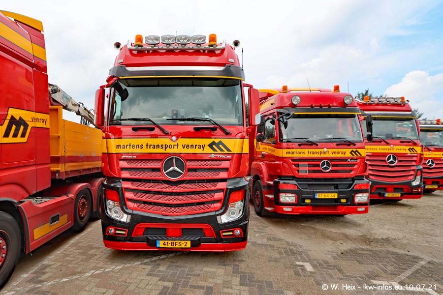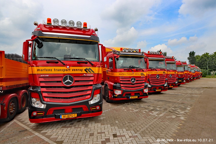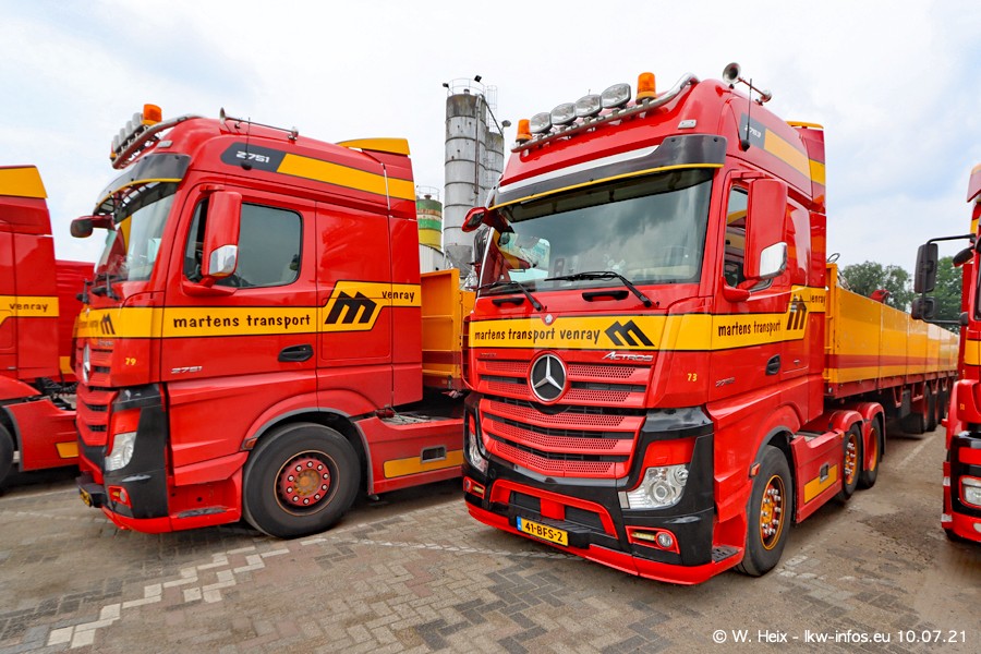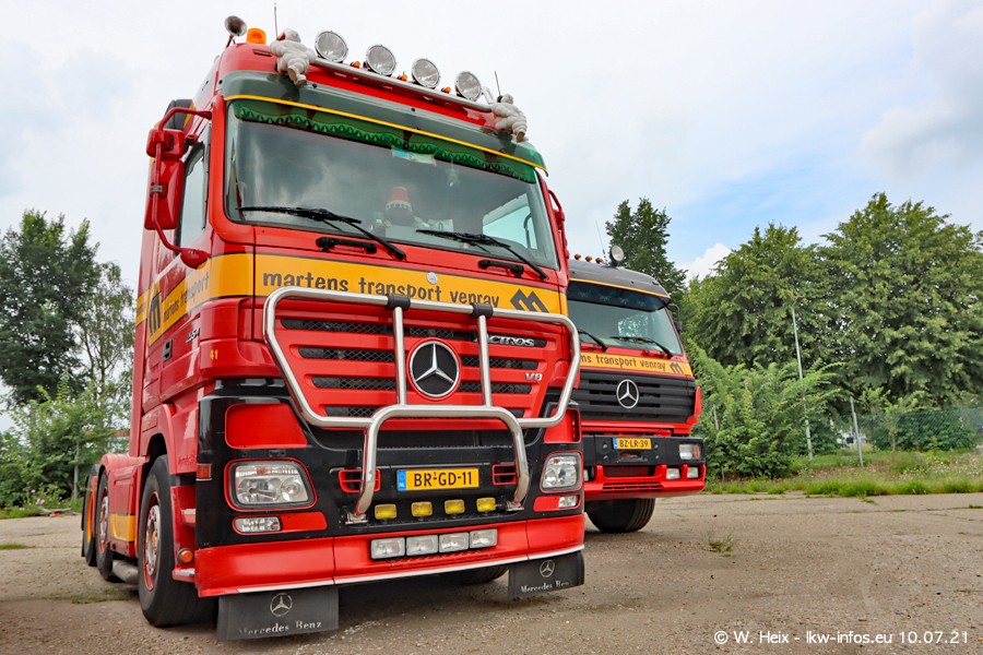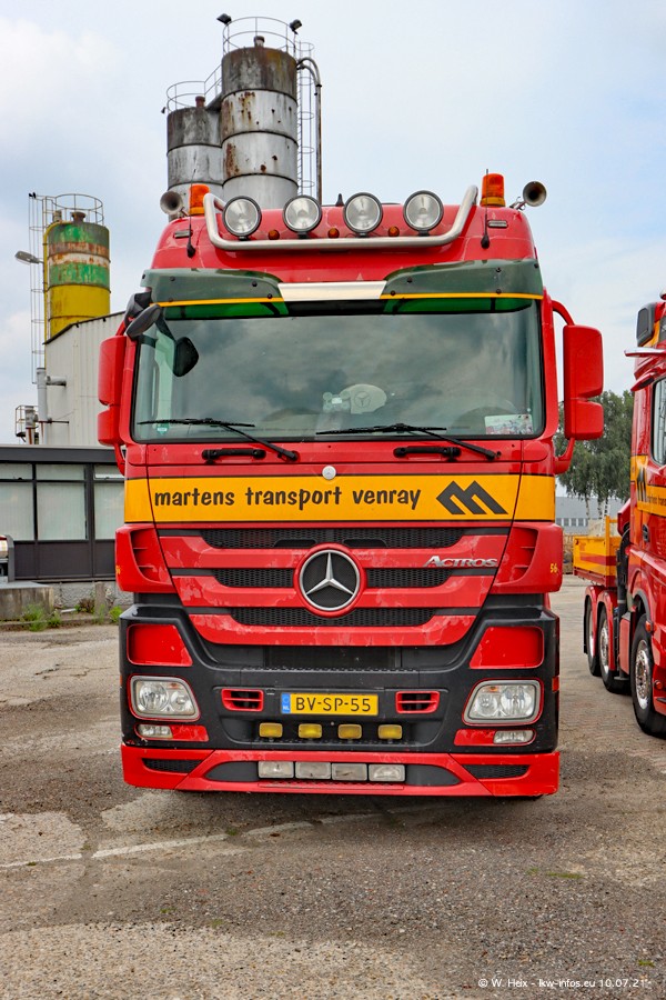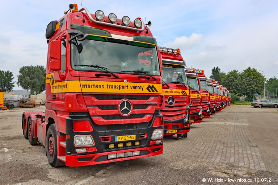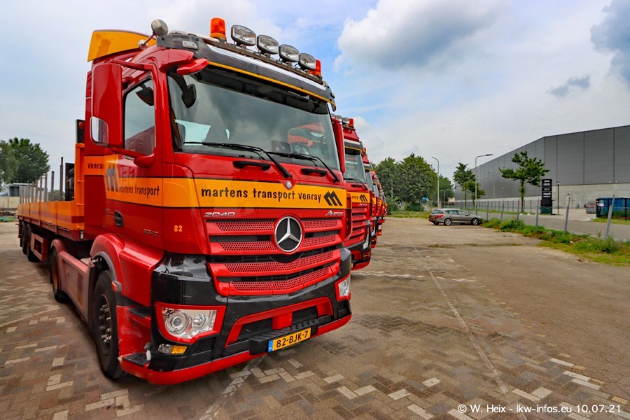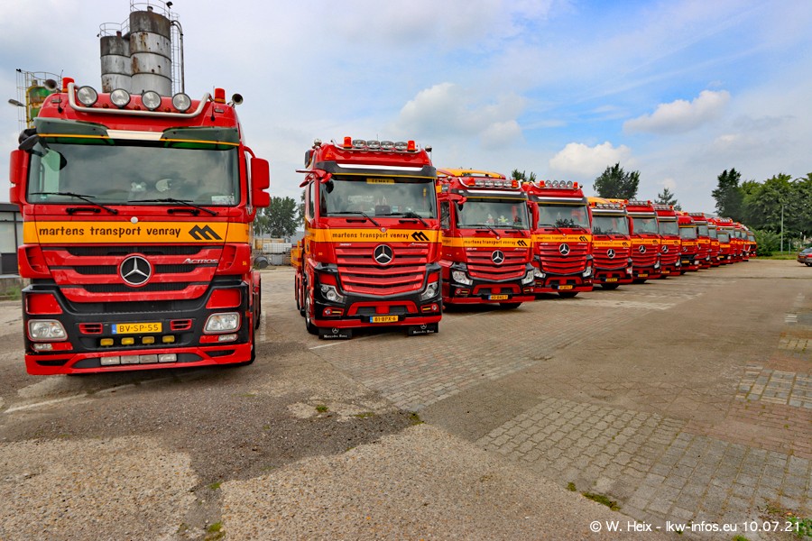 Nach dem winterlichen Besuch im Februar war ich diesmal bei schönem warmen Sommerwetter bei Martens Transport. Bis auf zwei LKW (einer unterwegs, einer in der Werkstatt) war alles zuhause. Neu ist ein weiterer Mercedes-Benz New Actros 4 (MP5) mit dem Kennezichen 49-BPR-7. Dieser kam kurz nach meinem Besuch im Februar. Das Fahrzeug wurde mit 2.000 gefahrenen Kilometern "gebraucht" gekauft und umlackiert. Der Actros, der im Januar neu war (81-BPX-6) hat nun eine kleine Pritsche erhalten und kann statt als LZV auch als Kran-LKW für kleinere Arbeiten eingesetzt werden. Dieser Umbau ist am Tag des Besuchs fertig geworden. Ansonsten ist alles bekannt, neue Fahrzeuge sind schon wieder bestellt .....