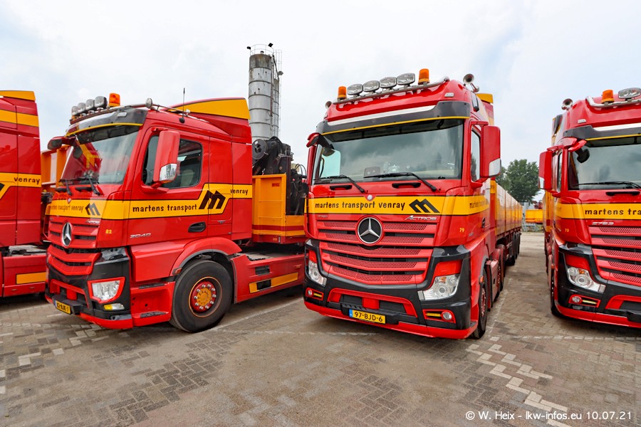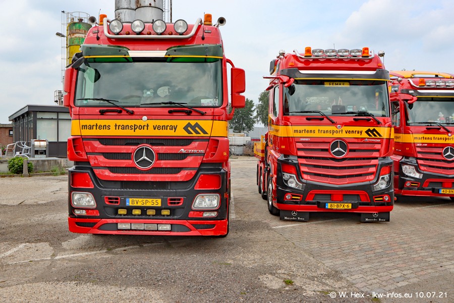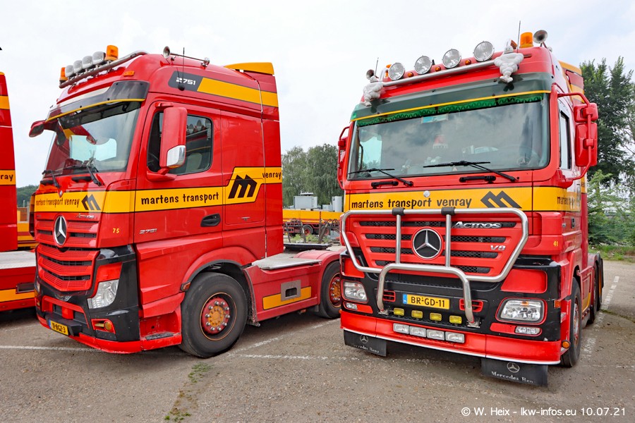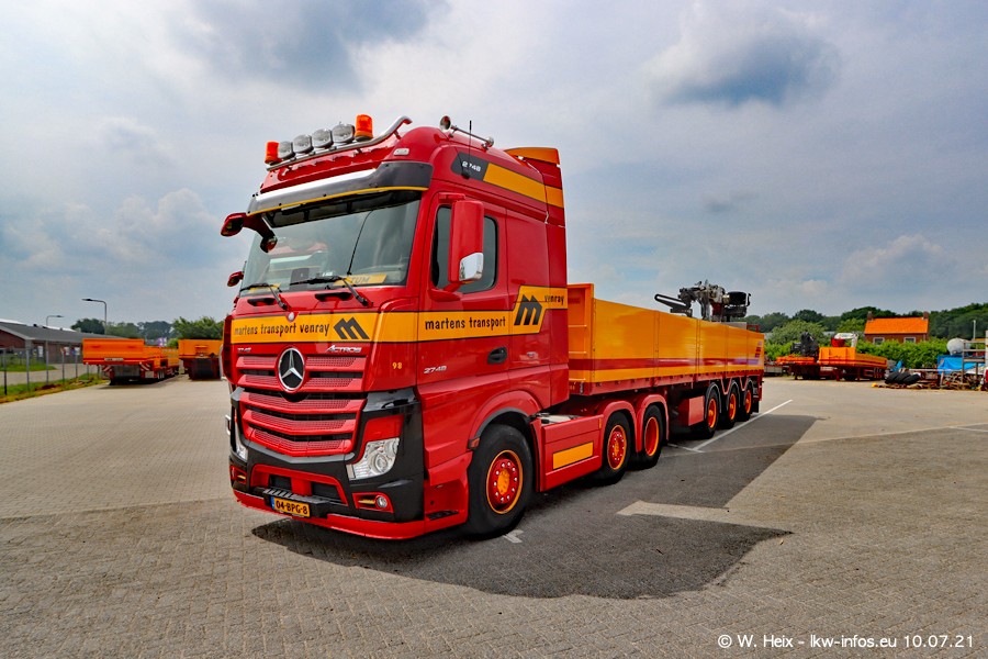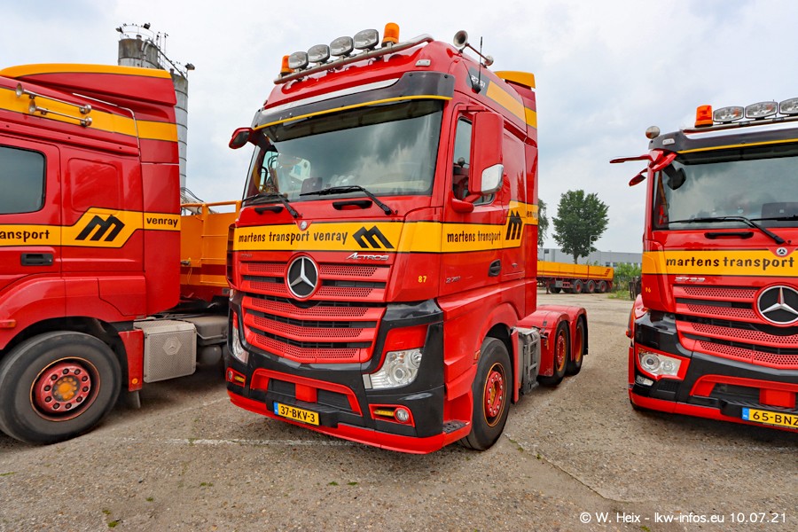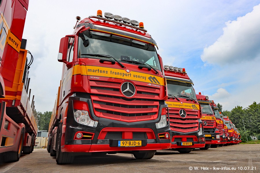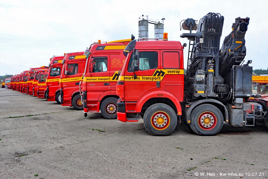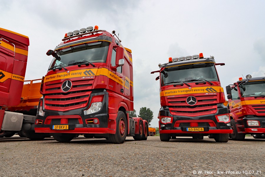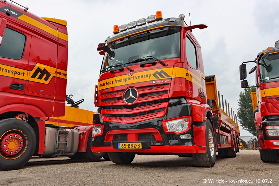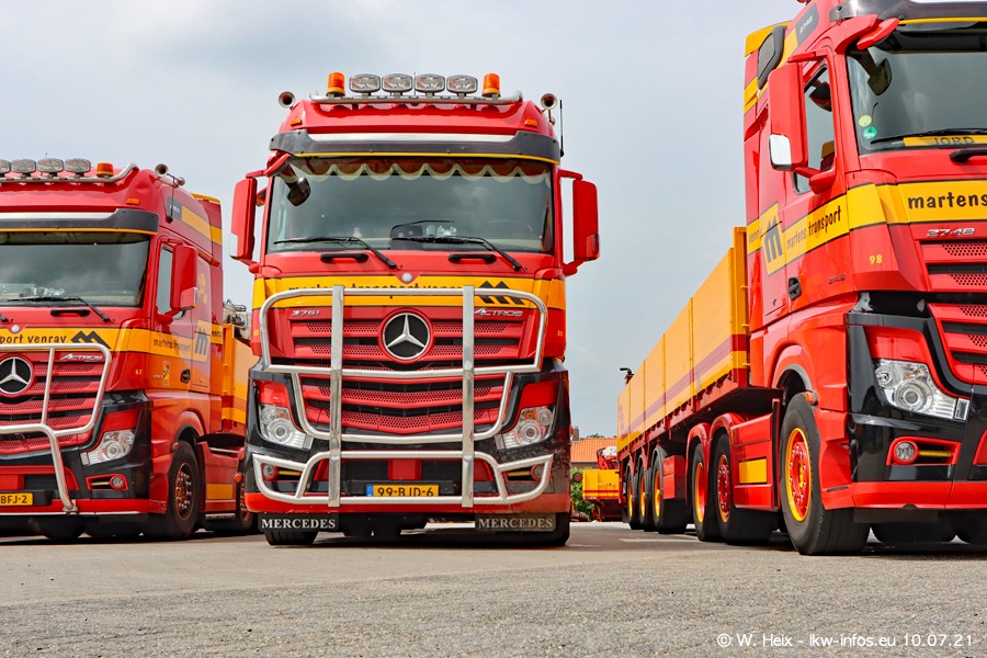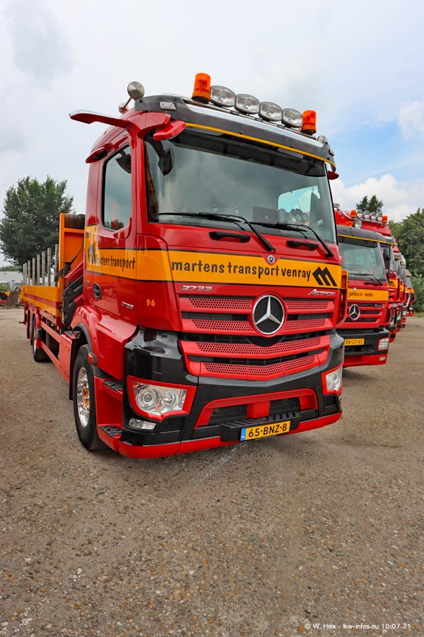 Nach dem winterlichen Besuch im Februar war ich diesmal bei schönem warmen Sommerwetter bei Martens Transport. Bis auf zwei LKW (einer unterwegs, einer in der Werkstatt) war alles zuhause. Neu ist ein weiterer Mercedes-Benz New Actros 4 (MP5) mit dem Kennezichen 49-BPR-7. Dieser kam kurz nach meinem Besuch im Februar. Das Fahrzeug wurde mit 2.000 gefahrenen Kilometern "gebraucht" gekauft und umlackiert. Der Actros, der im Januar neu war (81-BPX-6) hat nun eine kleine Pritsche erhalten und kann statt als LZV auch als Kran-LKW für kleinere Arbeiten eingesetzt werden. Dieser Umbau ist am Tag des Besuchs fertig geworden. Ansonsten ist alles bekannt, neue Fahrzeuge sind schon wieder bestellt .....