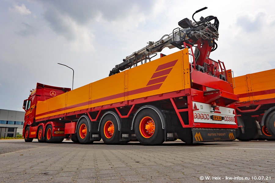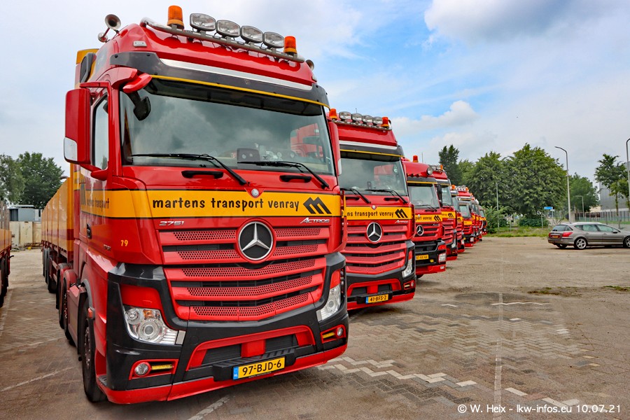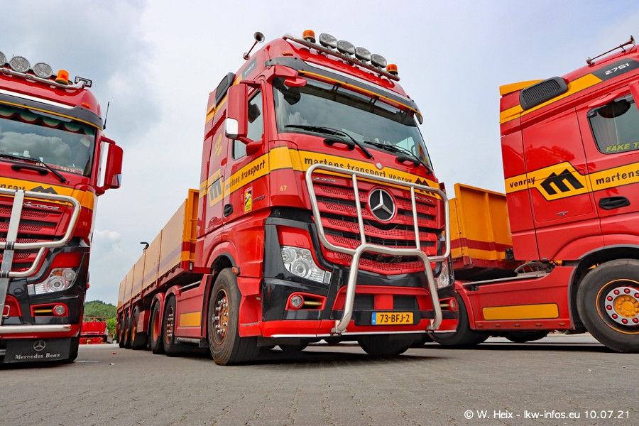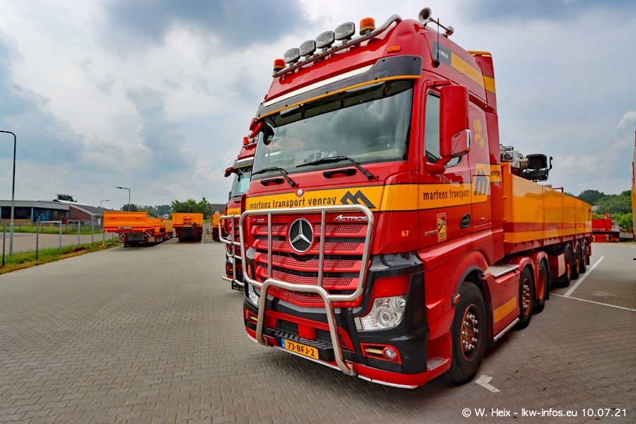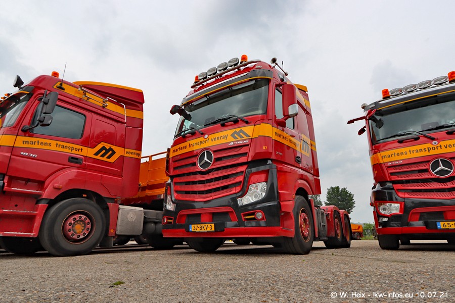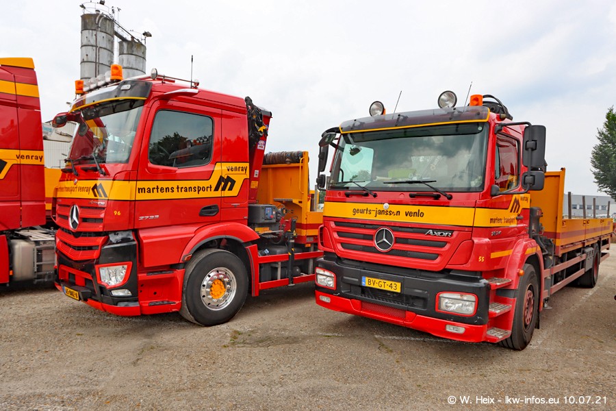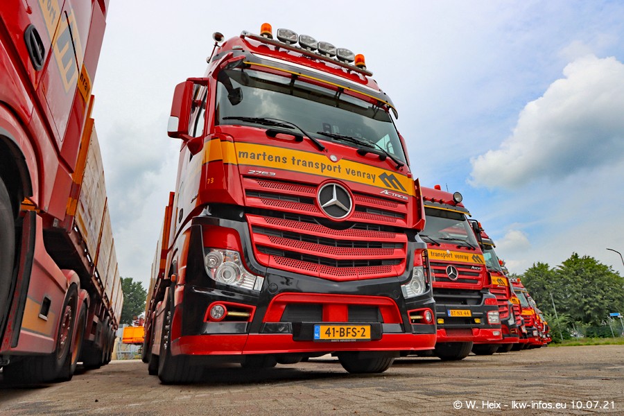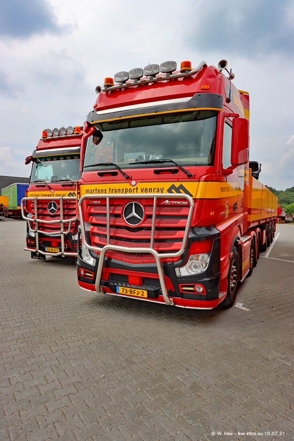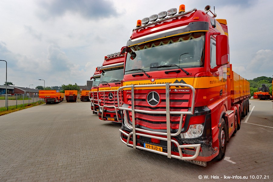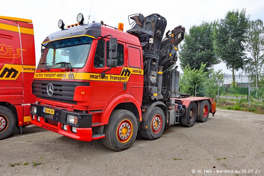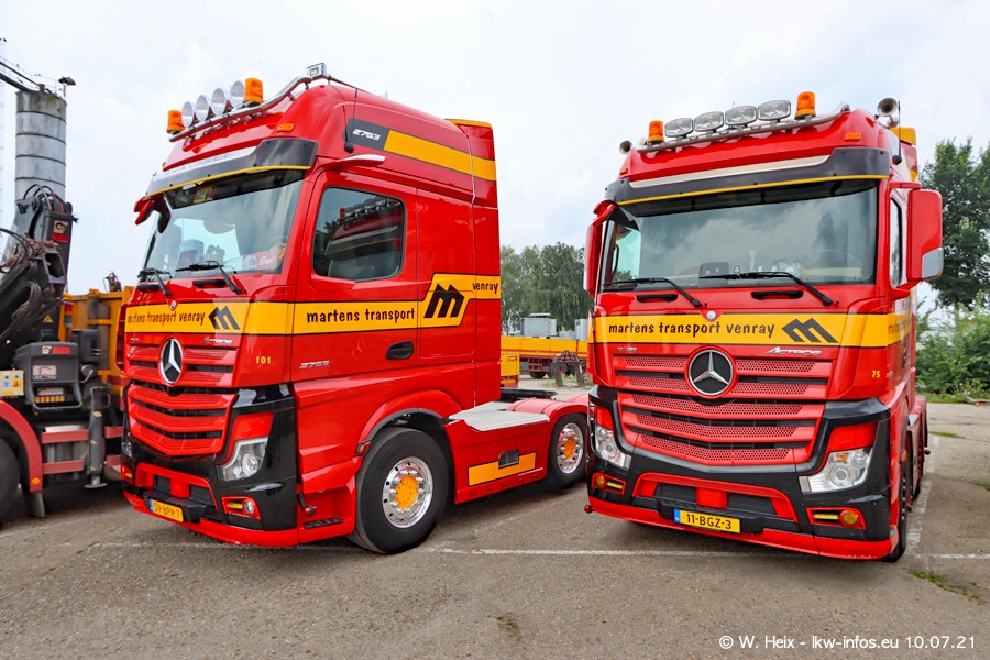 Nach dem winterlichen Besuch im Februar war ich diesmal bei schönem warmen Sommerwetter bei Martens Transport. Bis auf zwei LKW (einer unterwegs, einer in der Werkstatt) war alles zuhause. Neu ist ein weiterer Mercedes-Benz New Actros 4 (MP5) mit dem Kennezichen 49-BPR-7. Dieser kam kurz nach meinem Besuch im Februar. Das Fahrzeug wurde mit 2.000 gefahrenen Kilometern "gebraucht" gekauft und umlackiert. Der Actros, der im Januar neu war (81-BPX-6) hat nun eine kleine Pritsche erhalten und kann statt als LZV auch als Kran-LKW für kleinere Arbeiten eingesetzt werden. Dieser Umbau ist am Tag des Besuchs fertig geworden. Ansonsten ist alles bekannt, neue Fahrzeuge sind schon wieder bestellt .....