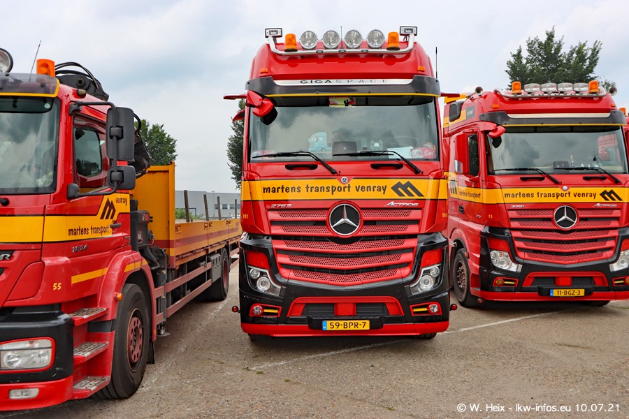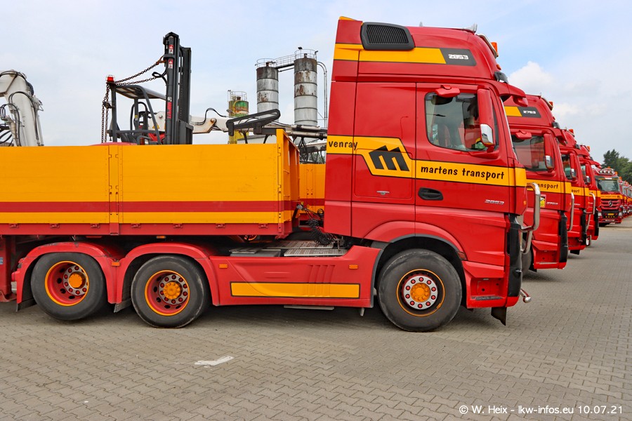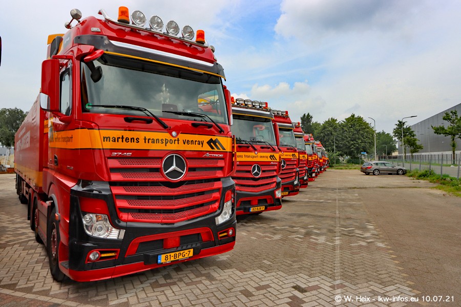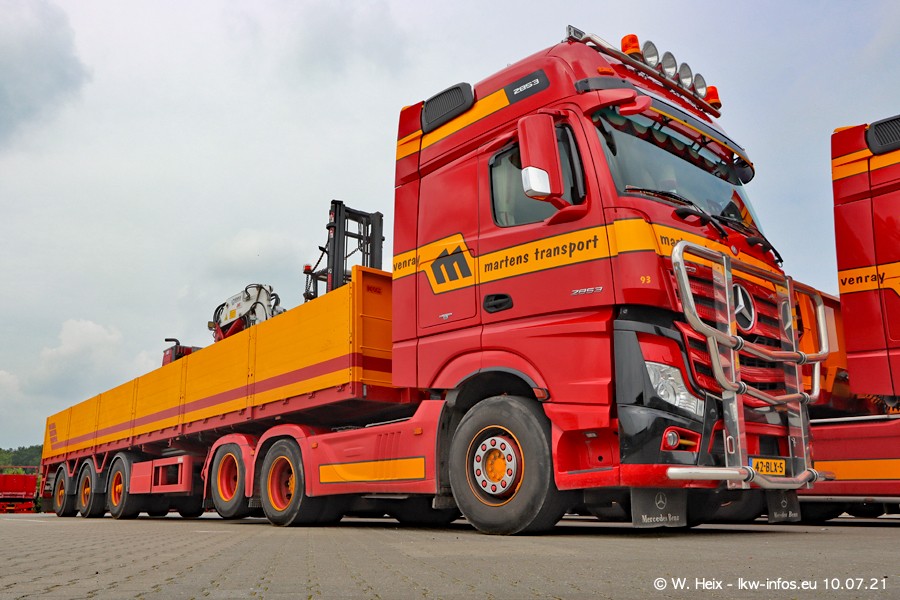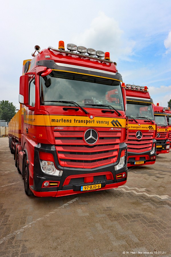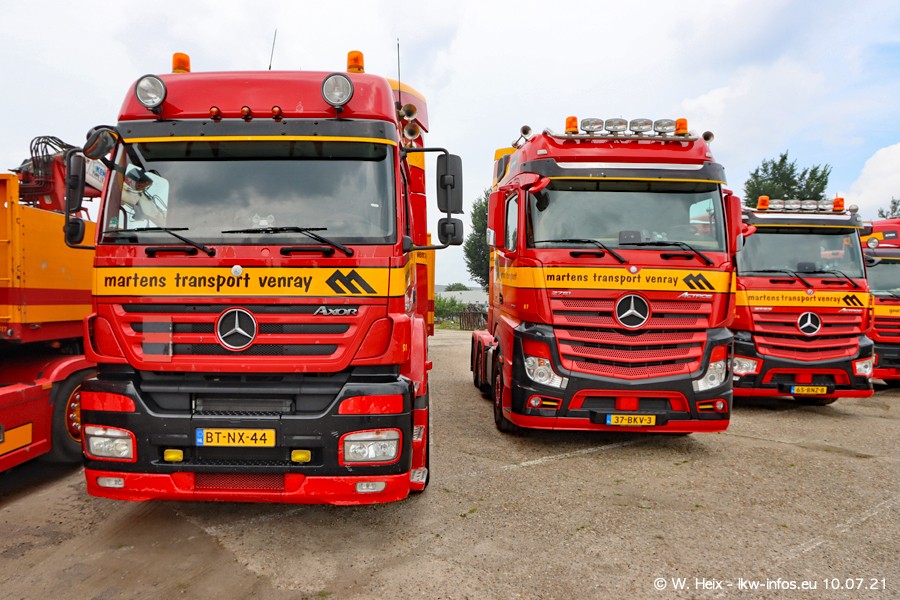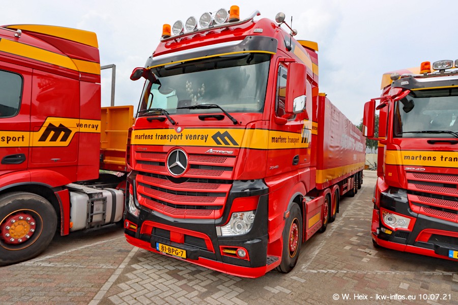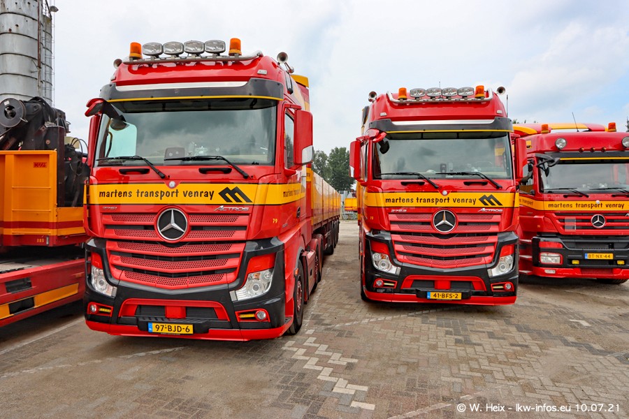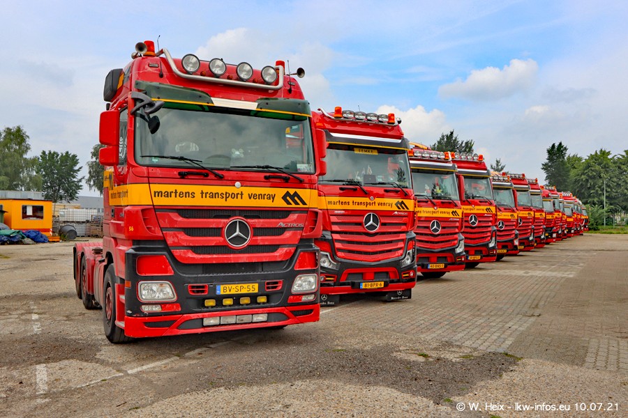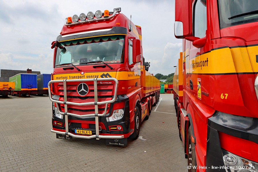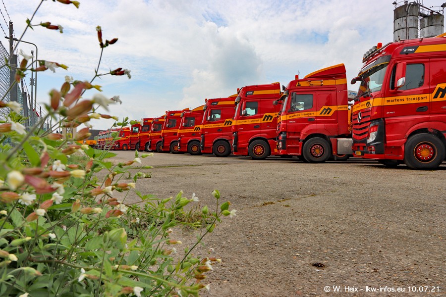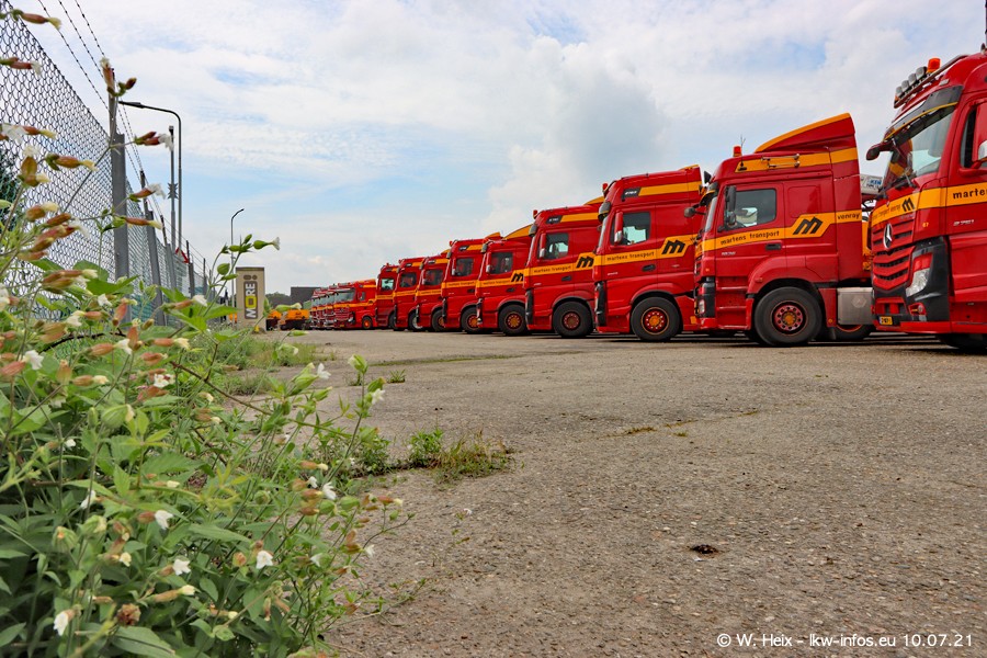 Nach dem winterlichen Besuch im Februar war ich diesmal bei schönem warmen Sommerwetter bei Martens Transport. Bis auf zwei LKW (einer unterwegs, einer in der Werkstatt) war alles zuhause. Neu ist ein weiterer Mercedes-Benz New Actros 4 (MP5) mit dem Kennezichen 49-BPR-7. Dieser kam kurz nach meinem Besuch im Februar. Das Fahrzeug wurde mit 2.000 gefahrenen Kilometern "gebraucht" gekauft und umlackiert. Der Actros, der im Januar neu war (81-BPX-6) hat nun eine kleine Pritsche erhalten und kann statt als LZV auch als Kran-LKW für kleinere Arbeiten eingesetzt werden. Dieser Umbau ist am Tag des Besuchs fertig geworden. Ansonsten ist alles bekannt, neue Fahrzeuge sind schon wieder bestellt .....