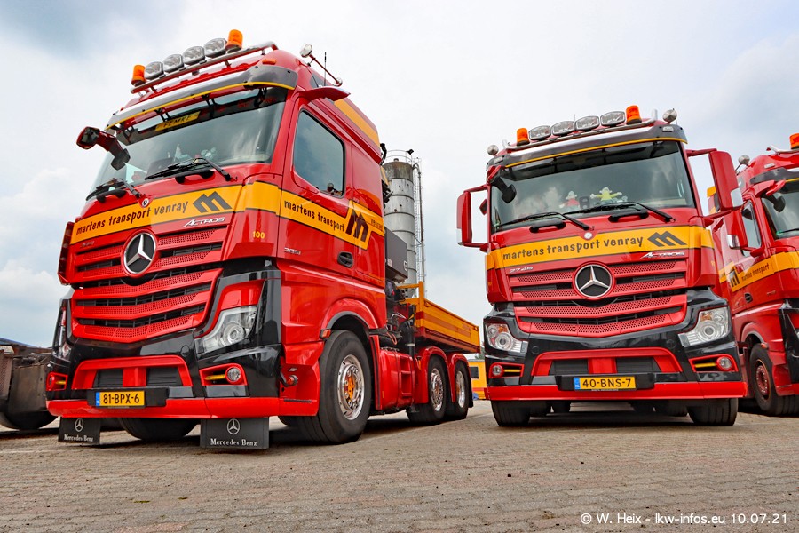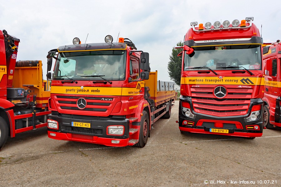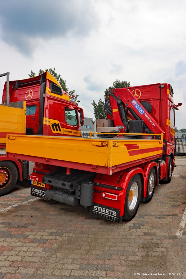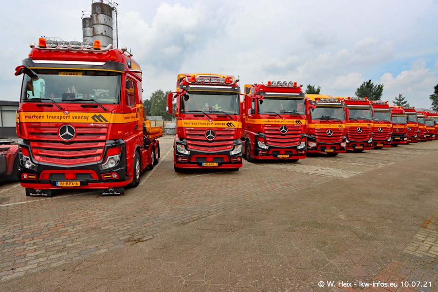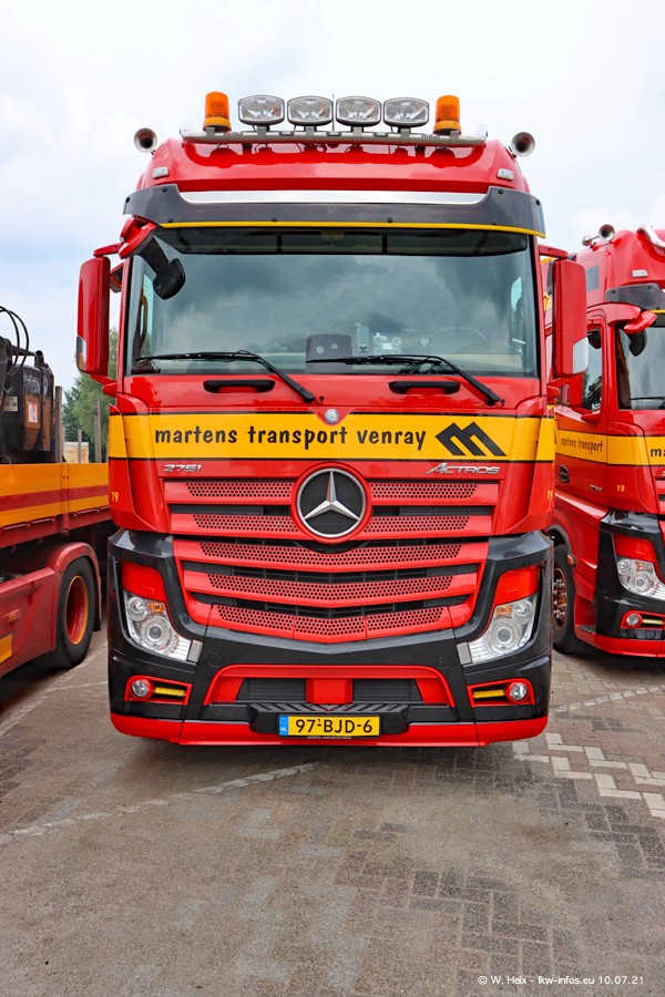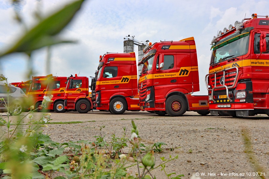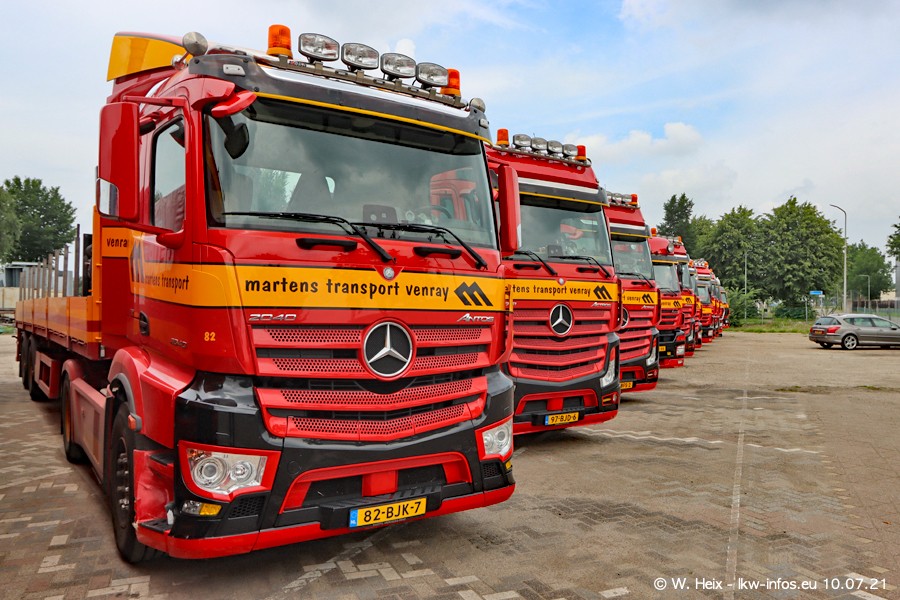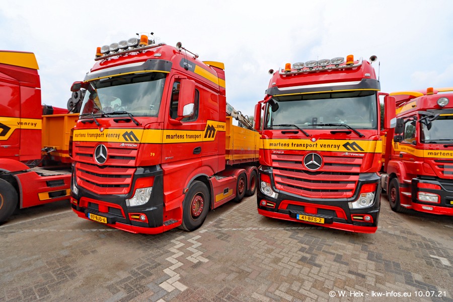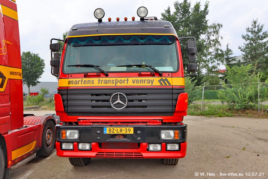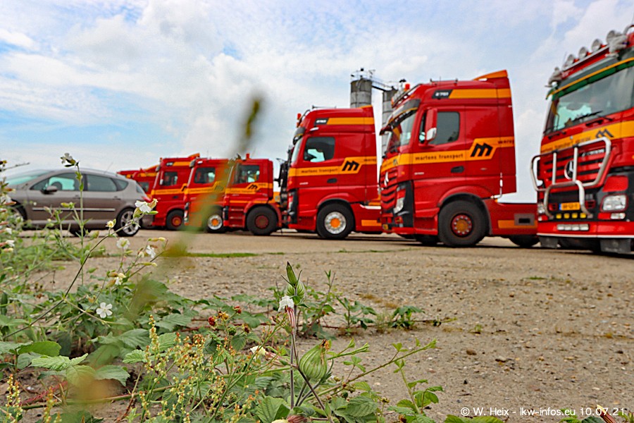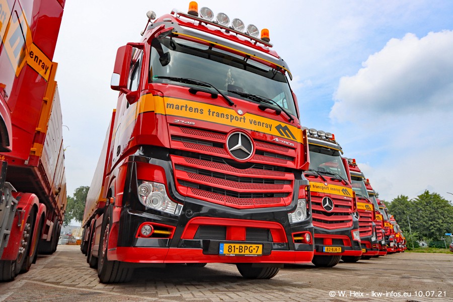 Nach dem winterlichen Besuch im Februar war ich diesmal bei schönem warmen Sommerwetter bei Martens Transport. Bis auf zwei LKW (einer unterwegs, einer in der Werkstatt) war alles zuhause. Neu ist ein weiterer Mercedes-Benz New Actros 4 (MP5) mit dem Kennezichen 49-BPR-7. Dieser kam kurz nach meinem Besuch im Februar. Das Fahrzeug wurde mit 2.000 gefahrenen Kilometern "gebraucht" gekauft und umlackiert. Der Actros, der im Januar neu war (81-BPX-6) hat nun eine kleine Pritsche erhalten und kann statt als LZV auch als Kran-LKW für kleinere Arbeiten eingesetzt werden. Dieser Umbau ist am Tag des Besuchs fertig geworden. Ansonsten ist alles bekannt, neue Fahrzeuge sind schon wieder bestellt .....