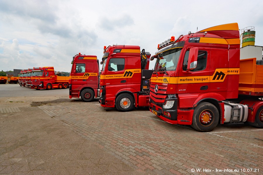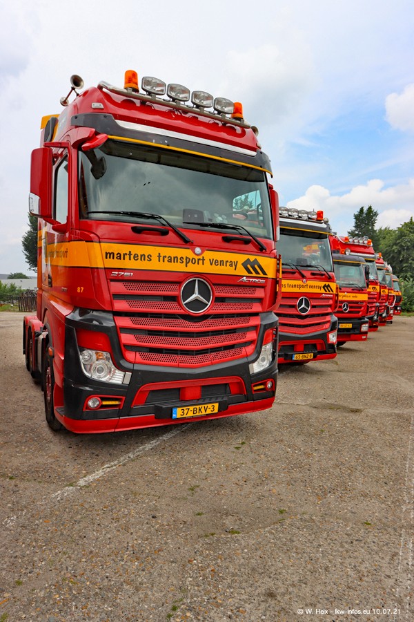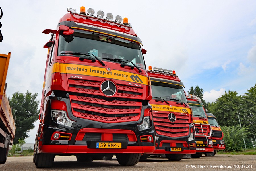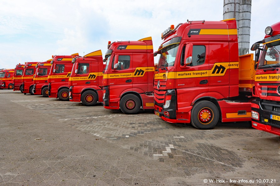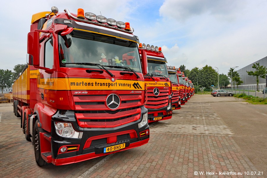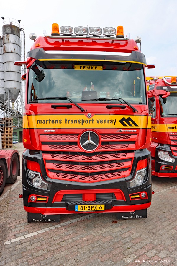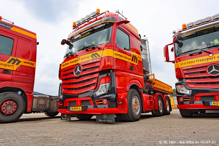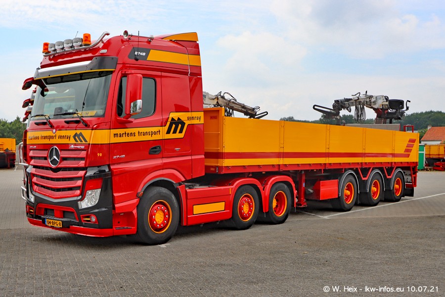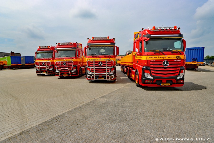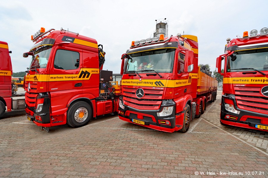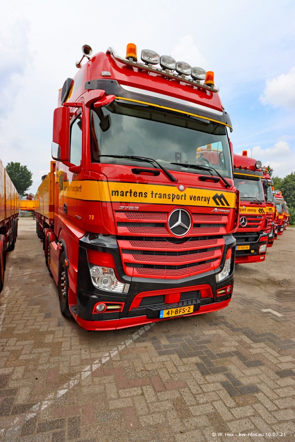Nach dem winterlichen Besuch im Februar war ich diesmal bei schönem warmen Sommerwetter bei Martens Transport. Bis auf zwei LKW (einer unterwegs, einer in der Werkstatt) war alles zuhause. Neu ist ein weiterer Mercedes-Benz New Actros 4 (MP5) mit dem Kennezichen 49-BPR-7. Dieser kam kurz nach meinem Besuch im Februar. Das Fahrzeug wurde mit 2.000 gefahrenen Kilometern "gebraucht" gekauft und umlackiert. Der Actros, der im Januar neu war (81-BPX-6) hat nun eine kleine Pritsche erhalten und kann statt als LZV auch als Kran-LKW für kleinere Arbeiten eingesetzt werden. Dieser Umbau ist am Tag des Besuchs fertig geworden. Ansonsten ist alles bekannt, neue Fahrzeuge sind schon wieder bestellt .....