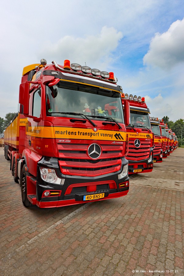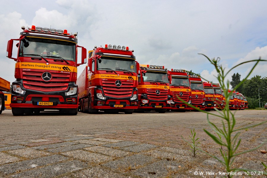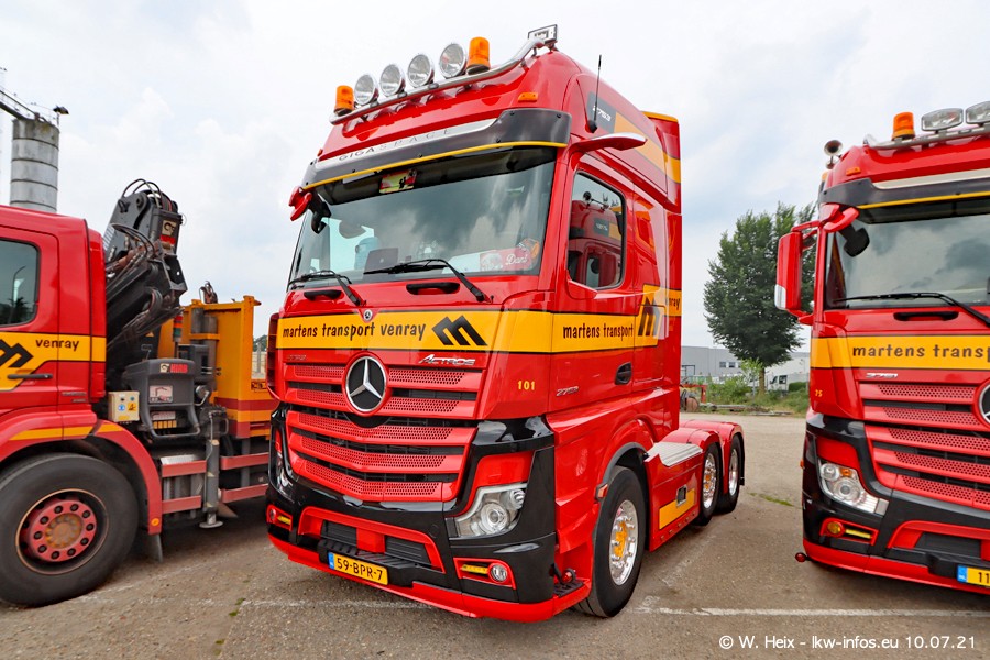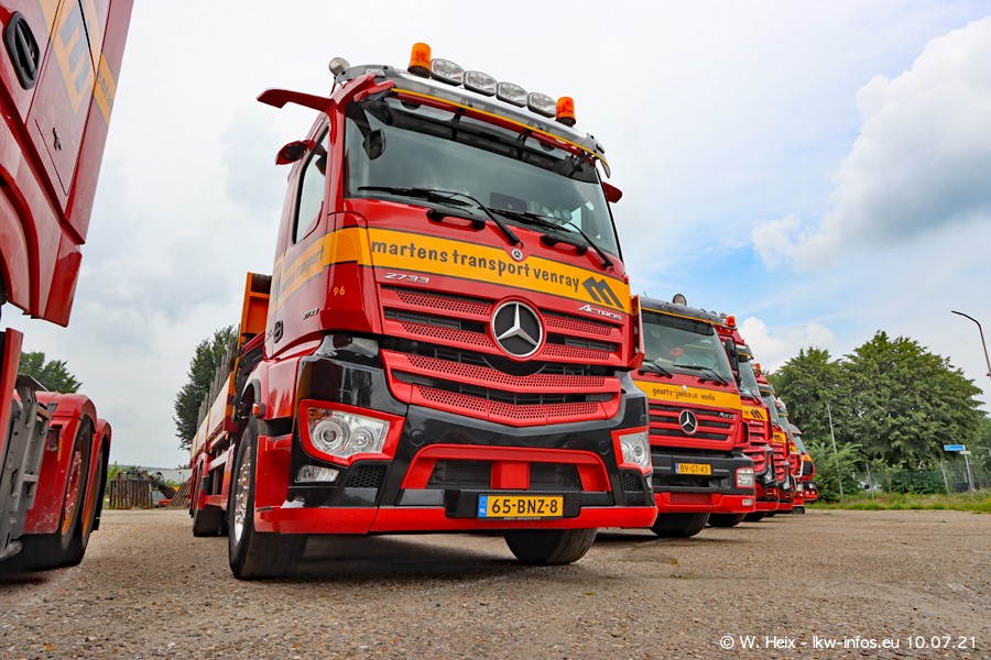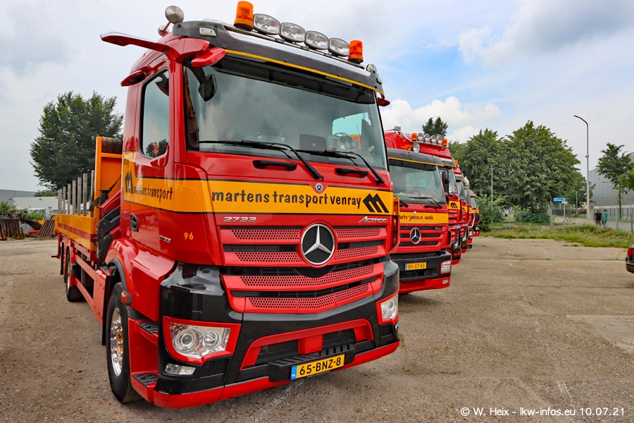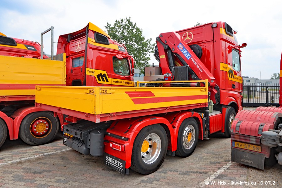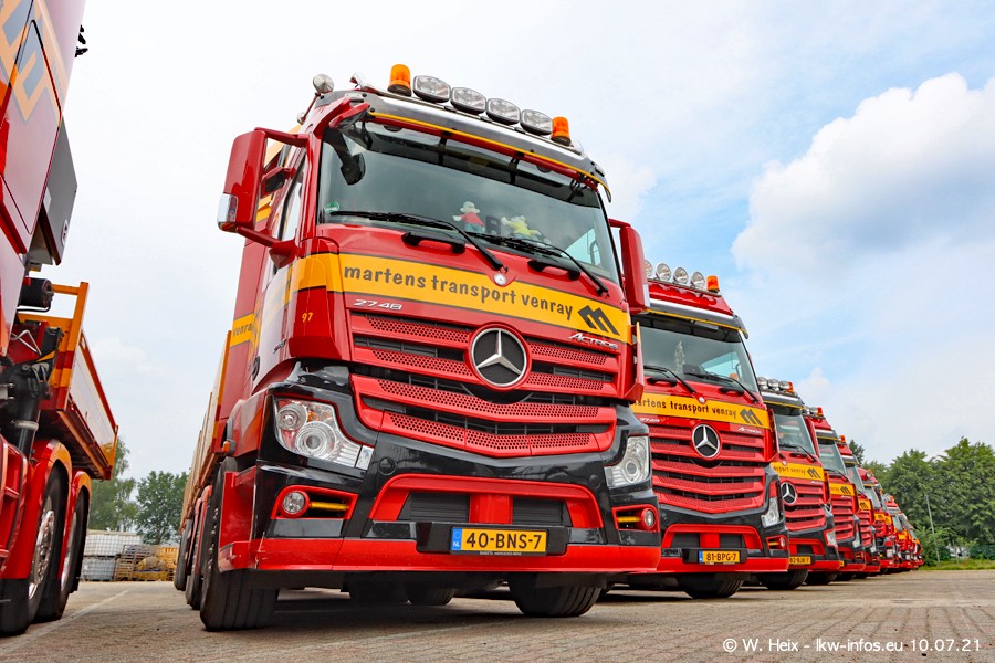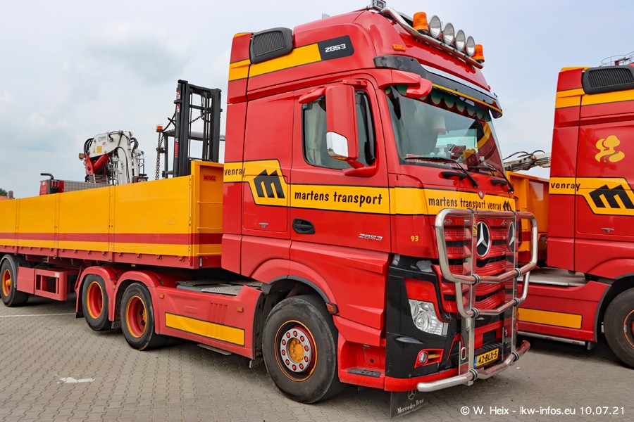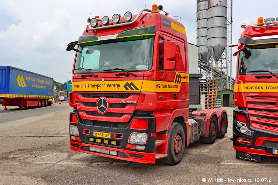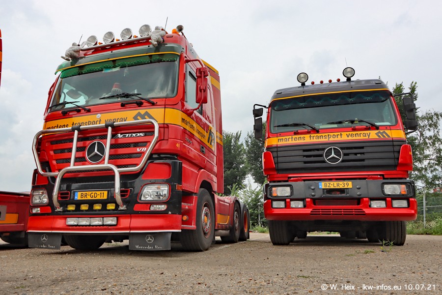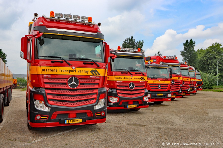 Nach dem winterlichen Besuch im Februar war ich diesmal bei schönem warmen Sommerwetter bei Martens Transport. Bis auf zwei LKW (einer unterwegs, einer in der Werkstatt) war alles zuhause. Neu ist ein weiterer Mercedes-Benz New Actros 4 (MP5) mit dem Kennezichen 49-BPR-7. Dieser kam kurz nach meinem Besuch im Februar. Das Fahrzeug wurde mit 2.000 gefahrenen Kilometern "gebraucht" gekauft und umlackiert. Der Actros, der im Januar neu war (81-BPX-6) hat nun eine kleine Pritsche erhalten und kann statt als LZV auch als Kran-LKW für kleinere Arbeiten eingesetzt werden. Dieser Umbau ist am Tag des Besuchs fertig geworden. Ansonsten ist alles bekannt, neue Fahrzeuge sind schon wieder bestellt .....