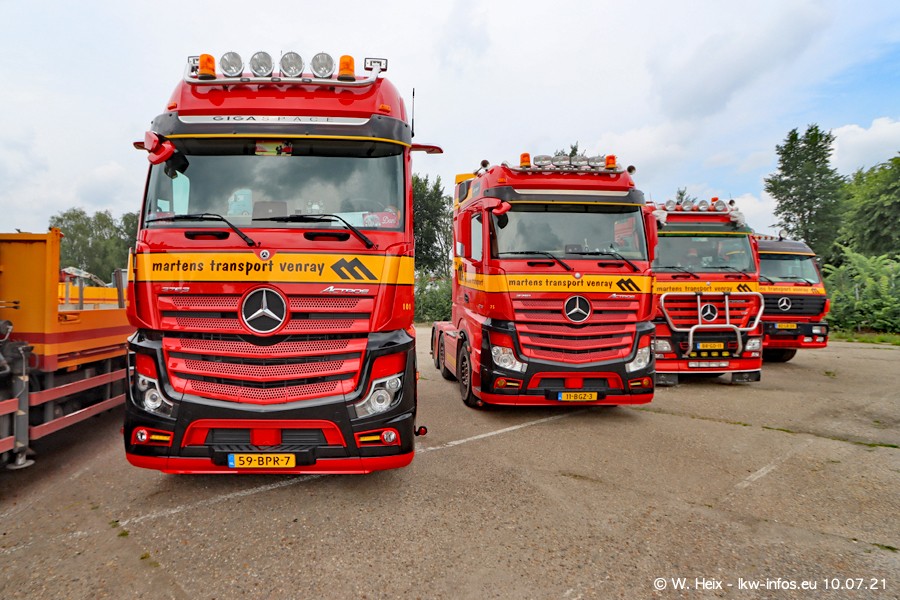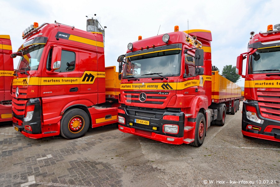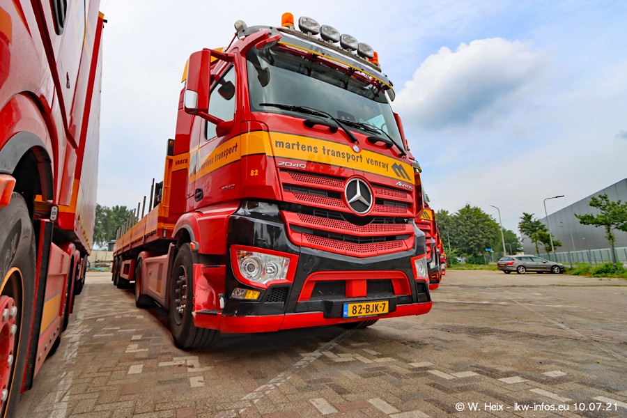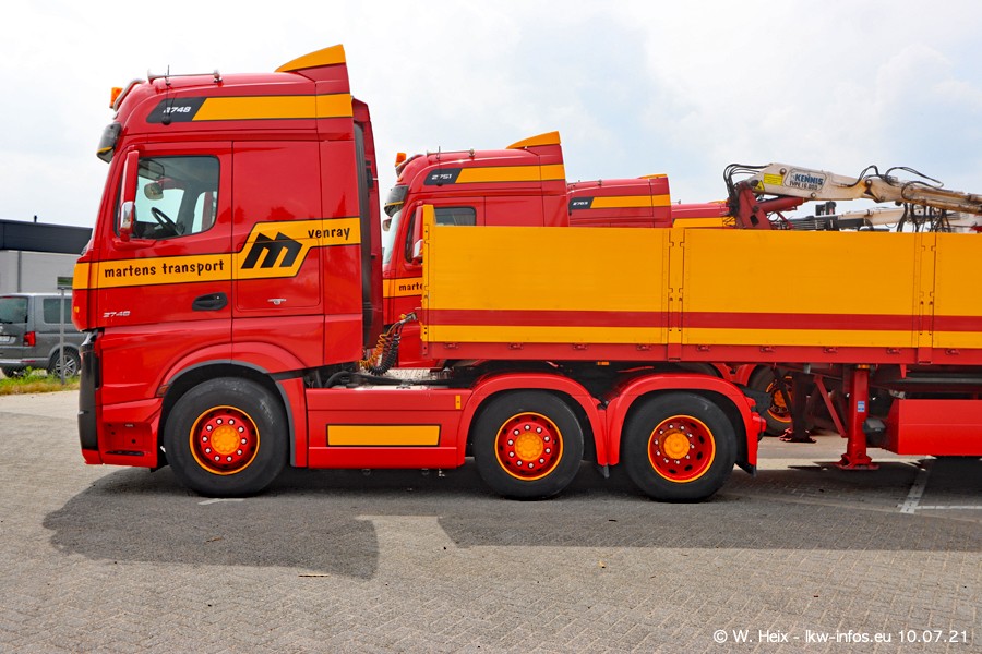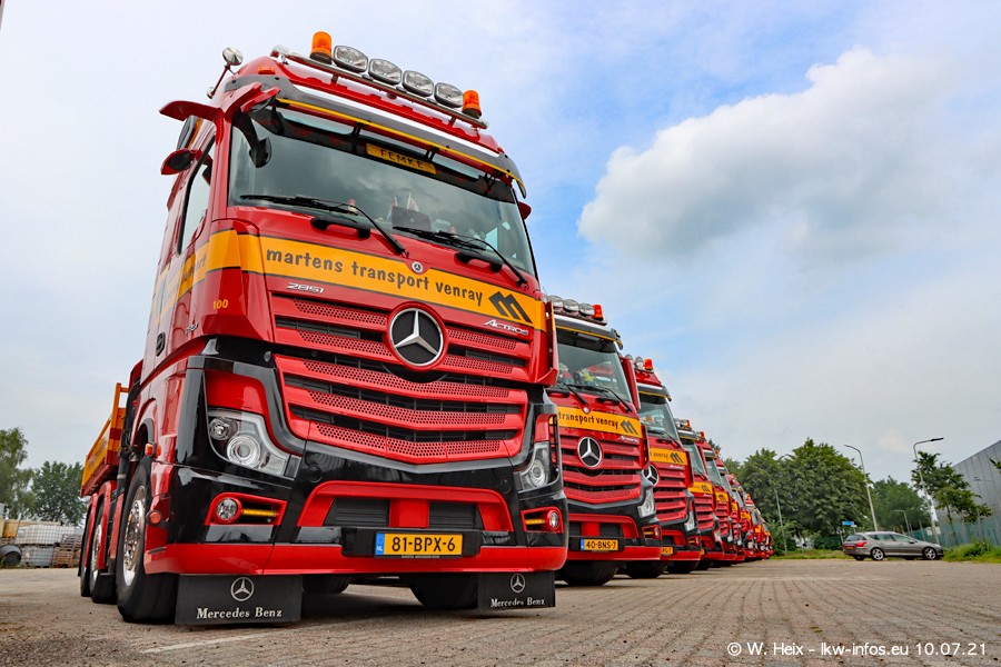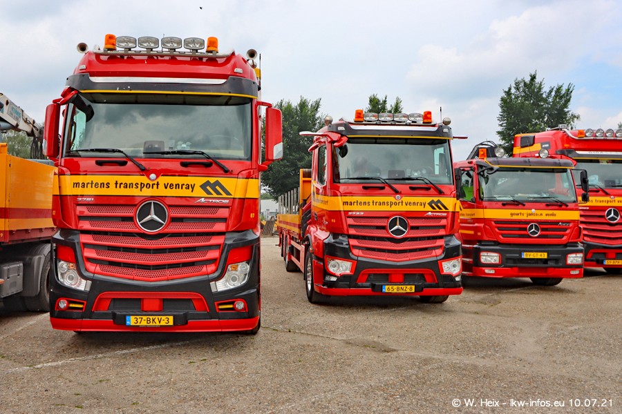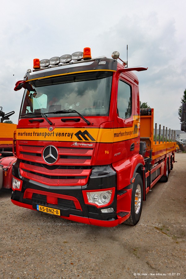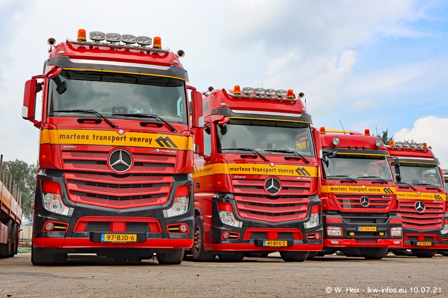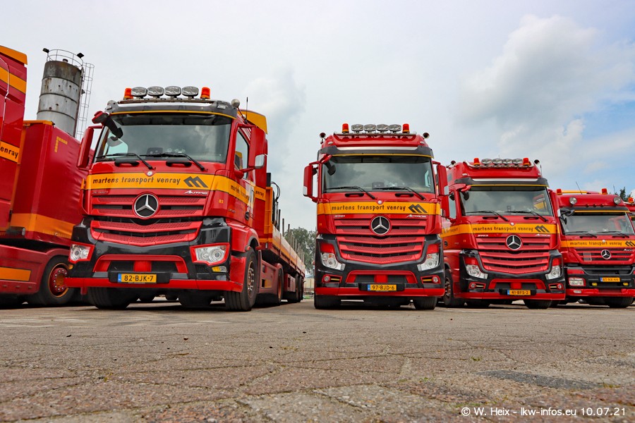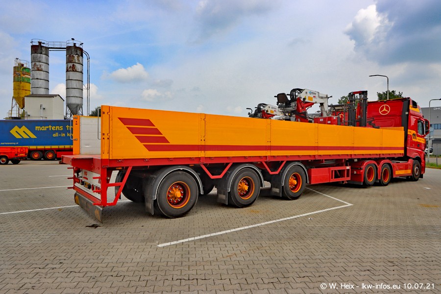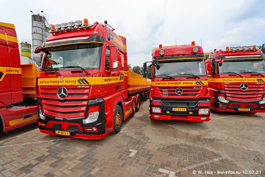 Nach dem winterlichen Besuch im Februar war ich diesmal bei schönem warmen Sommerwetter bei Martens Transport. Bis auf zwei LKW (einer unterwegs, einer in der Werkstatt) war alles zuhause. Neu ist ein weiterer Mercedes-Benz New Actros 4 (MP5) mit dem Kennezichen 49-BPR-7. Dieser kam kurz nach meinem Besuch im Februar. Das Fahrzeug wurde mit 2.000 gefahrenen Kilometern "gebraucht" gekauft und umlackiert. Der Actros, der im Januar neu war (81-BPX-6) hat nun eine kleine Pritsche erhalten und kann statt als LZV auch als Kran-LKW für kleinere Arbeiten eingesetzt werden. Dieser Umbau ist am Tag des Besuchs fertig geworden. Ansonsten ist alles bekannt, neue Fahrzeuge sind schon wieder bestellt .....