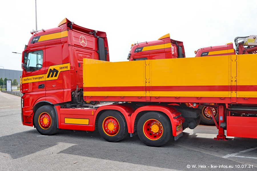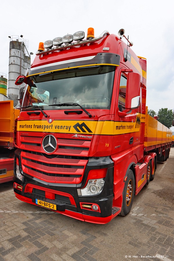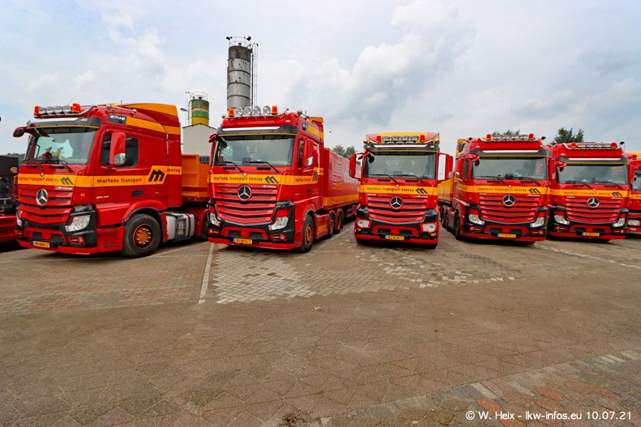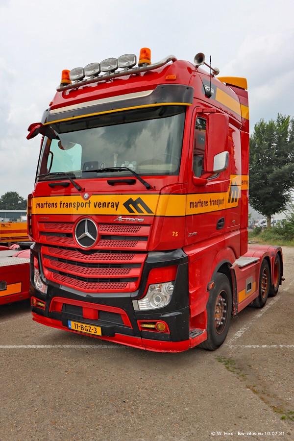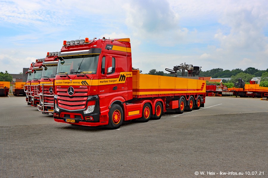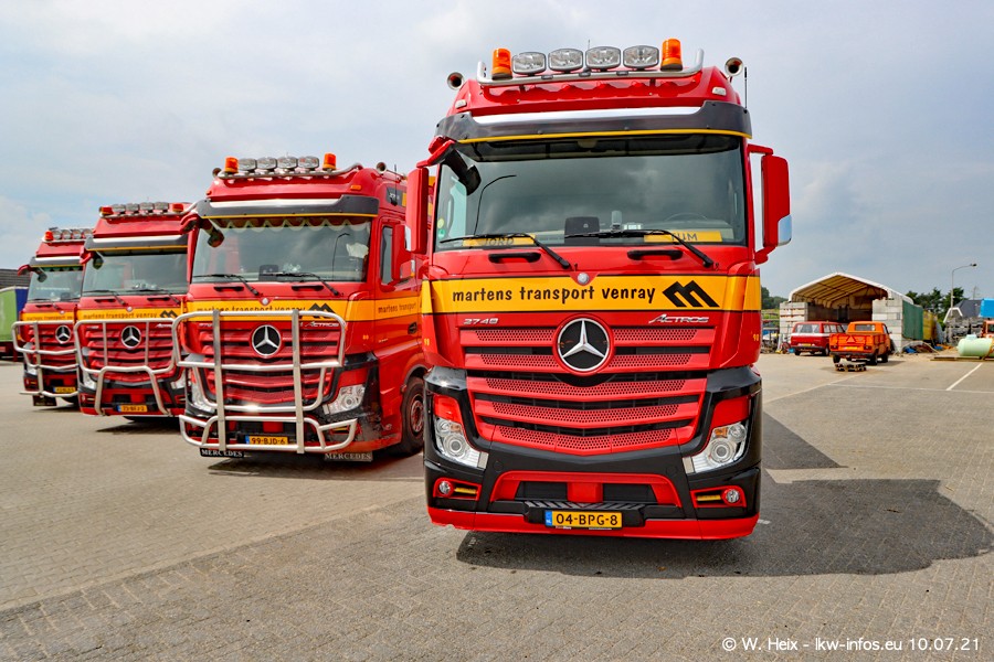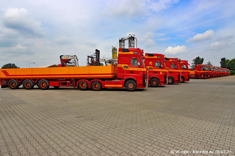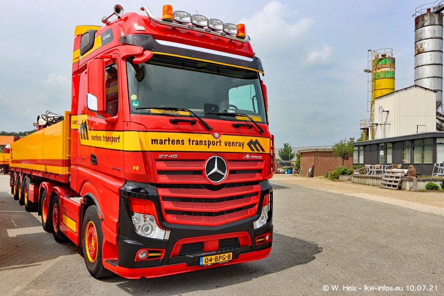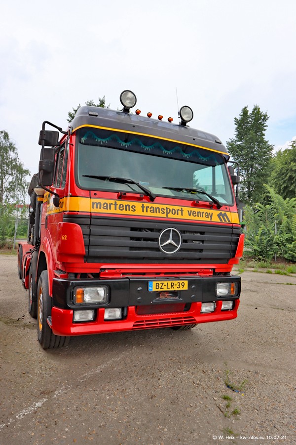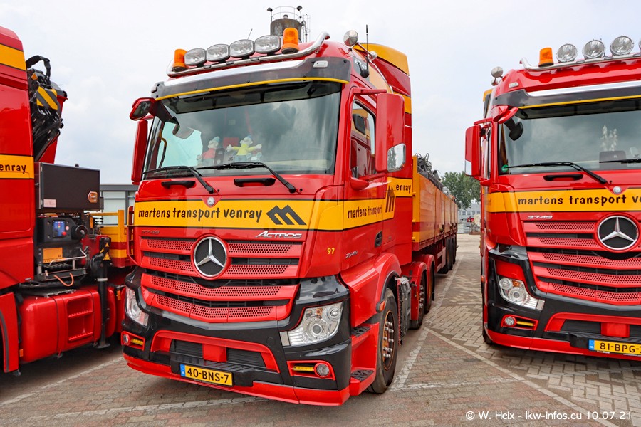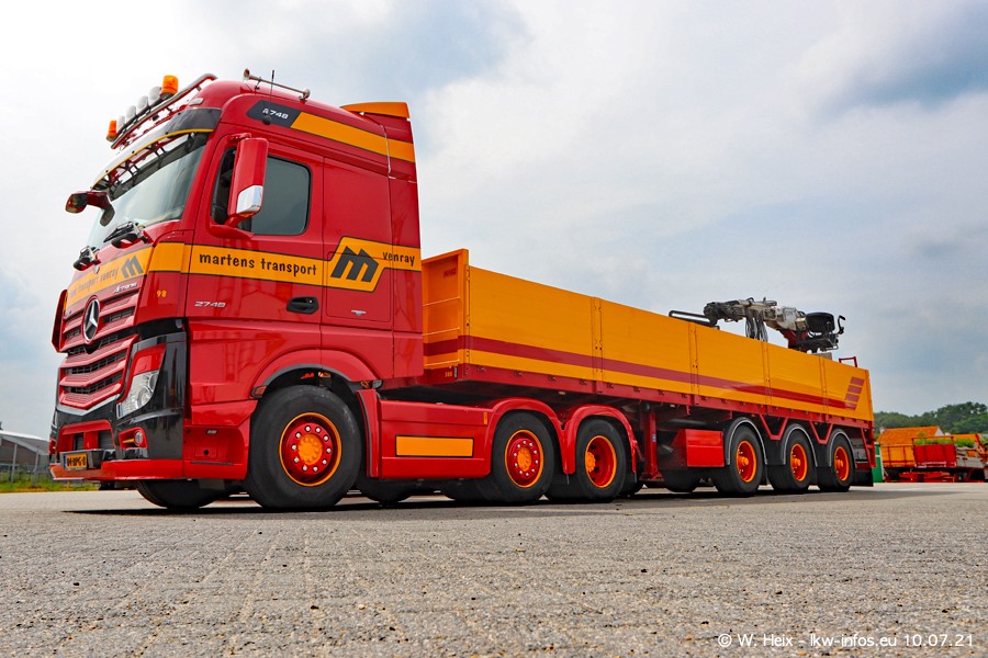Nach dem winterlichen Besuch im Februar war ich diesmal bei schönem warmen Sommerwetter bei Martens Transport. Bis auf zwei LKW (einer unterwegs, einer in der Werkstatt) war alles zuhause. Neu ist ein weiterer Mercedes-Benz New Actros 4 (MP5) mit dem Kennezichen 49-BPR-7. Dieser kam kurz nach meinem Besuch im Februar. Das Fahrzeug wurde mit 2.000 gefahrenen Kilometern "gebraucht" gekauft und umlackiert. Der Actros, der im Januar neu war (81-BPX-6) hat nun eine kleine Pritsche erhalten und kann statt als LZV auch als Kran-LKW für kleinere Arbeiten eingesetzt werden. Dieser Umbau ist am Tag des Besuchs fertig geworden. Ansonsten ist alles bekannt, neue Fahrzeuge sind schon wieder bestellt .....