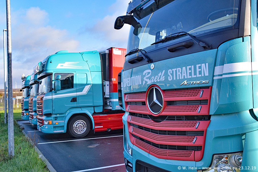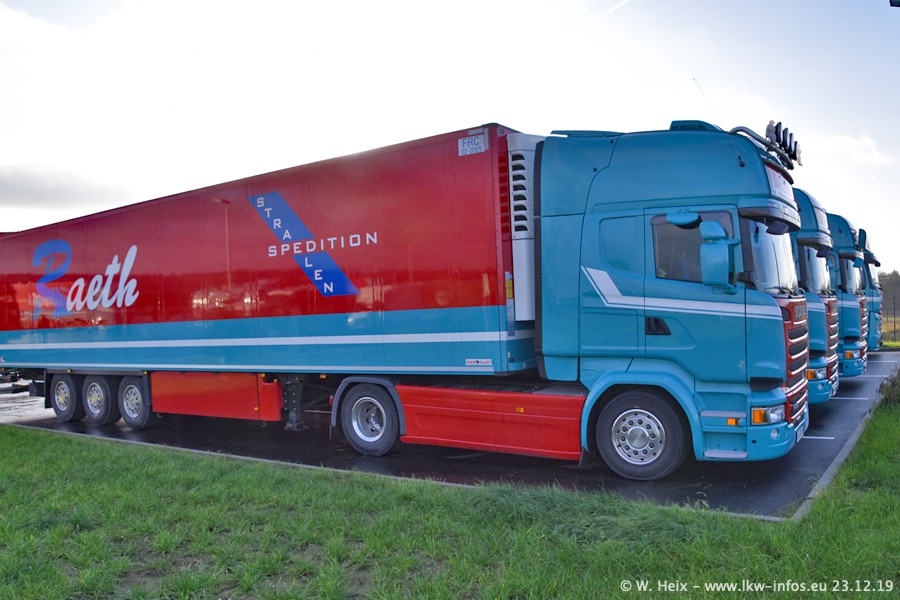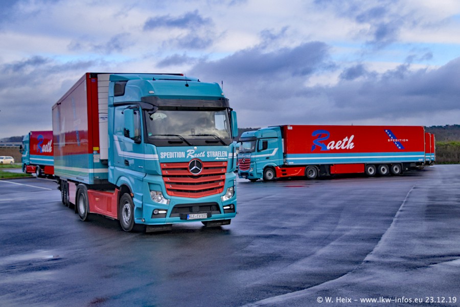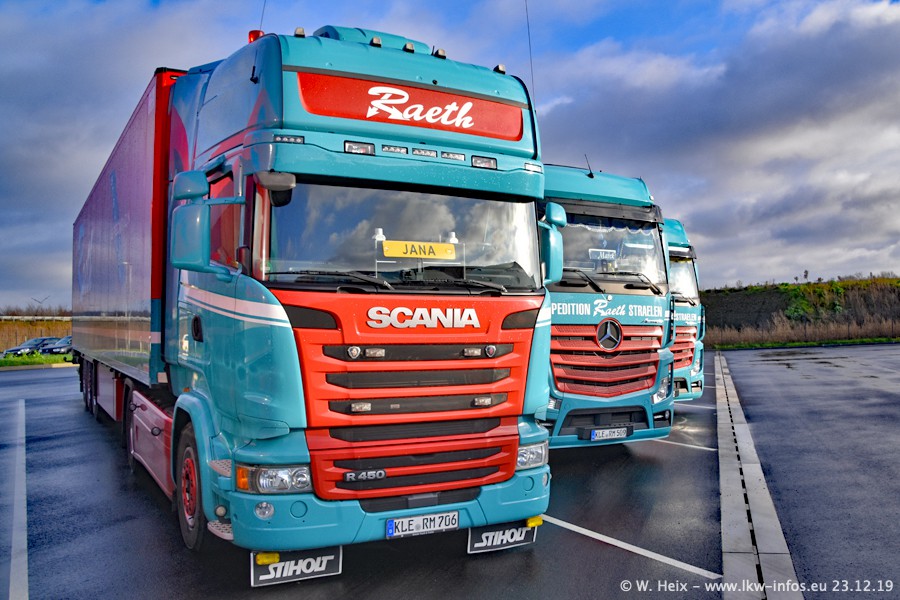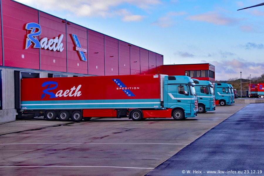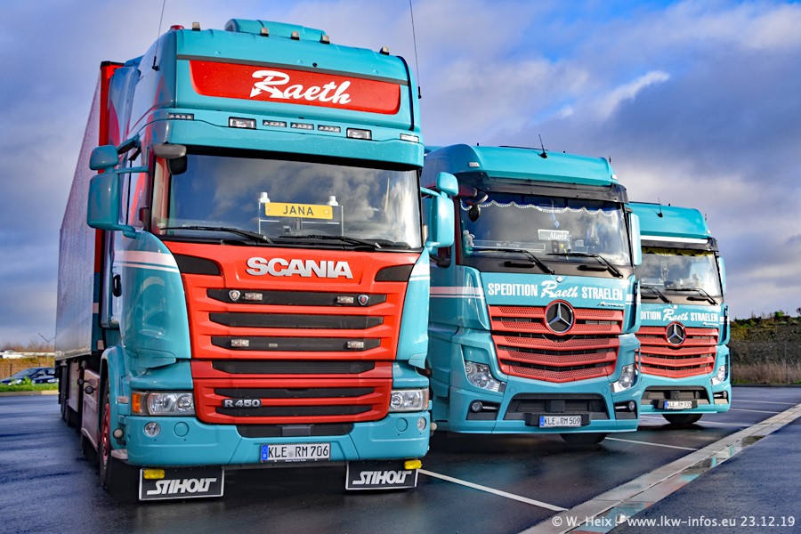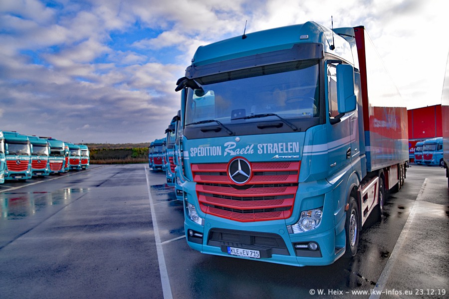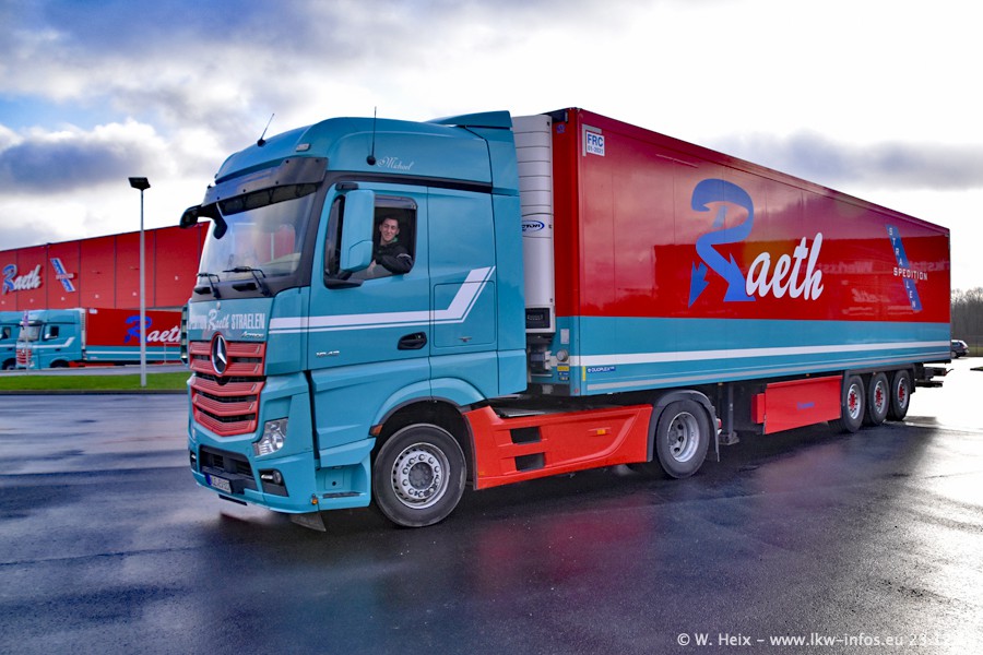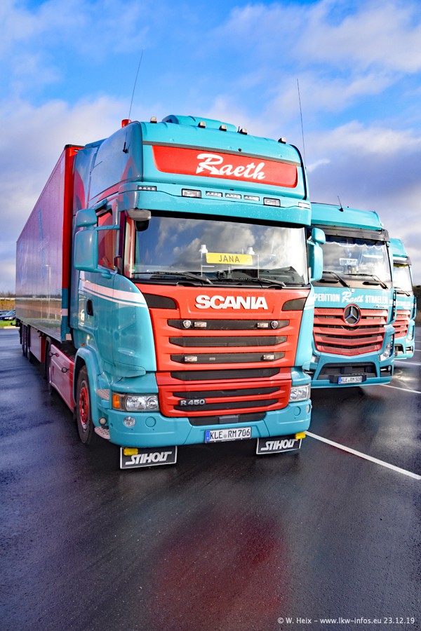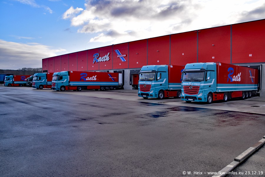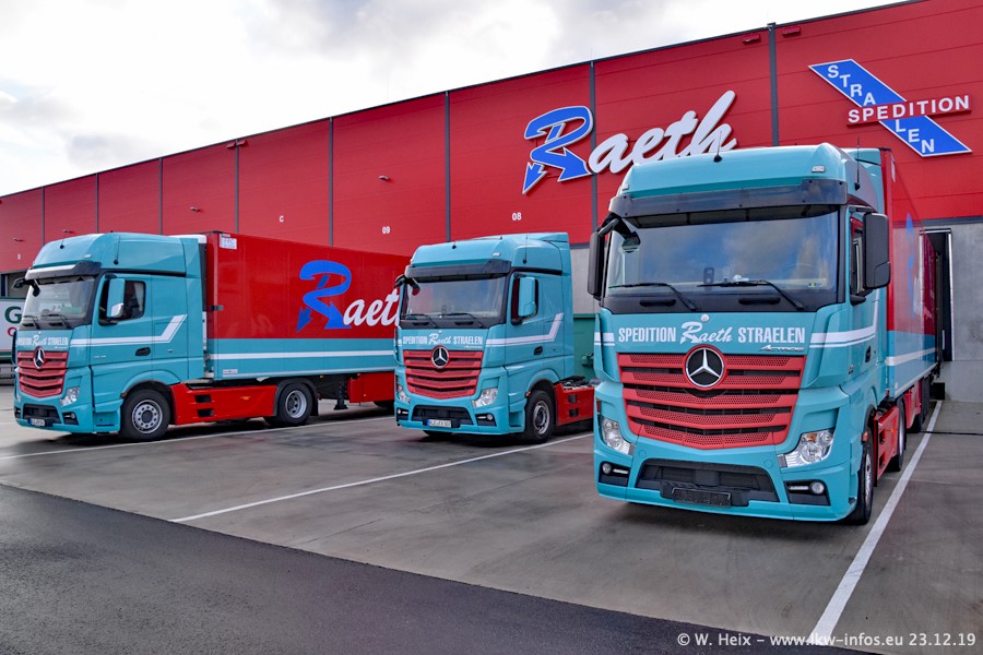 In diesem Jahr istr der Weihnachtsbesuch zugleich der erste Besuch auf dem neuen Firmengelände. Im Juli ist Raeth vom alten, viel zu klein gewordenen Gelände in Straelen, umgezogen nach Straelen-Herongen. Das neue Frimengelände liegt jetzt direkt an der A40 an der Abfahrt Herongen. Auf dem weitläufigen Gelände wurde ein kompletter Neubau mit Lagerhalle, Bürokomplex, Werkstatt und Waschstraße gebaut. Es gibt Platz für rund 40 LKW. Der Fuhrpark besteht aktuell aus rund 80 LKW. Viele Fahrzeuge stehen an den Wochenenden bei den Fahrern zuhause. Die "klassische Weihnachtsaufstellung " der LKW gibt es nicht. Aber gibt mir die Gelegenheit, viele Fahrzeuge einzeln zu fotografieren. Daher ist dieser Besuch mit 375 Fotos auch der größte bisher. Vielen Dank an Florian Brimmers für den freundlichen Empfang und für die Infos über die Firma.