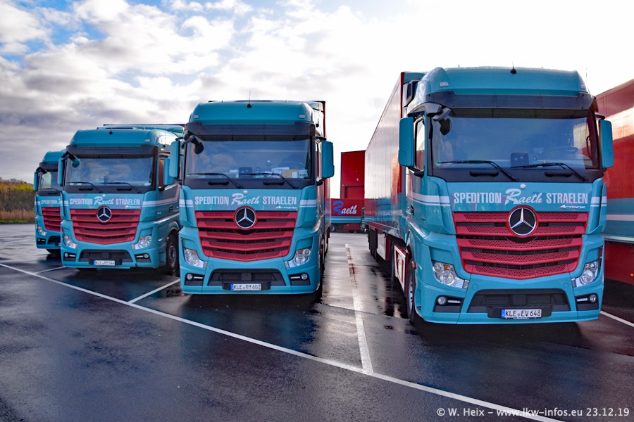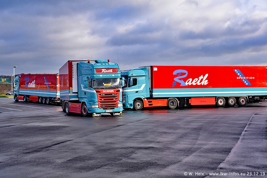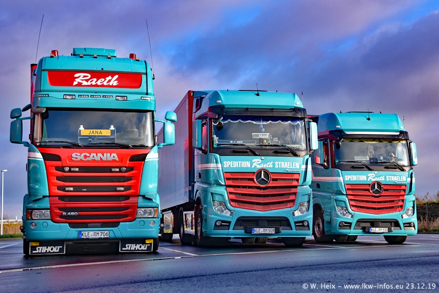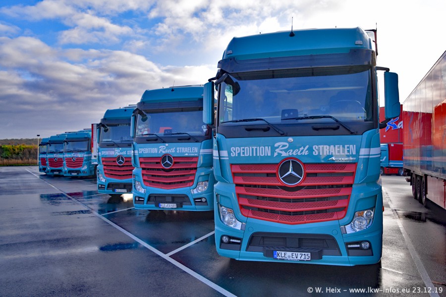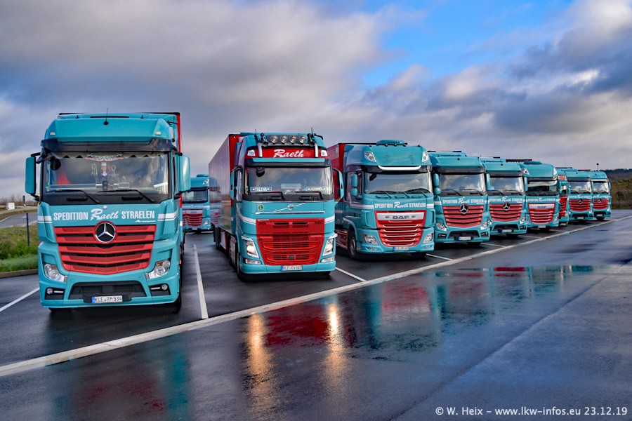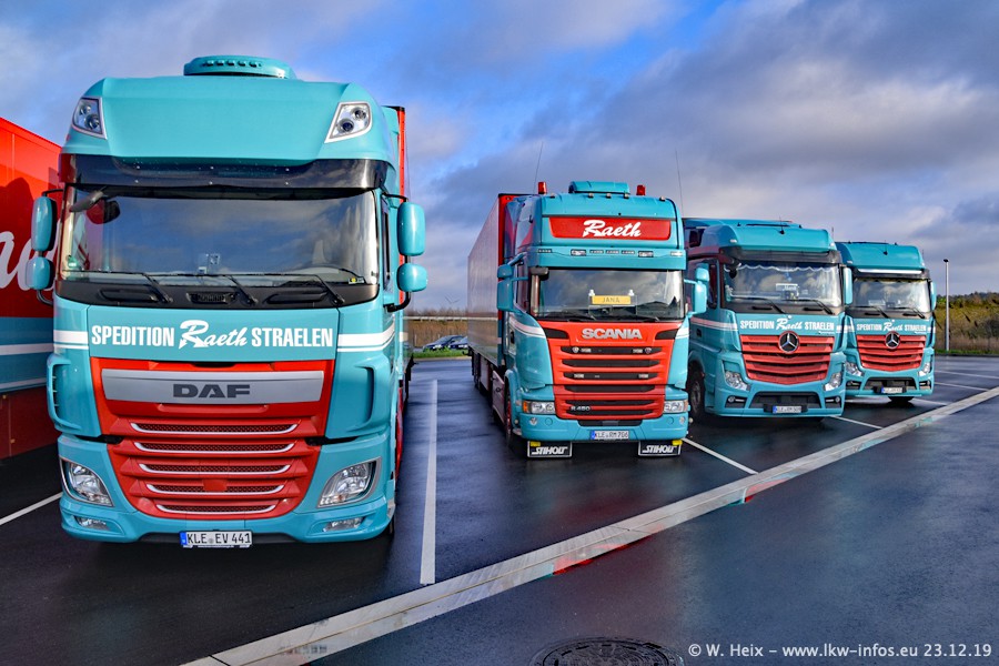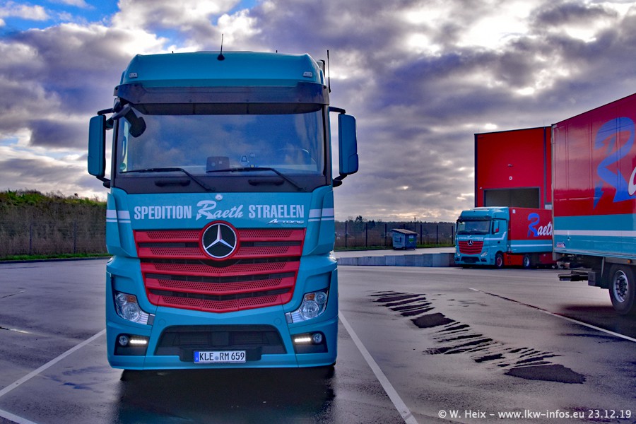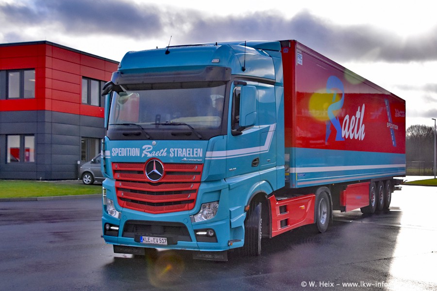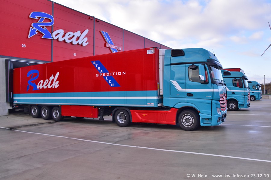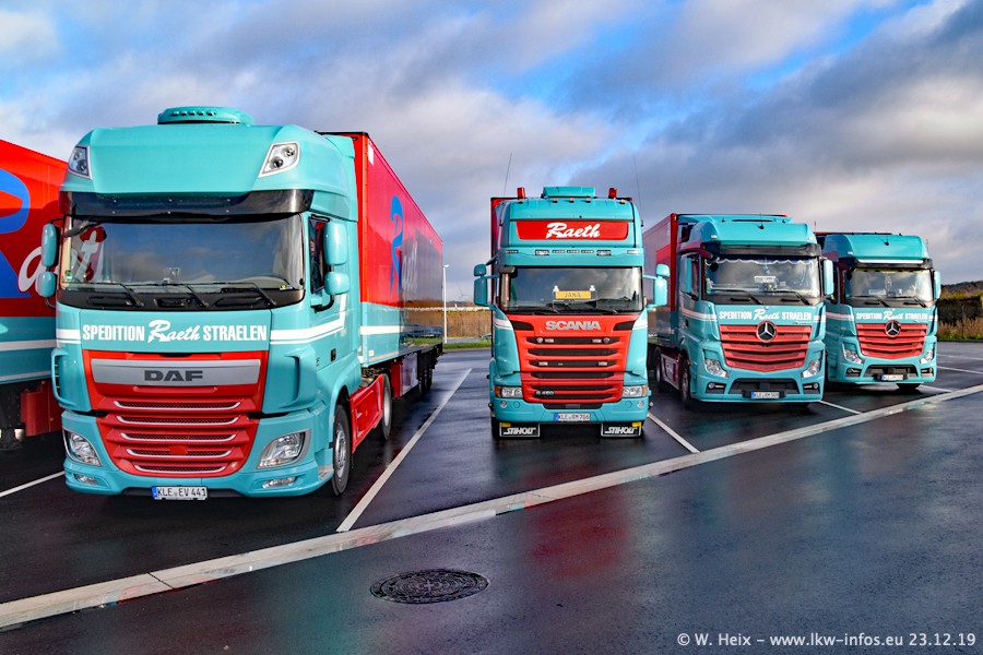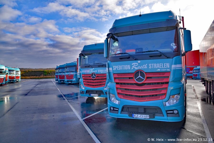 In diesem Jahr istr der Weihnachtsbesuch zugleich der erste Besuch auf dem neuen Firmengelände. Im Juli ist Raeth vom alten, viel zu klein gewordenen Gelände in Straelen, umgezogen nach Straelen-Herongen. Das neue Frimengelände liegt jetzt direkt an der A40 an der Abfahrt Herongen. Auf dem weitläufigen Gelände wurde ein kompletter Neubau mit Lagerhalle, Bürokomplex, Werkstatt und Waschstraße gebaut. Es gibt Platz für rund 40 LKW. Der Fuhrpark besteht aktuell aus rund 80 LKW. Viele Fahrzeuge stehen an den Wochenenden bei den Fahrern zuhause. Die "klassische Weihnachtsaufstellung " der LKW gibt es nicht. Aber gibt mir die Gelegenheit, viele Fahrzeuge einzeln zu fotografieren. Daher ist dieser Besuch mit 375 Fotos auch der größte bisher. Vielen Dank an Florian Brimmers für den freundlichen Empfang und für die Infos über die Firma.
