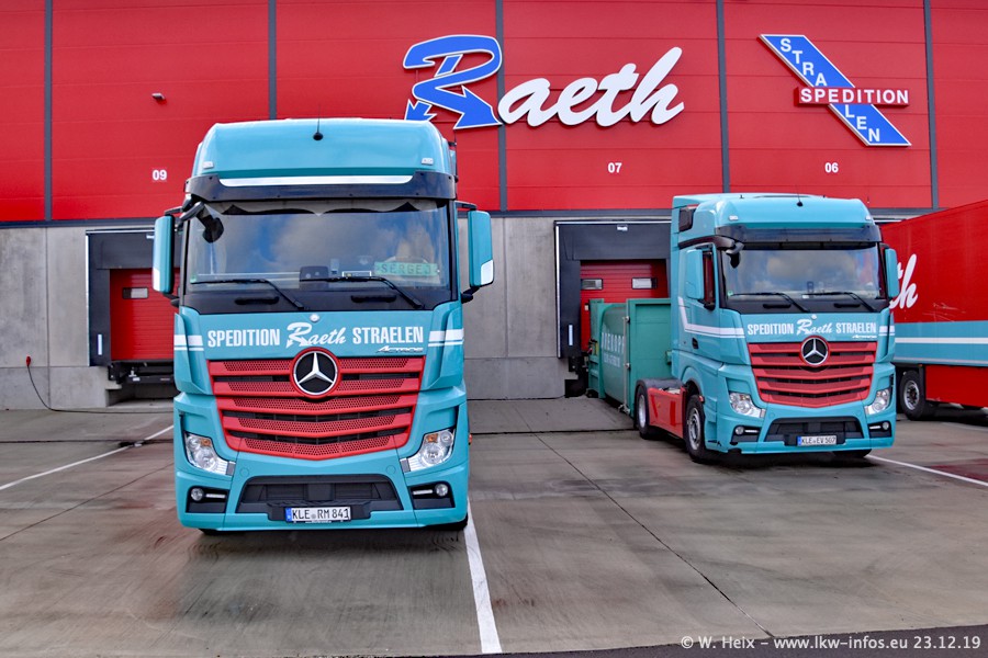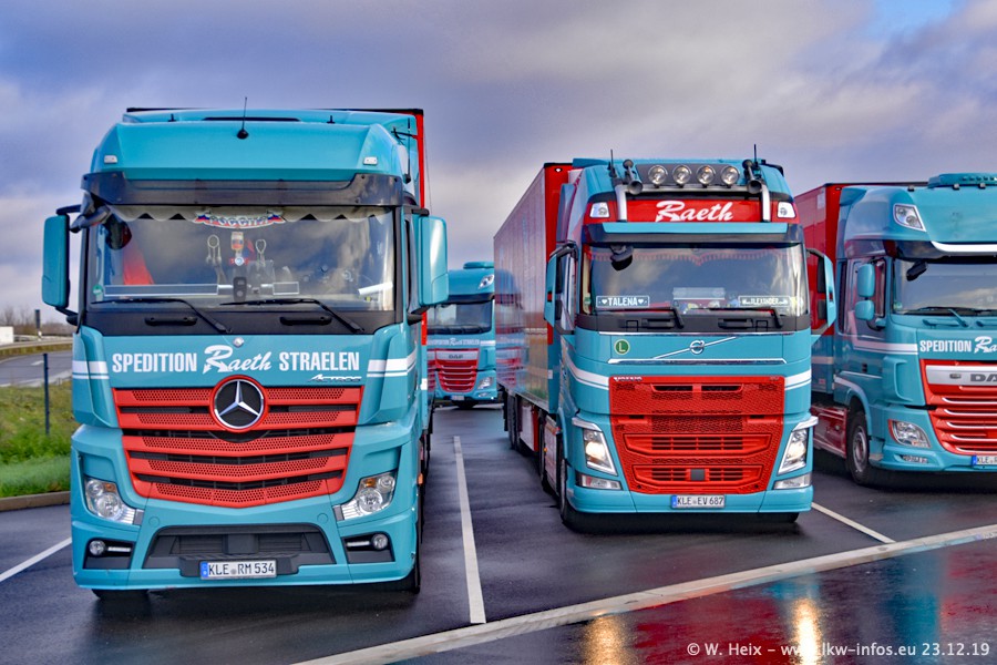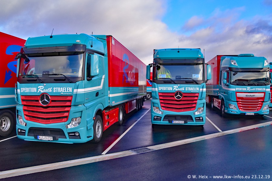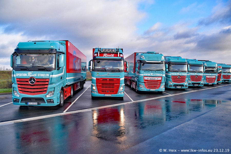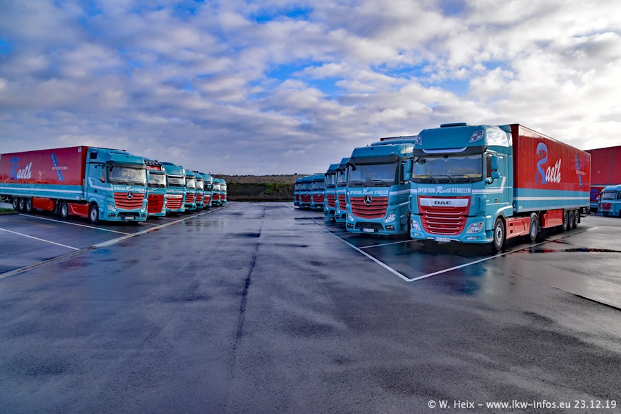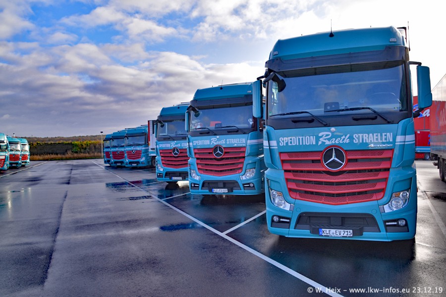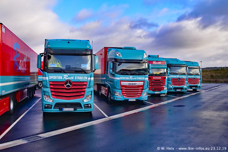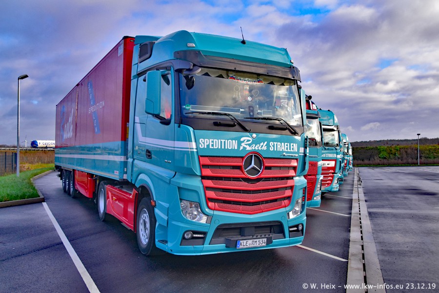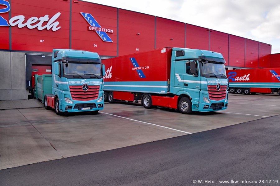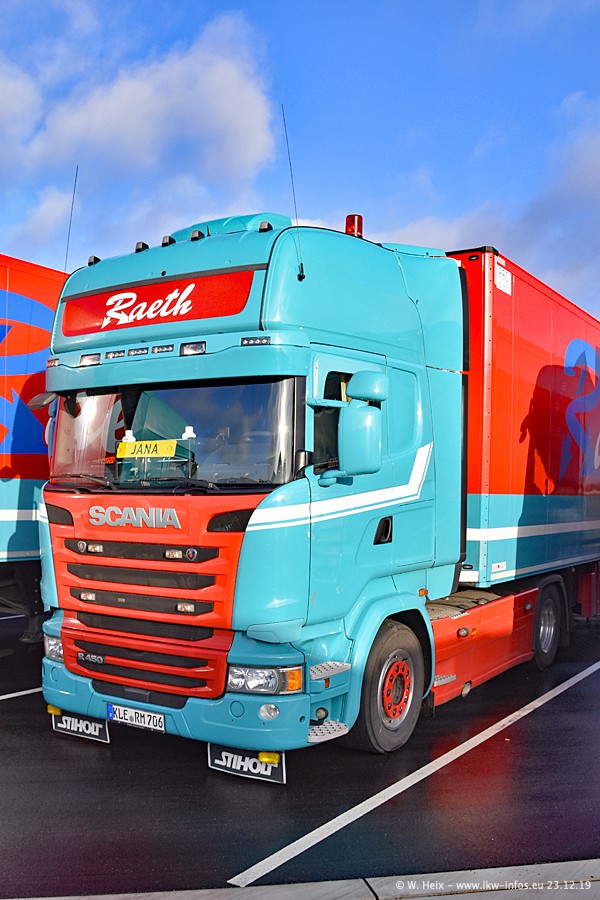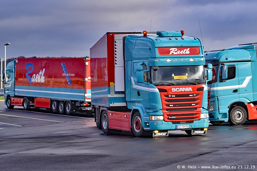 In diesem Jahr istr der Weihnachtsbesuch zugleich der erste Besuch auf dem neuen Firmengelände. Im Juli ist Raeth vom alten, viel zu klein gewordenen Gelände in Straelen, umgezogen nach Straelen-Herongen. Das neue Frimengelände liegt jetzt direkt an der A40 an der Abfahrt Herongen. Auf dem weitläufigen Gelände wurde ein kompletter Neubau mit Lagerhalle, Bürokomplex, Werkstatt und Waschstraße gebaut. Es gibt Platz für rund 40 LKW. Der Fuhrpark besteht aktuell aus rund 80 LKW. Viele Fahrzeuge stehen an den Wochenenden bei den Fahrern zuhause. Die "klassische Weihnachtsaufstellung " der LKW gibt es nicht. Aber gibt mir die Gelegenheit, viele Fahrzeuge einzeln zu fotografieren. Daher ist dieser Besuch mit 375 Fotos auch der größte bisher. Vielen Dank an Florian Brimmers für den freundlichen Empfang und für die Infos über die Firma.