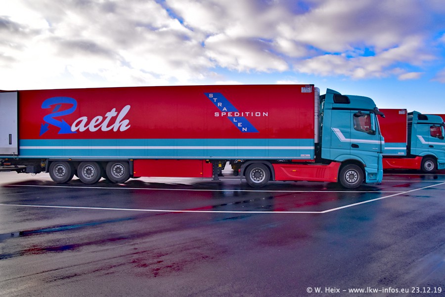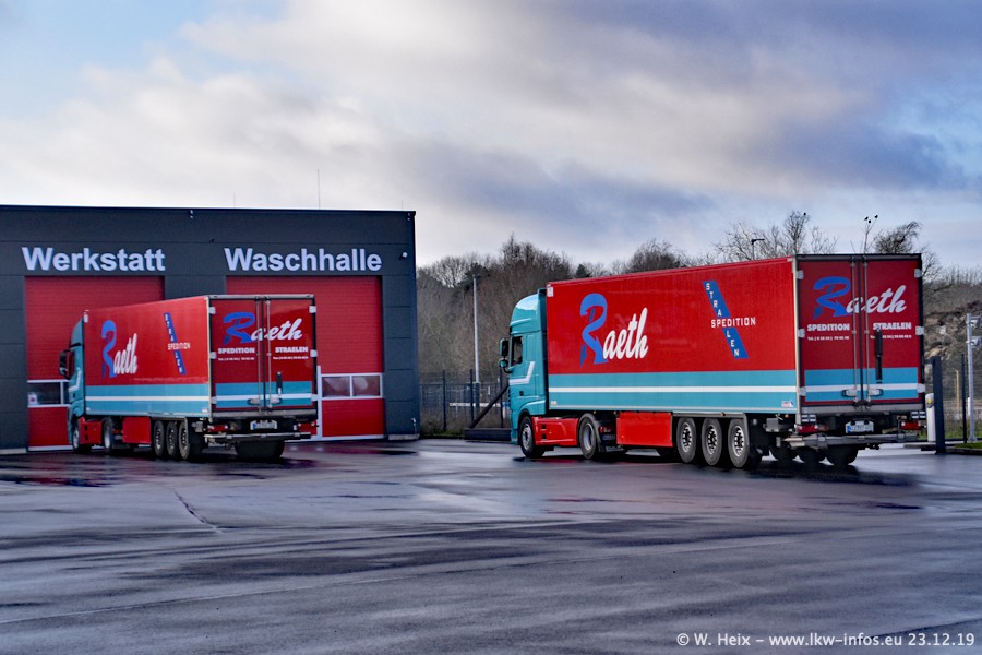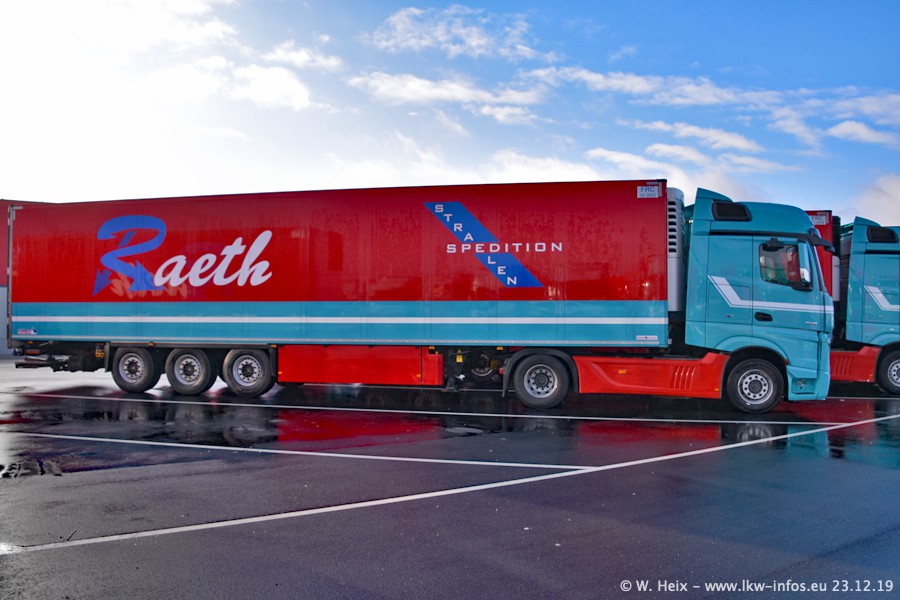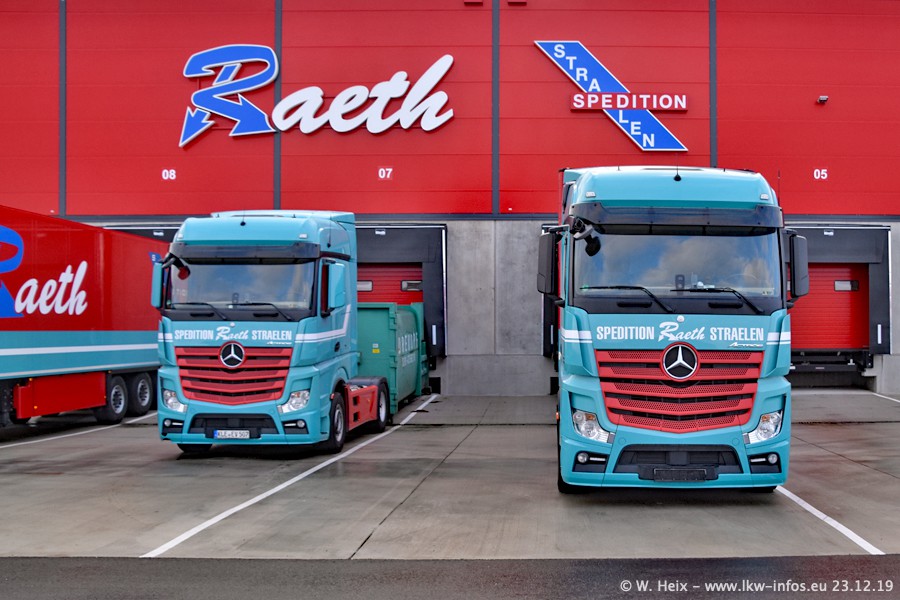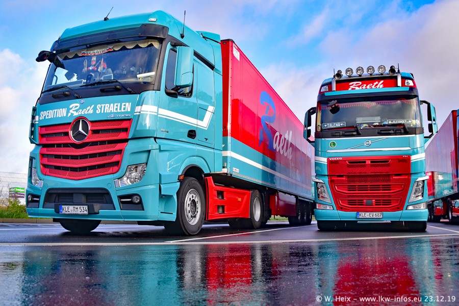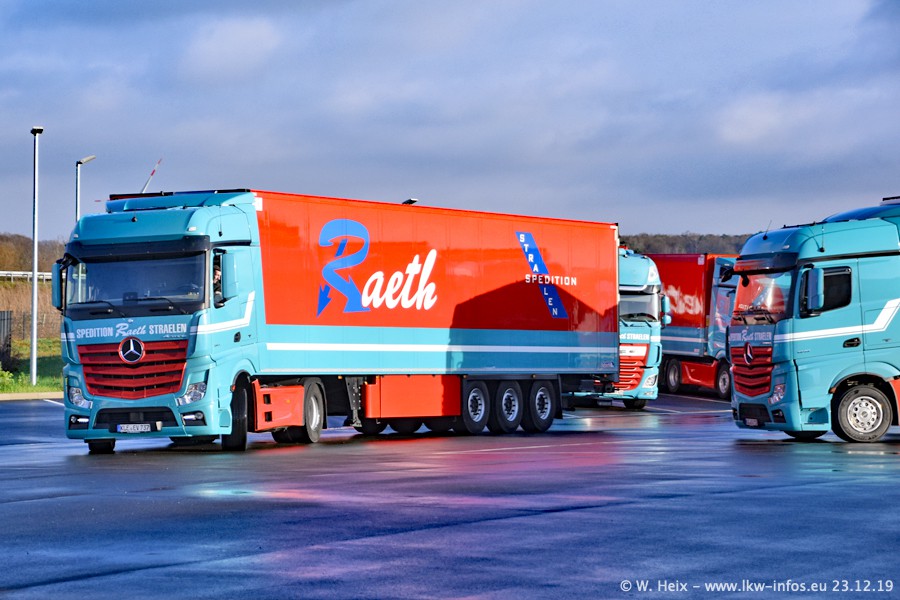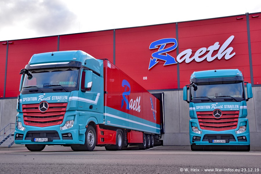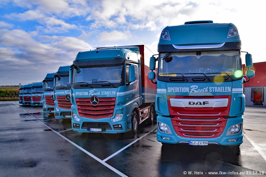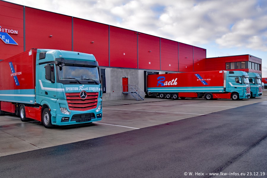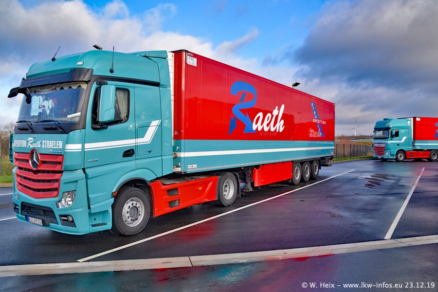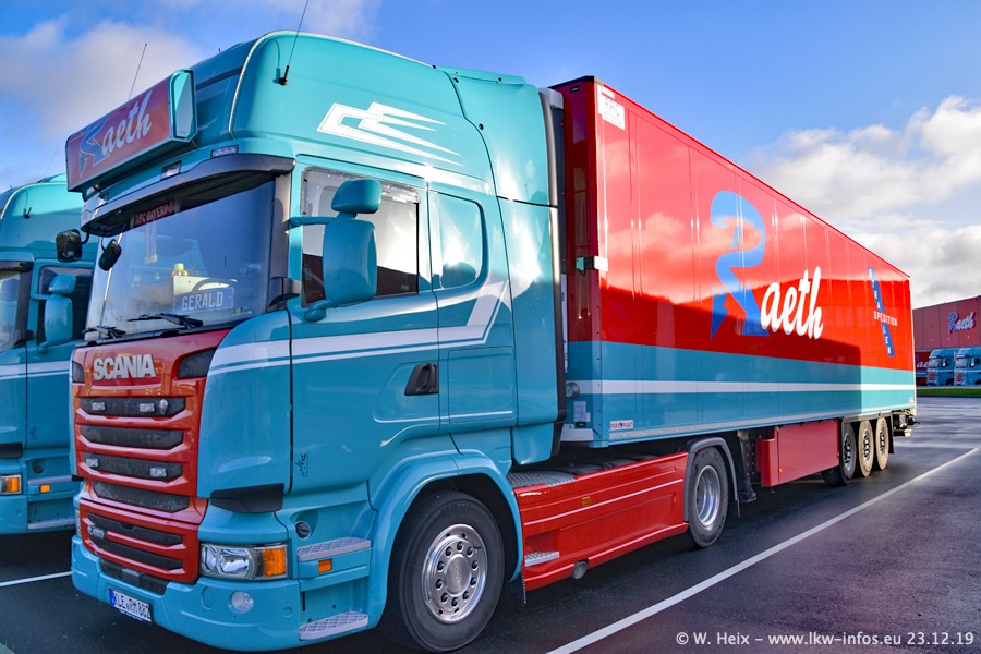 In diesem Jahr istr der Weihnachtsbesuch zugleich der erste Besuch auf dem neuen Firmengelände. Im Juli ist Raeth vom alten, viel zu klein gewordenen Gelände in Straelen, umgezogen nach Straelen-Herongen. Das neue Frimengelände liegt jetzt direkt an der A40 an der Abfahrt Herongen. Auf dem weitläufigen Gelände wurde ein kompletter Neubau mit Lagerhalle, Bürokomplex, Werkstatt und Waschstraße gebaut. Es gibt Platz für rund 40 LKW. Der Fuhrpark besteht aktuell aus rund 80 LKW. Viele Fahrzeuge stehen an den Wochenenden bei den Fahrern zuhause. Die "klassische Weihnachtsaufstellung " der LKW gibt es nicht. Aber gibt mir die Gelegenheit, viele Fahrzeuge einzeln zu fotografieren. Daher ist dieser Besuch mit 375 Fotos auch der größte bisher. Vielen Dank an Florian Brimmers für den freundlichen Empfang und für die Infos über die Firma.