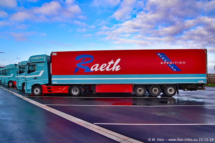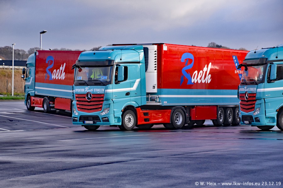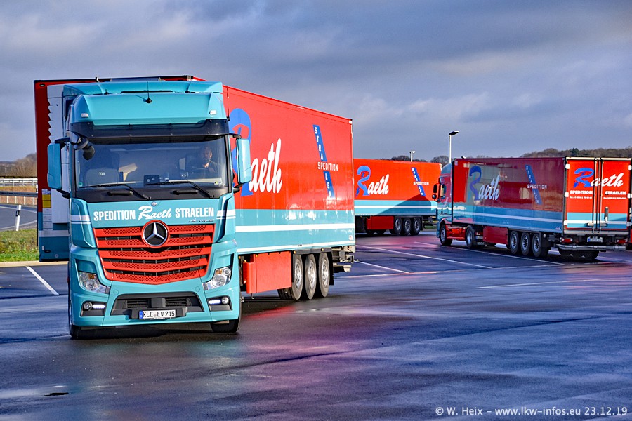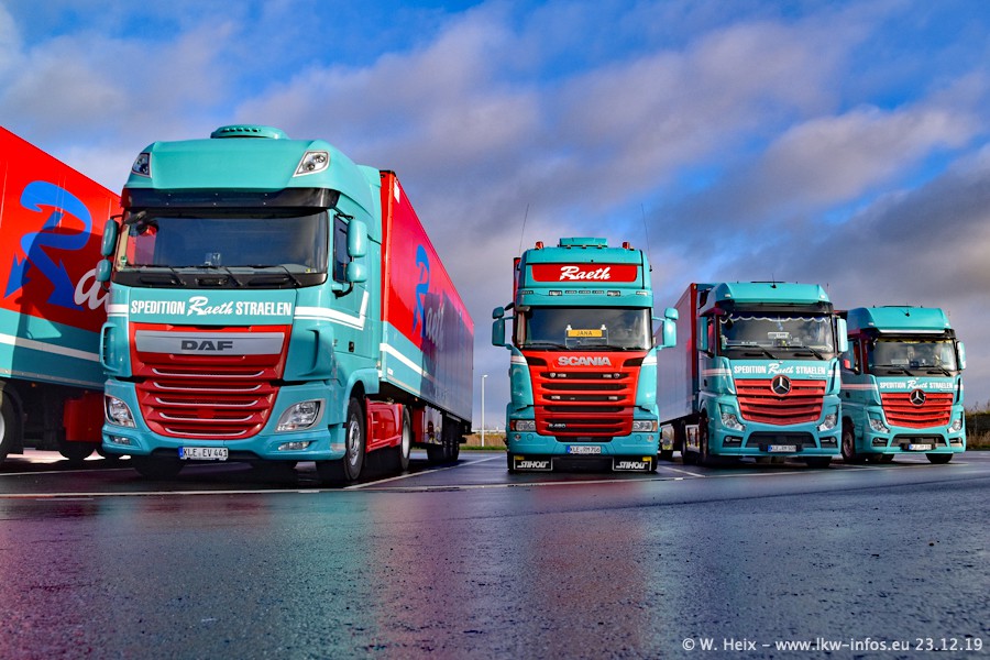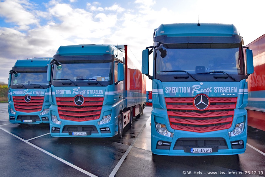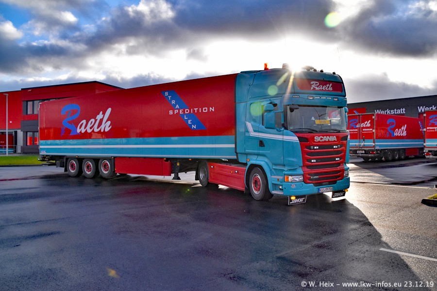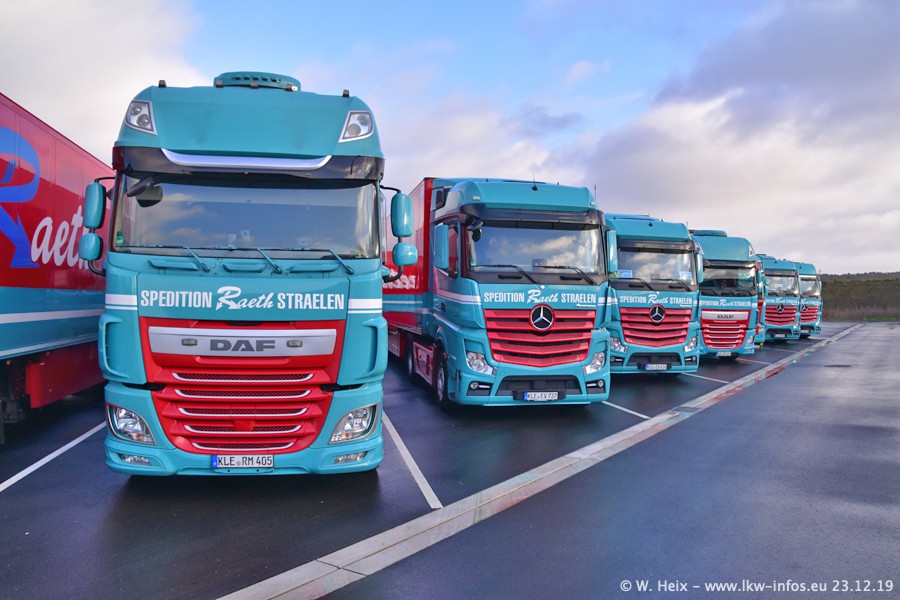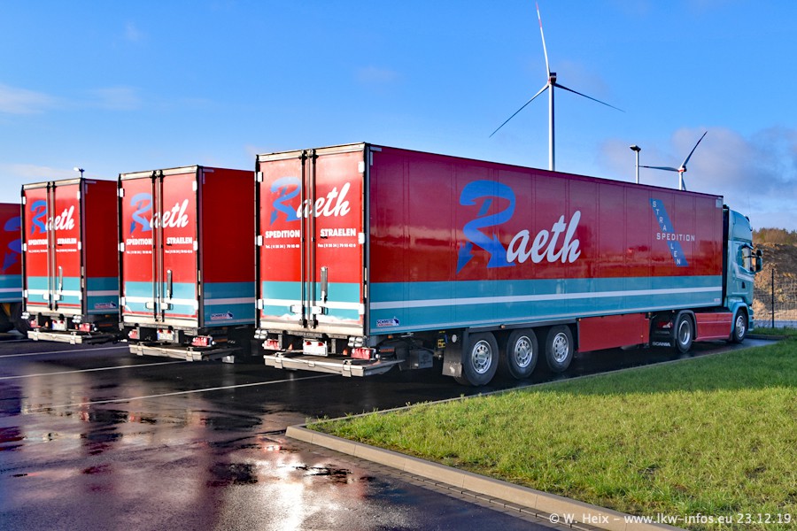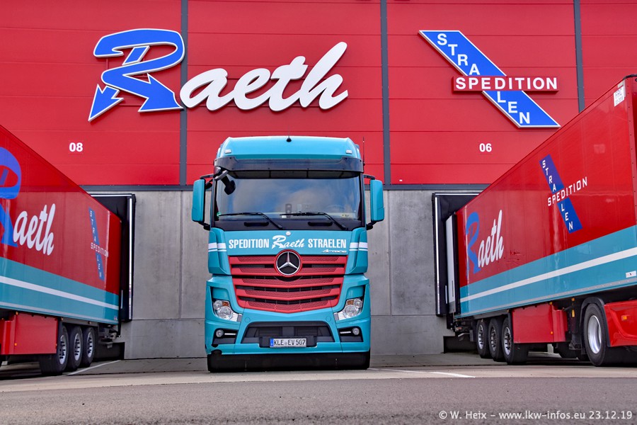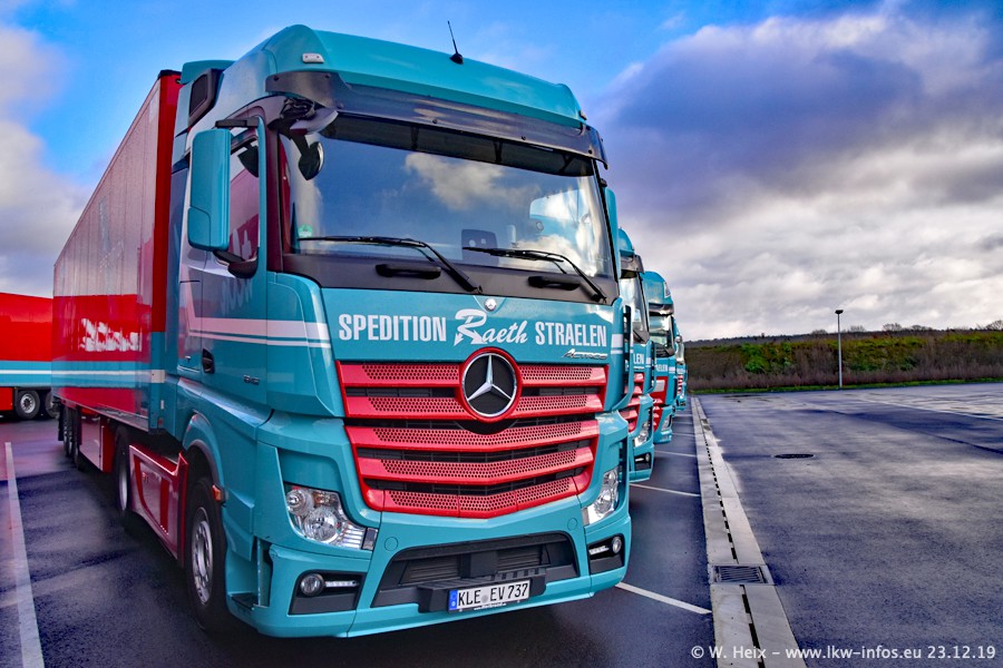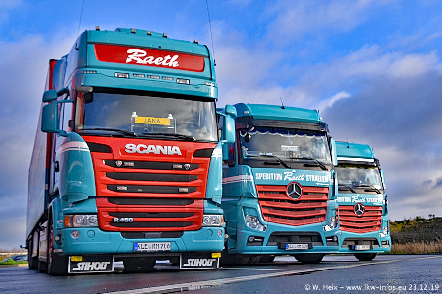 In diesem Jahr istr der Weihnachtsbesuch zugleich der erste Besuch auf dem neuen Firmengelände. Im Juli ist Raeth vom alten, viel zu klein gewordenen Gelände in Straelen, umgezogen nach Straelen-Herongen. Das neue Frimengelände liegt jetzt direkt an der A40 an der Abfahrt Herongen. Auf dem weitläufigen Gelände wurde ein kompletter Neubau mit Lagerhalle, Bürokomplex, Werkstatt und Waschstraße gebaut. Es gibt Platz für rund 40 LKW. Der Fuhrpark besteht aktuell aus rund 80 LKW. Viele Fahrzeuge stehen an den Wochenenden bei den Fahrern zuhause. Die "klassische Weihnachtsaufstellung " der LKW gibt es nicht. Aber gibt mir die Gelegenheit, viele Fahrzeuge einzeln zu fotografieren. Daher ist dieser Besuch mit 375 Fotos auch der größte bisher. Vielen Dank an Florian Brimmers für den freundlichen Empfang und für die Infos über die Firma.