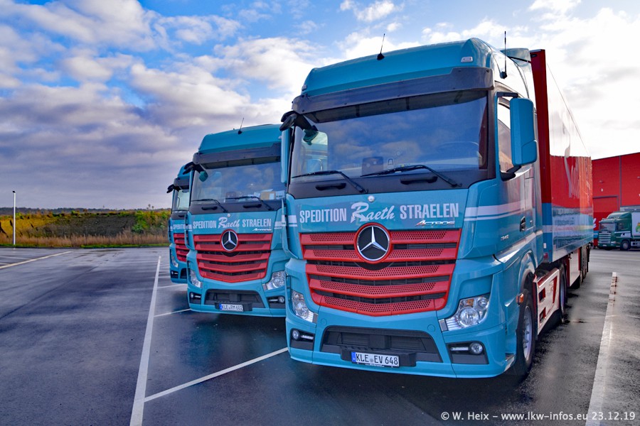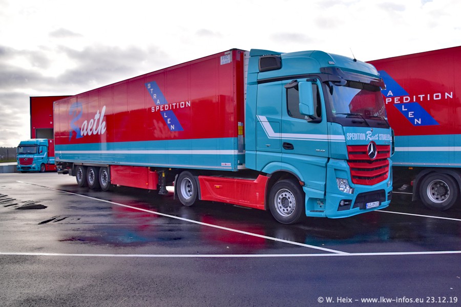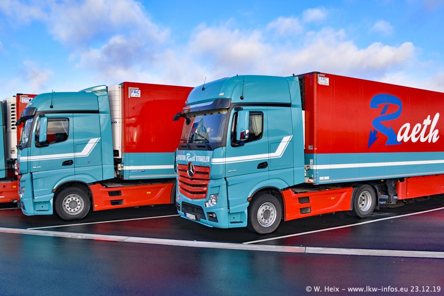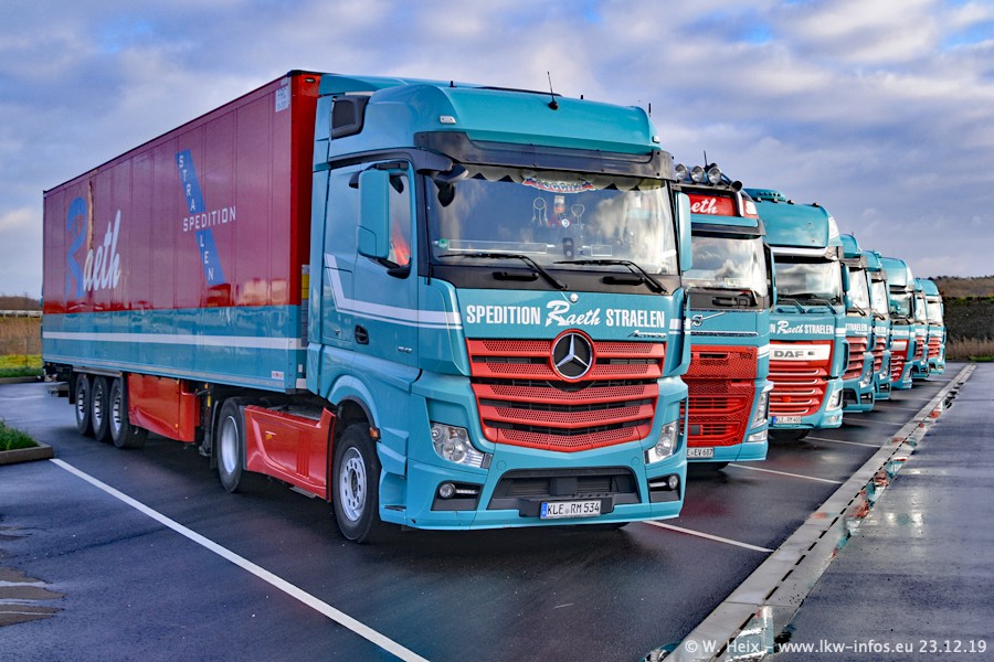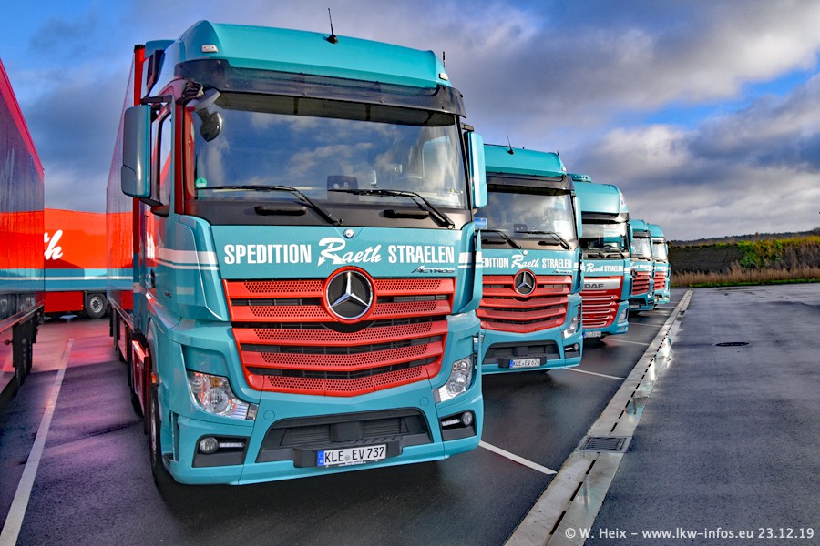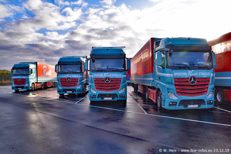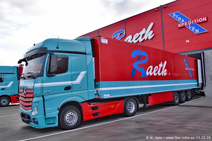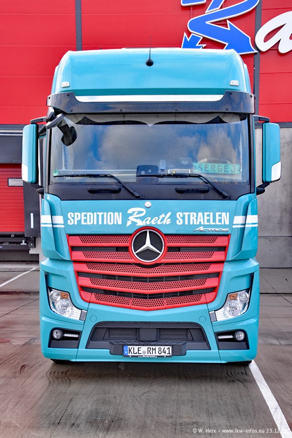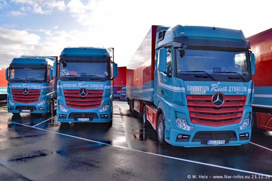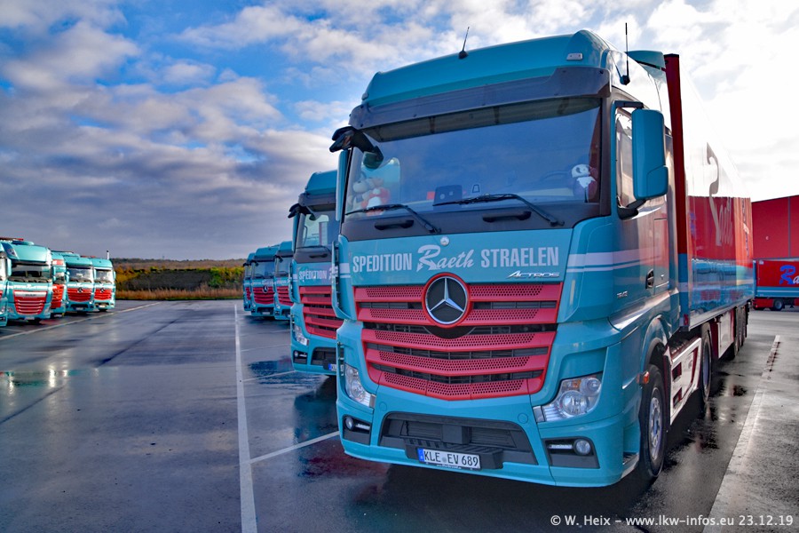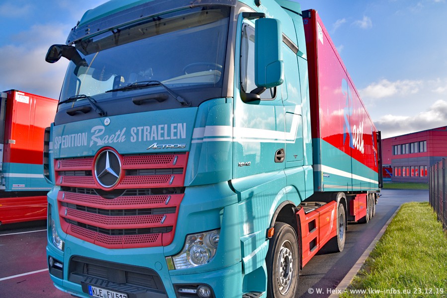In diesem Jahr istr der Weihnachtsbesuch zugleich der erste Besuch auf dem neuen Firmengelände. Im Juli ist Raeth vom alten, viel zu klein gewordenen Gelände in Straelen, umgezogen nach Straelen-Herongen. Das neue Frimengelände liegt jetzt direkt an der A40 an der Abfahrt Herongen. Auf dem weitläufigen Gelände wurde ein kompletter Neubau mit Lagerhalle, Bürokomplex, Werkstatt und Waschstraße gebaut. Es gibt Platz für rund 40 LKW. Der Fuhrpark besteht aktuell aus rund 80 LKW. Viele Fahrzeuge stehen an den Wochenenden bei den Fahrern zuhause. Die "klassische Weihnachtsaufstellung " der LKW gibt es nicht. Aber gibt mir die Gelegenheit, viele Fahrzeuge einzeln zu fotografieren. Daher ist dieser Besuch mit 375 Fotos auch der größte bisher. Vielen Dank an Florian Brimmers für den freundlichen Empfang und für die Infos über die Firma.