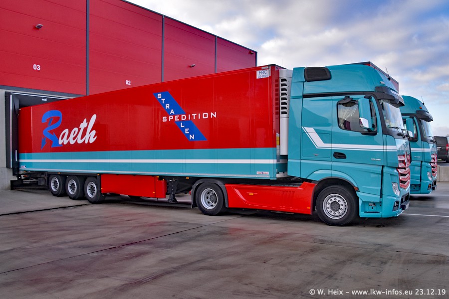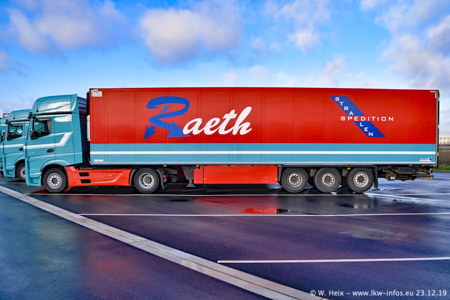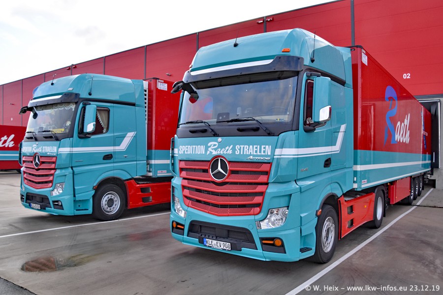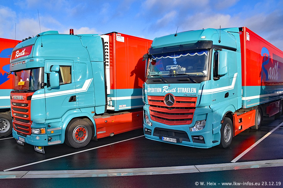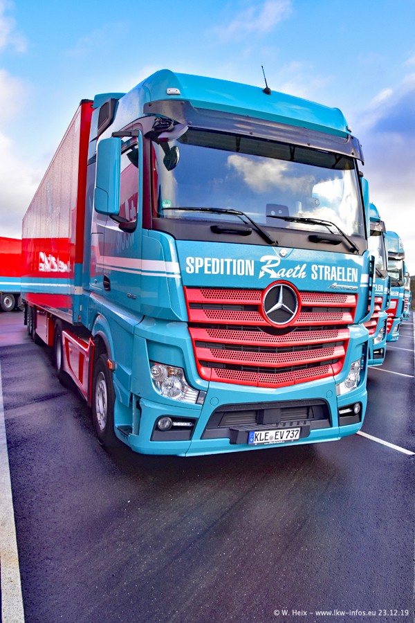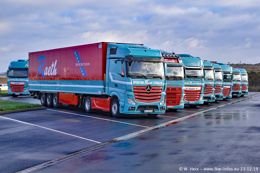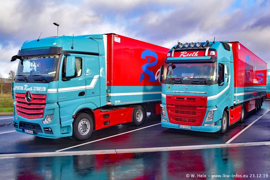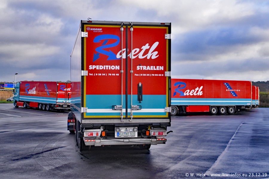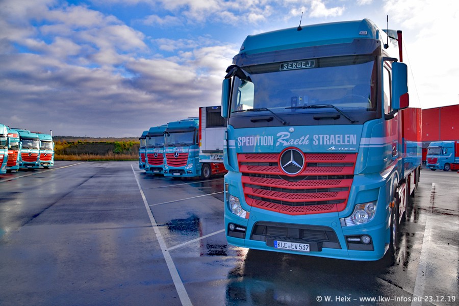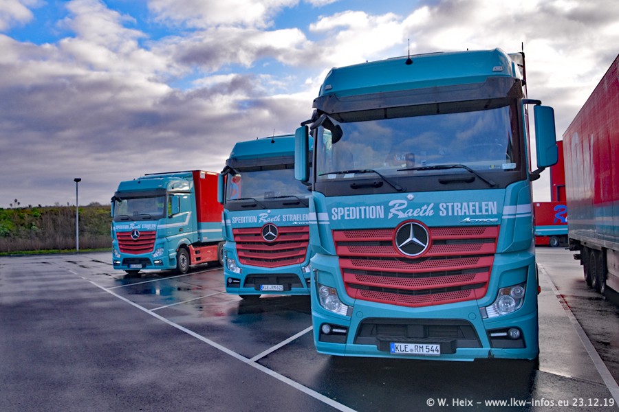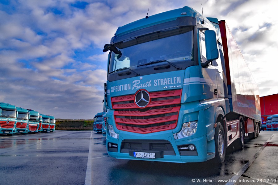 In diesem Jahr istr der Weihnachtsbesuch zugleich der erste Besuch auf dem neuen Firmengelände. Im Juli ist Raeth vom alten, viel zu klein gewordenen Gelände in Straelen, umgezogen nach Straelen-Herongen. Das neue Frimengelände liegt jetzt direkt an der A40 an der Abfahrt Herongen. Auf dem weitläufigen Gelände wurde ein kompletter Neubau mit Lagerhalle, Bürokomplex, Werkstatt und Waschstraße gebaut. Es gibt Platz für rund 40 LKW. Der Fuhrpark besteht aktuell aus rund 80 LKW. Viele Fahrzeuge stehen an den Wochenenden bei den Fahrern zuhause. Die "klassische Weihnachtsaufstellung " der LKW gibt es nicht. Aber gibt mir die Gelegenheit, viele Fahrzeuge einzeln zu fotografieren. Daher ist dieser Besuch mit 375 Fotos auch der größte bisher. Vielen Dank an Florian Brimmers für den freundlichen Empfang und für die Infos über die Firma.