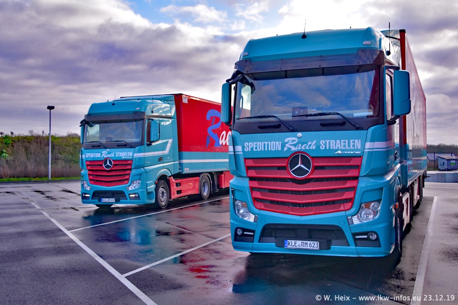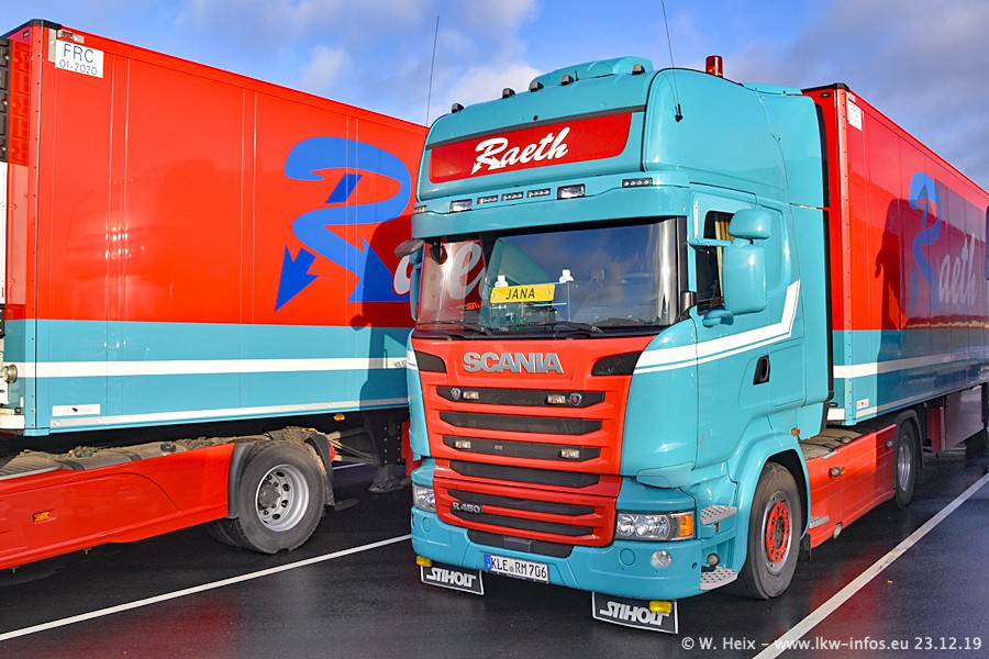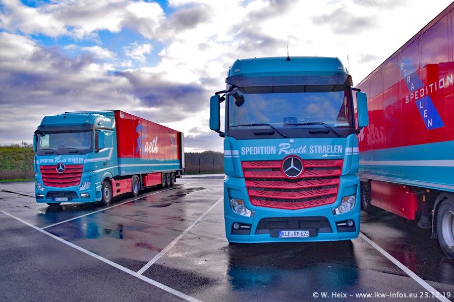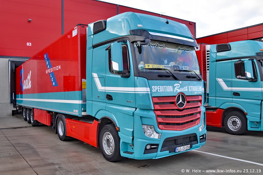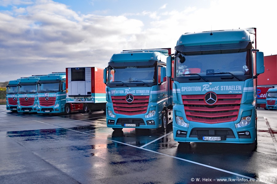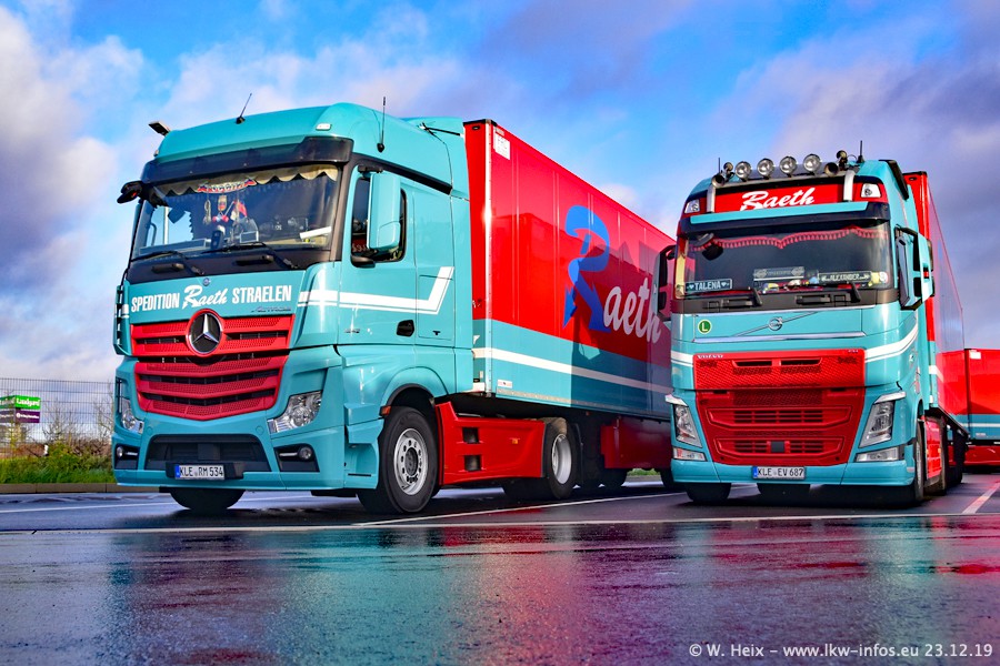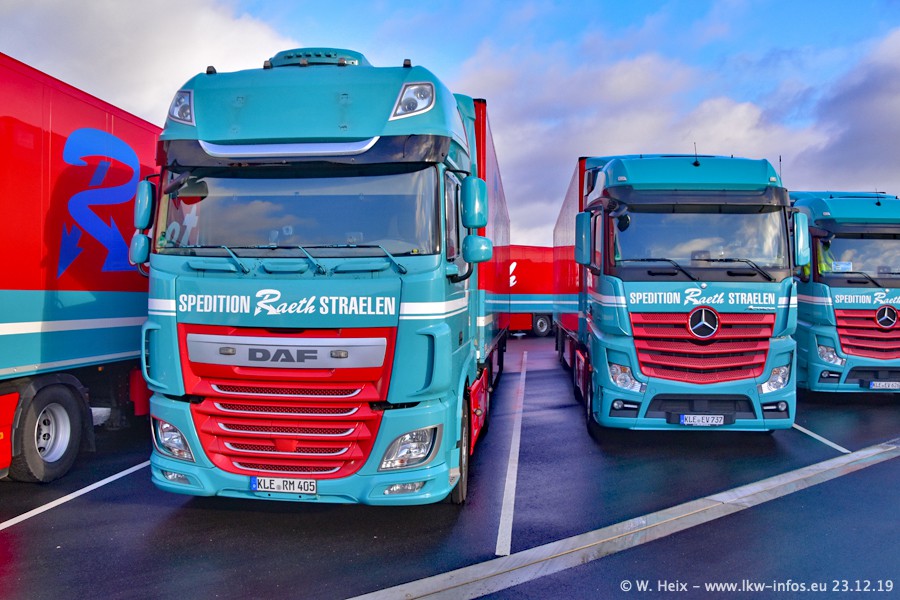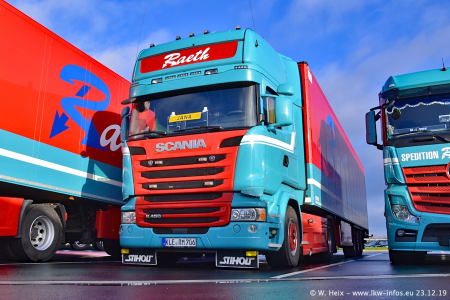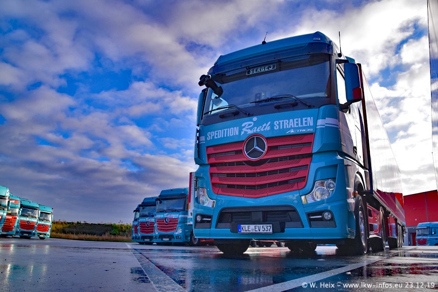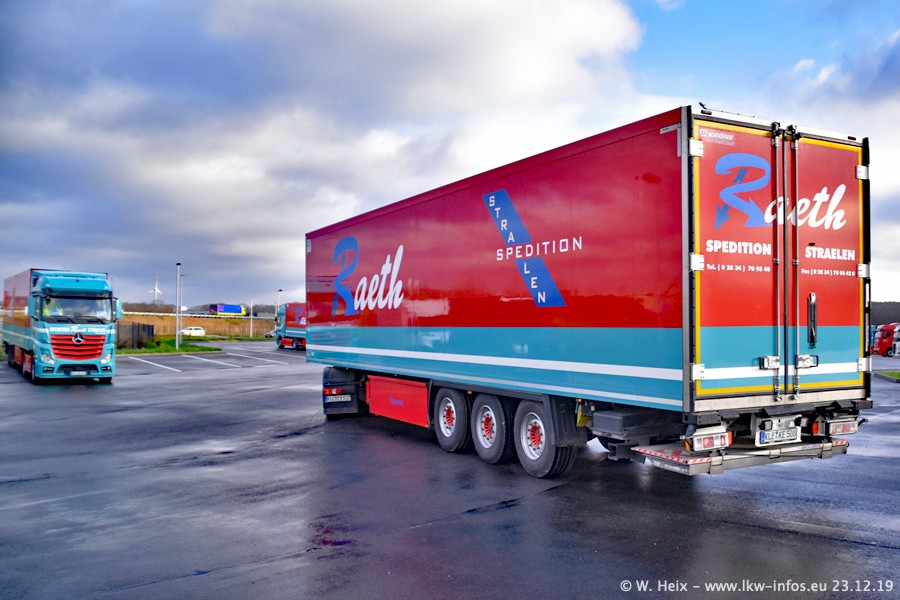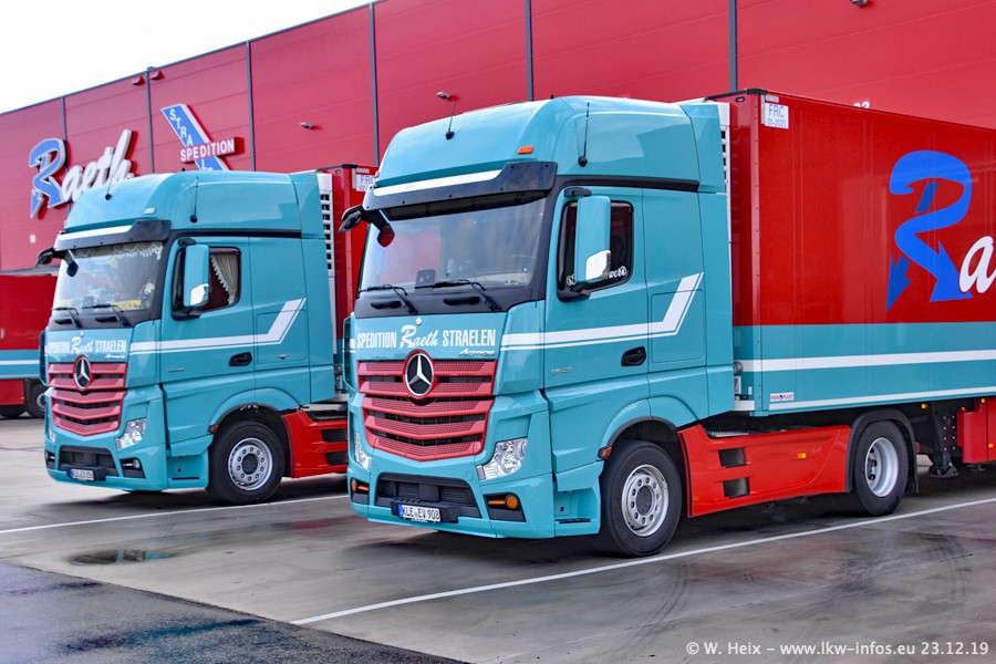 In diesem Jahr istr der Weihnachtsbesuch zugleich der erste Besuch auf dem neuen Firmengelände. Im Juli ist Raeth vom alten, viel zu klein gewordenen Gelände in Straelen, umgezogen nach Straelen-Herongen. Das neue Frimengelände liegt jetzt direkt an der A40 an der Abfahrt Herongen. Auf dem weitläufigen Gelände wurde ein kompletter Neubau mit Lagerhalle, Bürokomplex, Werkstatt und Waschstraße gebaut. Es gibt Platz für rund 40 LKW. Der Fuhrpark besteht aktuell aus rund 80 LKW. Viele Fahrzeuge stehen an den Wochenenden bei den Fahrern zuhause. Die "klassische Weihnachtsaufstellung " der LKW gibt es nicht. Aber gibt mir die Gelegenheit, viele Fahrzeuge einzeln zu fotografieren. Daher ist dieser Besuch mit 375 Fotos auch der größte bisher. Vielen Dank an Florian Brimmers für den freundlichen Empfang und für die Infos über die Firma.