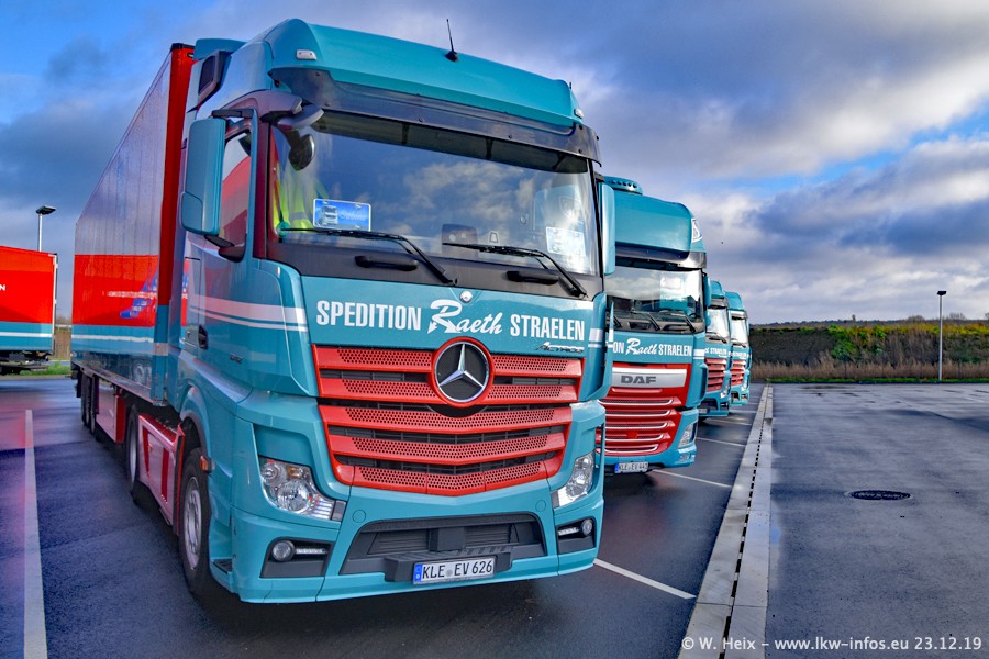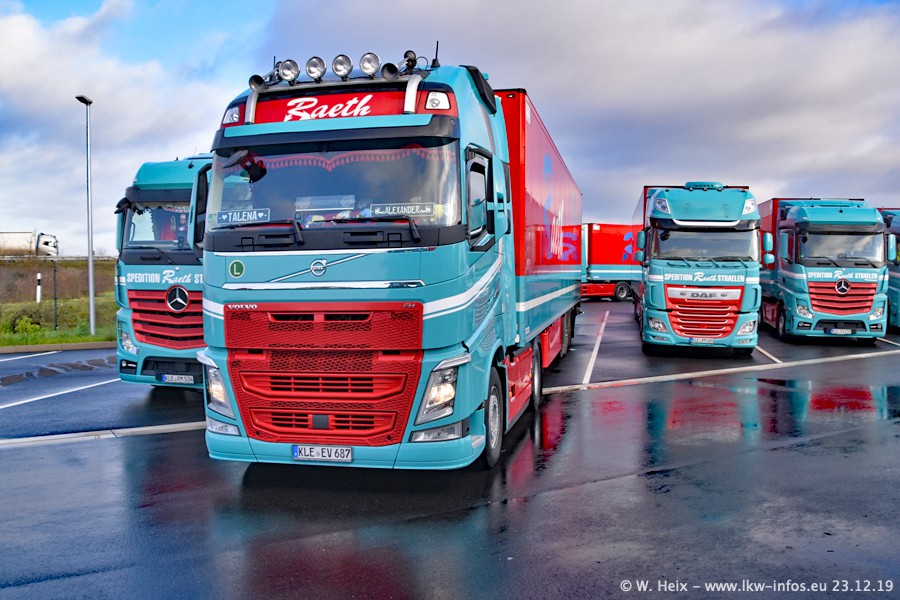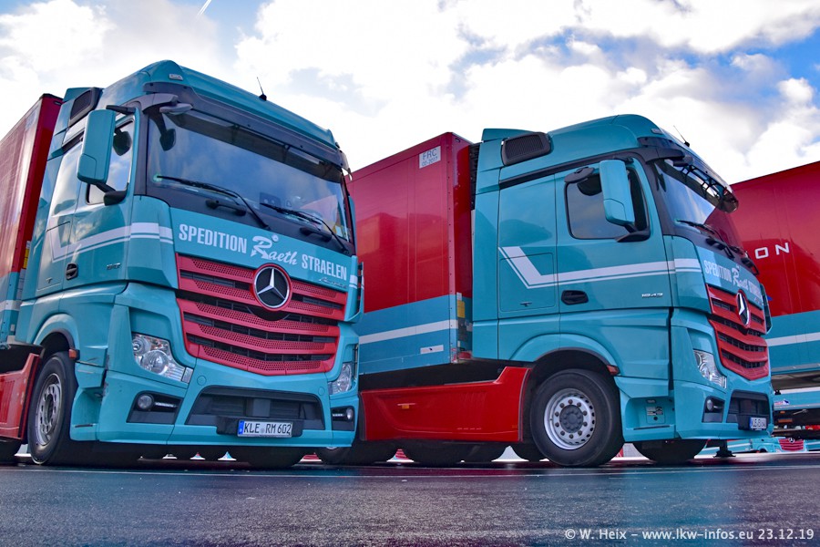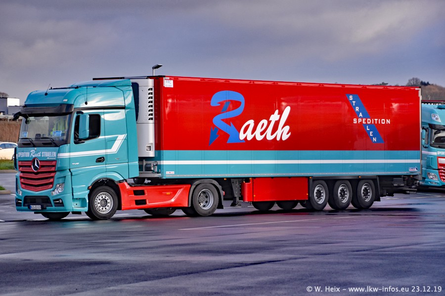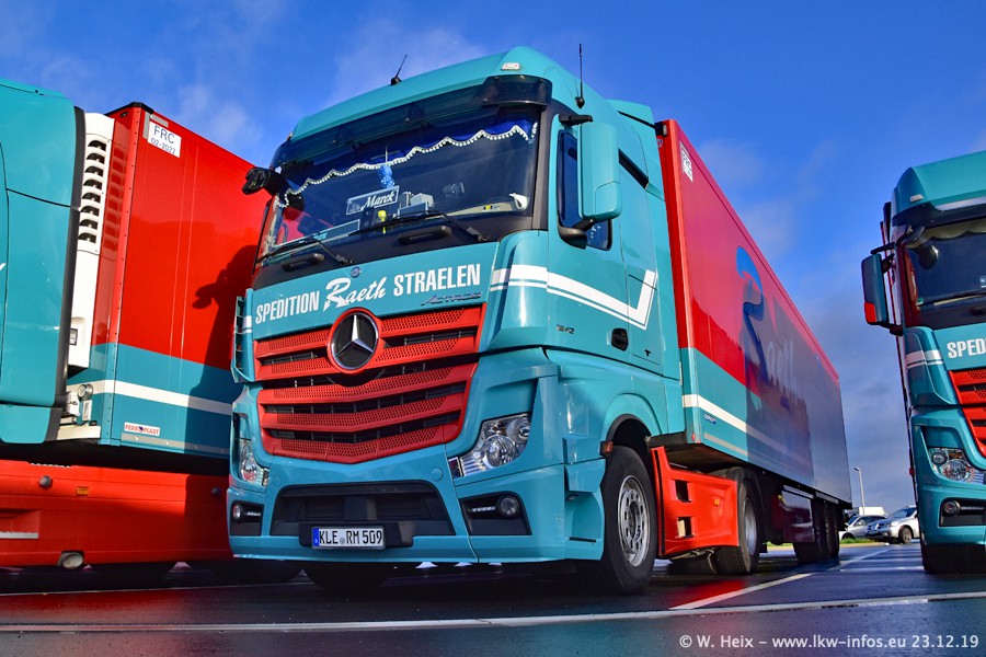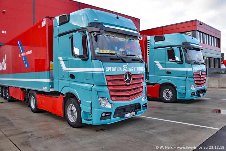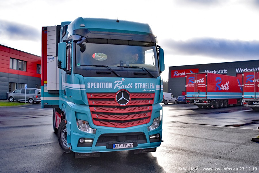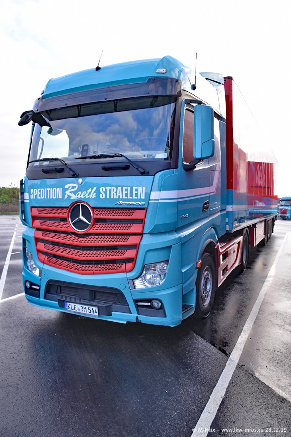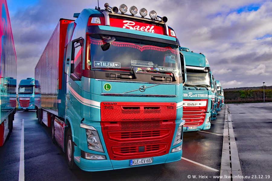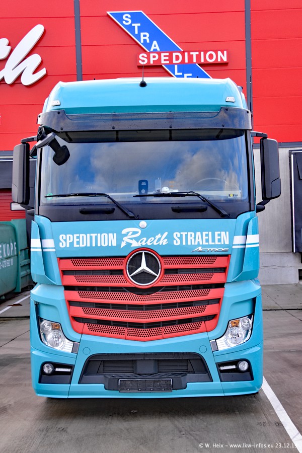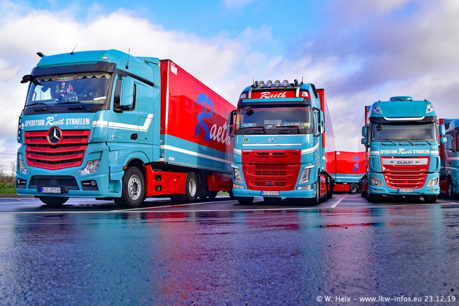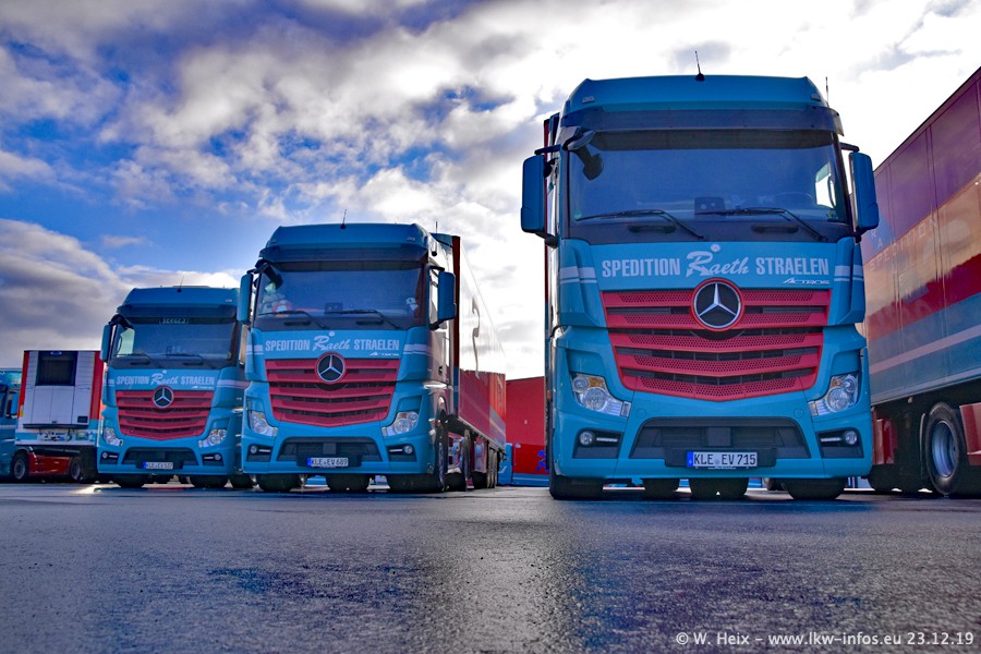 In diesem Jahr istr der Weihnachtsbesuch zugleich der erste Besuch auf dem neuen Firmengelände. Im Juli ist Raeth vom alten, viel zu klein gewordenen Gelände in Straelen, umgezogen nach Straelen-Herongen. Das neue Frimengelände liegt jetzt direkt an der A40 an der Abfahrt Herongen. Auf dem weitläufigen Gelände wurde ein kompletter Neubau mit Lagerhalle, Bürokomplex, Werkstatt und Waschstraße gebaut. Es gibt Platz für rund 40 LKW. Der Fuhrpark besteht aktuell aus rund 80 LKW. Viele Fahrzeuge stehen an den Wochenenden bei den Fahrern zuhause. Die "klassische Weihnachtsaufstellung " der LKW gibt es nicht. Aber gibt mir die Gelegenheit, viele Fahrzeuge einzeln zu fotografieren. Daher ist dieser Besuch mit 375 Fotos auch der größte bisher. Vielen Dank an Florian Brimmers für den freundlichen Empfang und für die Infos über die Firma.