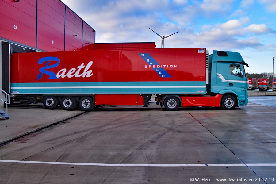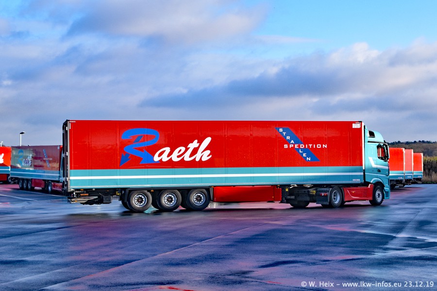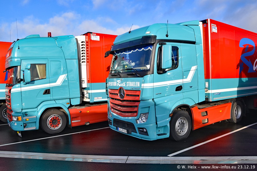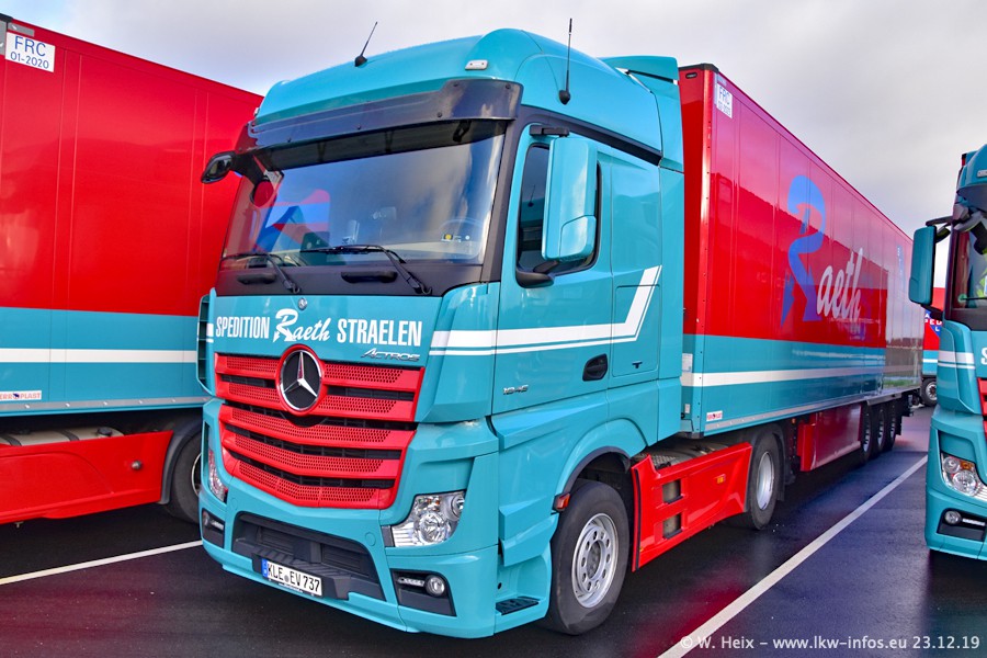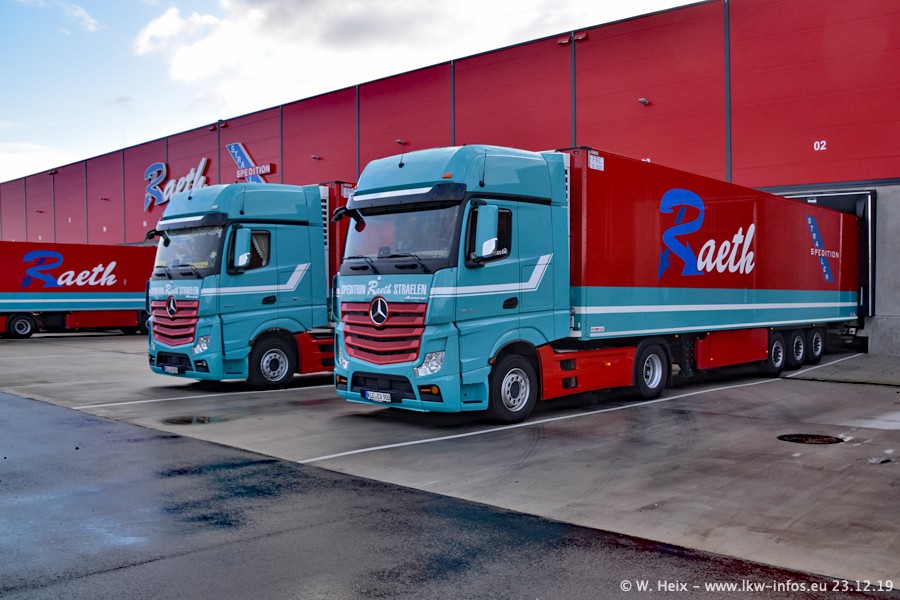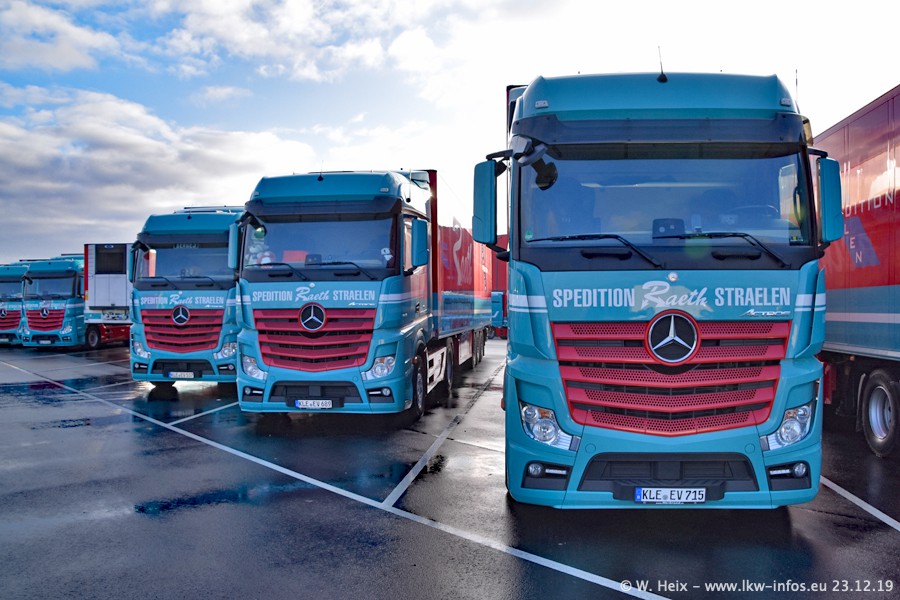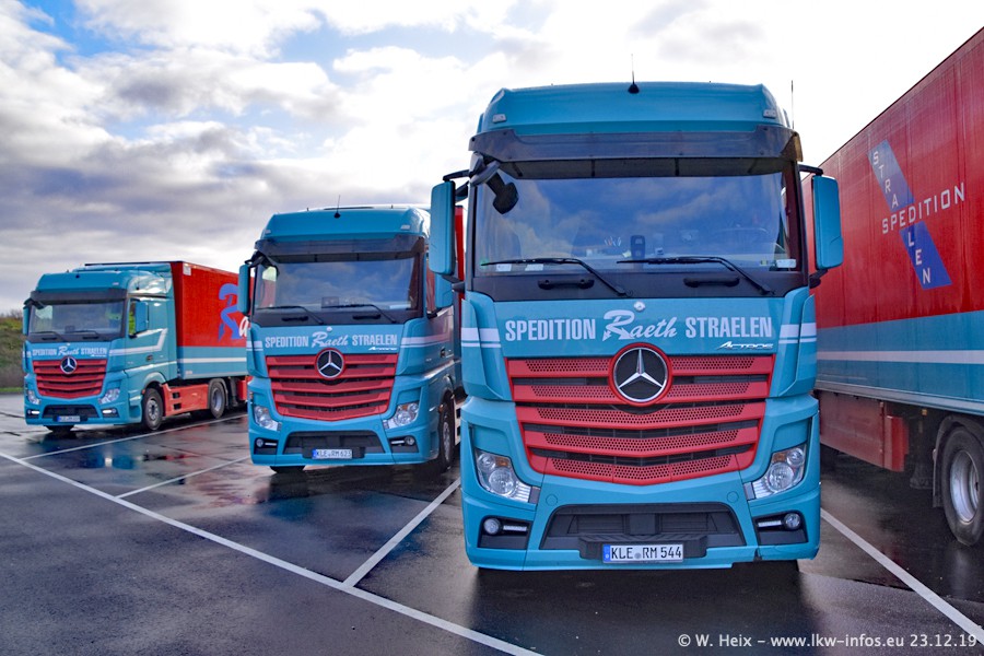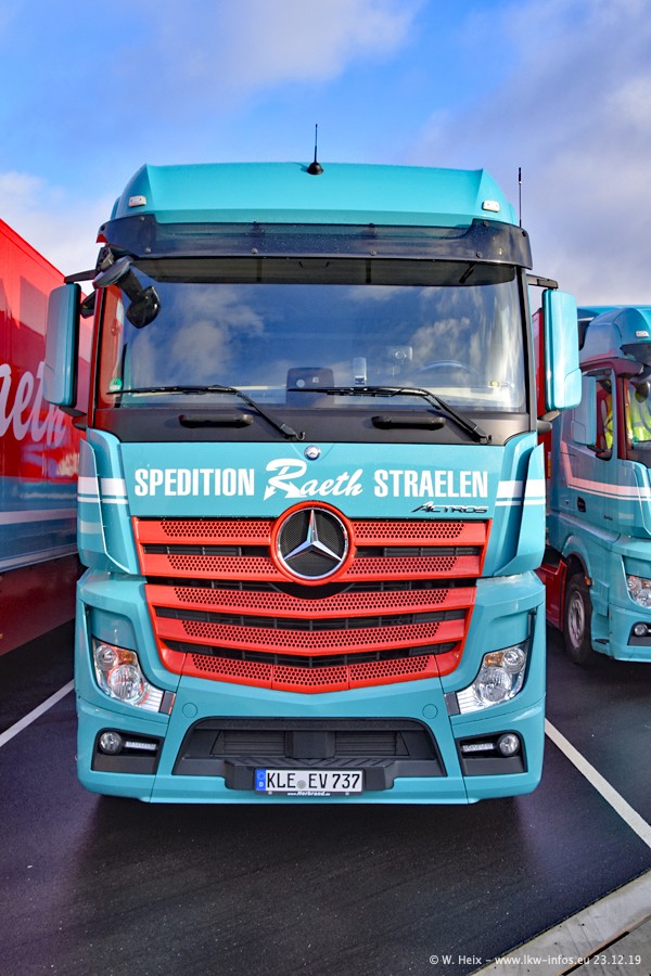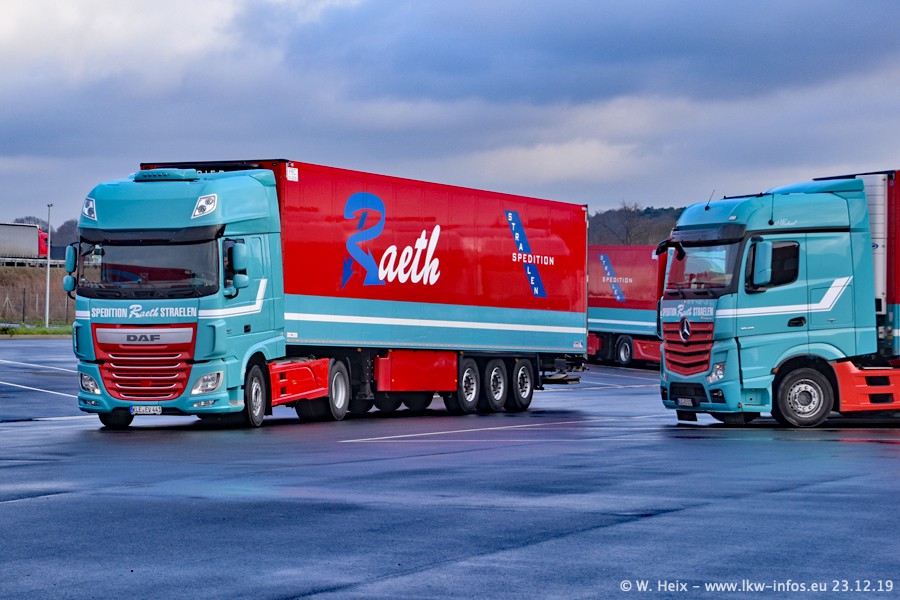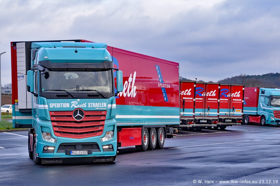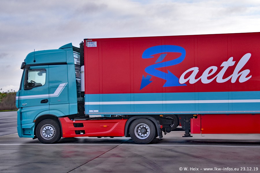 In diesem Jahr istr der Weihnachtsbesuch zugleich der erste Besuch auf dem neuen Firmengelände. Im Juli ist Raeth vom alten, viel zu klein gewordenen Gelände in Straelen, umgezogen nach Straelen-Herongen. Das neue Frimengelände liegt jetzt direkt an der A40 an der Abfahrt Herongen. Auf dem weitläufigen Gelände wurde ein kompletter Neubau mit Lagerhalle, Bürokomplex, Werkstatt und Waschstraße gebaut. Es gibt Platz für rund 40 LKW. Der Fuhrpark besteht aktuell aus rund 80 LKW. Viele Fahrzeuge stehen an den Wochenenden bei den Fahrern zuhause. Die "klassische Weihnachtsaufstellung " der LKW gibt es nicht. Aber gibt mir die Gelegenheit, viele Fahrzeuge einzeln zu fotografieren. Daher ist dieser Besuch mit 375 Fotos auch der größte bisher. Vielen Dank an Florian Brimmers für den freundlichen Empfang und für die Infos über die Firma.