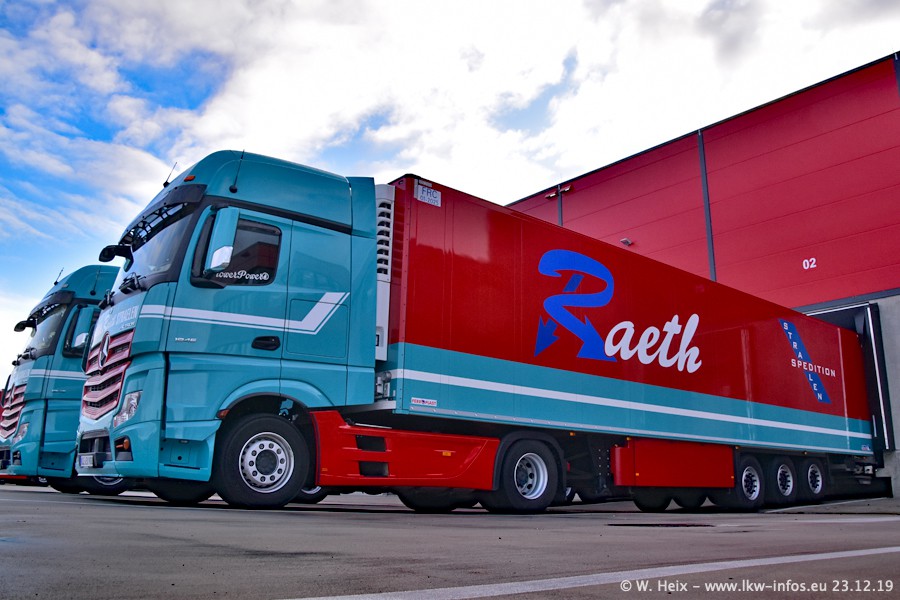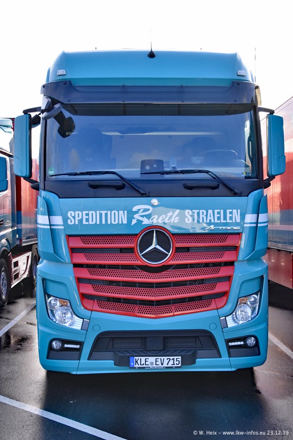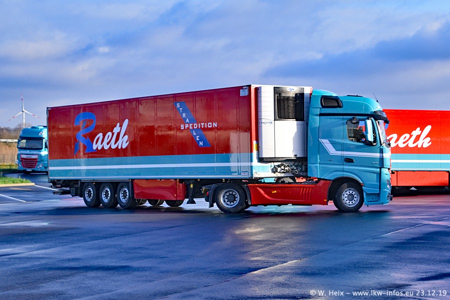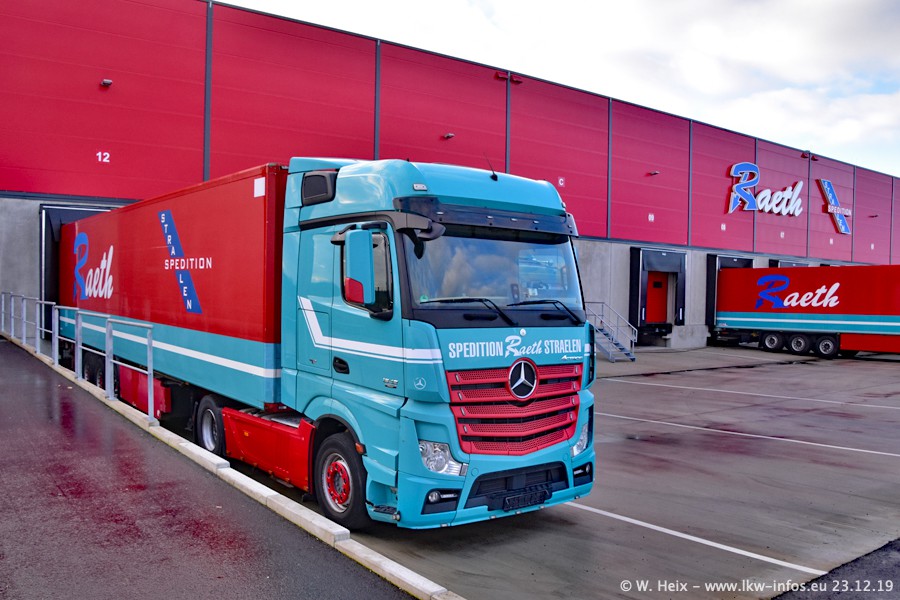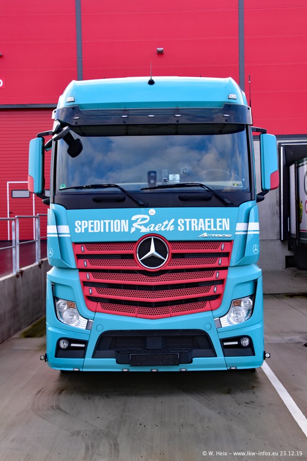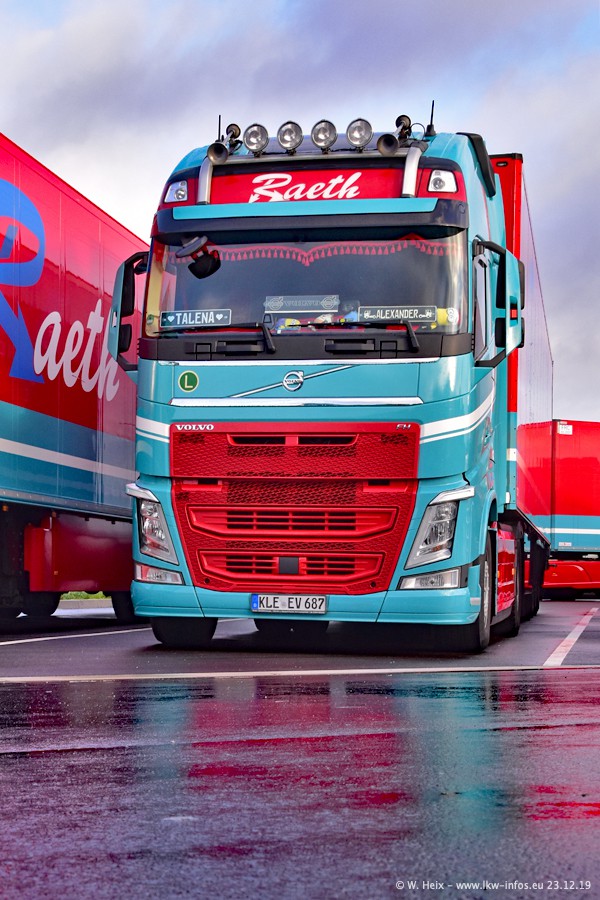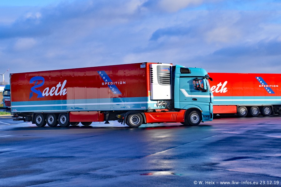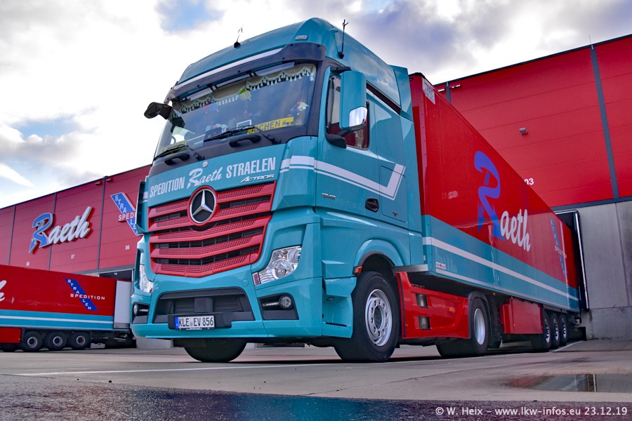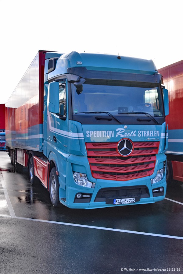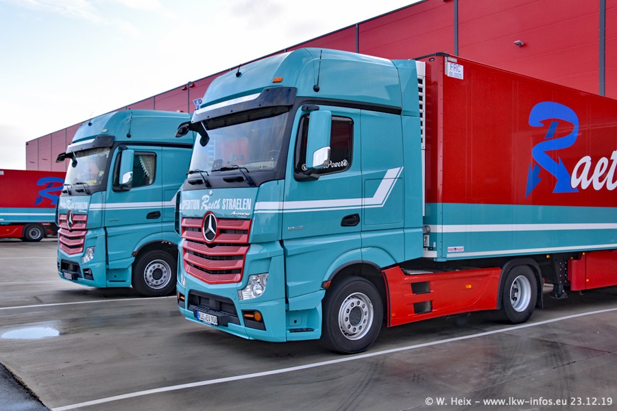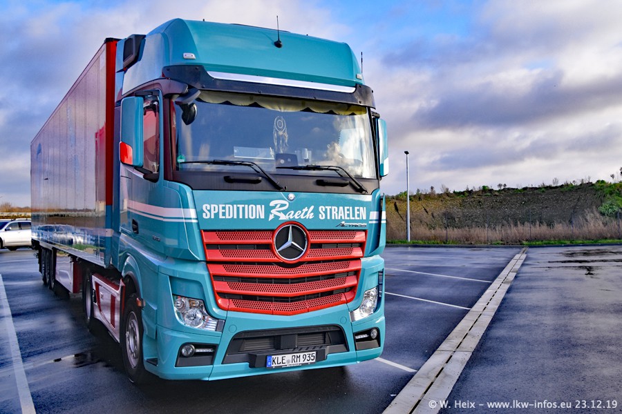 In diesem Jahr istr der Weihnachtsbesuch zugleich der erste Besuch auf dem neuen Firmengelände. Im Juli ist Raeth vom alten, viel zu klein gewordenen Gelände in Straelen, umgezogen nach Straelen-Herongen. Das neue Frimengelände liegt jetzt direkt an der A40 an der Abfahrt Herongen. Auf dem weitläufigen Gelände wurde ein kompletter Neubau mit Lagerhalle, Bürokomplex, Werkstatt und Waschstraße gebaut. Es gibt Platz für rund 40 LKW. Der Fuhrpark besteht aktuell aus rund 80 LKW. Viele Fahrzeuge stehen an den Wochenenden bei den Fahrern zuhause. Die "klassische Weihnachtsaufstellung " der LKW gibt es nicht. Aber gibt mir die Gelegenheit, viele Fahrzeuge einzeln zu fotografieren. Daher ist dieser Besuch mit 375 Fotos auch der größte bisher. Vielen Dank an Florian Brimmers für den freundlichen Empfang und für die Infos über die Firma.