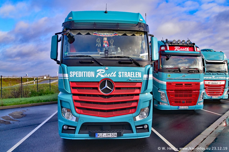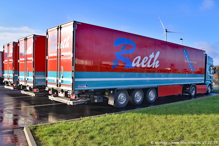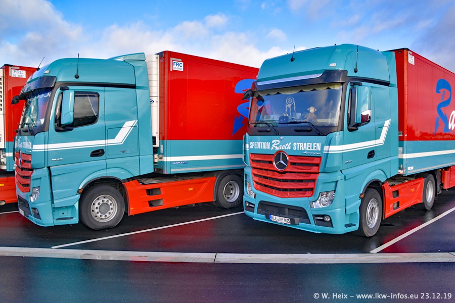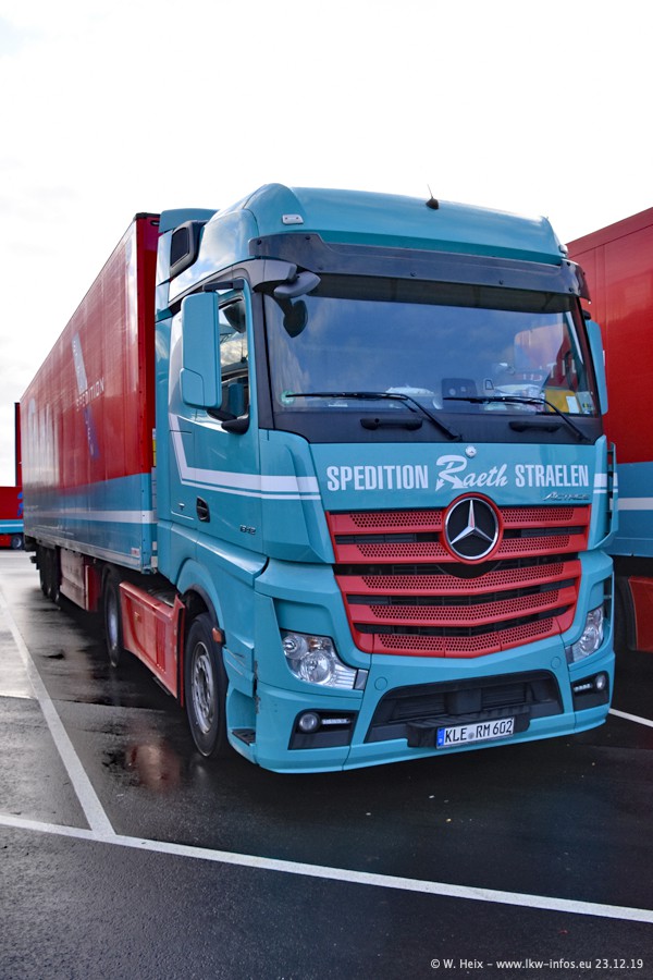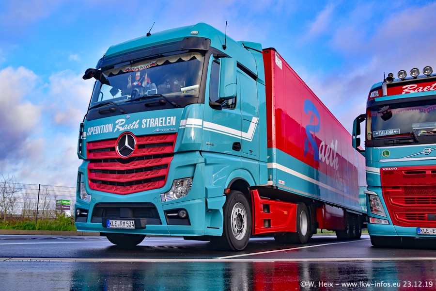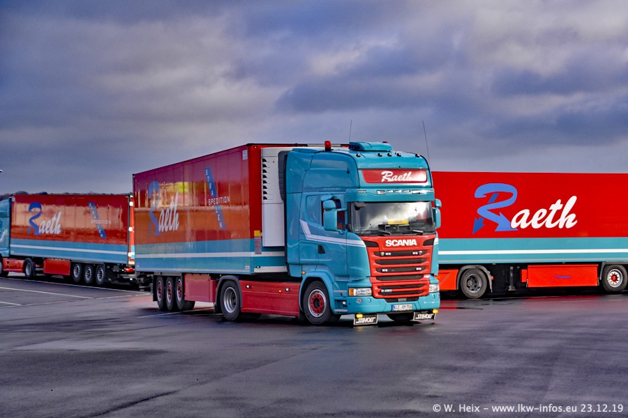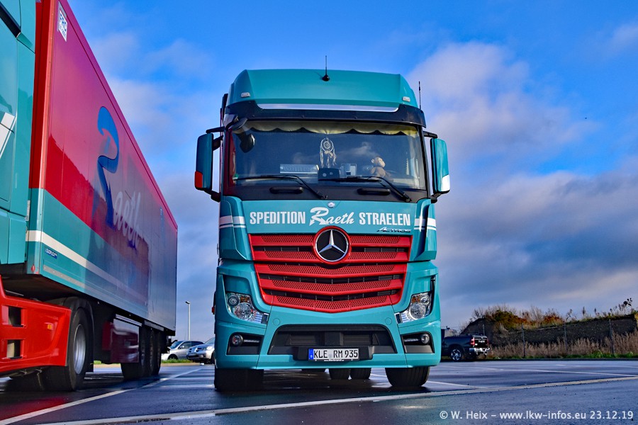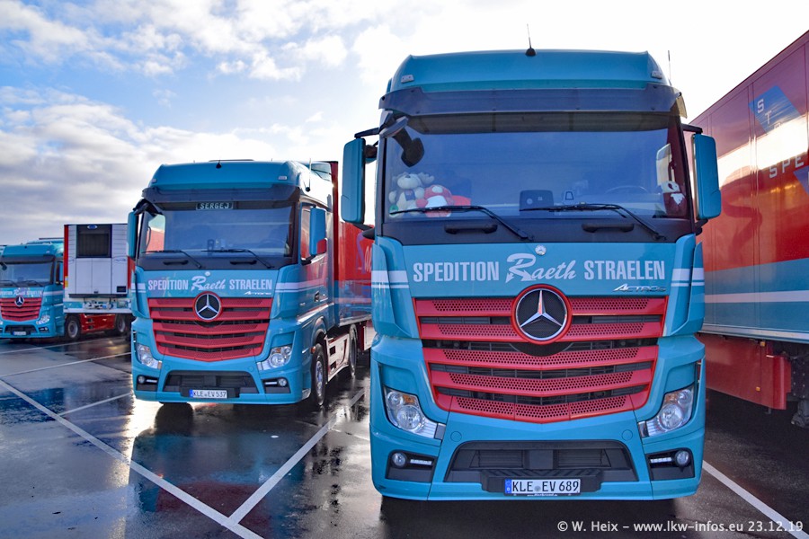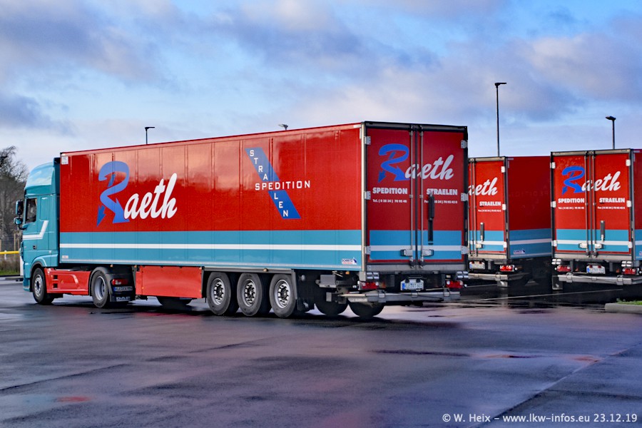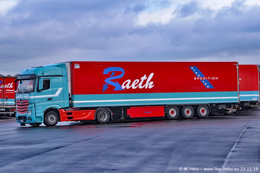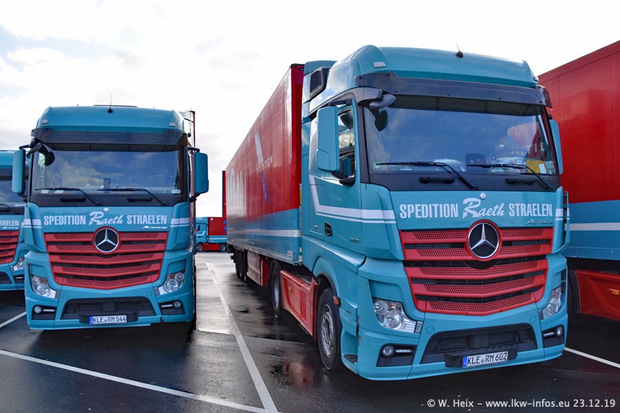 In diesem Jahr istr der Weihnachtsbesuch zugleich der erste Besuch auf dem neuen Firmengelände. Im Juli ist Raeth vom alten, viel zu klein gewordenen Gelände in Straelen, umgezogen nach Straelen-Herongen. Das neue Frimengelände liegt jetzt direkt an der A40 an der Abfahrt Herongen. Auf dem weitläufigen Gelände wurde ein kompletter Neubau mit Lagerhalle, Bürokomplex, Werkstatt und Waschstraße gebaut. Es gibt Platz für rund 40 LKW. Der Fuhrpark besteht aktuell aus rund 80 LKW. Viele Fahrzeuge stehen an den Wochenenden bei den Fahrern zuhause. Die "klassische Weihnachtsaufstellung " der LKW gibt es nicht. Aber gibt mir die Gelegenheit, viele Fahrzeuge einzeln zu fotografieren. Daher ist dieser Besuch mit 375 Fotos auch der größte bisher. Vielen Dank an Florian Brimmers für den freundlichen Empfang und für die Infos über die Firma.
