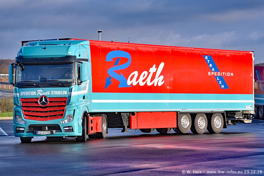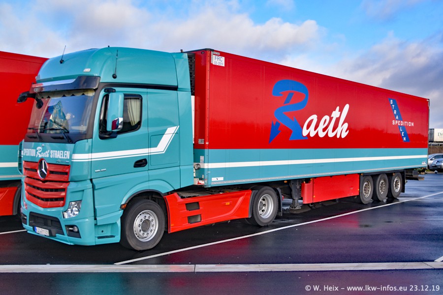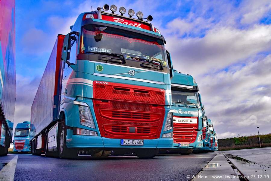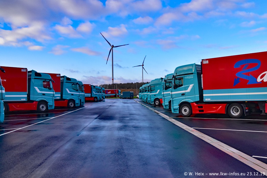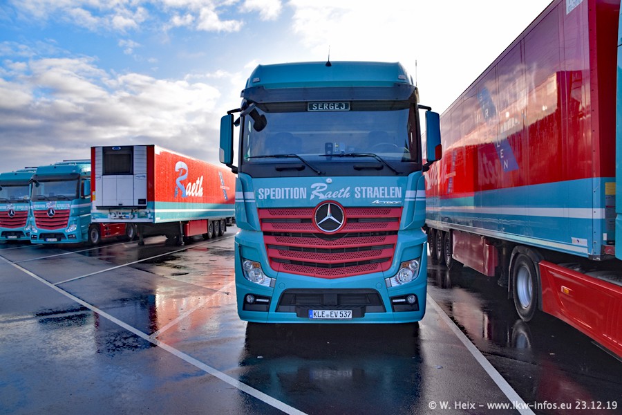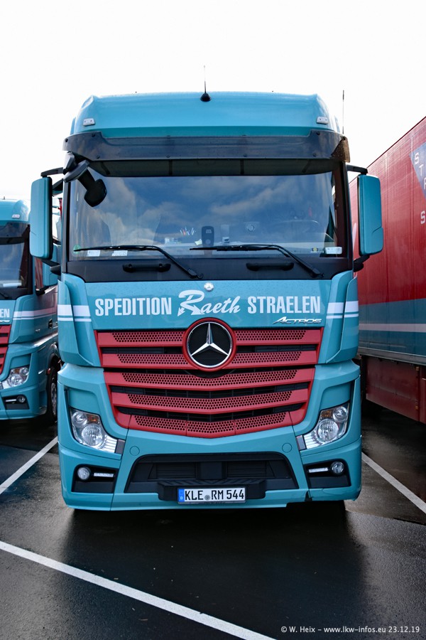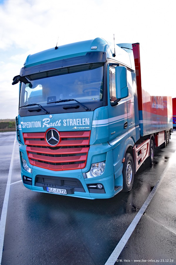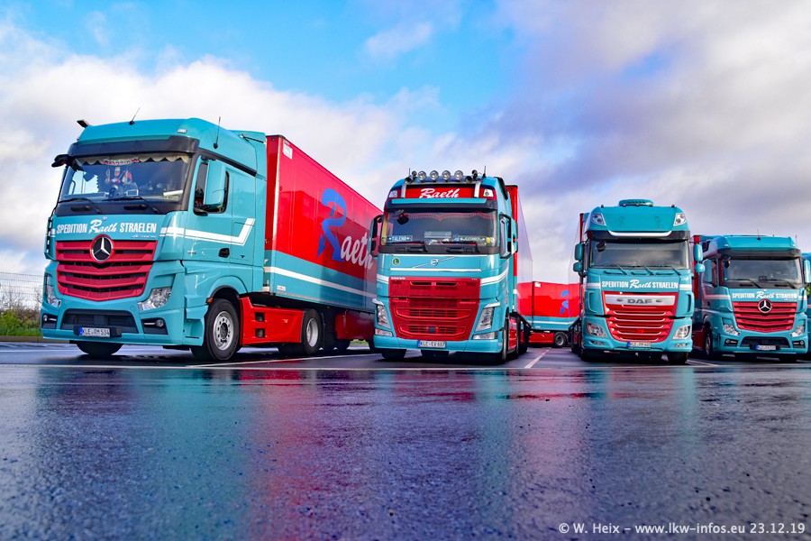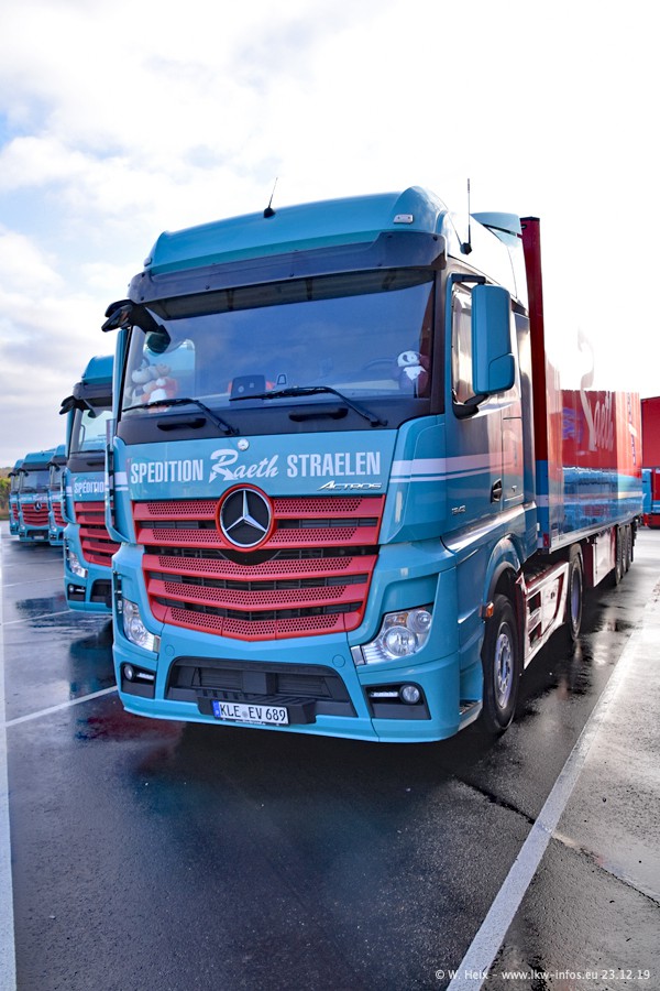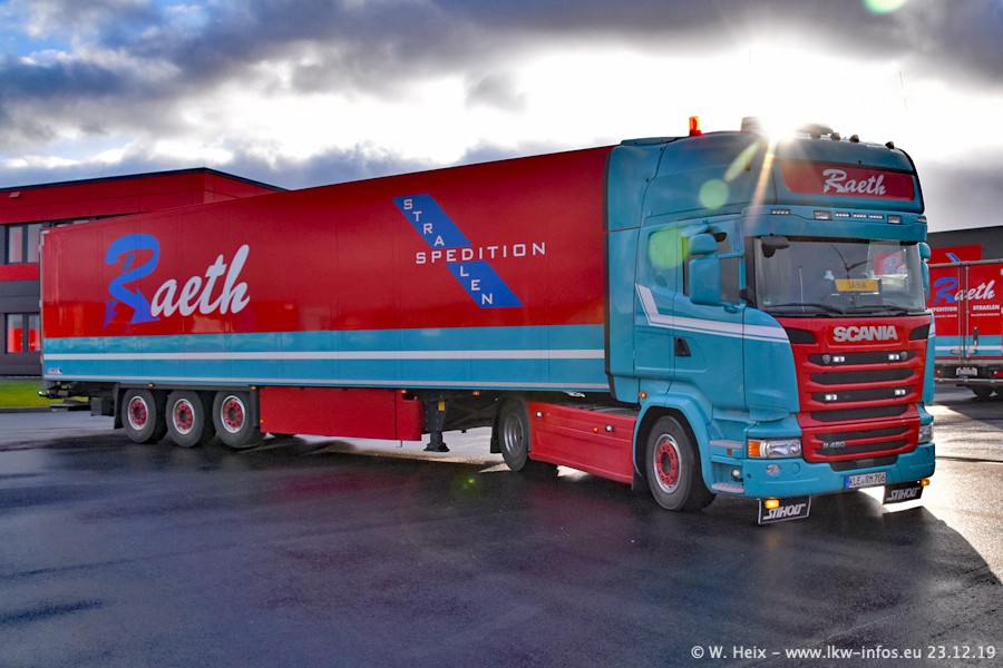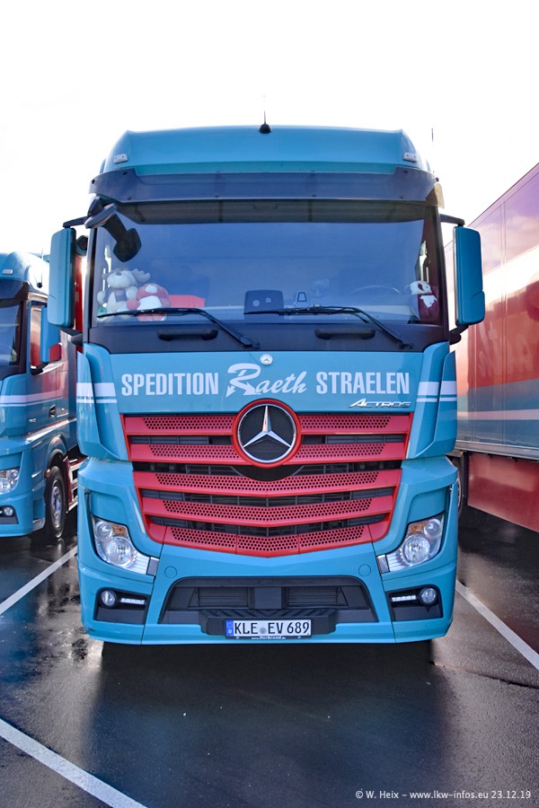 In diesem Jahr istr der Weihnachtsbesuch zugleich der erste Besuch auf dem neuen Firmengelände. Im Juli ist Raeth vom alten, viel zu klein gewordenen Gelände in Straelen, umgezogen nach Straelen-Herongen. Das neue Frimengelände liegt jetzt direkt an der A40 an der Abfahrt Herongen. Auf dem weitläufigen Gelände wurde ein kompletter Neubau mit Lagerhalle, Bürokomplex, Werkstatt und Waschstraße gebaut. Es gibt Platz für rund 40 LKW. Der Fuhrpark besteht aktuell aus rund 80 LKW. Viele Fahrzeuge stehen an den Wochenenden bei den Fahrern zuhause. Die "klassische Weihnachtsaufstellung " der LKW gibt es nicht. Aber gibt mir die Gelegenheit, viele Fahrzeuge einzeln zu fotografieren. Daher ist dieser Besuch mit 375 Fotos auch der größte bisher. Vielen Dank an Florian Brimmers für den freundlichen Empfang und für die Infos über die Firma.