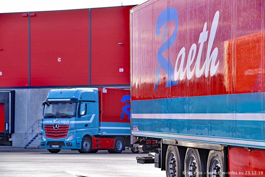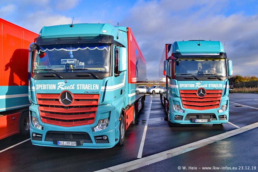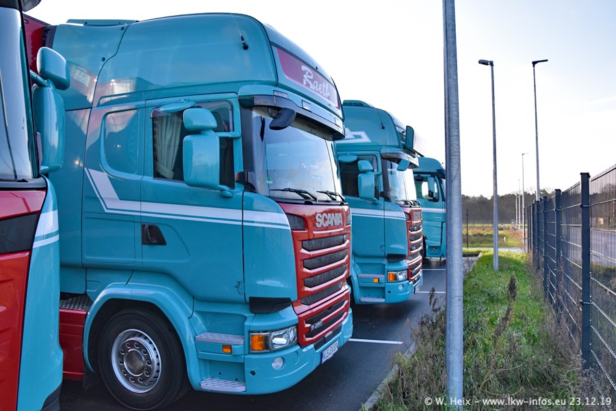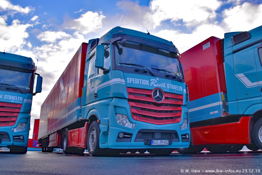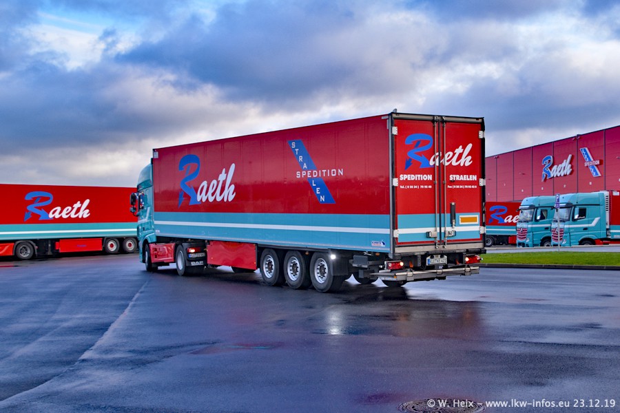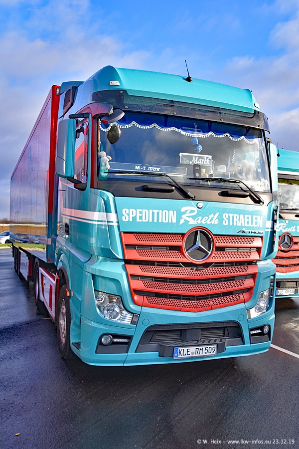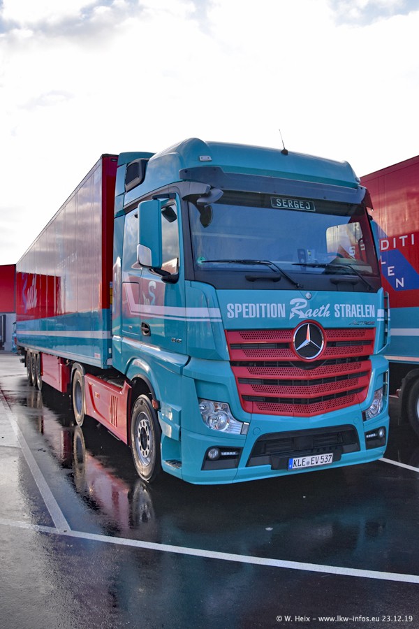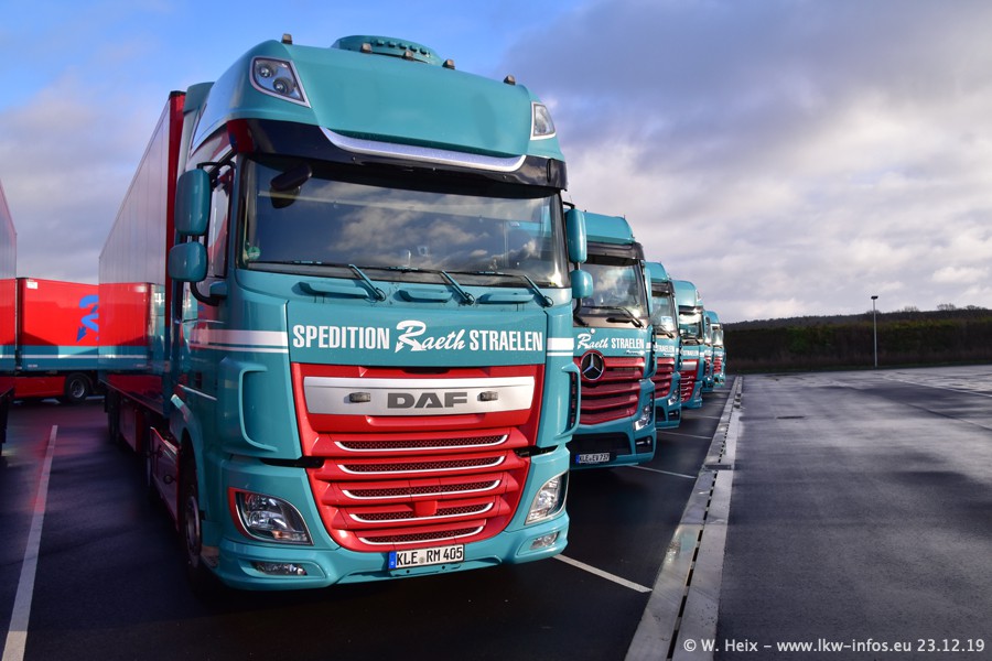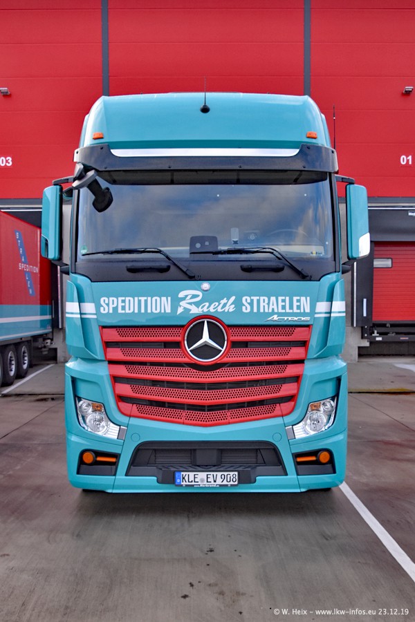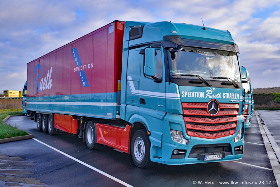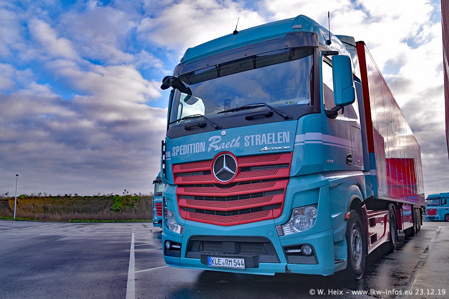 In diesem Jahr istr der Weihnachtsbesuch zugleich der erste Besuch auf dem neuen Firmengelände. Im Juli ist Raeth vom alten, viel zu klein gewordenen Gelände in Straelen, umgezogen nach Straelen-Herongen. Das neue Frimengelände liegt jetzt direkt an der A40 an der Abfahrt Herongen. Auf dem weitläufigen Gelände wurde ein kompletter Neubau mit Lagerhalle, Bürokomplex, Werkstatt und Waschstraße gebaut. Es gibt Platz für rund 40 LKW. Der Fuhrpark besteht aktuell aus rund 80 LKW. Viele Fahrzeuge stehen an den Wochenenden bei den Fahrern zuhause. Die "klassische Weihnachtsaufstellung " der LKW gibt es nicht. Aber gibt mir die Gelegenheit, viele Fahrzeuge einzeln zu fotografieren. Daher ist dieser Besuch mit 375 Fotos auch der größte bisher. Vielen Dank an Florian Brimmers für den freundlichen Empfang und für die Infos über die Firma.