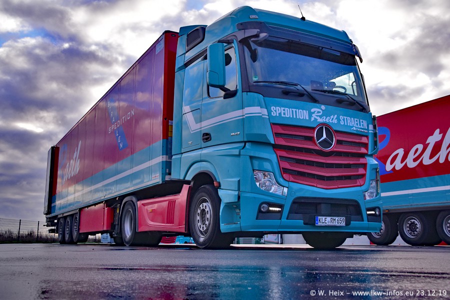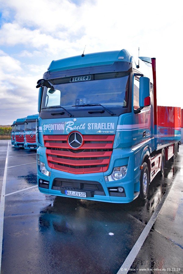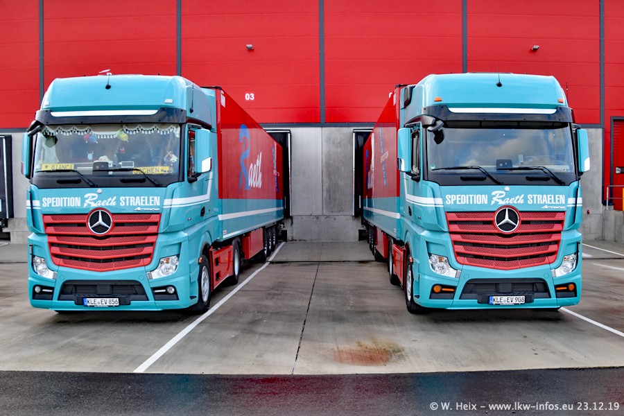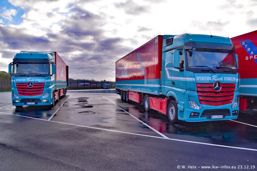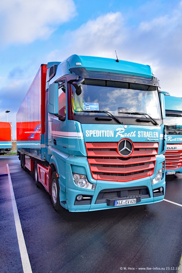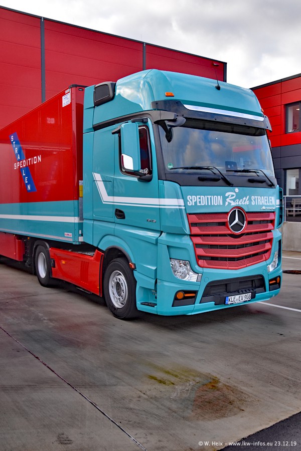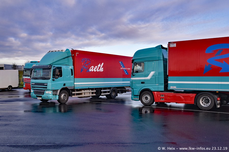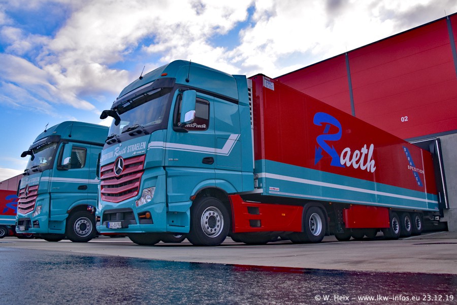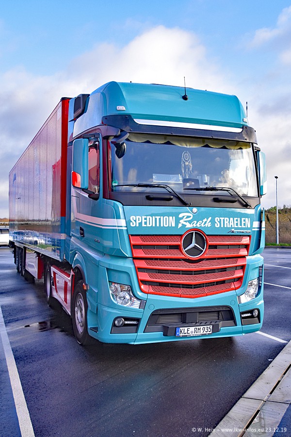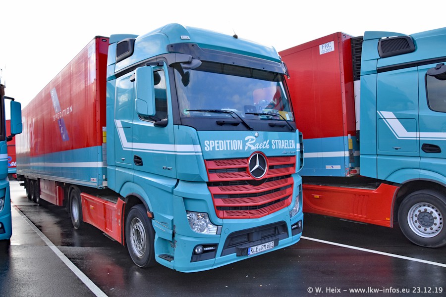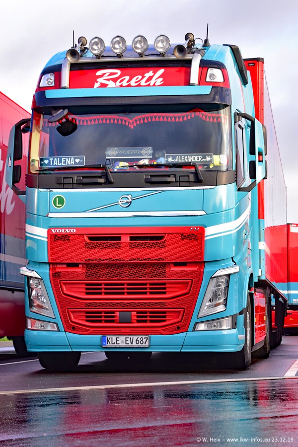 In diesem Jahr istr der Weihnachtsbesuch zugleich der erste Besuch auf dem neuen Firmengelände. Im Juli ist Raeth vom alten, viel zu klein gewordenen Gelände in Straelen, umgezogen nach Straelen-Herongen. Das neue Frimengelände liegt jetzt direkt an der A40 an der Abfahrt Herongen. Auf dem weitläufigen Gelände wurde ein kompletter Neubau mit Lagerhalle, Bürokomplex, Werkstatt und Waschstraße gebaut. Es gibt Platz für rund 40 LKW. Der Fuhrpark besteht aktuell aus rund 80 LKW. Viele Fahrzeuge stehen an den Wochenenden bei den Fahrern zuhause. Die "klassische Weihnachtsaufstellung " der LKW gibt es nicht. Aber gibt mir die Gelegenheit, viele Fahrzeuge einzeln zu fotografieren. Daher ist dieser Besuch mit 375 Fotos auch der größte bisher. Vielen Dank an Florian Brimmers für den freundlichen Empfang und für die Infos über die Firma.