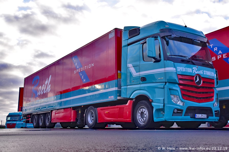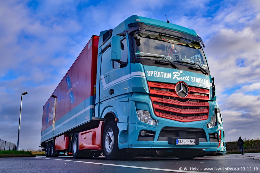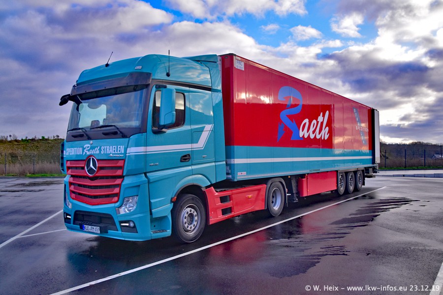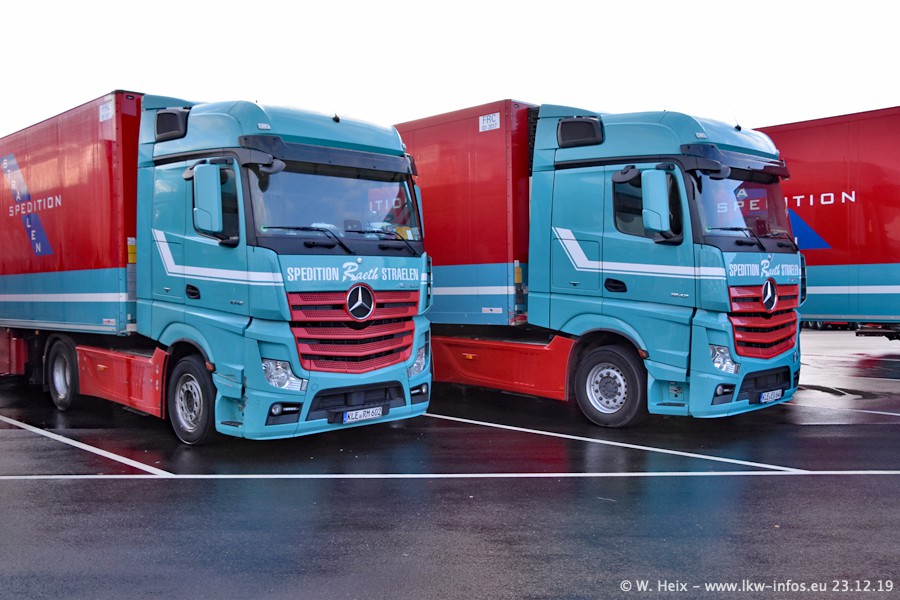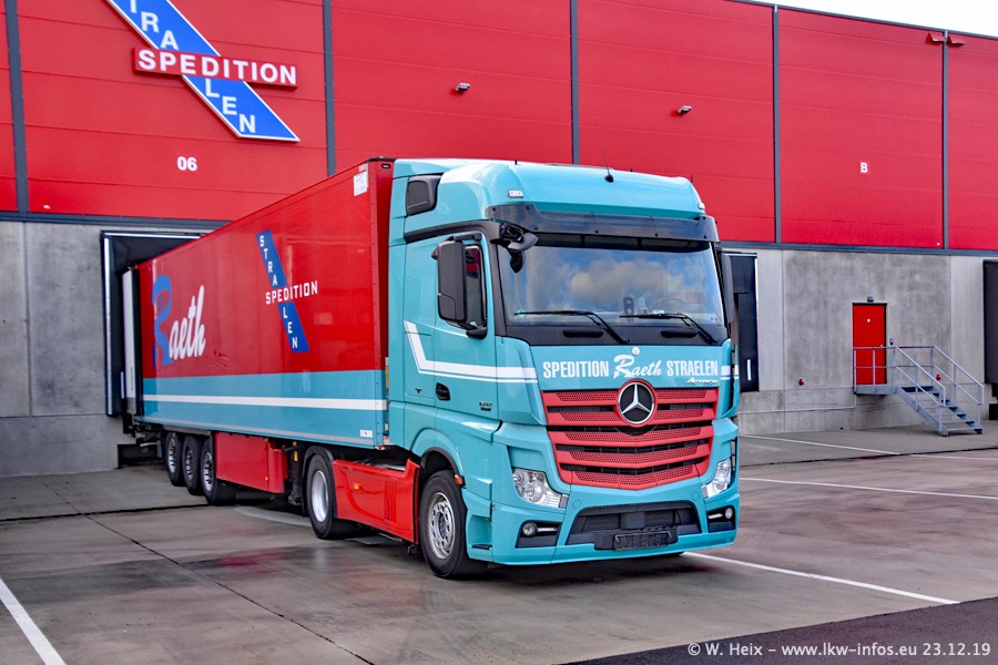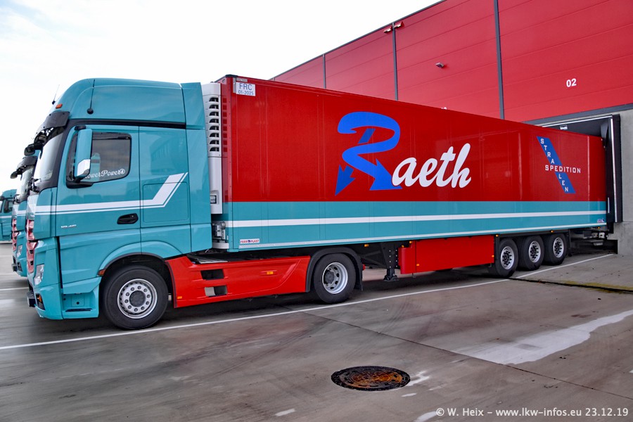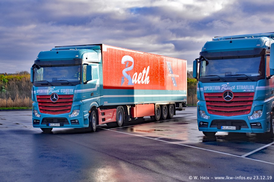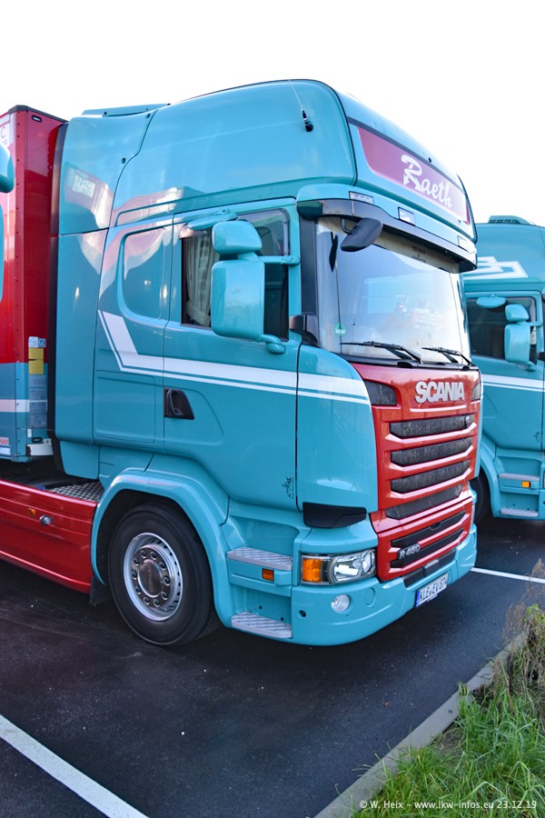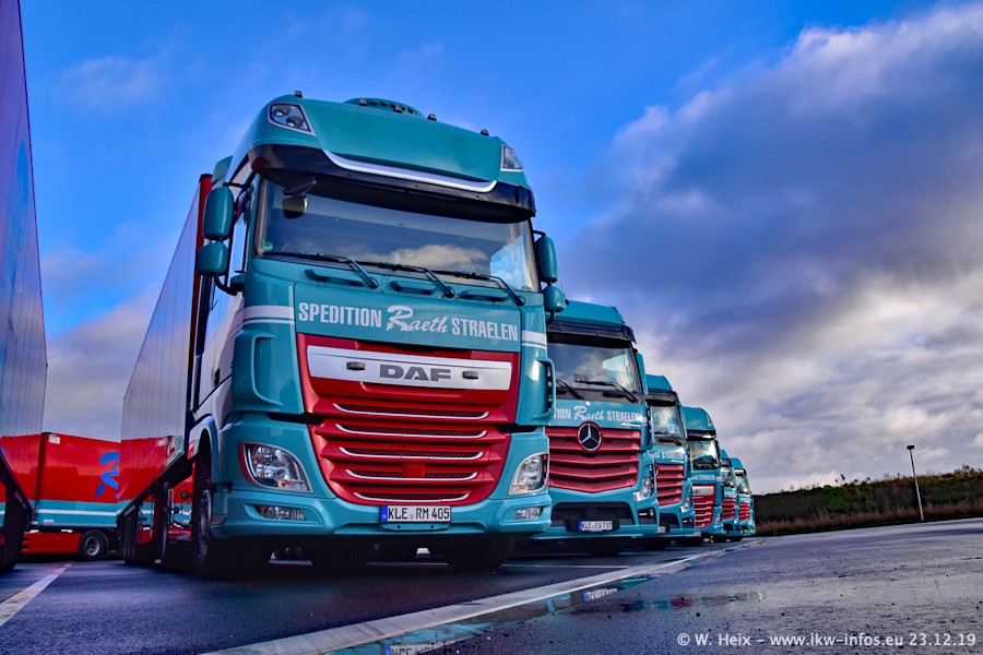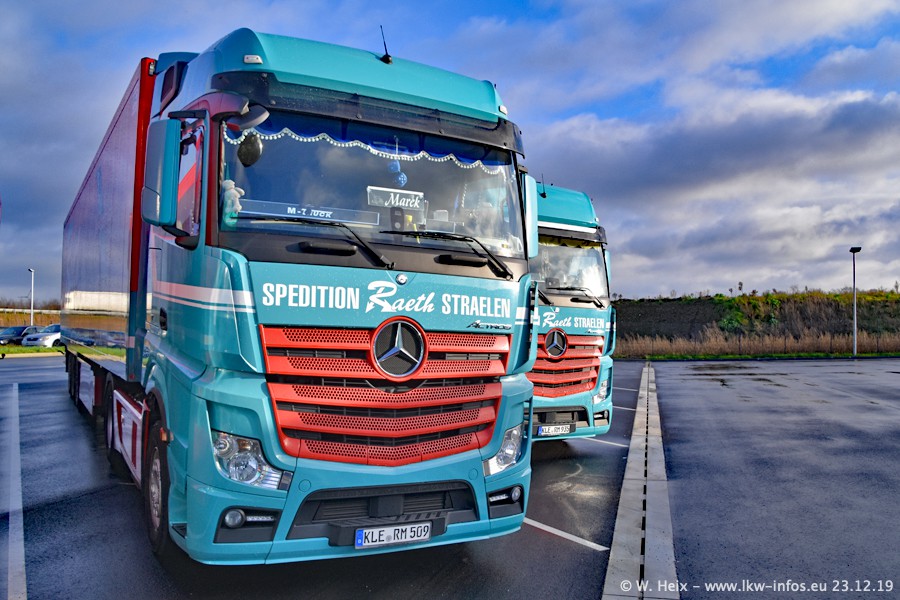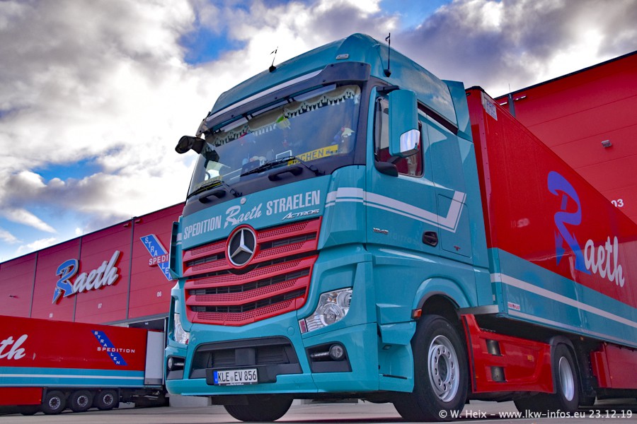 In diesem Jahr istr der Weihnachtsbesuch zugleich der erste Besuch auf dem neuen Firmengelände. Im Juli ist Raeth vom alten, viel zu klein gewordenen Gelände in Straelen, umgezogen nach Straelen-Herongen. Das neue Frimengelände liegt jetzt direkt an der A40 an der Abfahrt Herongen. Auf dem weitläufigen Gelände wurde ein kompletter Neubau mit Lagerhalle, Bürokomplex, Werkstatt und Waschstraße gebaut. Es gibt Platz für rund 40 LKW. Der Fuhrpark besteht aktuell aus rund 80 LKW. Viele Fahrzeuge stehen an den Wochenenden bei den Fahrern zuhause. Die "klassische Weihnachtsaufstellung " der LKW gibt es nicht. Aber gibt mir die Gelegenheit, viele Fahrzeuge einzeln zu fotografieren. Daher ist dieser Besuch mit 375 Fotos auch der größte bisher. Vielen Dank an Florian Brimmers für den freundlichen Empfang und für die Infos über die Firma.