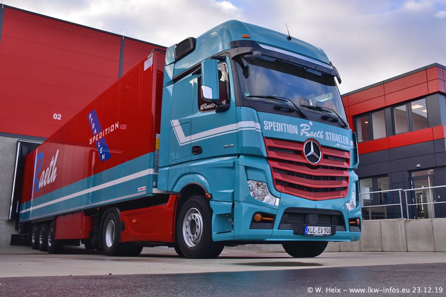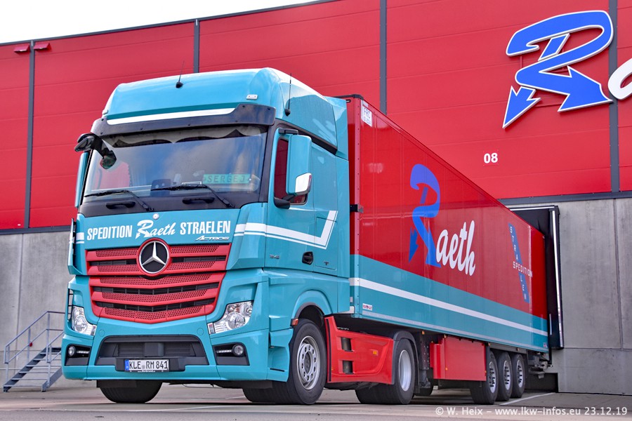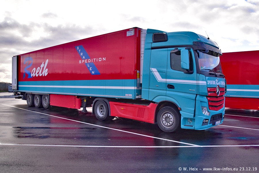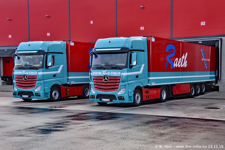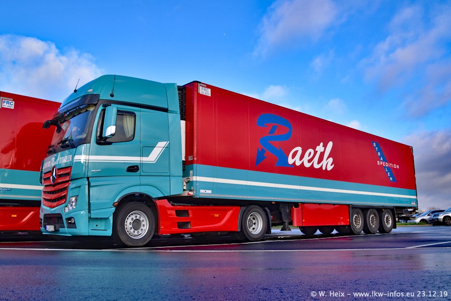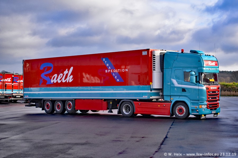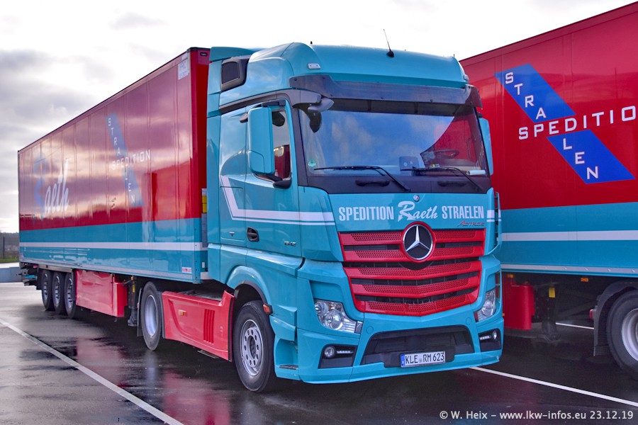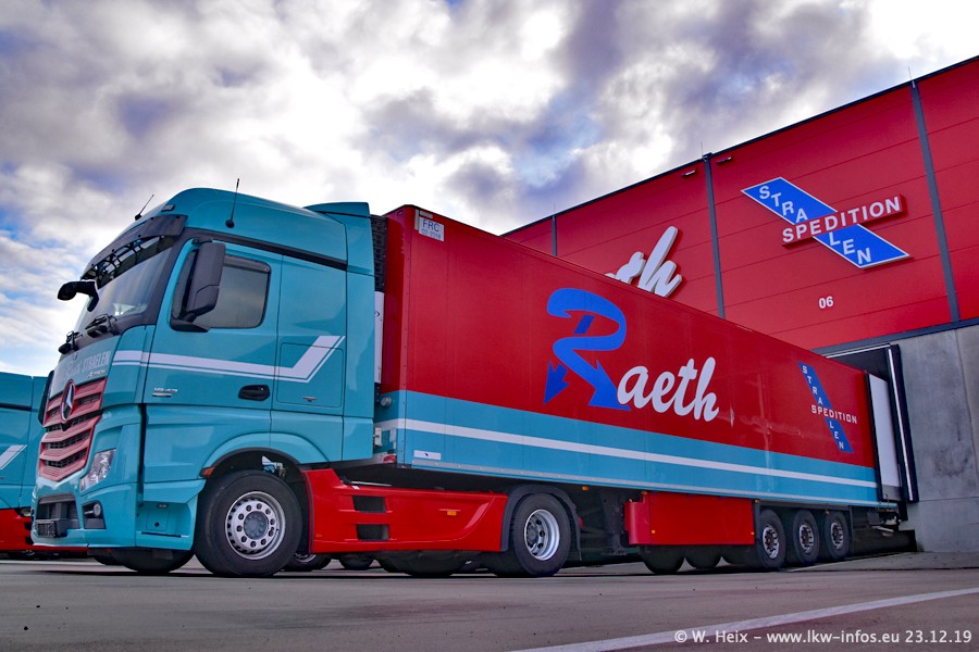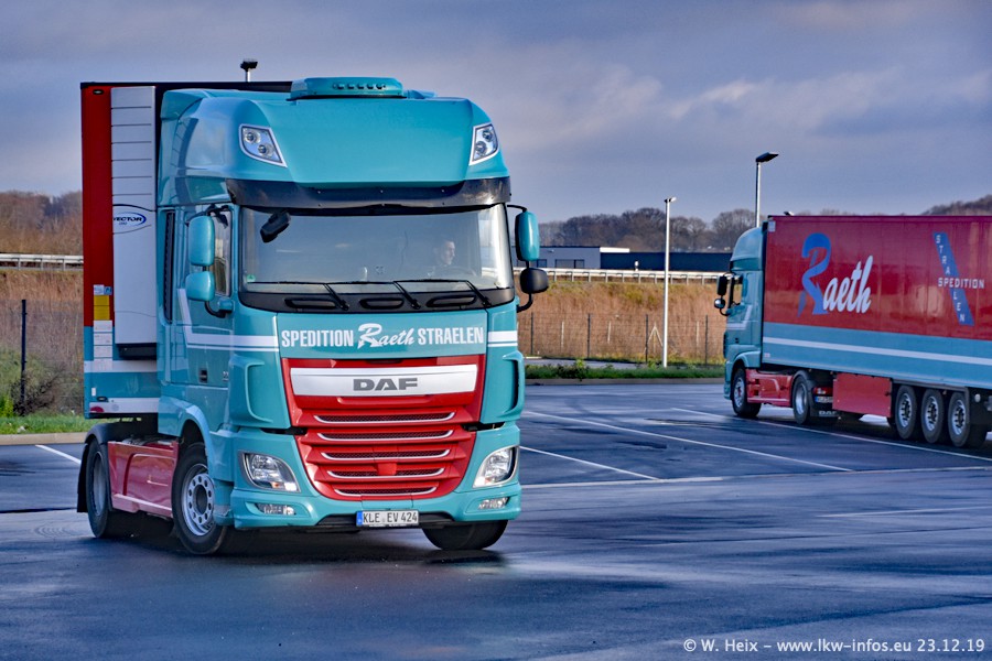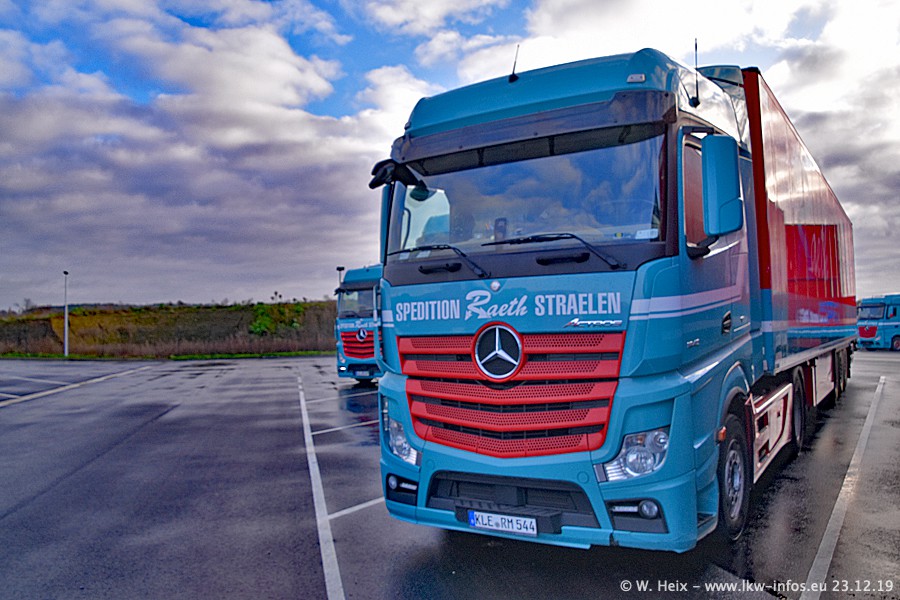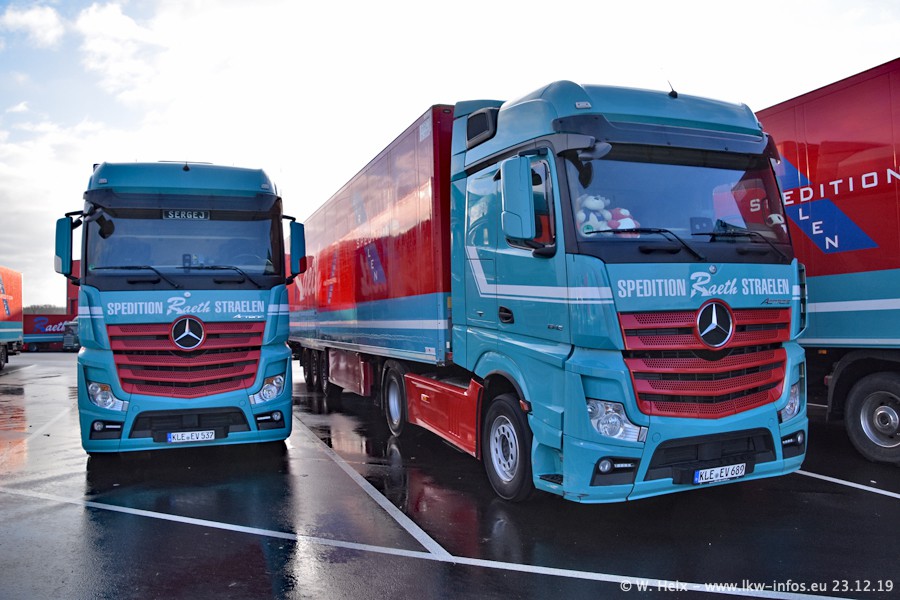 In diesem Jahr istr der Weihnachtsbesuch zugleich der erste Besuch auf dem neuen Firmengelände. Im Juli ist Raeth vom alten, viel zu klein gewordenen Gelände in Straelen, umgezogen nach Straelen-Herongen. Das neue Frimengelände liegt jetzt direkt an der A40 an der Abfahrt Herongen. Auf dem weitläufigen Gelände wurde ein kompletter Neubau mit Lagerhalle, Bürokomplex, Werkstatt und Waschstraße gebaut. Es gibt Platz für rund 40 LKW. Der Fuhrpark besteht aktuell aus rund 80 LKW. Viele Fahrzeuge stehen an den Wochenenden bei den Fahrern zuhause. Die "klassische Weihnachtsaufstellung " der LKW gibt es nicht. Aber gibt mir die Gelegenheit, viele Fahrzeuge einzeln zu fotografieren. Daher ist dieser Besuch mit 375 Fotos auch der größte bisher. Vielen Dank an Florian Brimmers für den freundlichen Empfang und für die Infos über die Firma.