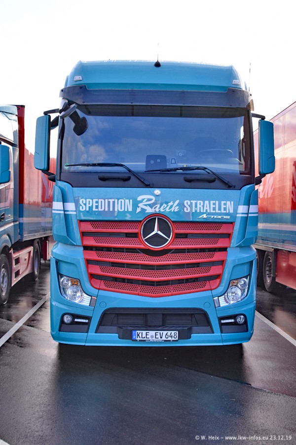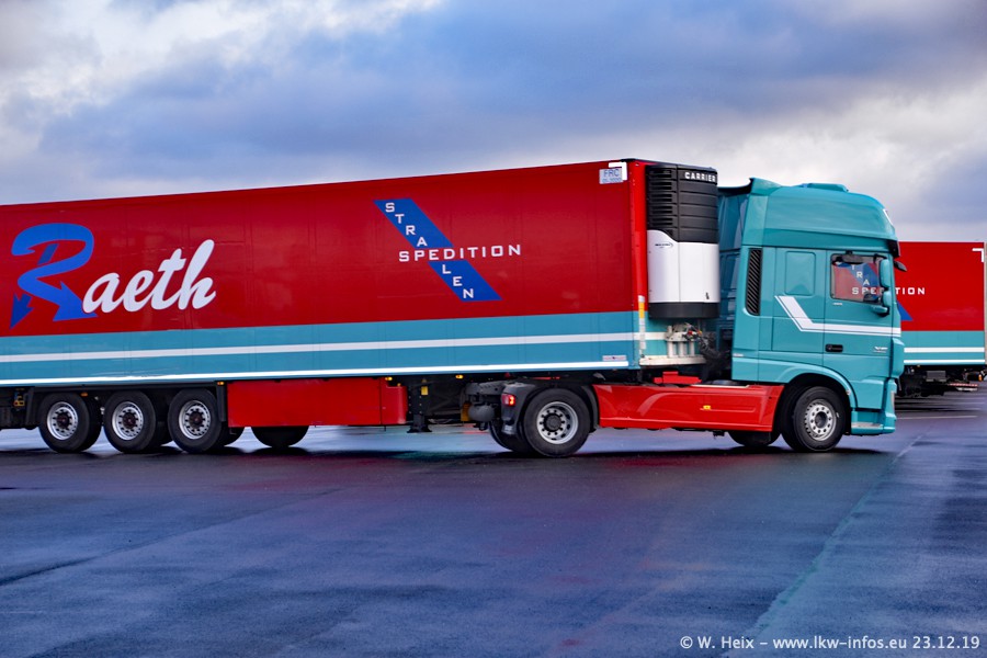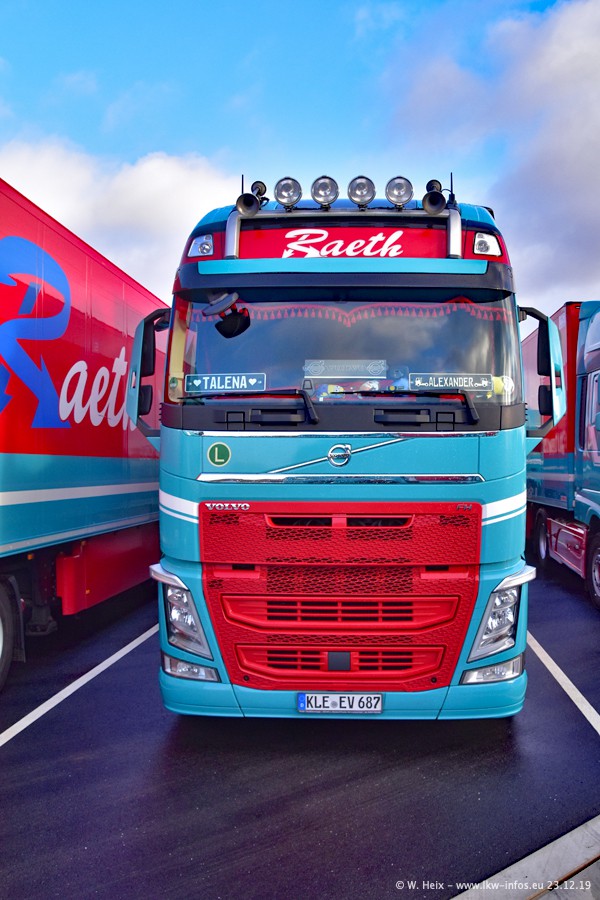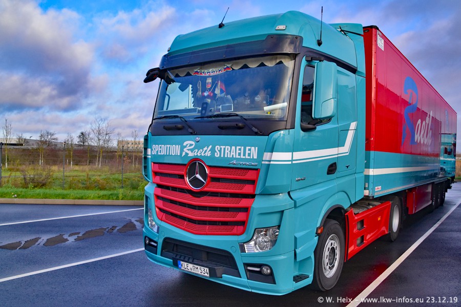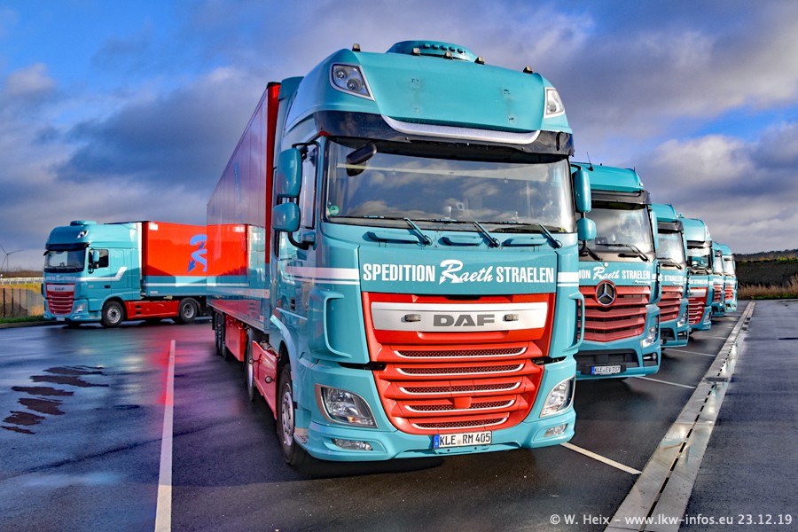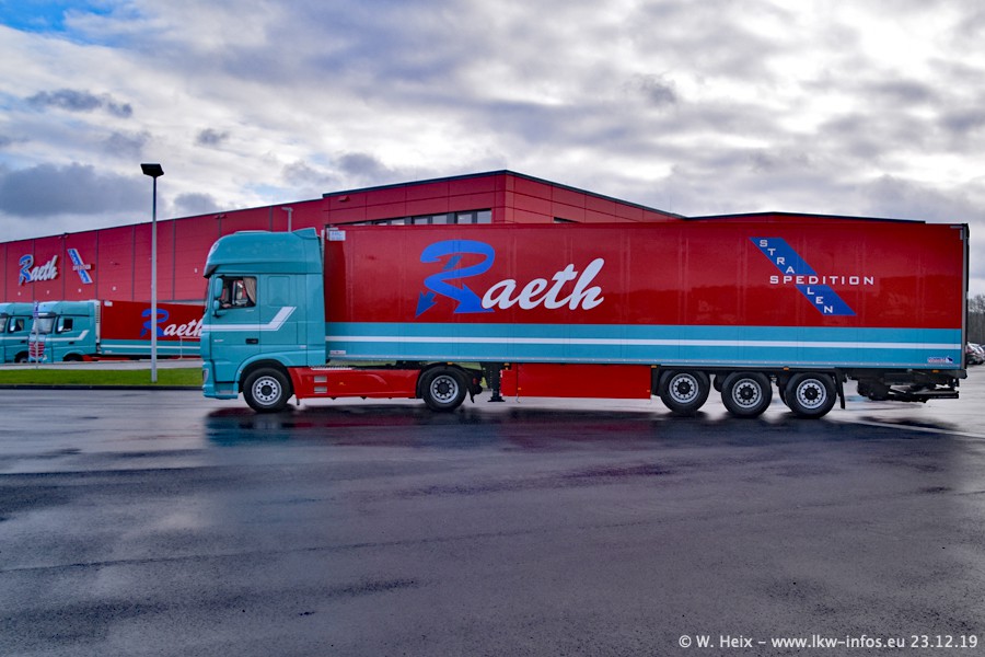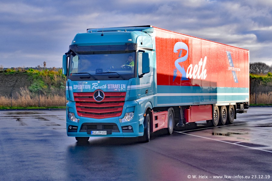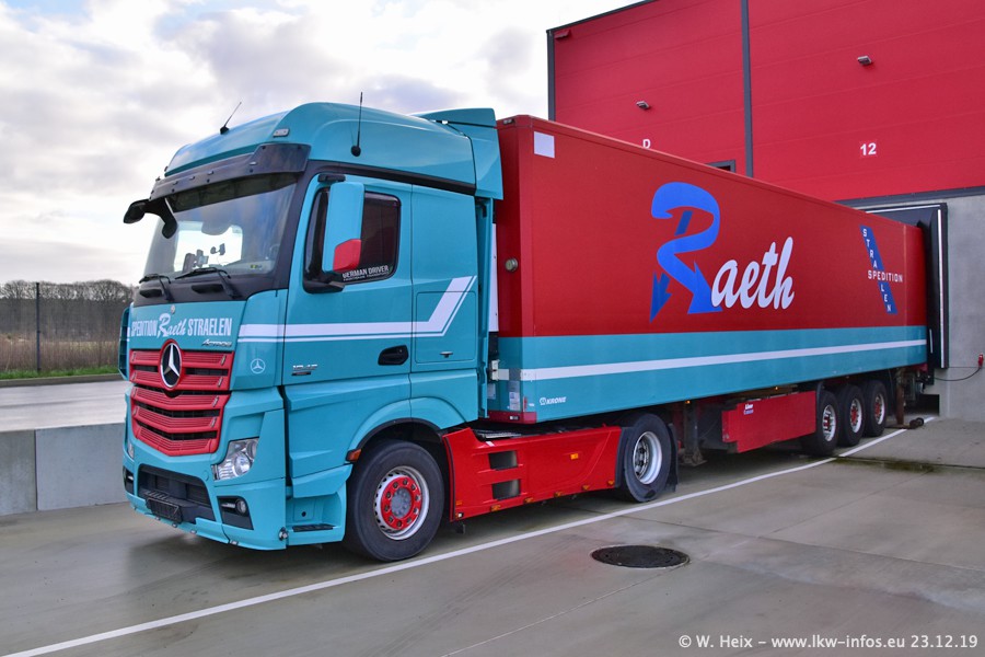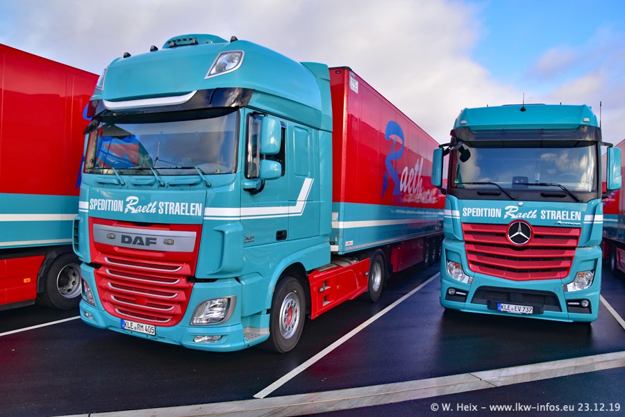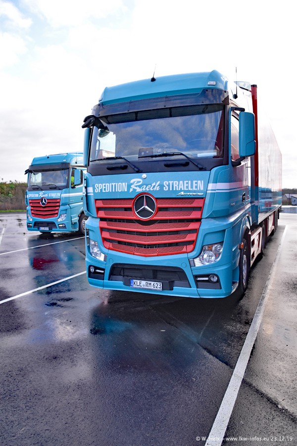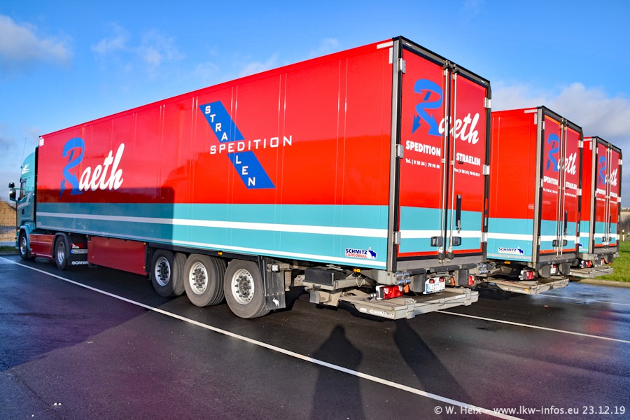 In diesem Jahr istr der Weihnachtsbesuch zugleich der erste Besuch auf dem neuen Firmengelände. Im Juli ist Raeth vom alten, viel zu klein gewordenen Gelände in Straelen, umgezogen nach Straelen-Herongen. Das neue Frimengelände liegt jetzt direkt an der A40 an der Abfahrt Herongen. Auf dem weitläufigen Gelände wurde ein kompletter Neubau mit Lagerhalle, Bürokomplex, Werkstatt und Waschstraße gebaut. Es gibt Platz für rund 40 LKW. Der Fuhrpark besteht aktuell aus rund 80 LKW. Viele Fahrzeuge stehen an den Wochenenden bei den Fahrern zuhause. Die "klassische Weihnachtsaufstellung " der LKW gibt es nicht. Aber gibt mir die Gelegenheit, viele Fahrzeuge einzeln zu fotografieren. Daher ist dieser Besuch mit 375 Fotos auch der größte bisher. Vielen Dank an Florian Brimmers für den freundlichen Empfang und für die Infos über die Firma.