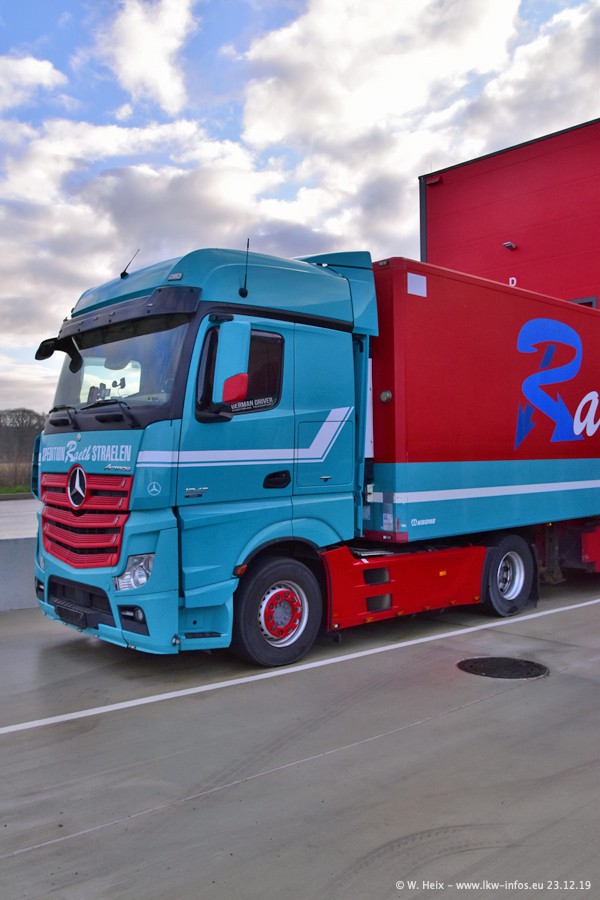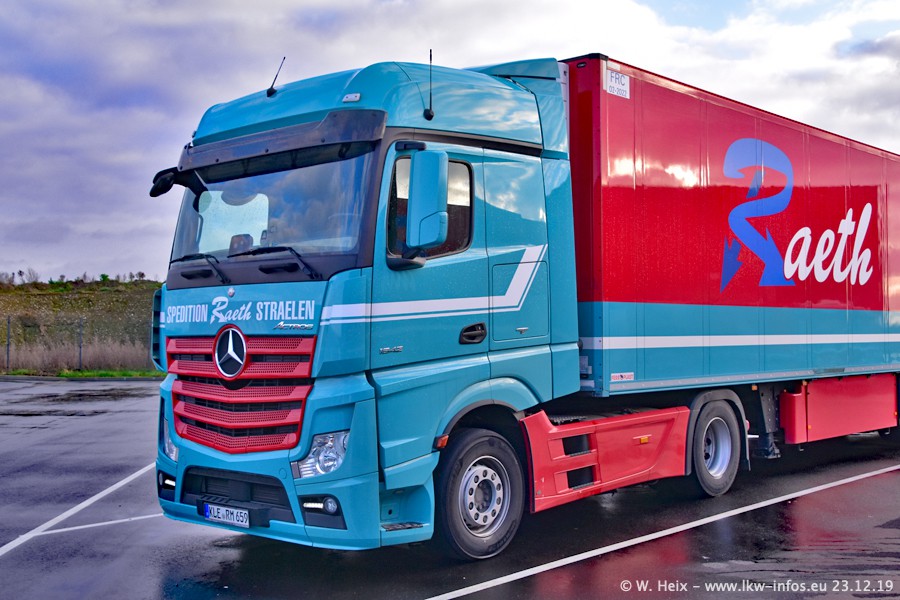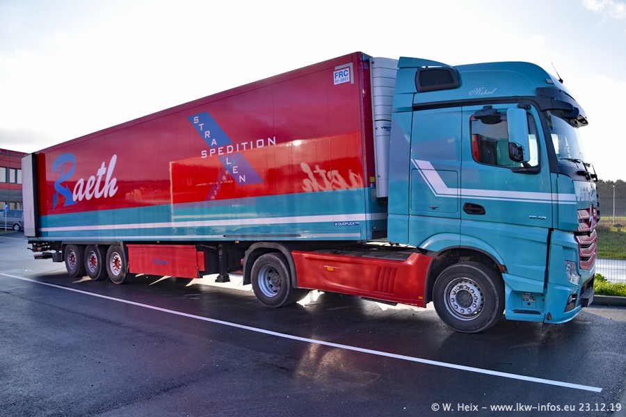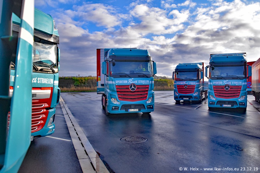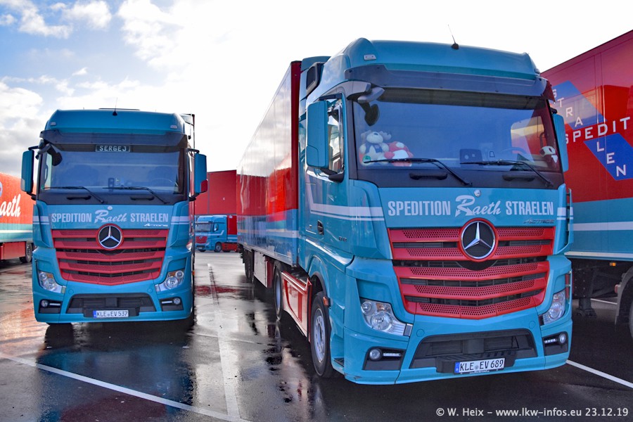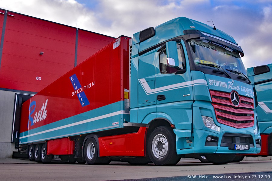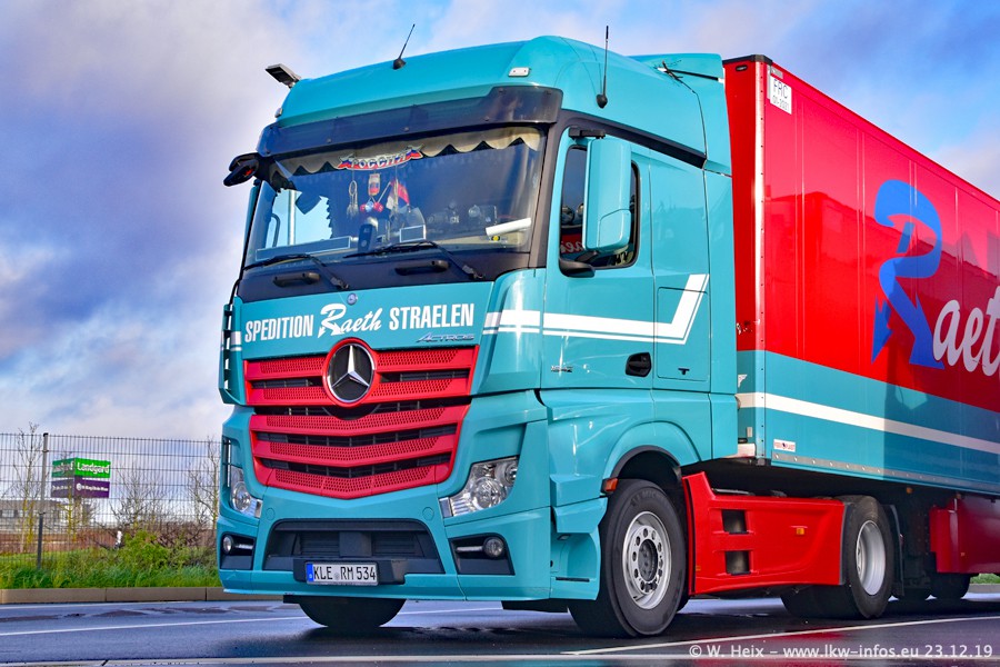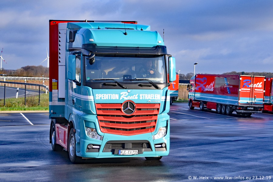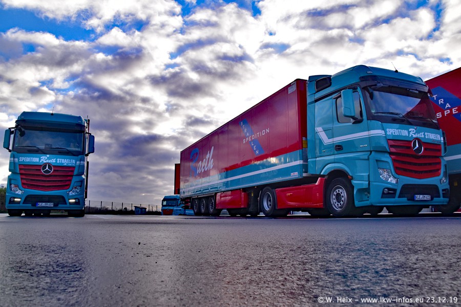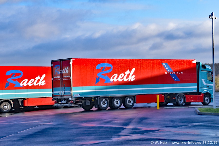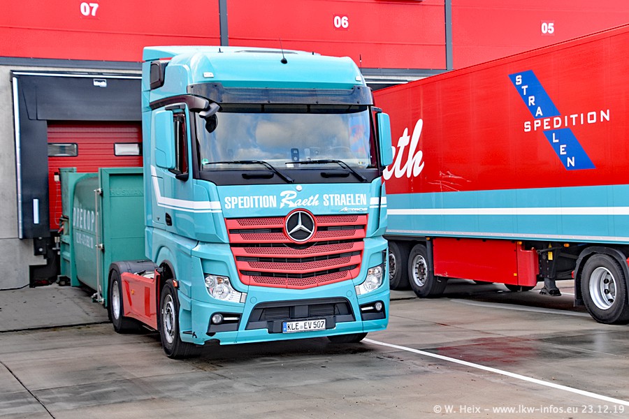 In diesem Jahr istr der Weihnachtsbesuch zugleich der erste Besuch auf dem neuen Firmengelände. Im Juli ist Raeth vom alten, viel zu klein gewordenen Gelände in Straelen, umgezogen nach Straelen-Herongen. Das neue Frimengelände liegt jetzt direkt an der A40 an der Abfahrt Herongen. Auf dem weitläufigen Gelände wurde ein kompletter Neubau mit Lagerhalle, Bürokomplex, Werkstatt und Waschstraße gebaut. Es gibt Platz für rund 40 LKW. Der Fuhrpark besteht aktuell aus rund 80 LKW. Viele Fahrzeuge stehen an den Wochenenden bei den Fahrern zuhause. Die "klassische Weihnachtsaufstellung " der LKW gibt es nicht. Aber gibt mir die Gelegenheit, viele Fahrzeuge einzeln zu fotografieren. Daher ist dieser Besuch mit 375 Fotos auch der größte bisher. Vielen Dank an Florian Brimmers für den freundlichen Empfang und für die Infos über die Firma.